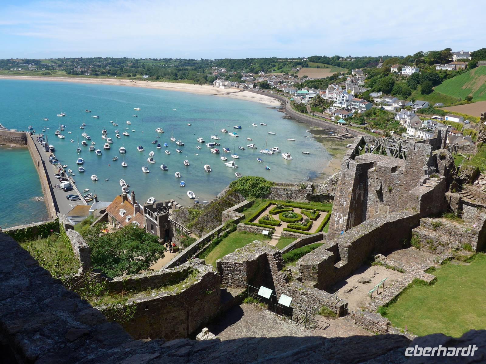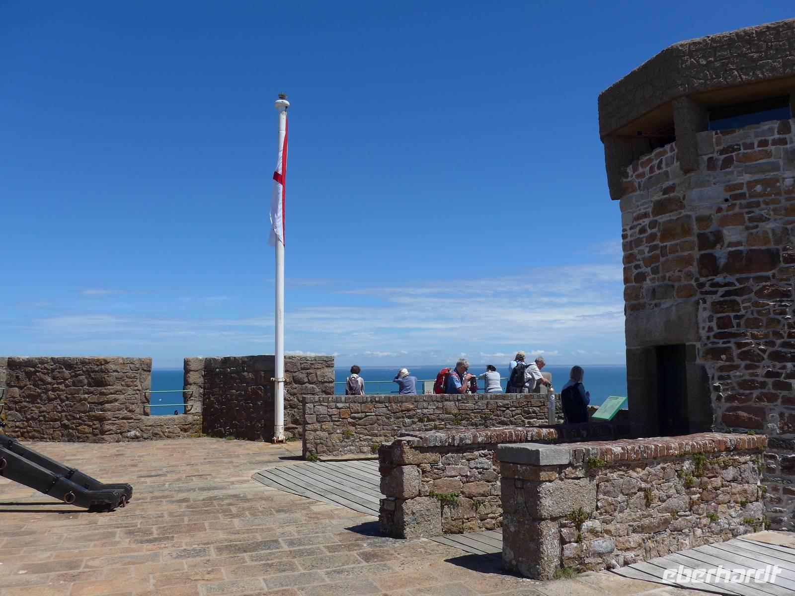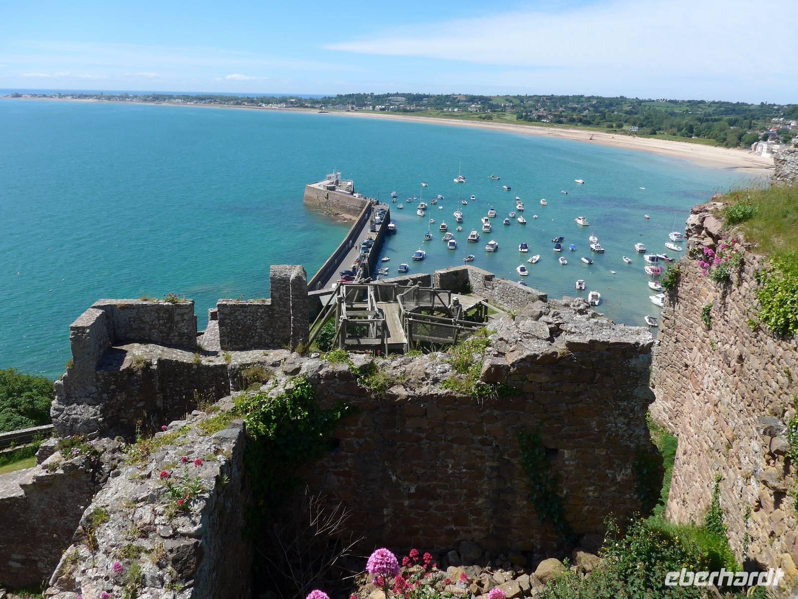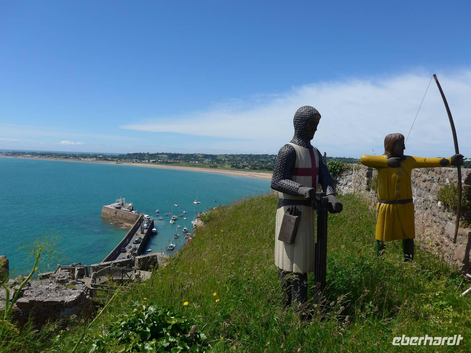 Nach dem Frühstück bezahlten alle die Hotelrechnung und Fam.Bogenrieder wurde verabschiedet. Beide hatten einen Flug nach Düsseldorf. Alle anderen hatten Zeit bis 15 Uhr und so gingen einige nochmals in die Stadt und 8 Gäste fuhren mit dem Bus zusammen mit der Reiseleiterin nach Gorey. Vom Hafen in Gorey führte der Weg hinauf zum Faldouet Dolmen, einem steinzeitlichen Ganggrab, welches auch als Opferstätte genutzt wurde. Danach wurde Gorey Castle besucht. Diese eindrucksvolle Burg aus dem Jahr 1204 wurde bis 1600 zur Verteidigung genutzt und zu Beginn der 2000er Jahre umfassend renoviert. Vom höchsten Punkt war ein toller Blick hinüber zur Küste der Normandie. In der Burg wird das Leben im Mittelalter sehr gut gezeigt und Künstler haben Themen wie den Stammbaum oder die Hexenprozesse sehr eindrucksvoll gestaltet. Gegen 14 Uhr fuhr der Bus zurück ins Hotel.