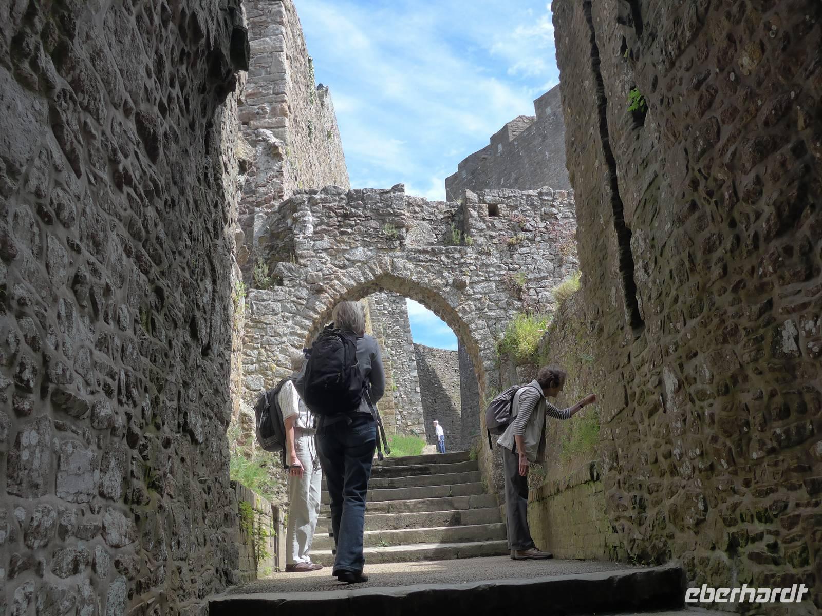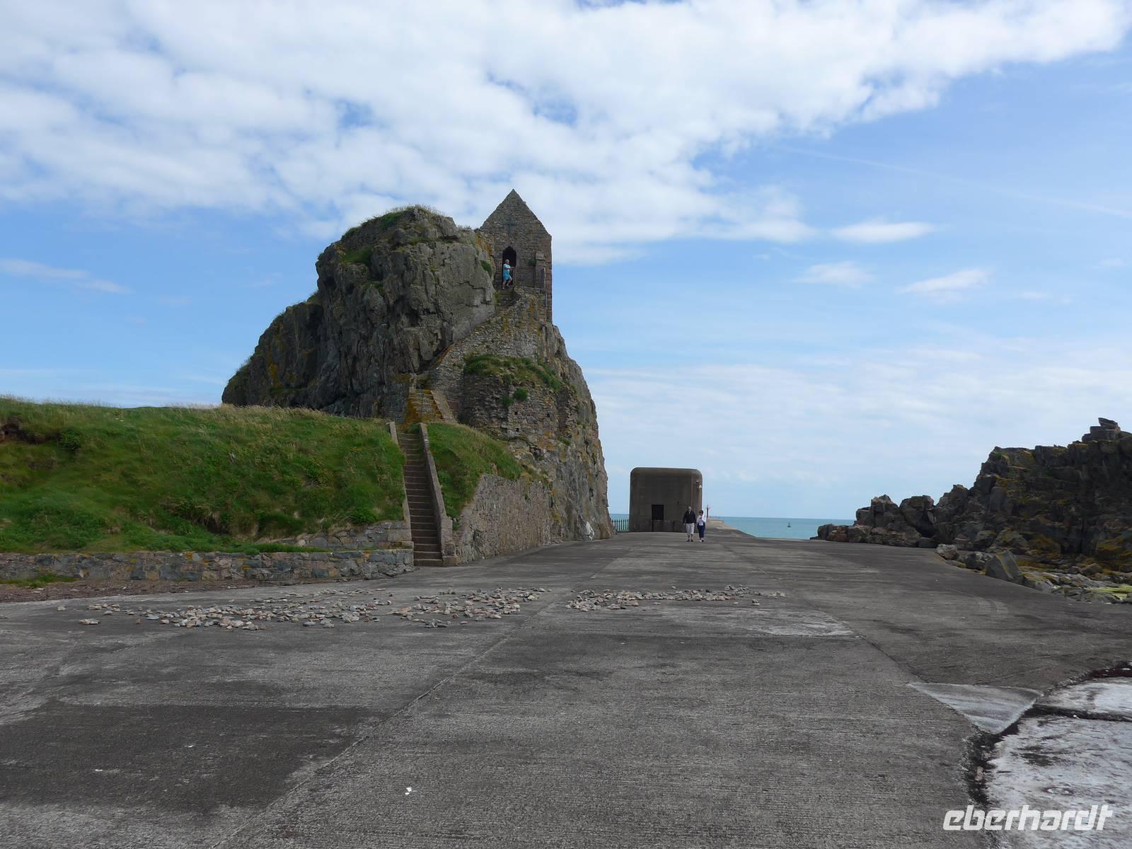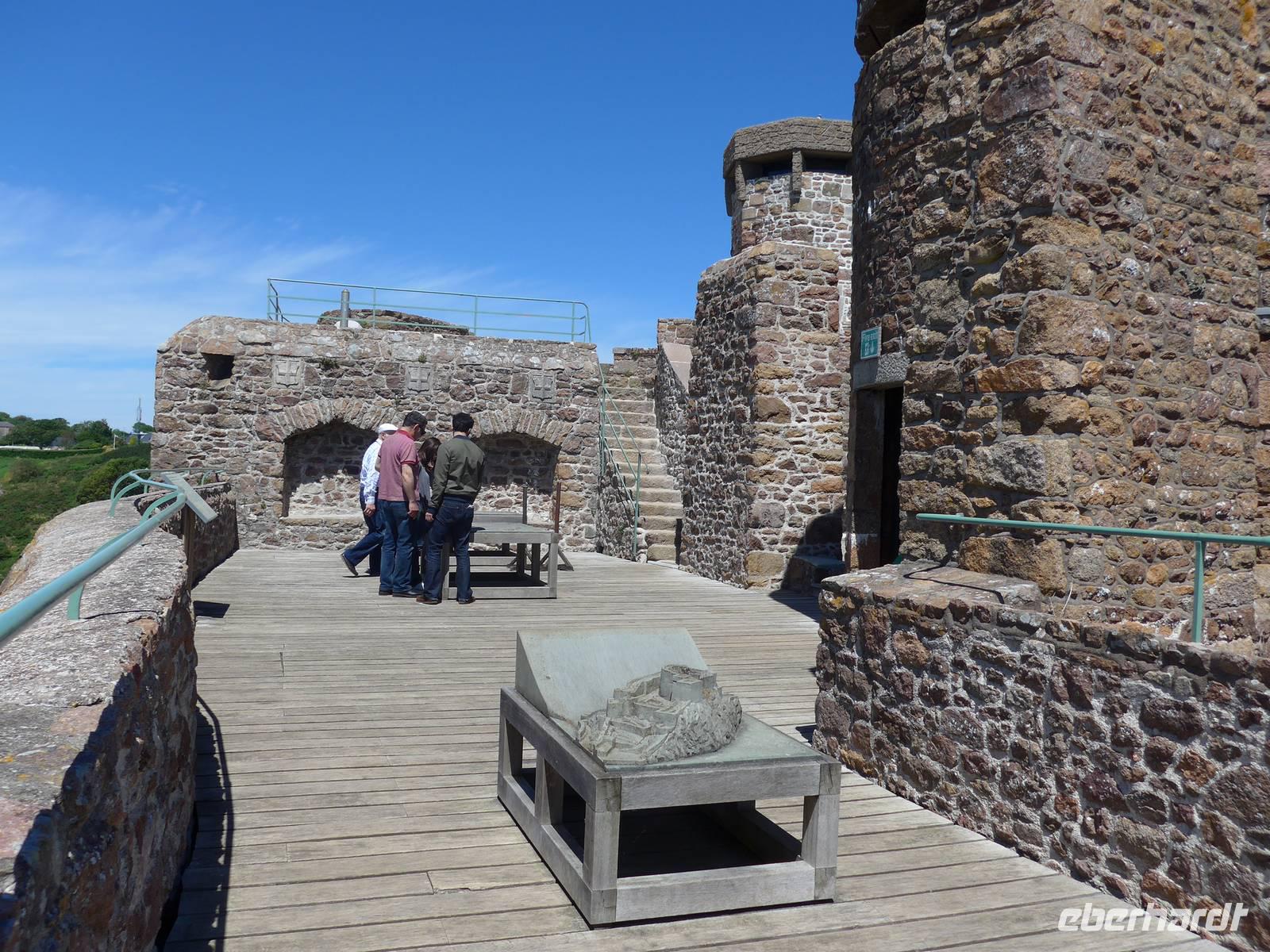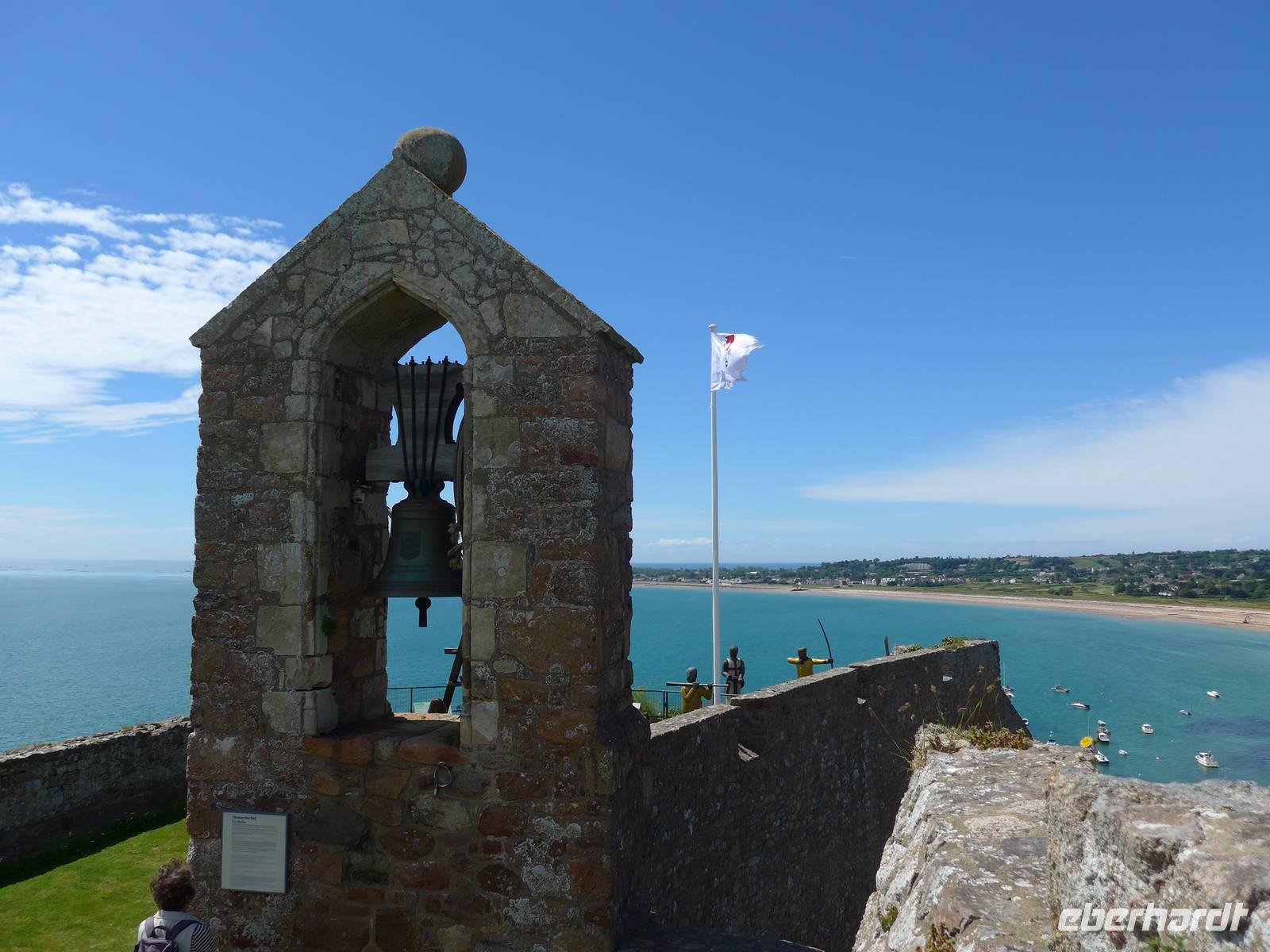 Nach dem Frühstück bezahlten alle die Hotelrechnung und Fam.Bogenrieder wurde verabschiedet. Beide hatten einen Flug nach Düsseldorf. Alle anderen hatten Zeit bis 15 Uhr und so gingen einige nochmals in die Stadt und 8 Gäste fuhren mit dem Bus zusammen mit der Reiseleiterin nach Gorey. Vom Hafen in Gorey führte der Weg hinauf zum Faldouet Dolmen, einem steinzeitlichen Ganggrab, welches auch als Opferstätte genutzt wurde. Danach wurde Gorey Castle besucht. Diese eindrucksvolle Burg aus dem Jahr 1204 wurde bis 1600 zur Verteidigung genutzt und zu Beginn der 2000er Jahre umfassend renoviert. Vom höchsten Punkt war ein toller Blick hinüber zur Küste der Normandie. In der Burg wird das Leben im Mittelalter sehr gut gezeigt und Künstler haben Themen wie den Stammbaum oder die Hexenprozesse sehr eindrucksvoll gestaltet. Gegen 14 Uhr fuhr der Bus zurück ins Hotel.