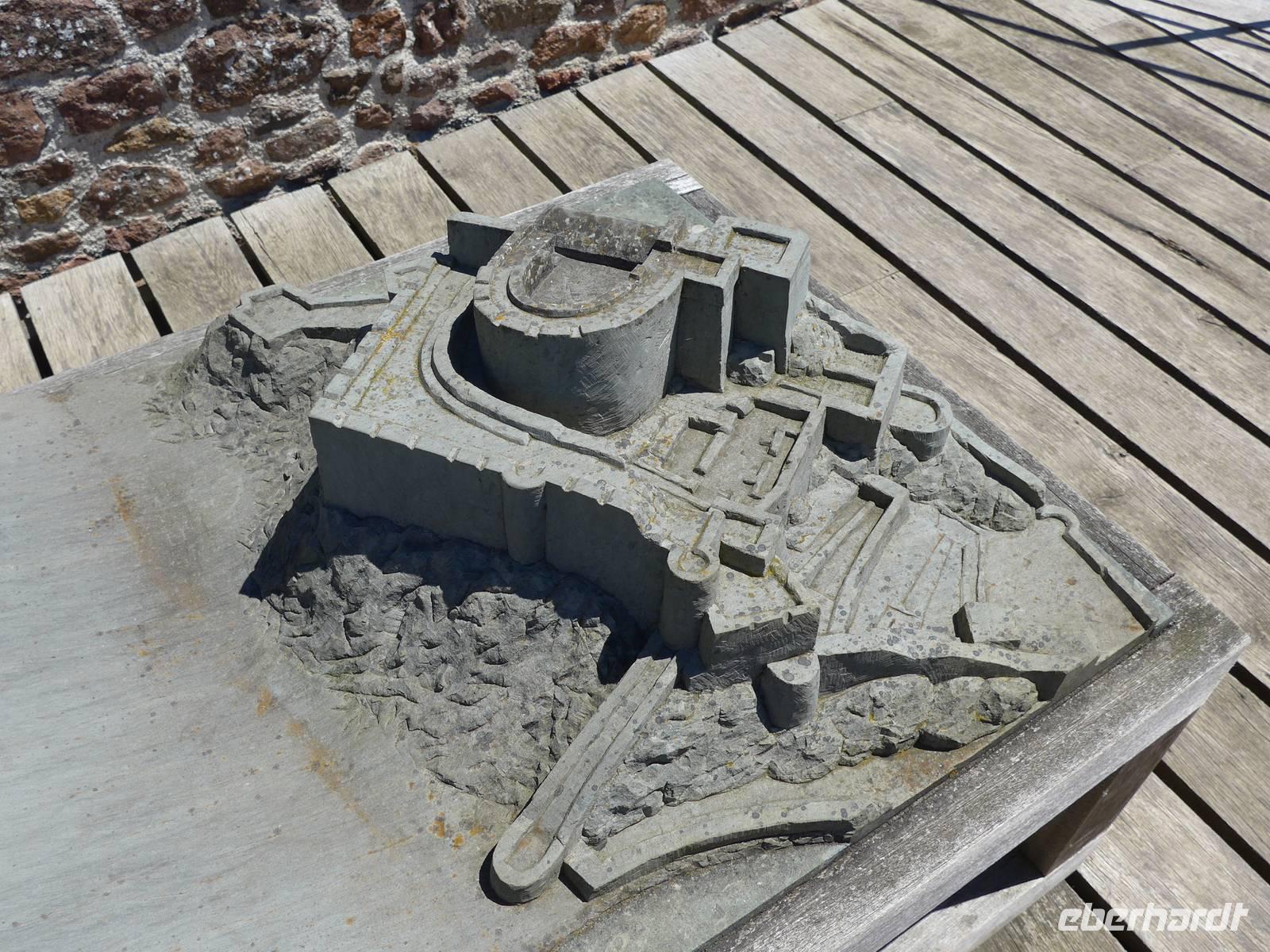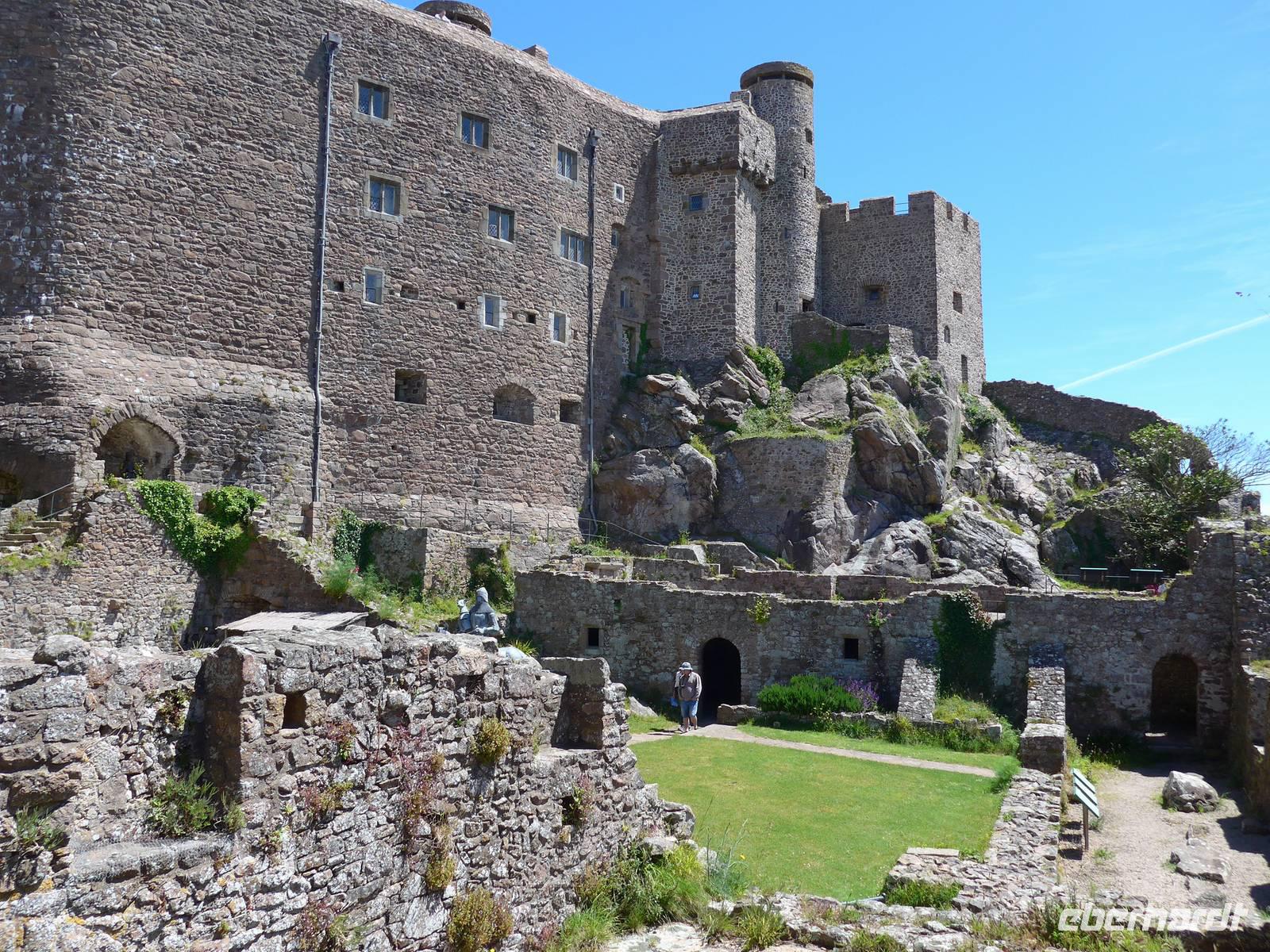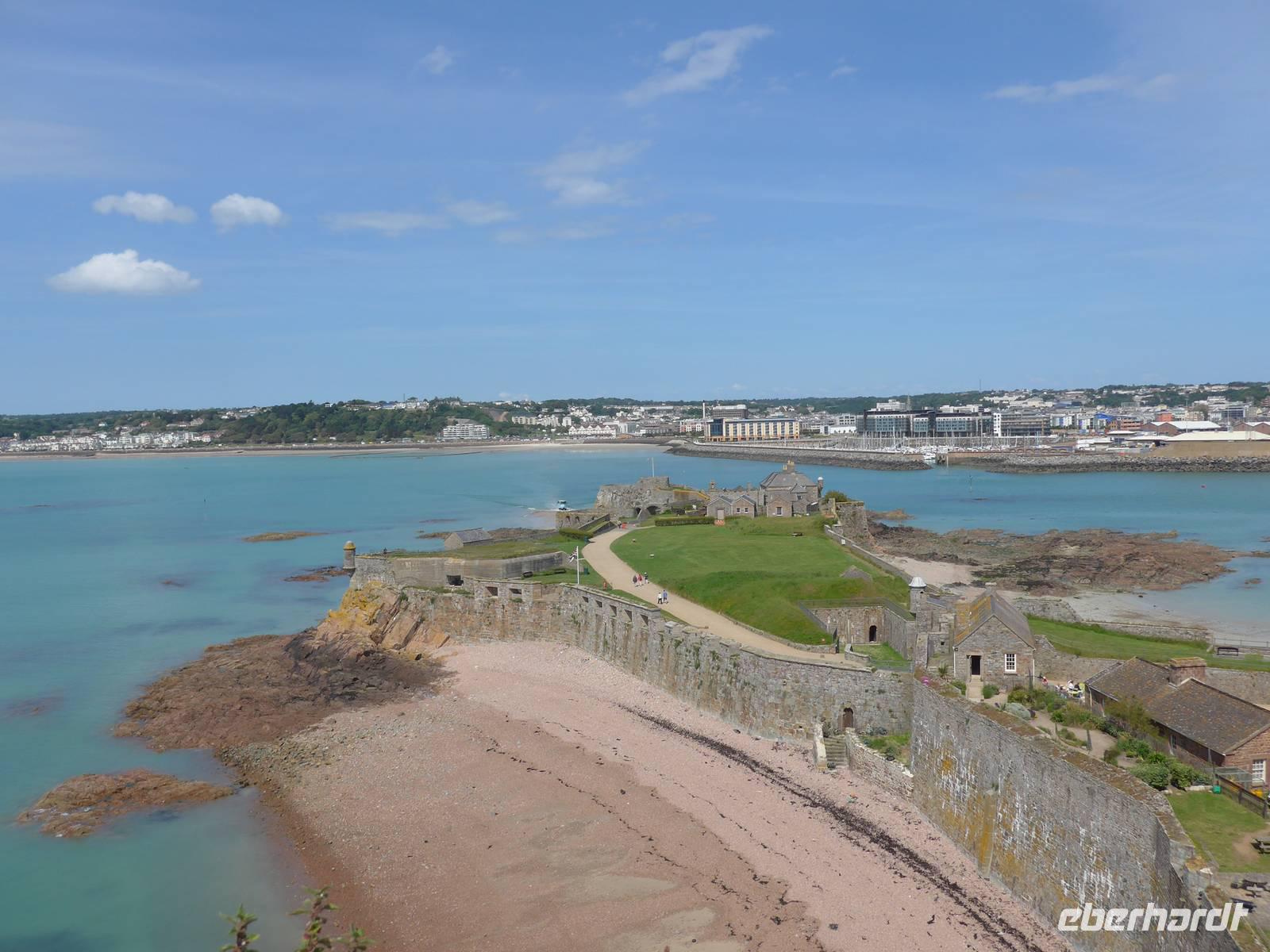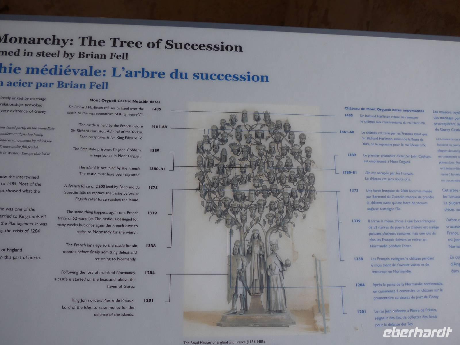 Nach dem Frühstück bezahlten alle die Hotelrechnung und Fam.Bogenrieder wurde verabschiedet. Beide hatten einen Flug nach Düsseldorf. Alle anderen hatten Zeit bis 15 Uhr und so gingen einige nochmals in die Stadt und 8 Gäste fuhren mit dem Bus zusammen mit der Reiseleiterin nach Gorey. Vom Hafen in Gorey führte der Weg hinauf zum Faldouet Dolmen, einem steinzeitlichen Ganggrab, welches auch als Opferstätte genutzt wurde. Danach wurde Gorey Castle besucht. Diese eindrucksvolle Burg aus dem Jahr 1204 wurde bis 1600 zur Verteidigung genutzt und zu Beginn der 2000er Jahre umfassend renoviert. Vom höchsten Punkt war ein toller Blick hinüber zur Küste der Normandie. In der Burg wird das Leben im Mittelalter sehr gut gezeigt und Künstler haben Themen wie den Stammbaum oder die Hexenprozesse sehr eindrucksvoll gestaltet. Gegen 14 Uhr fuhr der Bus zurück ins Hotel.