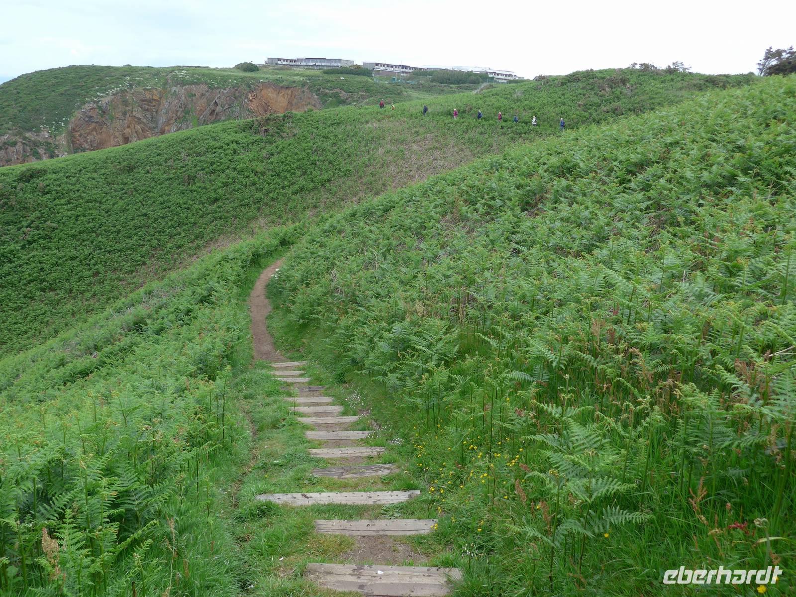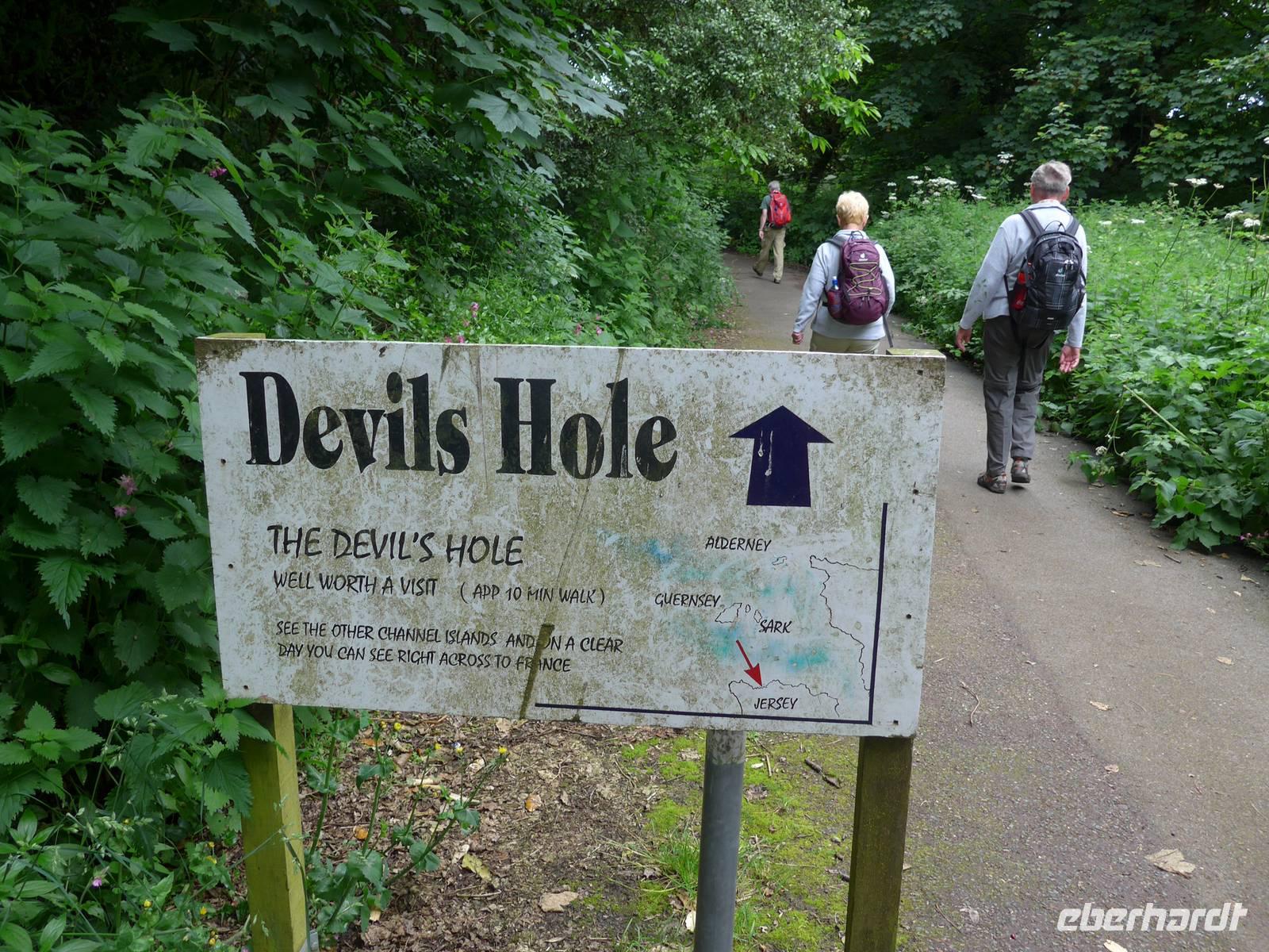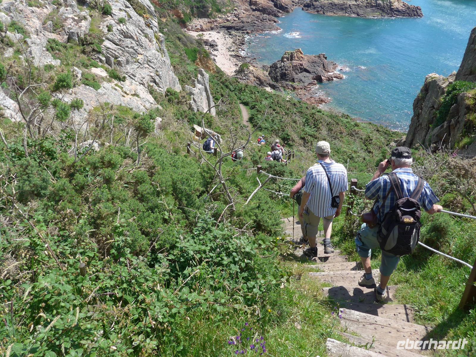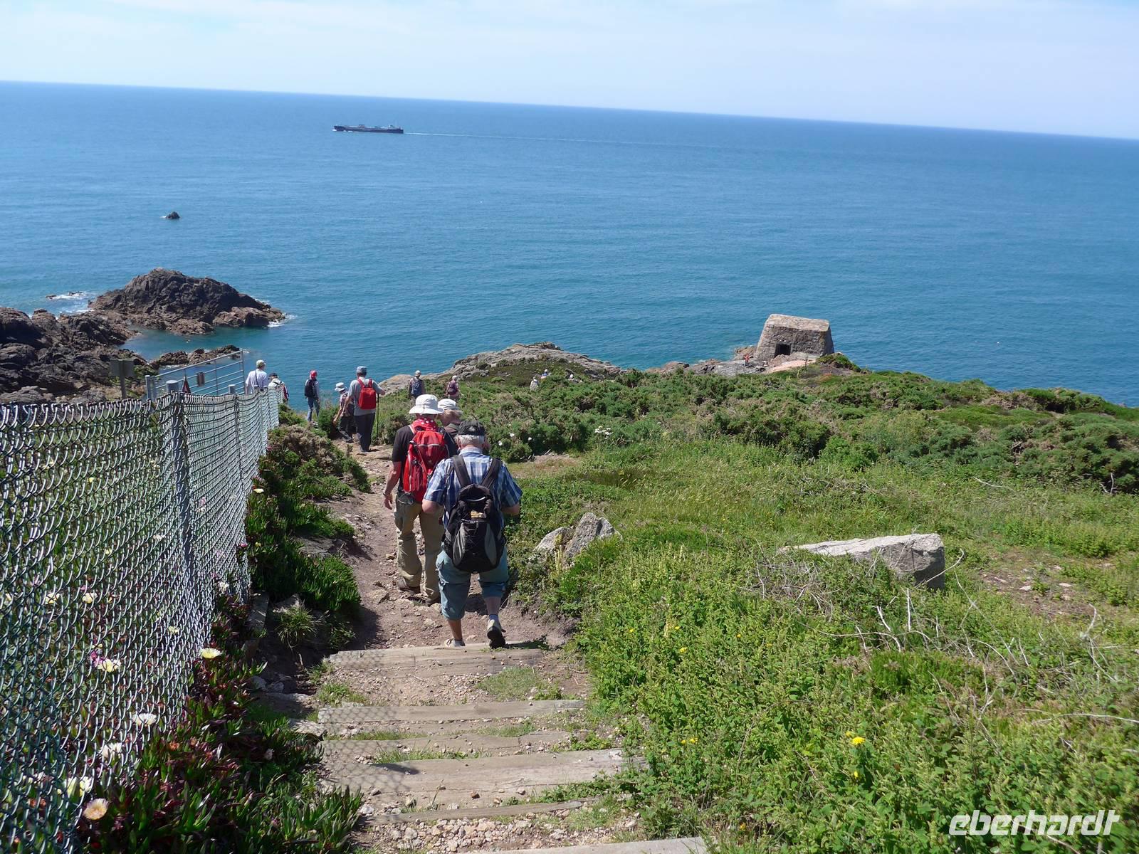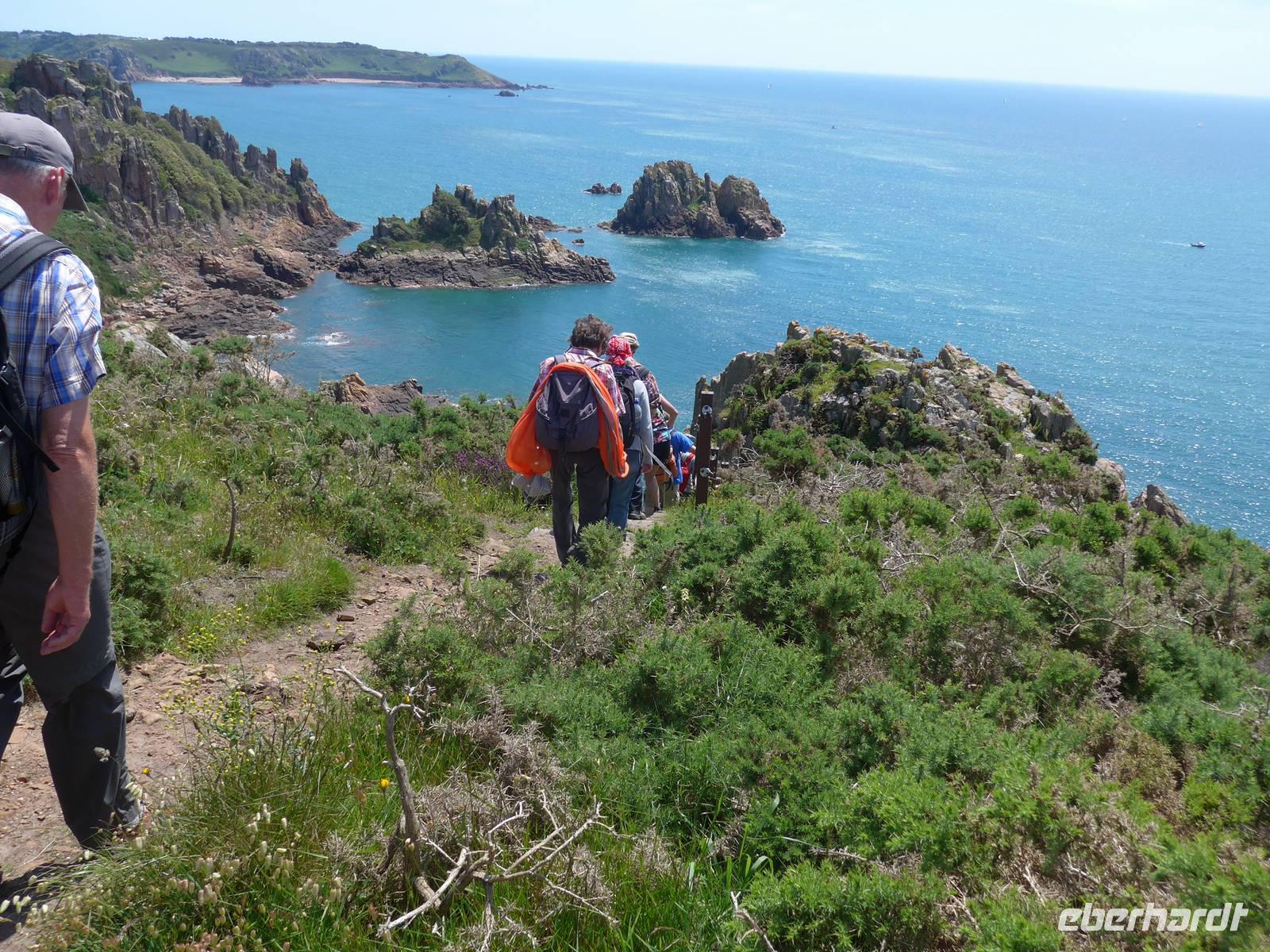Wie schon am Vortag fuhren wir mit dem Bus zur Nordküste. Am Grosnez Castle machten wir unser Gruppenfoto und schauten uns die Ruinen der alten Festung an. Dann führte der Wanderweg wieder entlang der Küste auf und ab. Wir kamen an der Stelle vorbei, wo das Kabel vom Festland Jersey erreicht. Thomas war beim Geochaching wieder erfolgreich und fand mehrere Verstecke. Inzwischen interessierte das auch andere Gäste unserer Gruppe und wir hattn beim Suchen viel Spaß und freuten uns mit Thomas über jeden Erfolg. Wir kamen an mehreren Grundstücken vorbei, die dem Jersey National Trust gehörten und Eberhard erklärte uns, welche gekauft und welche gestiftet wurden. Am Weg standen viele blaue Sandrapunzel (wilder Schnittlauch). In der Bucht von Greve de Lecq machten wir Mittagspause. Danach ging es wieder bergan und auf einem schönen Küstenweg bis zum Devil´s Hole. Der Weg hinunter führte an einem Teich mit riesigem Teufel vorbei ans Meer. Unten grasten Schafe mit 4 Hörnern - schon ein bißchen teuflich aussehend und es sollte auch Katzen ohne Schwanz geben. Leider konnten wir, weil Ebbe, das Wasser nicht durch den Felsen kommen sehen. Aber es war auch so schön. Gegen 16 Uhr holte uns Ernst wieder ab und brachte uns ins Hotel zurück.