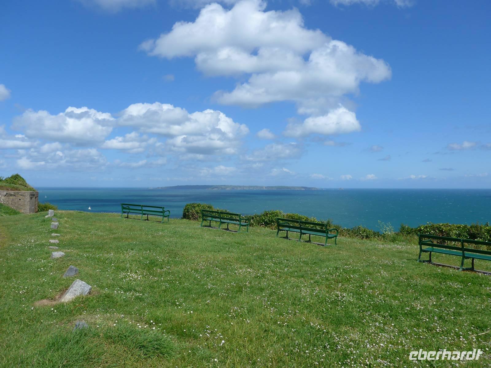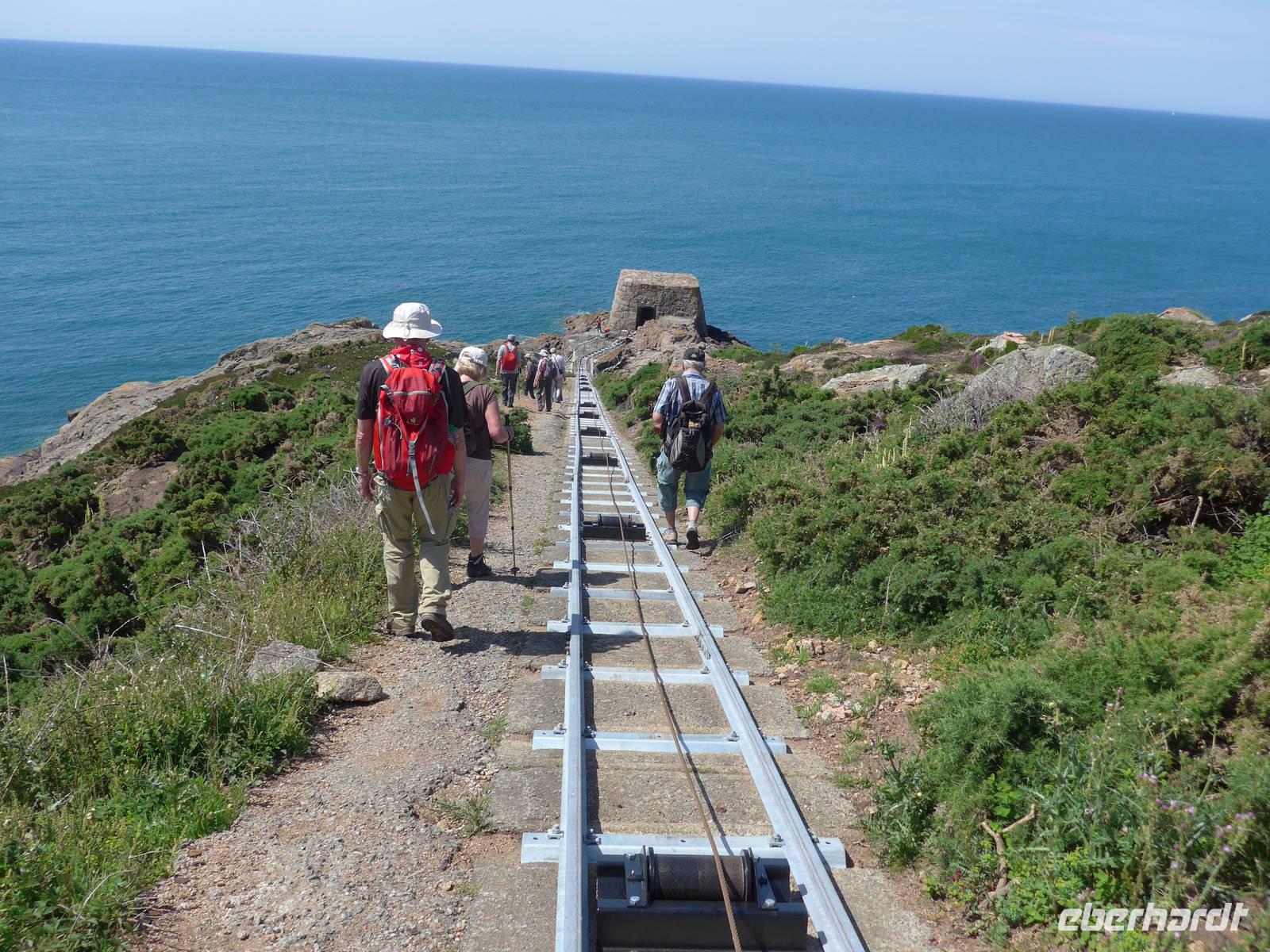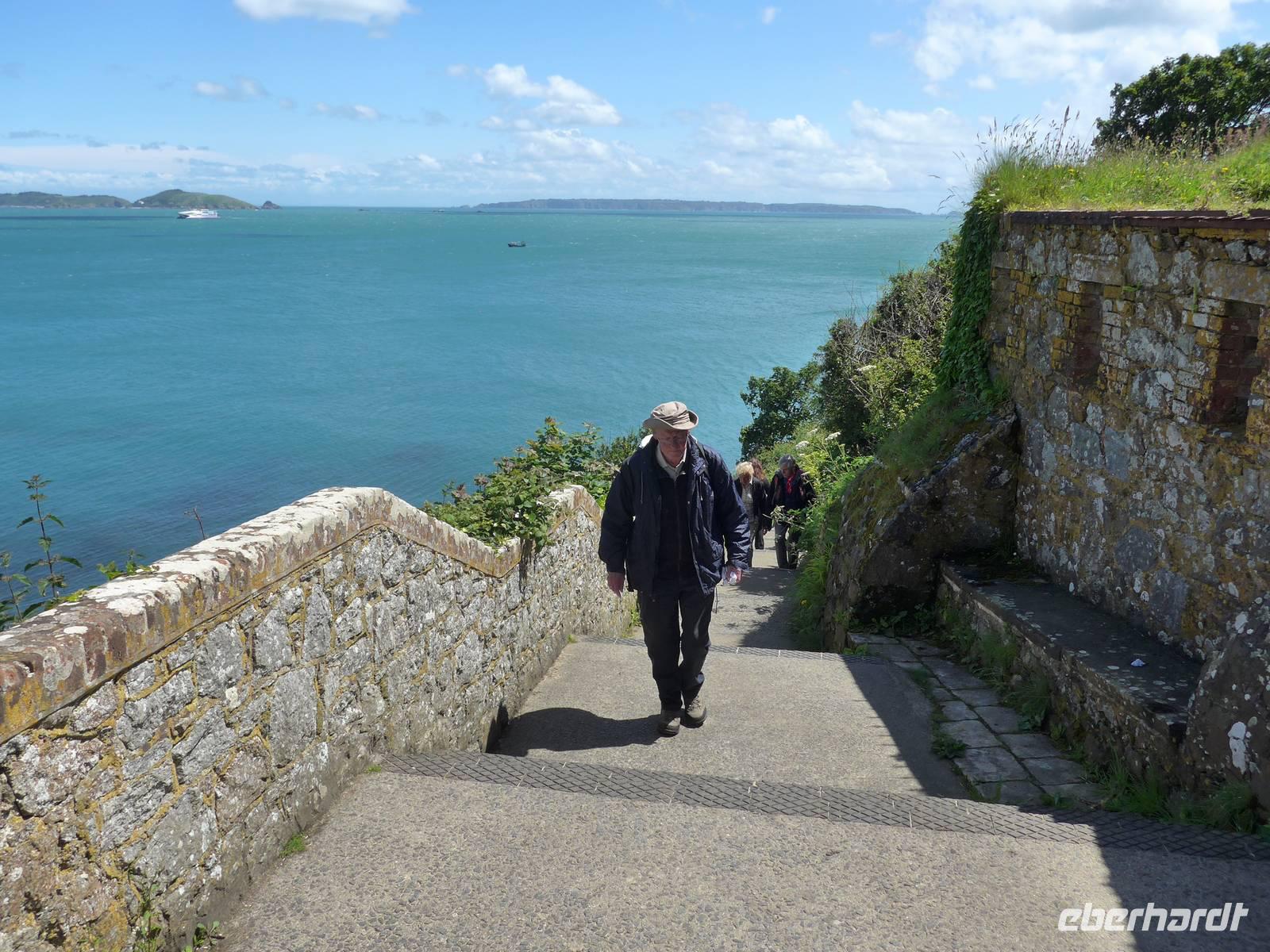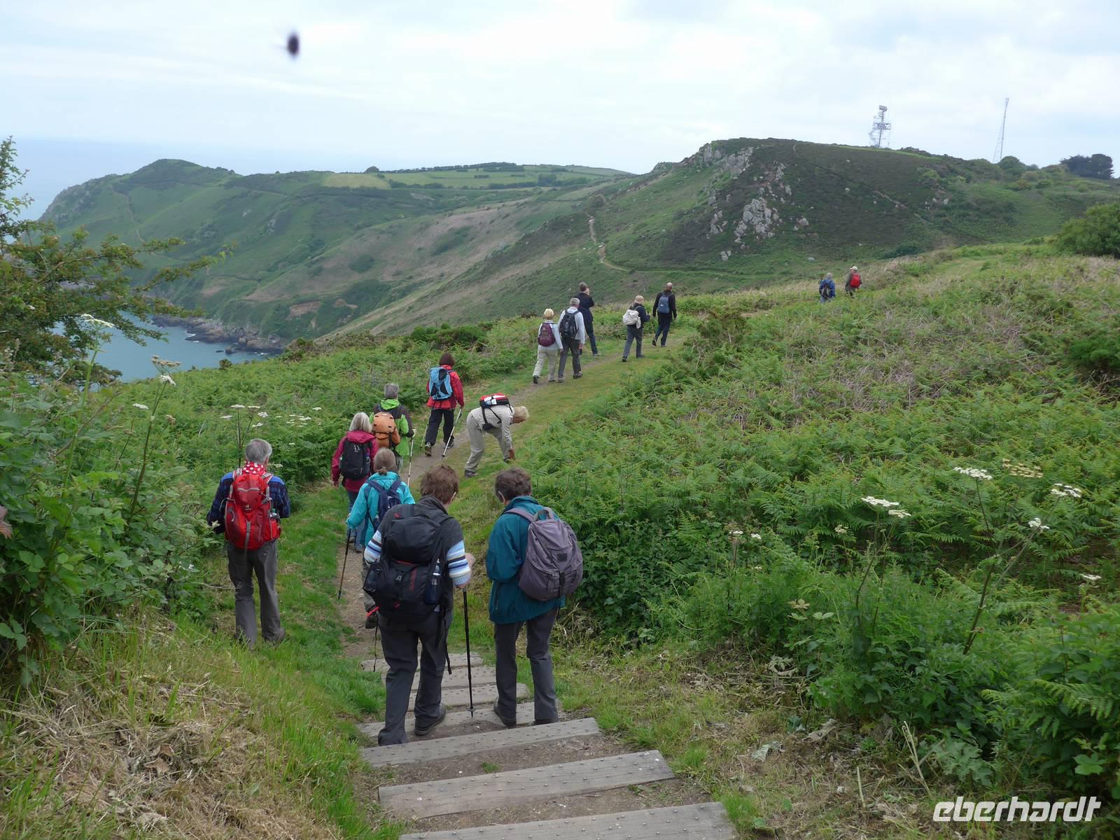 Nach dem Frühstück erwartete uns schon unsere Reiseleiterin Franziska und wir fuhren zum Hafen in St.Helier. Während sie unsere Fährtickets besorgte, gingen wir auf die Hafenmauer und genossen den herrlichen Blick auf den Hafen, die Stadt und das Elizabeth Castle. Die Fährüberfahrt verlief bei ruhiger See entlang der Südküste von Jersey und nach einer knappen Stunde erreichten wir die Insel Sark. Als Wanderer nahmen wir den Fußweg hinauf nach Sark, während die mitgereiste Single-Gruppe von Eberhardt-Travel mit einem Traktor nach oben gebracht wurde. Franziska spazierte mit uns durch das "Zentrum" der Insel und zeigte uns die wichtigsten Gebäude. Leider war die Kirche nicht geöffnet und so konnten wir die herrlich bestickten Sitzkissen nur durchs Fenster bestaunen. Es folgte der Besuch der Seigneurie mit dem wunderschönen Garten, dem Taubenturm und der Apfelpresse. Der Spaziergang zum Windows in the Rock bescherte uns einen tollen Blick auf die Nachbarinseln Herm und Guernsey. Nach der Mittagspause wanderten wir entlang der Steilküste zum La Coupee und hinüber nach Little Sark. Pflanzen wie der Venusnabel, Natternköpfe oder die Pendelsegge haben uns begeistert. Die Rückfahrt fand bei Ebbe statt und so mußten wir viele Stufen zur Fähre hinunter steigen und in St.Helier wieder viele Stufen hinauf.