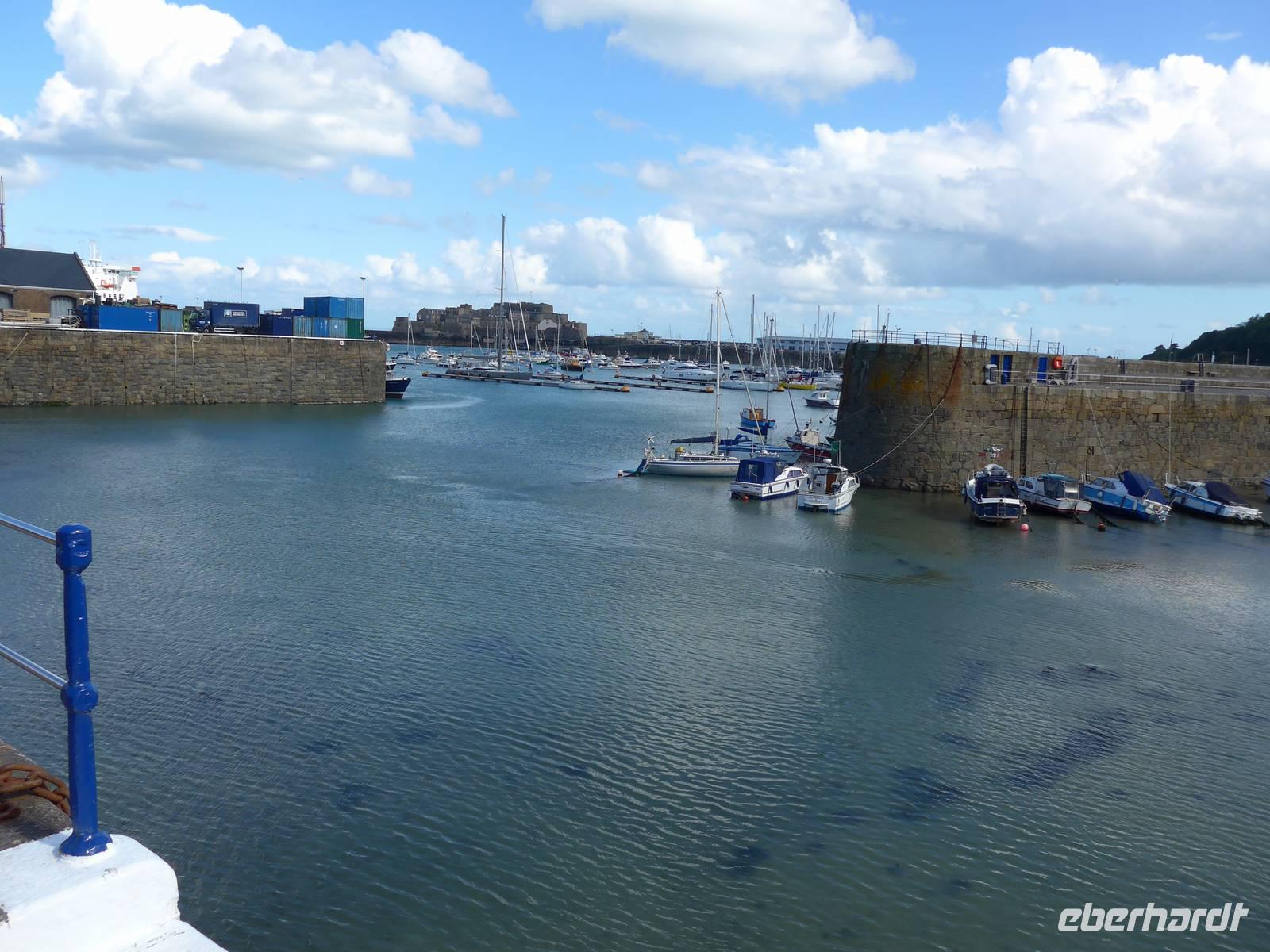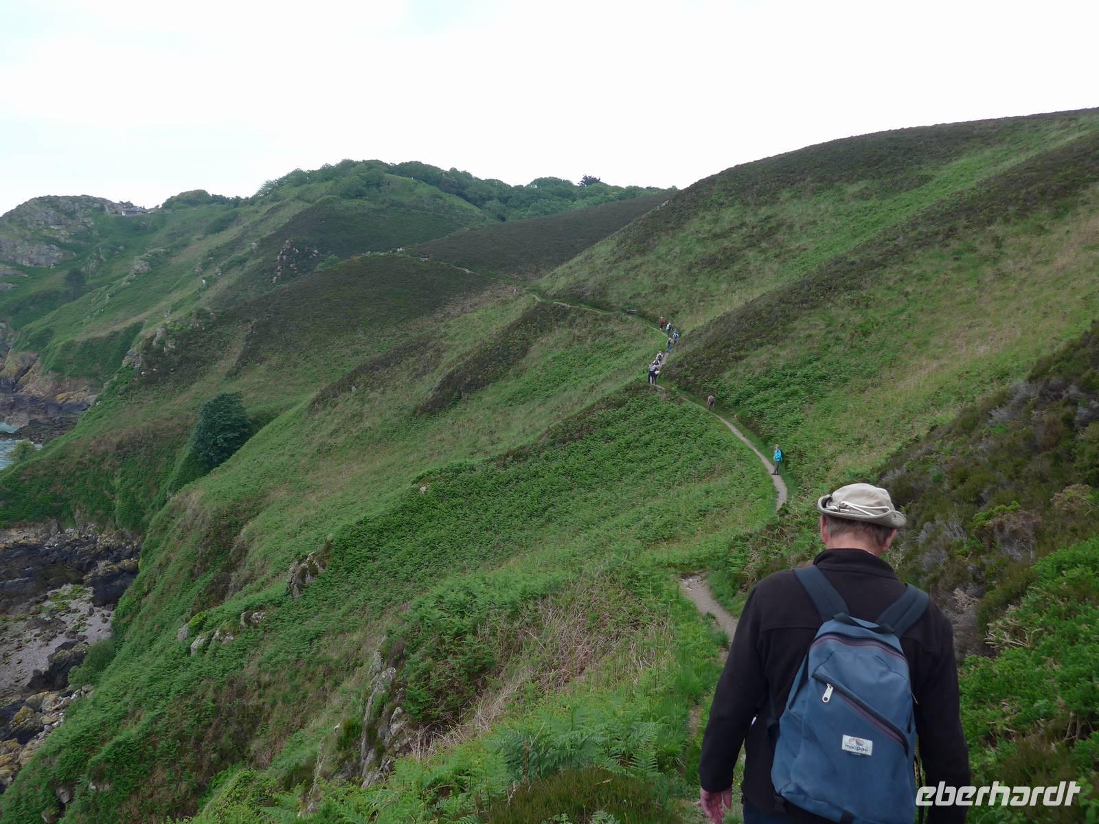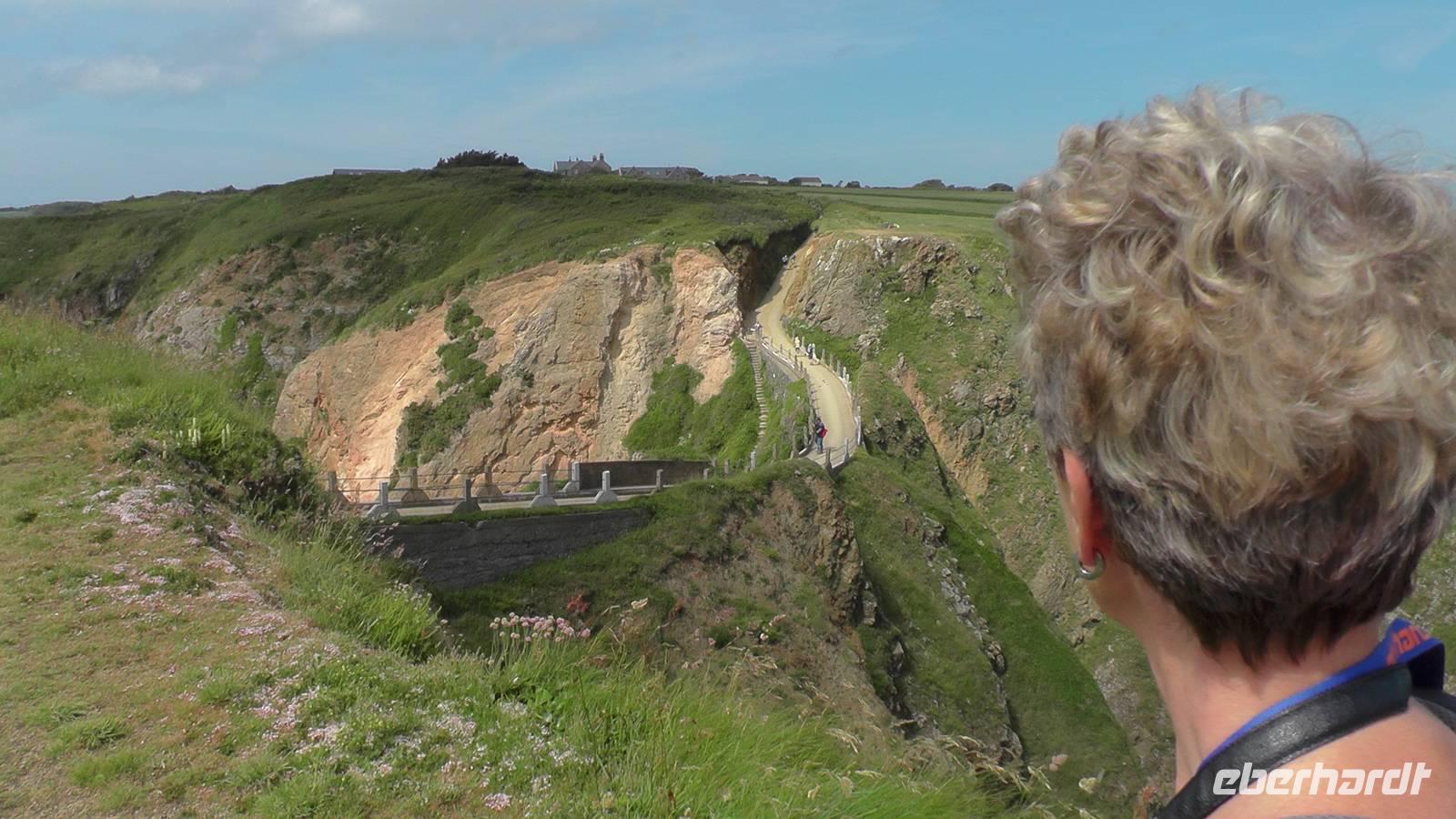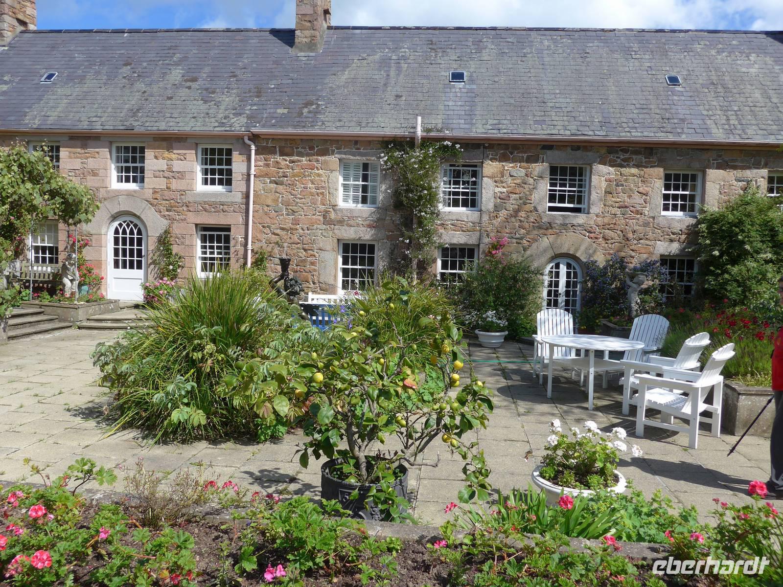 Nach dem Frühstück erwartete uns schon unsere Reiseleiterin Franziska und wir fuhren zum Hafen in St.Helier. Während sie unsere Fährtickets besorgte, gingen wir auf die Hafenmauer und genossen den herrlichen Blick auf den Hafen, die Stadt und das Elizabeth Castle. Die Fährüberfahrt verlief bei ruhiger See entlang der Südküste von Jersey und nach einer knappen Stunde erreichten wir die Insel Sark. Als Wanderer nahmen wir den Fußweg hinauf nach Sark, während die mitgereiste Single-Gruppe von Eberhardt-Travel mit einem Traktor nach oben gebracht wurde. Franziska spazierte mit uns durch das "Zentrum" der Insel und zeigte uns die wichtigsten Gebäude. Leider war die Kirche nicht geöffnet und so konnten wir die herrlich bestickten Sitzkissen nur durchs Fenster bestaunen. Es folgte der Besuch der Seigneurie mit dem wunderschönen Garten, dem Taubenturm und der Apfelpresse. Der Spaziergang zum Windows in the Rock bescherte uns einen tollen Blick auf die Nachbarinseln Herm und Guernsey. Nach der Mittagspause wanderten wir entlang der Steilküste zum La Coupee und hinüber nach Little Sark. Pflanzen wie der Venusnabel, Natternköpfe oder die Pendelsegge haben uns begeistert. Die Rückfahrt fand bei Ebbe statt und so mußten wir viele Stufen zur Fähre hinunter steigen und in St.Helier wieder viele Stufen hinauf.
