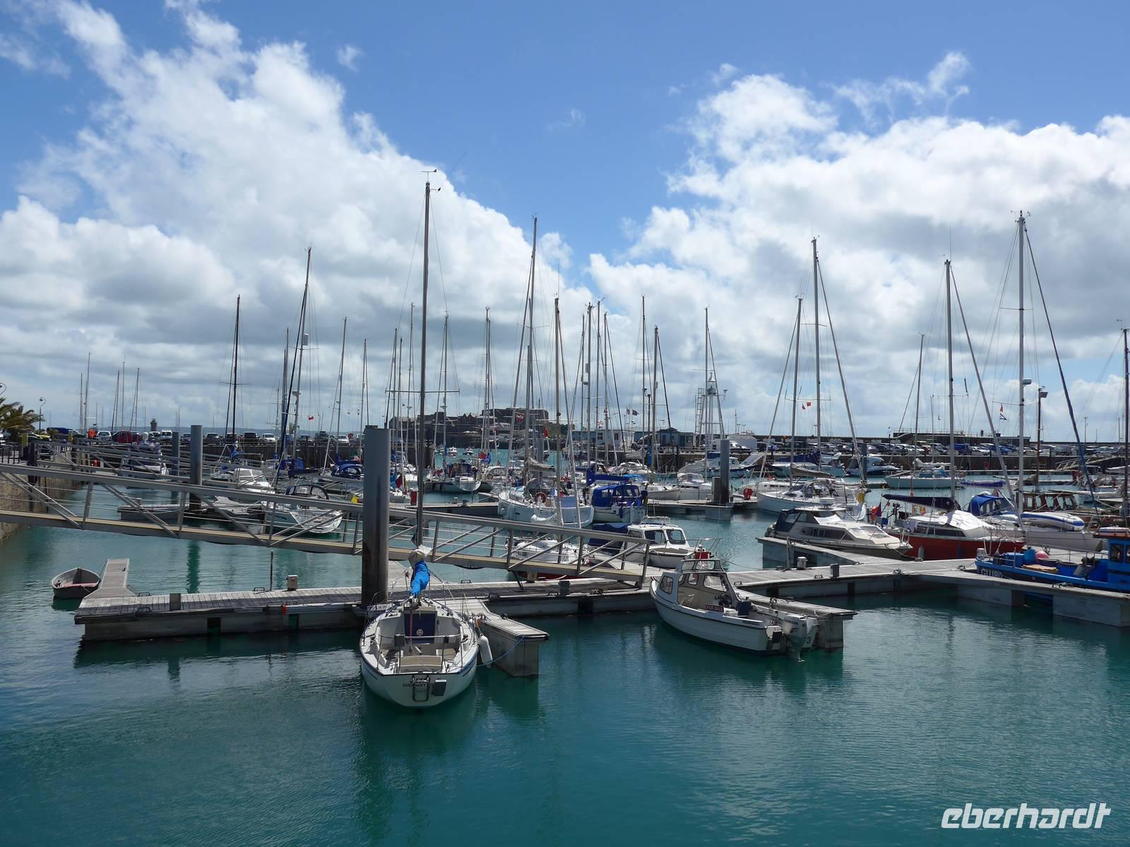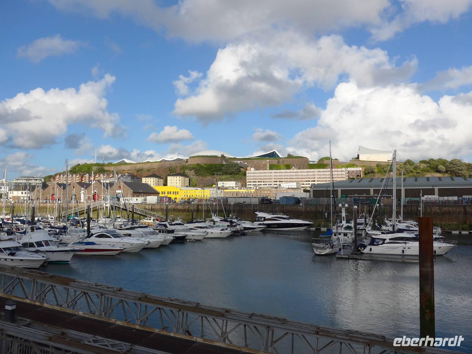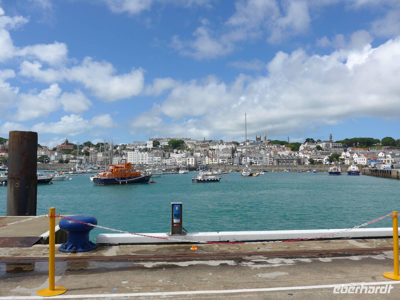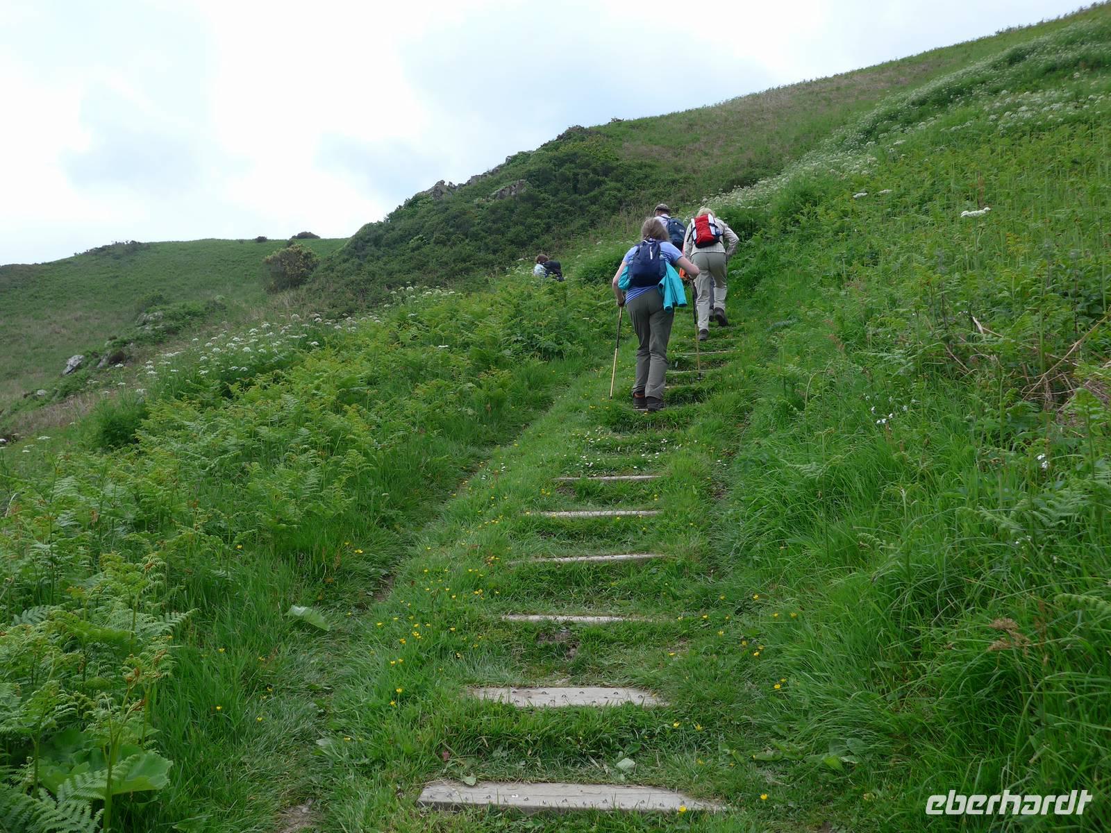 Nach dem Frühstück erwartete uns schon unsere Reiseleiterin Franziska und wir fuhren zum Hafen in St.Helier. Während sie unsere Fährtickets besorgte, gingen wir auf die Hafenmauer und genossen den herrlichen Blick auf den Hafen, die Stadt und das Elizabeth Castle. Die Fährüberfahrt verlief bei ruhiger See entlang der Südküste von Jersey und nach einer knappen Stunde erreichten wir die Insel Sark. Als Wanderer nahmen wir den Fußweg hinauf nach Sark, während die mitgereiste Single-Gruppe von Eberhardt-Travel mit einem Traktor nach oben gebracht wurde. Franziska spazierte mit uns durch das "Zentrum" der Insel und zeigte uns die wichtigsten Gebäude. Leider war die Kirche nicht geöffnet und so konnten wir die herrlich bestickten Sitzkissen nur durchs Fenster bestaunen. Es folgte der Besuch der Seigneurie mit dem wunderschönen Garten, dem Taubenturm und der Apfelpresse. Der Spaziergang zum Windows in the Rock bescherte uns einen tollen Blick auf die Nachbarinseln Herm und Guernsey. Nach der Mittagspause wanderten wir entlang der Steilküste zum La Coupee und hinüber nach Little Sark. Pflanzen wie der Venusnabel, Natternköpfe oder die Pendelsegge haben uns begeistert. Die Rückfahrt fand bei Ebbe statt und so mußten wir viele Stufen zur Fähre hinunter steigen und in St.Helier wieder viele Stufen hinauf.