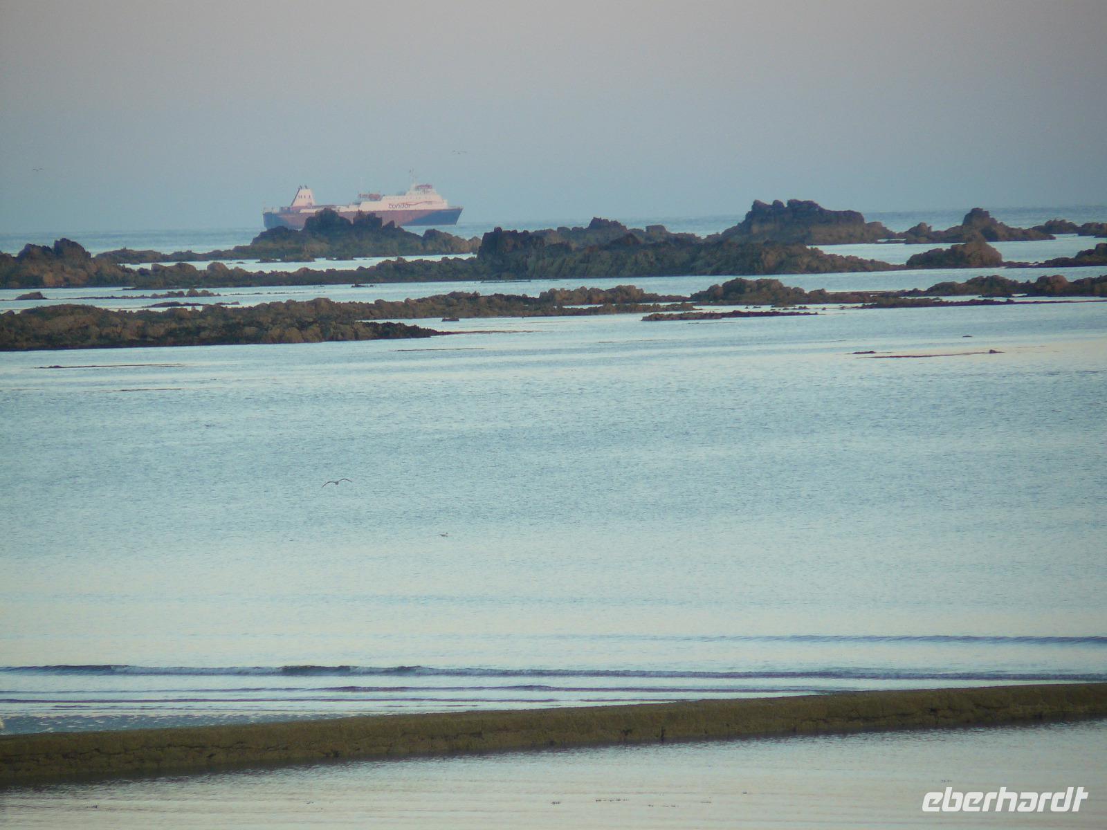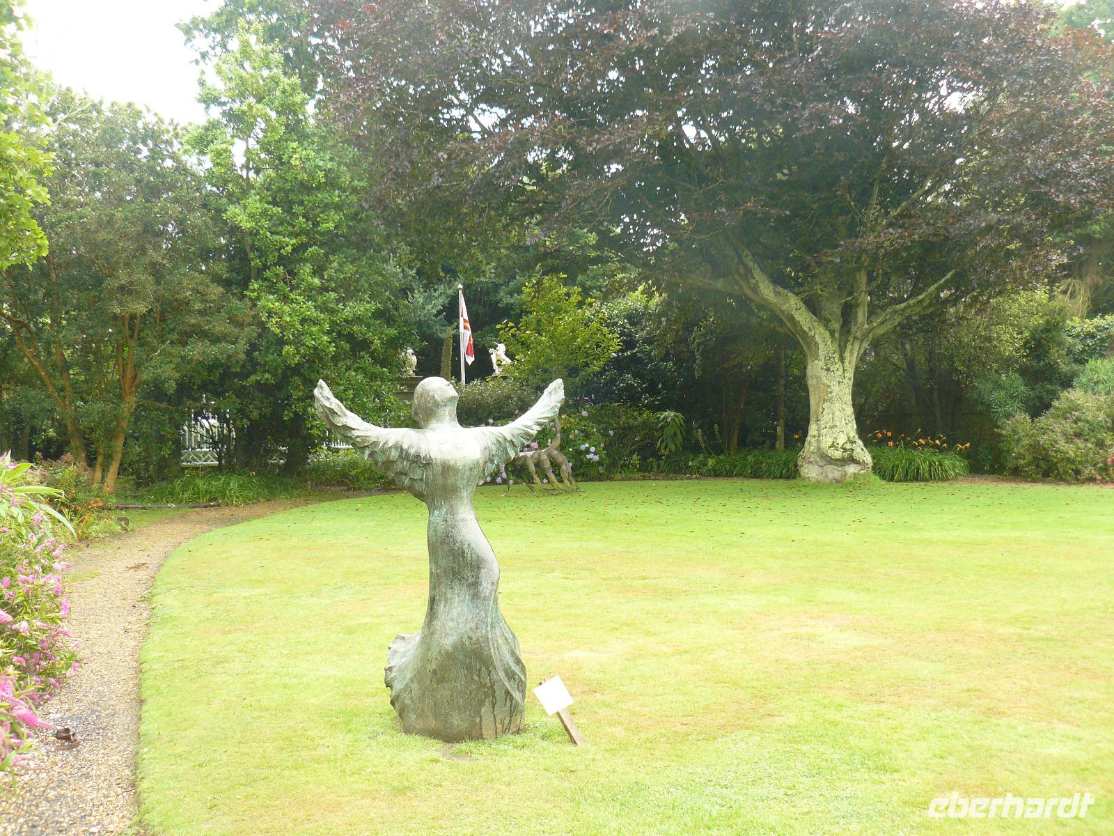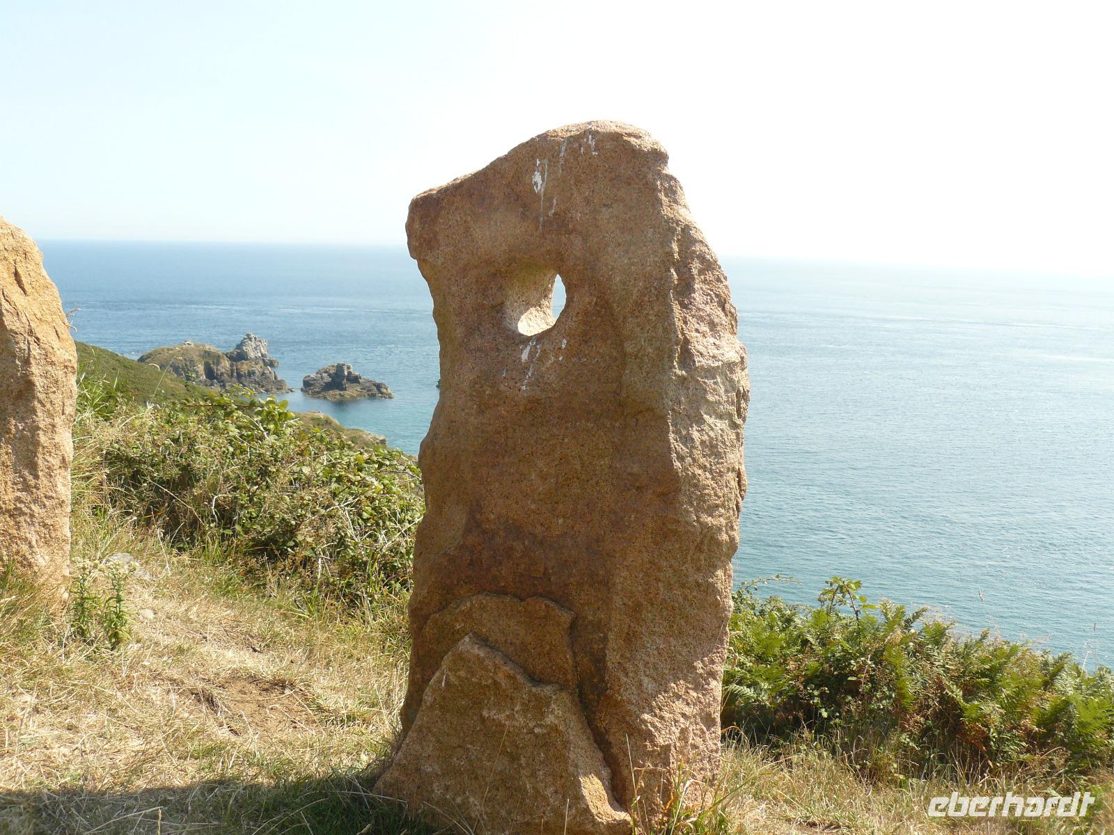 Heute stand ein gemeinsamer Ausflug nach Guernsey auf unserem Programm. Das Meer war unruhig, aber alle überstanden die Schiffsfahrt zu Jerseys Nachbarinsel unbeschadet. Die erste Zeit verbrachten wir auf einer kleinen Inselrundfahrt. Der Bus brachte uns vor die Tür des Hauteville Hauses, in dem Victor Hugo fünfzehn Jahre lang im Exil lebte. Wir besichtigten den Garten. Die Führung durch das Haus stand nicht auf unserem Programm, denn viel Zeit hatten wir nicht und Guersey bietet viele Attraktionen. Weiter ging's nach St. Martin zum Sausmarez Manor. Auch hier schauten wir uns den Vorgarten an. Der Besitzer und Bewohner dieses herrschaftlichen Anwesens handelt mit modernen Plastiken, die sehr ansprechend mitten im Grünzeug präsentiert werden. Dann machten wir einen Abstecher zur Grandmère, der Großmutter. Die Großmutter stammt aus der Steinzeit. Vor diesem Menhir werden schon seit alten Zeiten Blumen niedergelegt mit der Bitte um Kinderreichtum. Wir kamen gerade rechtzeitig um eine Hochzeitsgesellschaft in der Kirche verschwinden zu sehen. Die Großmutter hatte einen frischen Blumenkranz übergestülpt bekommen. Das Wetter war leider ziemlich trübe heute, und so fiel unser Spaziergang am Icart Point kurz aus. Und als wir danach zur Little Chapel fuhren, regnete es in Strömen. Wenig später erzählte ich im trockenen Bus sitzend von den Tomatenbauern auf Guernsey. Werden hier Tomaten denn auch reif bei so wenig Sonne? Kaum war die Frage gestellt, kam die Sonne und beantwortete die Frage selbst. Binnen weniger Minuten wechselte das Wetter vom großen Nass zum blitzblauen Himmel und Sonnenschein. Diesen genossen wir dann in St. Peter-Port. Nach einem Besuch des alten Ladens aus viktorianischer Zeit, in dem alle Gäste die passenden Souvenirs für daheim fanden, beendeten wir diesen kurzen Guernsey-Ausflug mit einem sonnigen Bummel durch Guernseys Hauptstadt zum Hafen. Das Schiff fuhr früher als geplant, denn für den Abend war Sturm vorhergesagt, und das wirbelte die Schiffsfahrpläne durcheinander. Unsere Rückfahrt wurde also noch schaukeliger als die Hinfahrt, aber auch diese wurde von unseren Gästen gut überstanden. Die Aussicht auf das abendliche Fischbuffet ließ unsere Mägen Ruhe annehmen. Am Abend verabschiedeten wir uns offiziell voneinander und jeder Gast erhielt noch ein Klippenbesteigungsdiplom in Gedichtform von mir bevor es ans Kofferpacken ging.