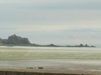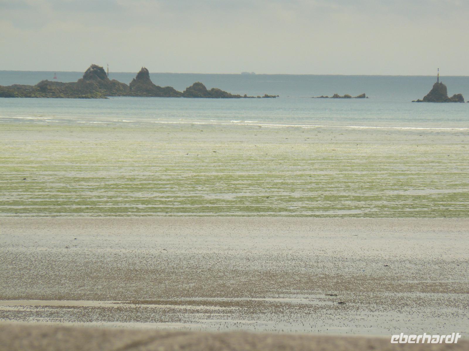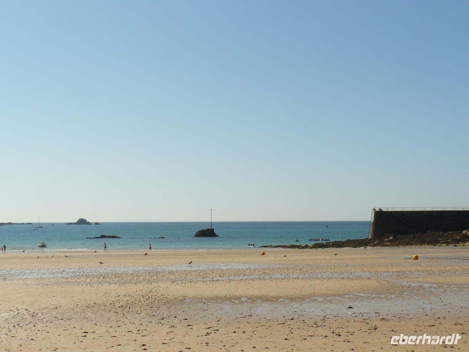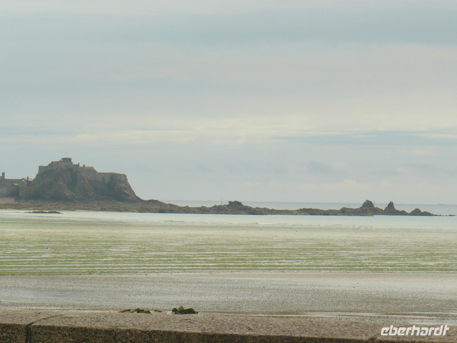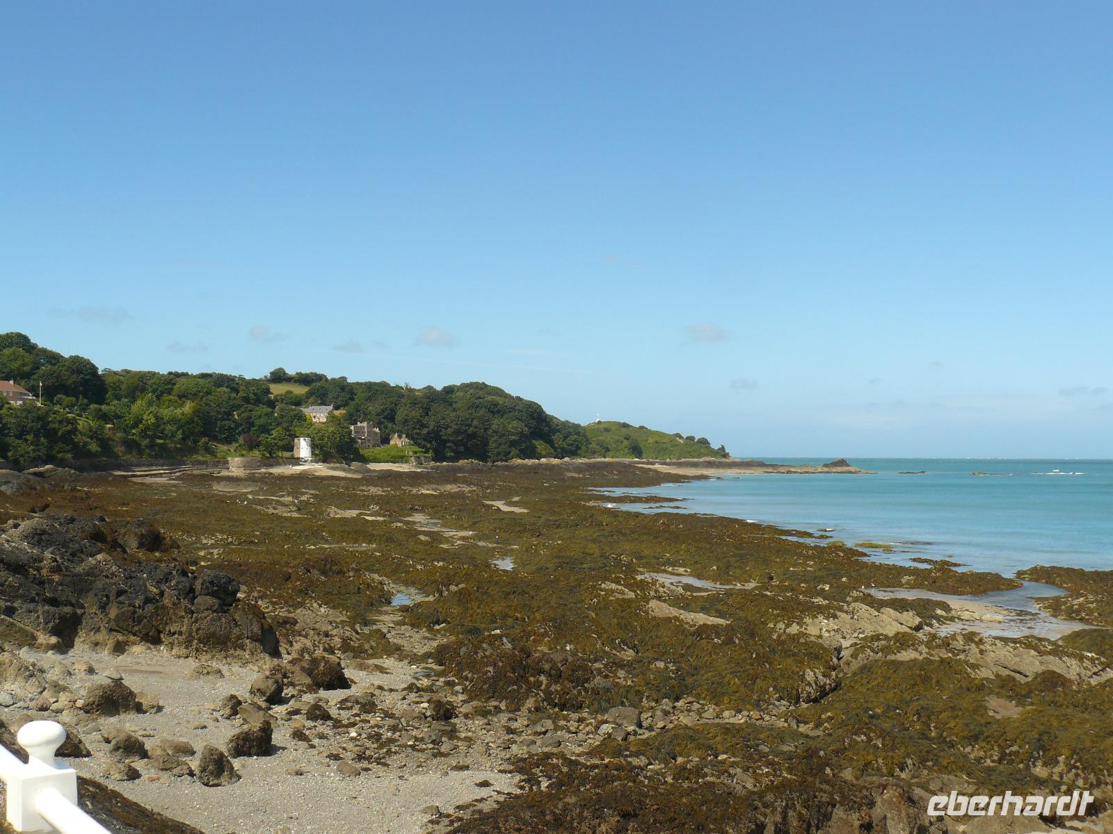 Aber alle anderen versuchten noch etwas aus diesem Tag zu machen und ich begleitete eine größere Gruppe ins Hünengrab La Hougue Bie samt Archäologischem Museum. Danach wanderten wir gemeinsam zum großen Pier in der St. Catherine's Bay und fuhren mit dem öffentlichen Bus nach Gorey. Das Wetter war wieder strahlend blau zum Abschied, aber es war Ebbe. Und daher lag das Meer in weiter Ferne. Meinen Badenixen war das zu weit. Wir bummelten noch ein bisschen durch Gorey und fuhren dann mit dem öffentlichen Bus zurück ins Hotel. Dort hatte es ja diesen Meerespool vor der Tür, der bei Ebbe zum Schwimmbad wurde und das kam meinen Gästen nun sehr gelegen. Eine Stranddusche gab es auch und dann konnten wir uns im Hotel auch noch etwas frisch machen. Zu guter Letzt folgte noch eine Runde Kaffee und dann stand auch schon Ernst vor der Tür, um uns zum Flughafen zu bringen. Dort wurde unsere Geduld dann zwar noch etwas auf die Probe gestellt, aber mit einer Stunde Verspätung ging's schließlich ab über die Wolken, die vor allem am Ende unseres Fluges sichtbar wurden. Zu nächtlicher Stunde erreichten wir Berlin und die Gäste wurden dort von ihren Fahrern schon erwartet und nach Hause gebracht.