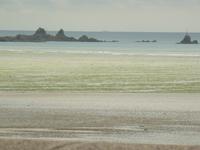 Und die Wanderer hatten wieder volles Programm. Das Wetter war heute nicht mehr strahlend blau. Wolken färbten das Meer und das Land in Pastellfarben. Wir starteten an der Glass Church, die Renée Lalique ausgestaltet hatte. Lalique ist eigentlich für seinen Jugendstilschmuck bekannt, aber hier fanden wir etwas total anderes vor: er stellte auch Glaskunst aus Mattglas her. Und mancher Gast wünschte sich, dass er in der Nachkriegszeit die nahe gelegene Villa erworben hätte. Der Glückliche, dem das gelang, fand auf dem Dachboden eine alte Tür mit einer Glaseinlage von Renée Lalique, die er zum Verkauf anbot. Der Verkauf der Tür brachte ihm so viel Geld ein, dass er das Haus gleich mehrmals damit hätte abbezahlen können. Wir beschäftigten uns mit der Liebesgeschichte von Jesse Boot und Lady Florence Trent und wanderten dann los durch das Wasserwerkstal aufwärts auf schmalen Pfaden zu den historischen Gebäuden Le Rat und der Morel Farm. Dann gings wieder abwärts zur Küste. Der Sandstrand hier war voller Algen - hier wollte keiner ins Wasser. Aber wir fanden hier einige Muscheln. Dann saßen wir in einem Cafe mit Blick aufs Meer und genossen unseren Urlaub. Am Nachmittag besichtigten wir noch das Elizabeth Castle. Wir erreichten es noch zu Fuß. Aber bald schon kam die Flut und schnitt uns den Weg ab. Also schaukelten und schwammen wir mit einem himmelblauen Amphibienfahrzeug zurück nach St. Helier. Mit diesem Fahrzeug zu reisen ist echt ein Erlebnis!