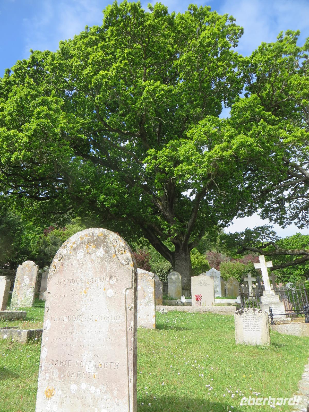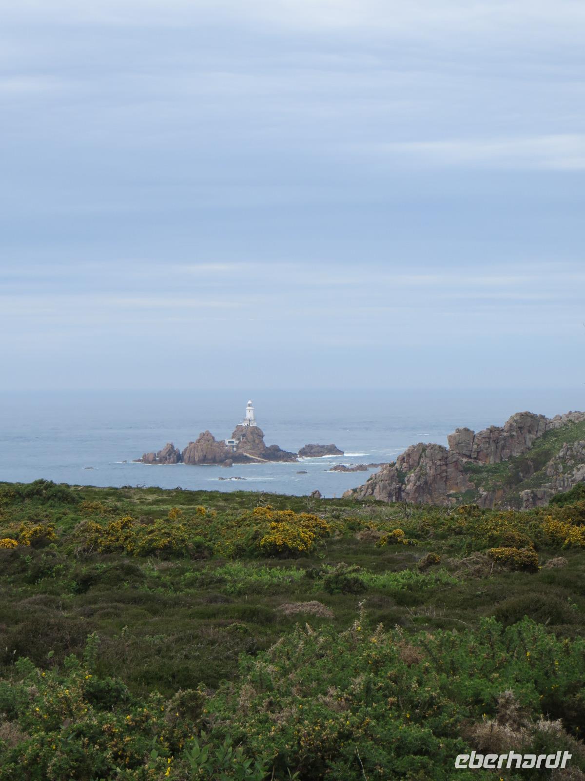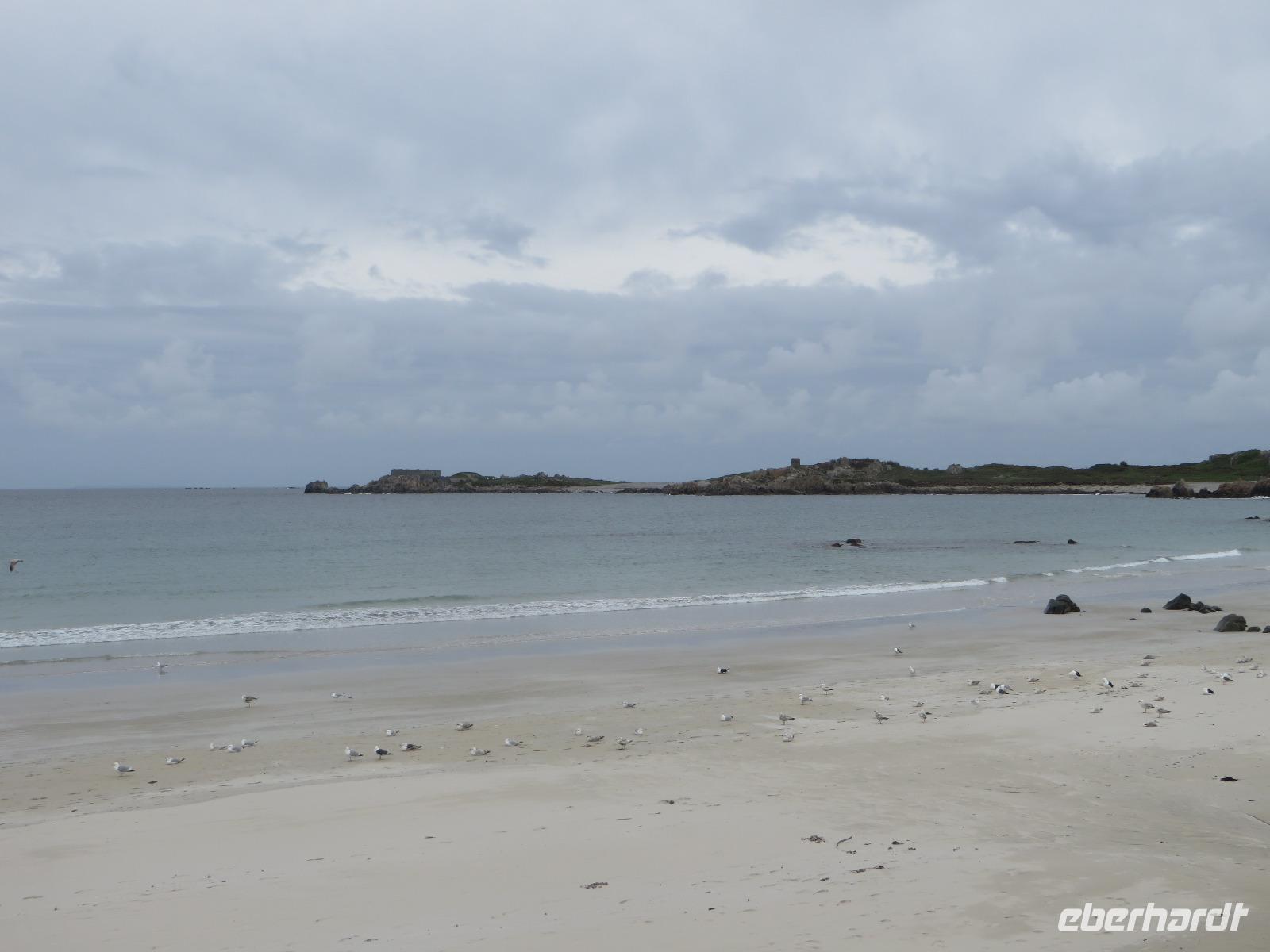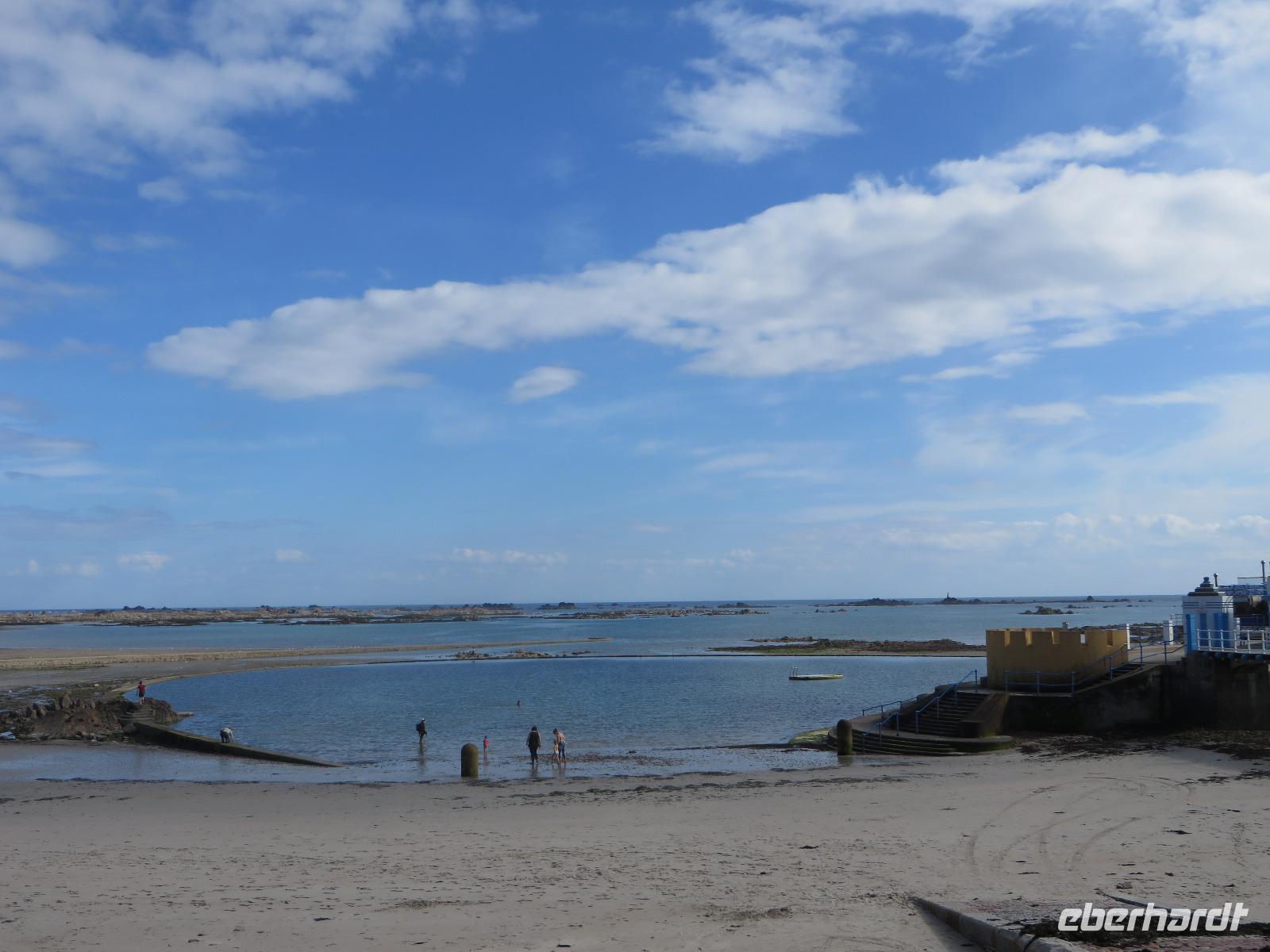 Heute zieht es uns in den Westen Jerseys, wo wir entlang der Klippen zum Corbière Leuchtturm wandern wollen, einem der Wahrzeichen der Insel. Heute begleitet uns Ernst auf unserer Wanderung, und wir fahren zunächst nach St. Brelades Bay. Von hier aus geht es direkt am wunderschönen Sandstrand entlang zur Kirche St. Brelades und der alten Fischerkapelle. Die Kapelle ist aus dem 11. Jahrhundert und es sind einige alte Fresken aus dem 14. Jahrhundert erhalten - wir sind beeindruckt! Unter den 500 Jahre alten Eichen steht die schöne Kirche aus Felssteinen, die wir im Anschluss besichtigen. Danach geht es los hoch auf den Klippenwanderweg. Wir haben perfektes Wetter - nicht zu warm, nicht zu kalt, leichter Wind und Sonnenschein. Ernst sagt, wir sollen es lieber genießen, ab morgen soll es schlechter werden. Noch ahnen wir nicht, wie recht er behalten soll. Wir wandern entlang der Küste durch Steineichenwälder und sind immer wieder begeistert von den verschiedenen Ausblicken in die kleinen Buchten. St. Brelades Bay, so erklärt uns Ernst, ist das Hollywood der Kanalinseln, denn hier wohnt jeder, der Rang und Namen hat. Unterwegs machen wir eine kleine Pause und genießen ein paar Kekse mit der berühmten Black Butter, ein bisschen Fudge und leckere Mannerwaffeln, die Ernst aus seinem letzten Österreichurlaub mitgebracht hat. Weiter geht es entlang des Entsalzungswerkes Richtung Leuchtturm. Die Blumenpracht der Margeriten, der aus Südafrika stammenden Hottentottenblumen und des Ginsters begeistern uns. Selbst Ernst ist beeindruckt - eine solche Fülle an blühenden Hottentottenblumen hat auch er hier noch nicht gesehen! Am Leuchtturm angekommen machen wir unsere Mittagspause - ein Glück, denn in diesem Moment kommt ein kräftiger Schauer herunter. Nach dem Mittagessen ist die Flut soweit zurück, dass einige von uns zum Leuchtturm laufen, während wir anderen die Rundreisegruppe in Empfang nehmen. Anschließend wandern wir entlang der ehemaligen Bahnstrecke zurück nach St. Aubin, quer durchs Landesinnere. Heidi und Ernst fahren uns zurück ins Hotel, wo wir uns schnell frisch machen, denn wir wollen heute außer Haus essen. So treffen wir die beiden nach kurzer Zeit wieder und fahren zum Restaurant und genießen ein leckeres Abendbrot. Für die von uns, die wollen, geht es im Anschluss weiter in ein traditionelles Pub.