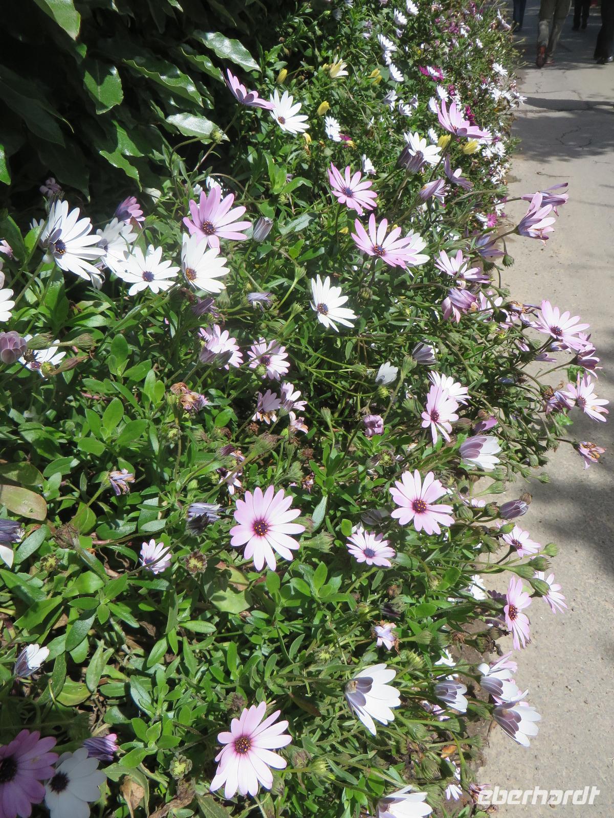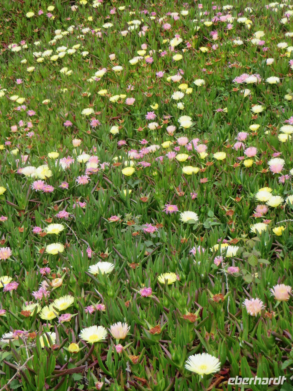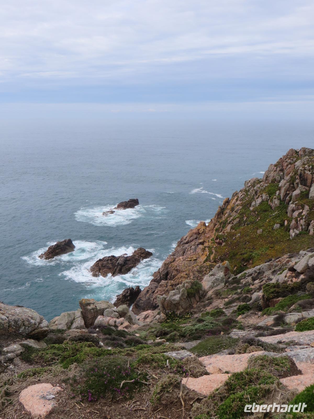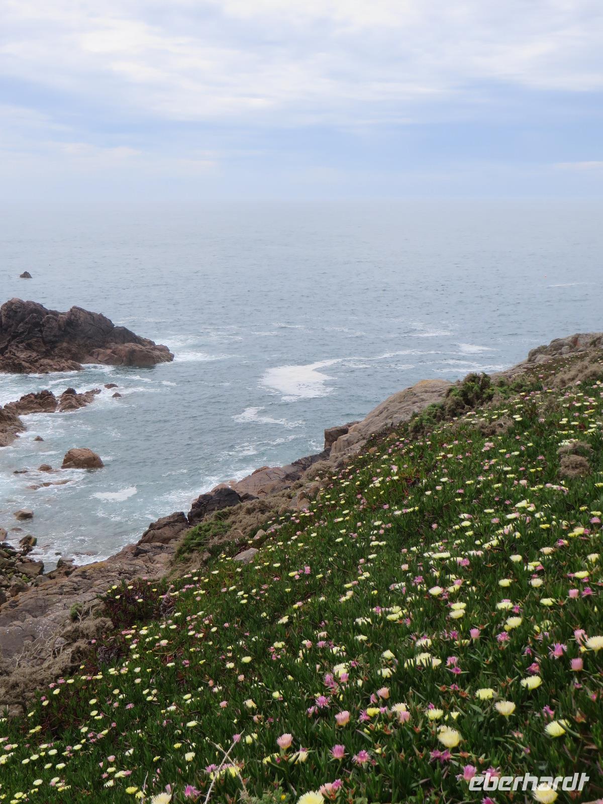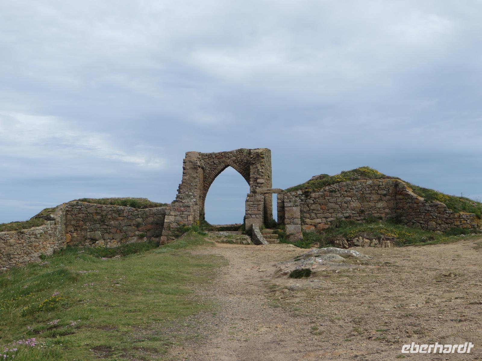 Heute zieht es uns in den Westen Jerseys, wo wir entlang der Klippen zum Corbière Leuchtturm wandern wollen, einem der Wahrzeichen der Insel. Heute begleitet uns Ernst auf unserer Wanderung, und wir fahren zunächst nach St. Brelades Bay. Von hier aus geht es direkt am wunderschönen Sandstrand entlang zur Kirche St. Brelades und der alten Fischerkapelle. Die Kapelle ist aus dem 11. Jahrhundert und es sind einige alte Fresken aus dem 14. Jahrhundert erhalten - wir sind beeindruckt! Unter den 500 Jahre alten Eichen steht die schöne Kirche aus Felssteinen, die wir im Anschluss besichtigen. Danach geht es los hoch auf den Klippenwanderweg. Wir haben perfektes Wetter - nicht zu warm, nicht zu kalt, leichter Wind und Sonnenschein. Ernst sagt, wir sollen es lieber genießen, ab morgen soll es schlechter werden. Noch ahnen wir nicht, wie recht er behalten soll. Wir wandern entlang der Küste durch Steineichenwälder und sind immer wieder begeistert von den verschiedenen Ausblicken in die kleinen Buchten. St. Brelades Bay, so erklärt uns Ernst, ist das Hollywood der Kanalinseln, denn hier wohnt jeder, der Rang und Namen hat. Unterwegs machen wir eine kleine Pause und genießen ein paar Kekse mit der berühmten Black Butter, ein bisschen Fudge und leckere Mannerwaffeln, die Ernst aus seinem letzten Österreichurlaub mitgebracht hat. Weiter geht es entlang des Entsalzungswerkes Richtung Leuchtturm. Die Blumenpracht der Margeriten, der aus Südafrika stammenden Hottentottenblumen und des Ginsters begeistern uns. Selbst Ernst ist beeindruckt - eine solche Fülle an blühenden Hottentottenblumen hat auch er hier noch nicht gesehen! Am Leuchtturm angekommen machen wir unsere Mittagspause - ein Glück, denn in diesem Moment kommt ein kräftiger Schauer herunter. Nach dem Mittagessen ist die Flut soweit zurück, dass einige von uns zum Leuchtturm laufen, während wir anderen die Rundreisegruppe in Empfang nehmen. Anschließend wandern wir entlang der ehemaligen Bahnstrecke zurück nach St. Aubin, quer durchs Landesinnere. Heidi und Ernst fahren uns zurück ins Hotel, wo wir uns schnell frisch machen, denn wir wollen heute außer Haus essen. So treffen wir die beiden nach kurzer Zeit wieder und fahren zum Restaurant und genießen ein leckeres Abendbrot. Für die von uns, die wollen, geht es im Anschluss weiter in ein traditionelles Pub.