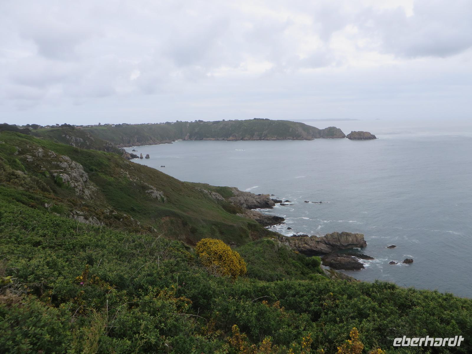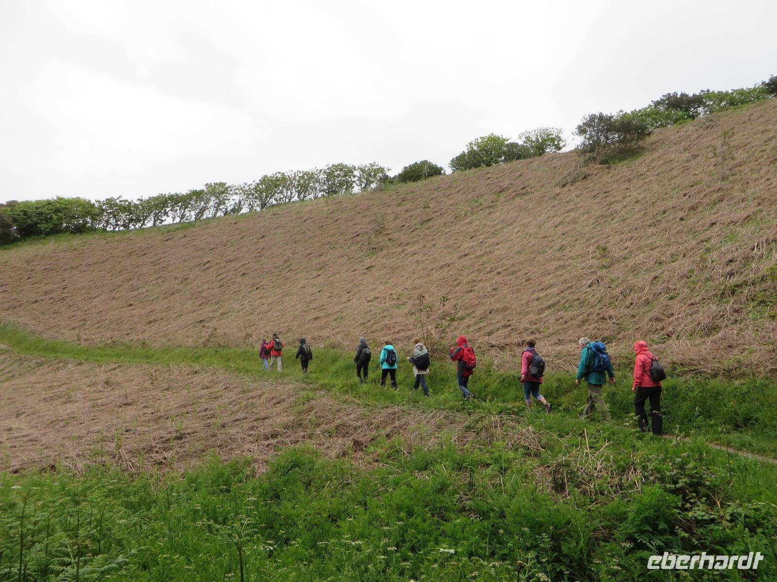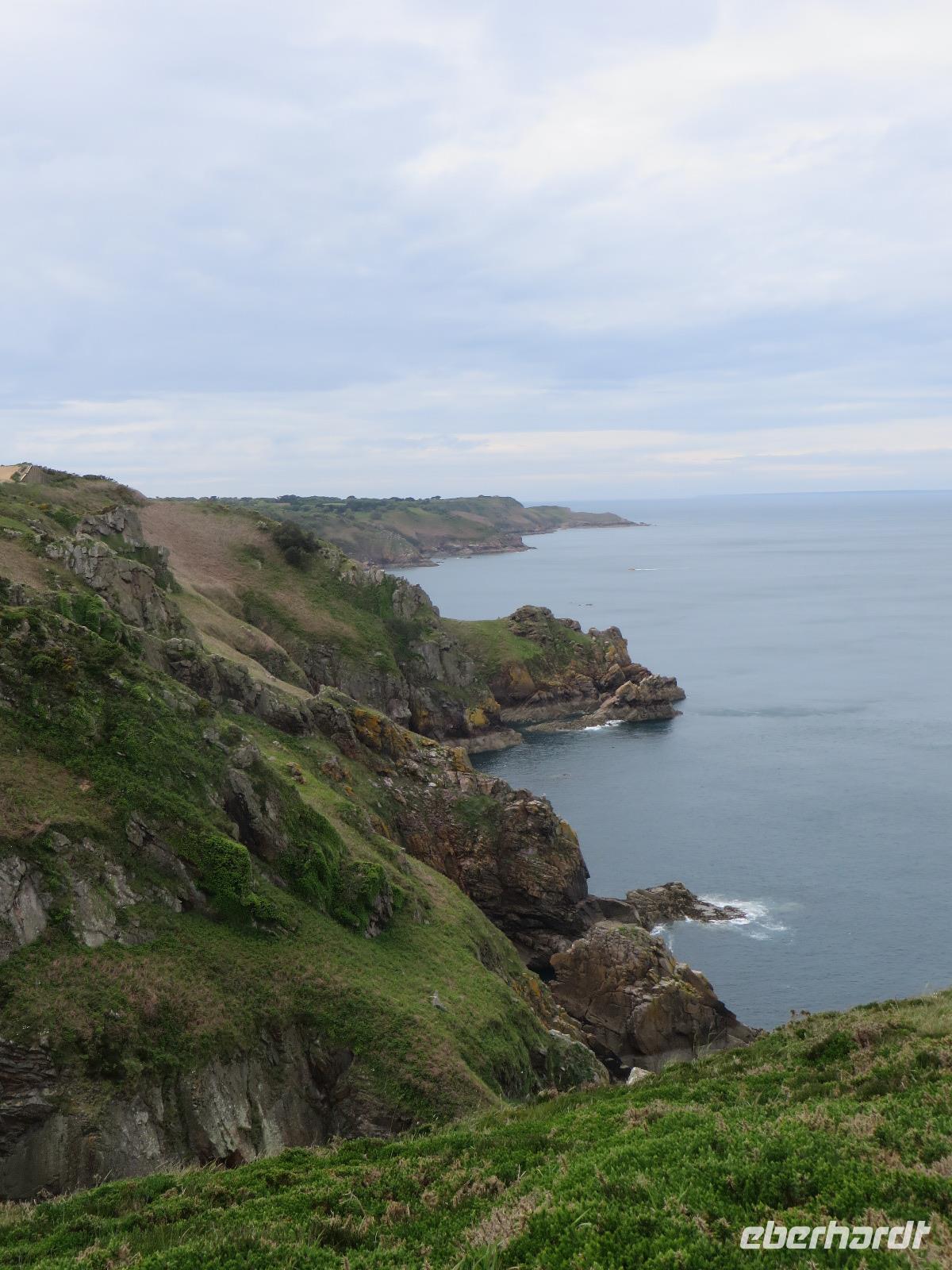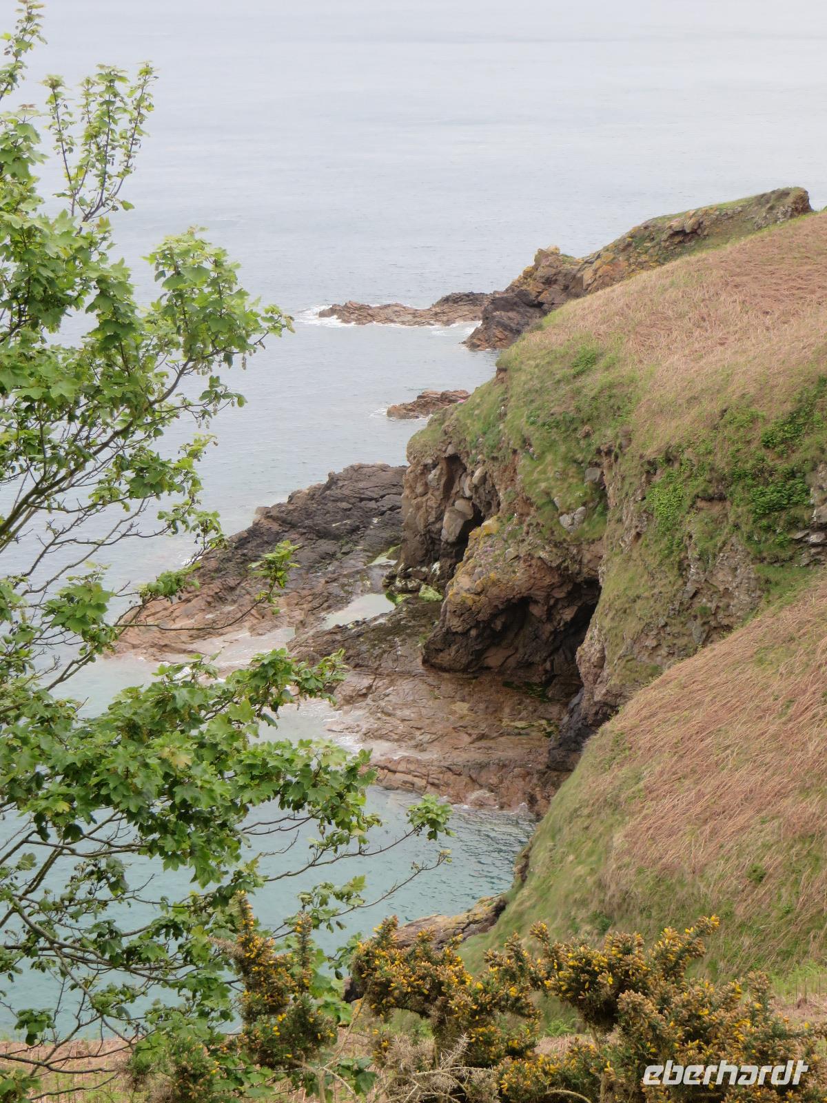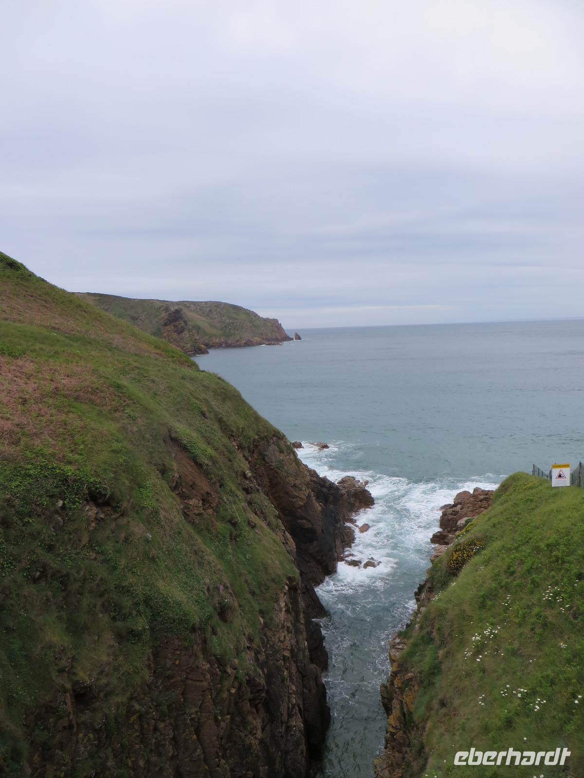 Heute erwartet uns eine Wanderung im Nordwesten Jerseys, und so geht es nach dem Frühstück los. Vorbei an den Coronation Gardens in St. Helier führt uns der Weg durch St. Ouen nach Grosnez Castle. Hier, an der Nordwestspitze, beginnt unsere Wanderung. Die raue Küste mit ihrer Heide und den vielen kleinwüchsigen Stachelginsterbüschen steht im deutlichen Kontrast zum gestrigen Ausflug nach Sark. Das Wetter, heute eher bedeckt und ein paar Tropfen kommen immer mal herunter, passt perfekt zu dieser Landschaft. Wir wandern entlang der Küste, und hinter jeder Biegung taucht eine andere schöne Bucht auf. Die steilen, oft bewachsenen Hänge bieten die perfekten Brutbedingungen für viele Seevögel. So sehen wir unterwegs unterschiedlichste Möwen, Austernfischer, Tölpel, aber auch Kolkraben, Kormorane, Fasane und Falken. Unser Weg führt uns nach Plemont Bay, wo wir unsere Mittagspause in einem Café direkt am Strand genießen. Der letzte Abschnitt der Wanderung führt uns vorbei an Greve de Lecq zum Devil's Hole, einer Art großem Loch, in der das Wasser meterhoch spritzen kann. Von hier aus sehen wir auch die ganze Küste, die wir heute erwandert haben, und sind zu Recht stolz auf unsere Leistung. Heidi bringt uns zurück zum Hotel, und nach dem Abendbrot beschließen wir gemeinsam mit einigen Teilnehmern der Rundreisegruppe, dass man auf den Britischen Inseln auch mal im Pub gewesen sein muss.
