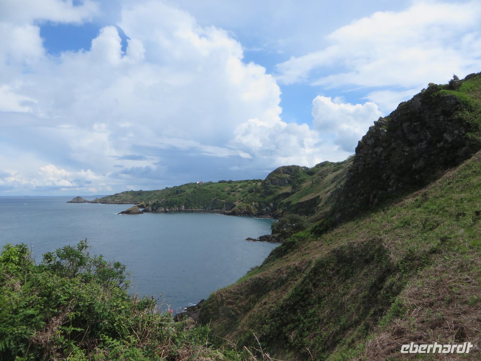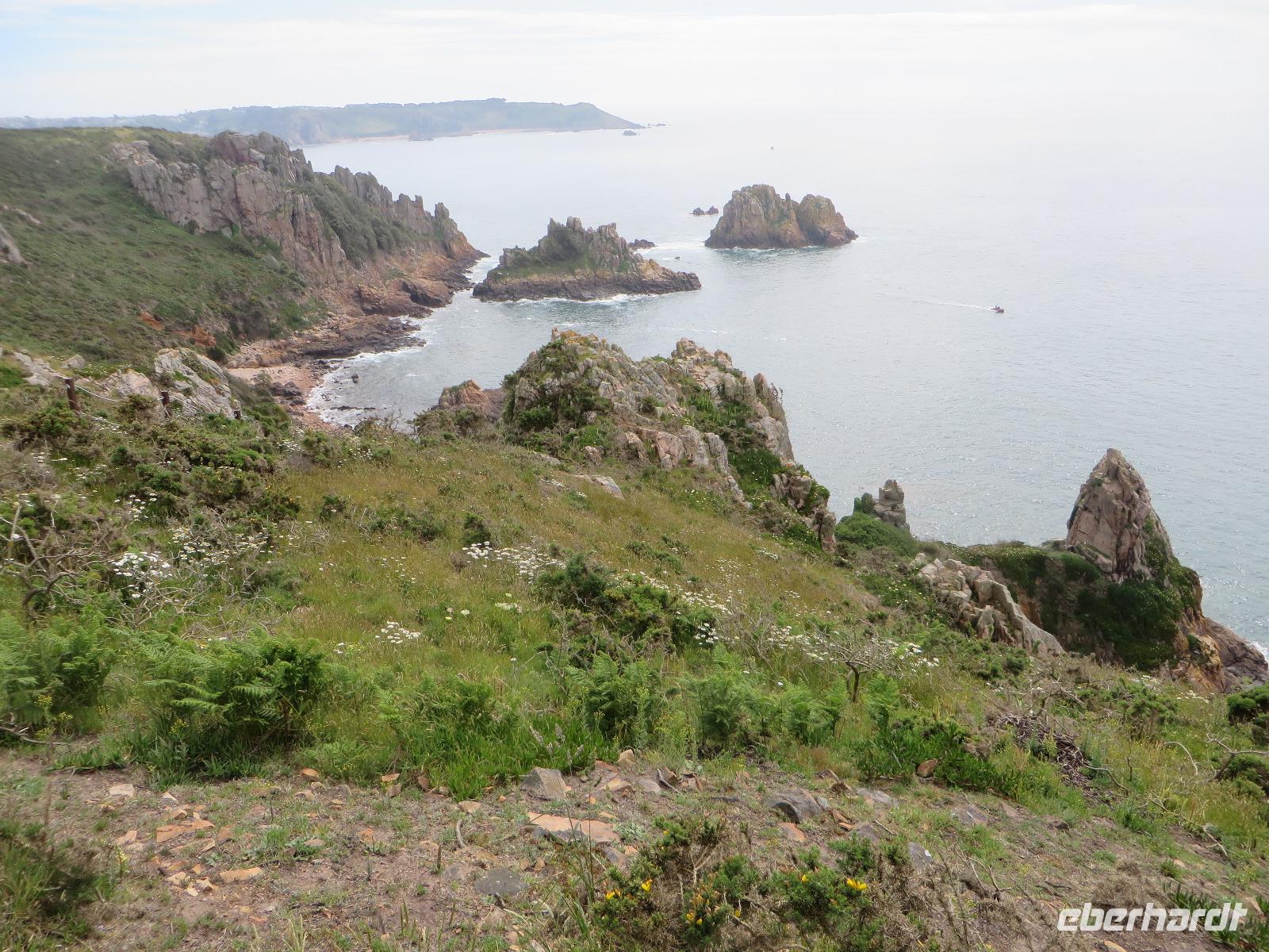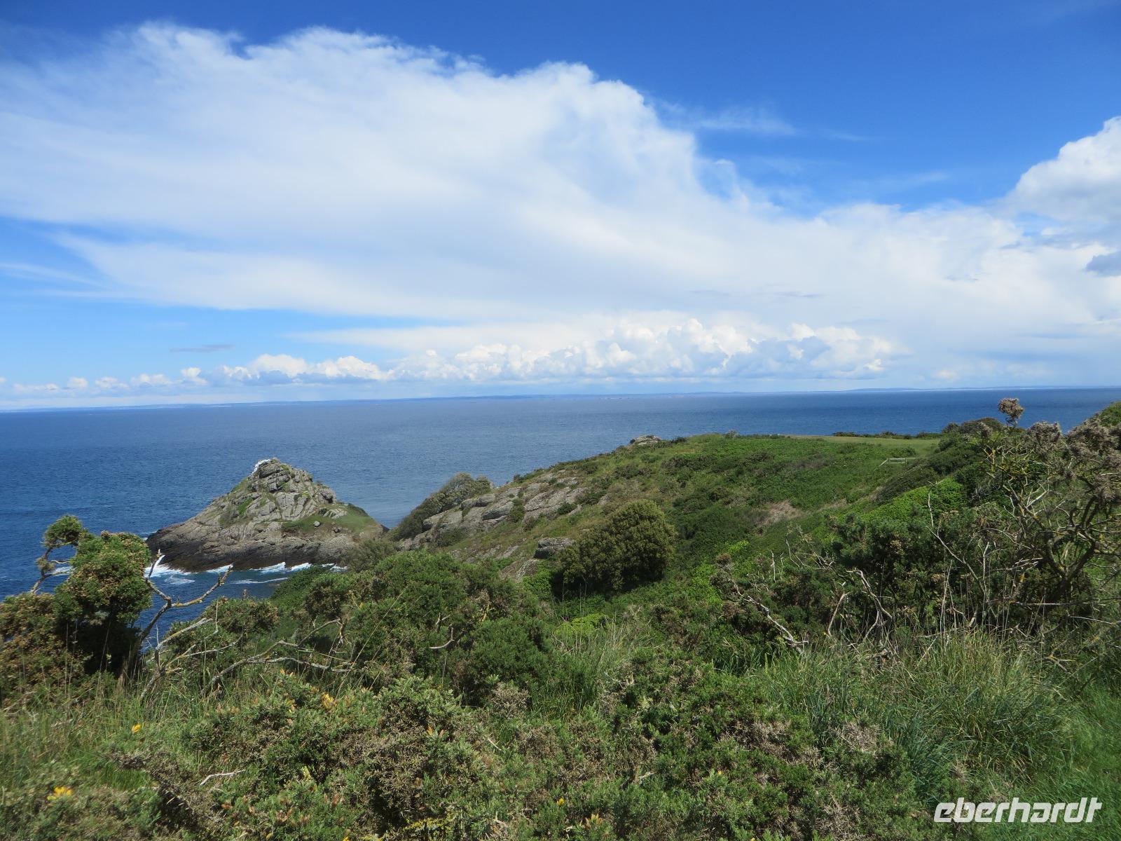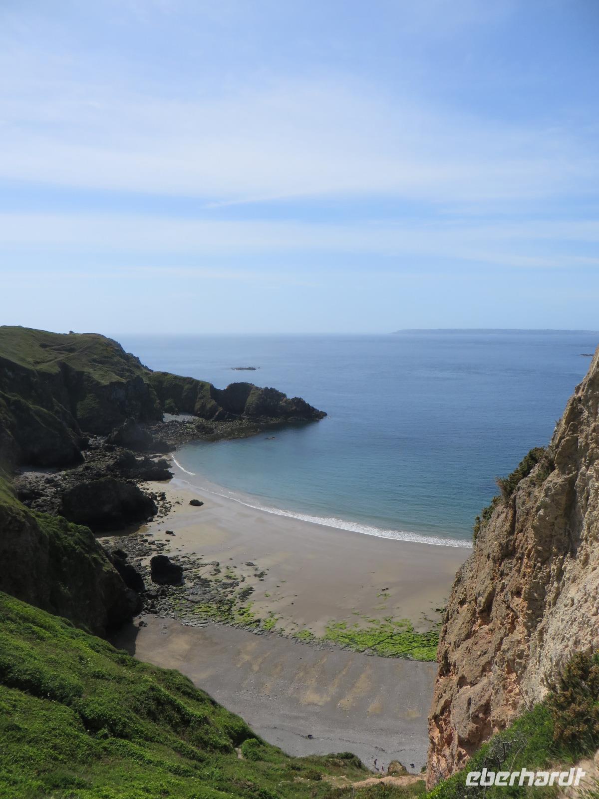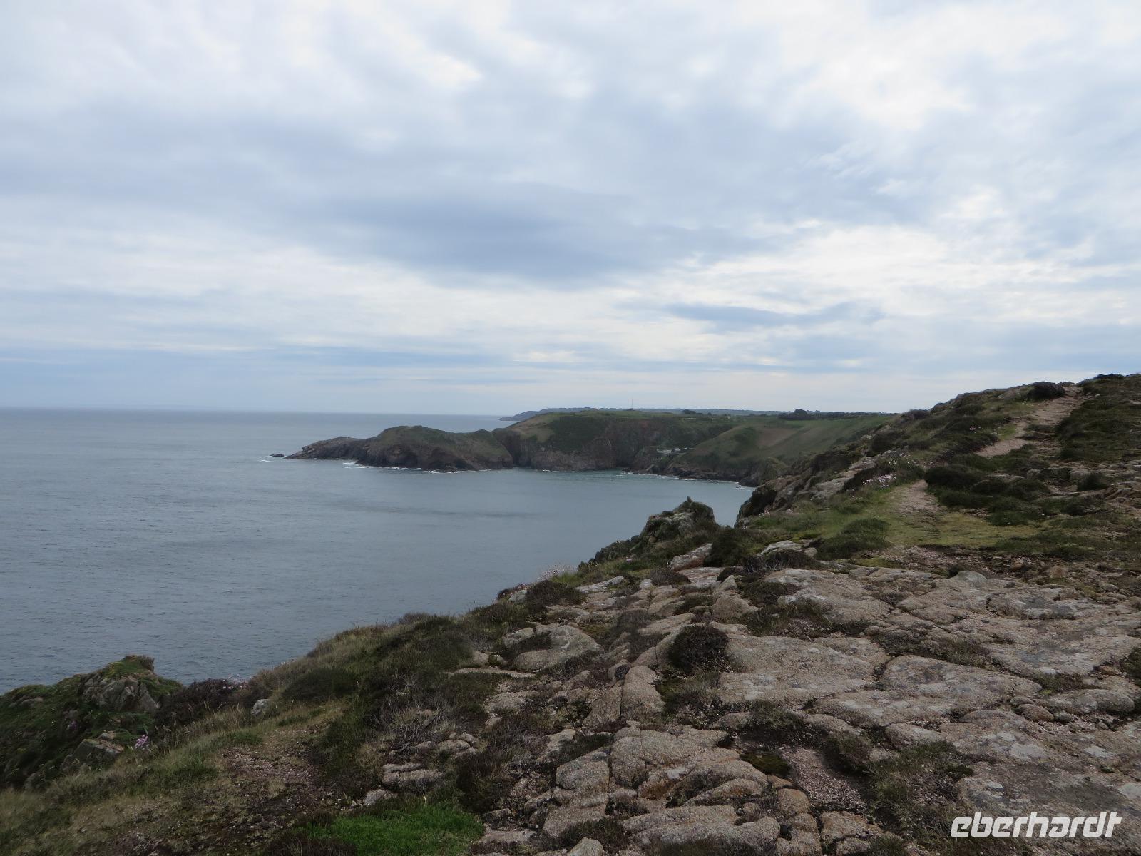 Heute erwartet uns eine Wanderung im Nordwesten Jerseys, und so geht es nach dem Frühstück los. Vorbei an den Coronation Gardens in St. Helier führt uns der Weg durch St. Ouen nach Grosnez Castle. Hier, an der Nordwestspitze, beginnt unsere Wanderung. Die raue Küste mit ihrer Heide und den vielen kleinwüchsigen Stachelginsterbüschen steht im deutlichen Kontrast zum gestrigen Ausflug nach Sark. Das Wetter, heute eher bedeckt und ein paar Tropfen kommen immer mal herunter, passt perfekt zu dieser Landschaft. Wir wandern entlang der Küste, und hinter jeder Biegung taucht eine andere schöne Bucht auf. Die steilen, oft bewachsenen Hänge bieten die perfekten Brutbedingungen für viele Seevögel. So sehen wir unterwegs unterschiedlichste Möwen, Austernfischer, Tölpel, aber auch Kolkraben, Kormorane, Fasane und Falken. Unser Weg führt uns nach Plemont Bay, wo wir unsere Mittagspause in einem Café direkt am Strand genießen. Der letzte Abschnitt der Wanderung führt uns vorbei an Greve de Lecq zum Devil's Hole, einer Art großem Loch, in der das Wasser meterhoch spritzen kann. Von hier aus sehen wir auch die ganze Küste, die wir heute erwandert haben, und sind zu Recht stolz auf unsere Leistung. Heidi bringt uns zurück zum Hotel, und nach dem Abendbrot beschließen wir gemeinsam mit einigen Teilnehmern der Rundreisegruppe, dass man auf den Britischen Inseln auch mal im Pub gewesen sein muss.