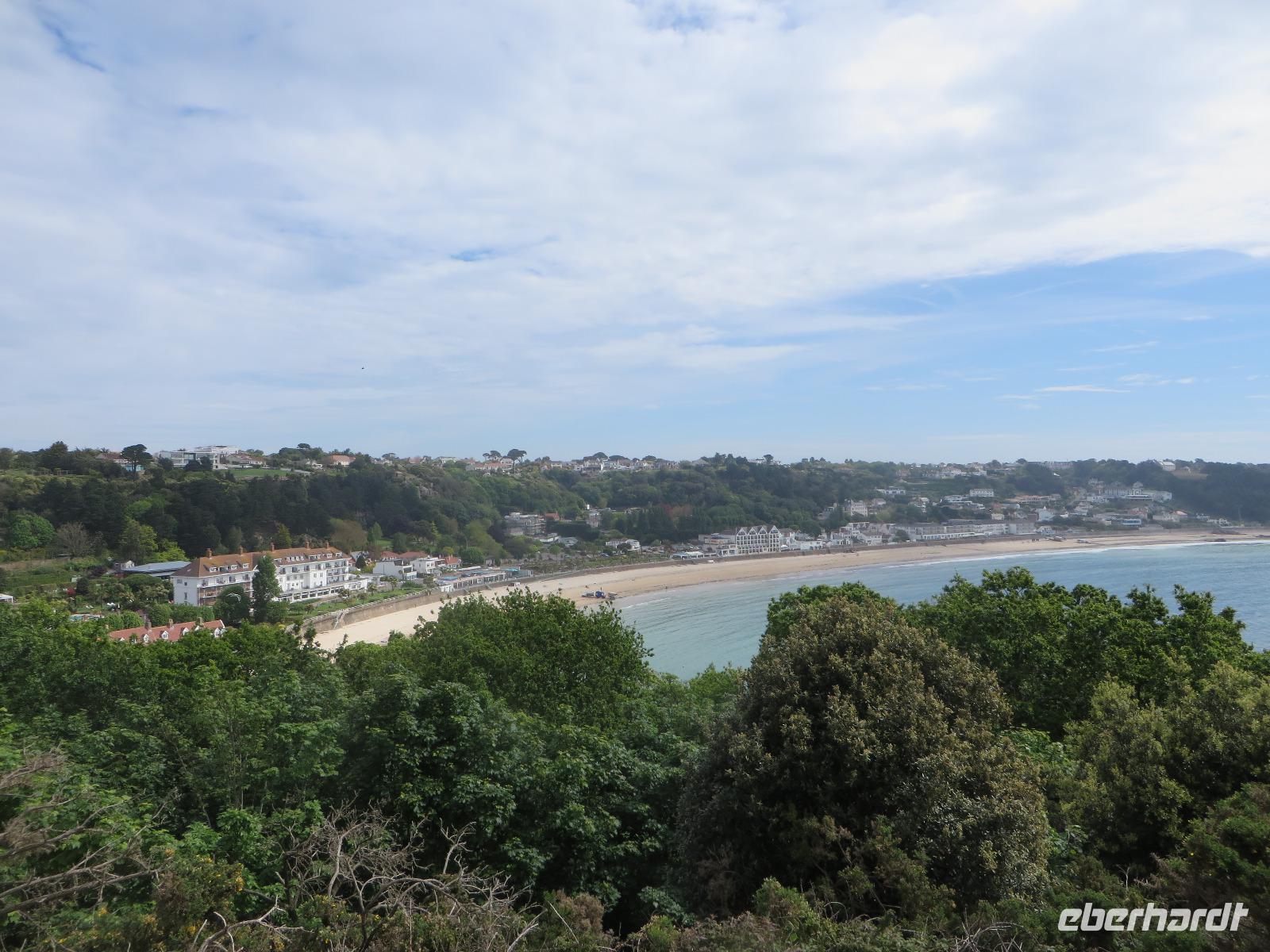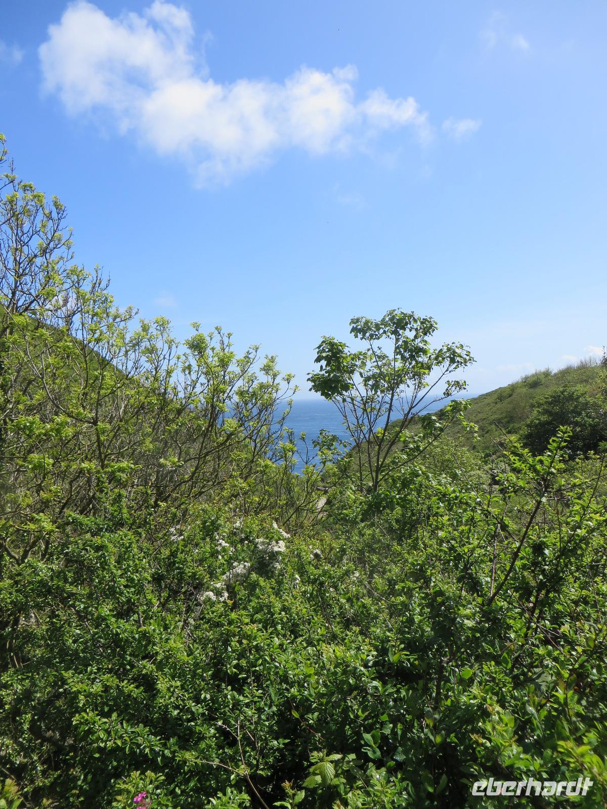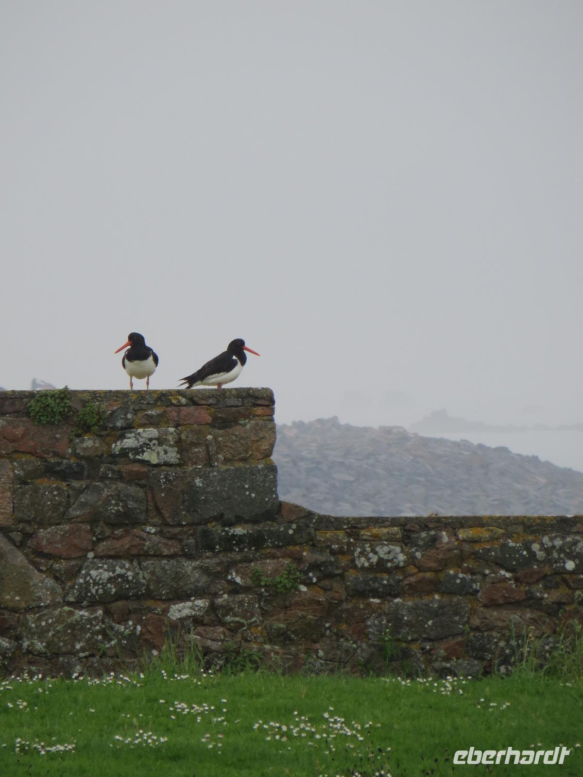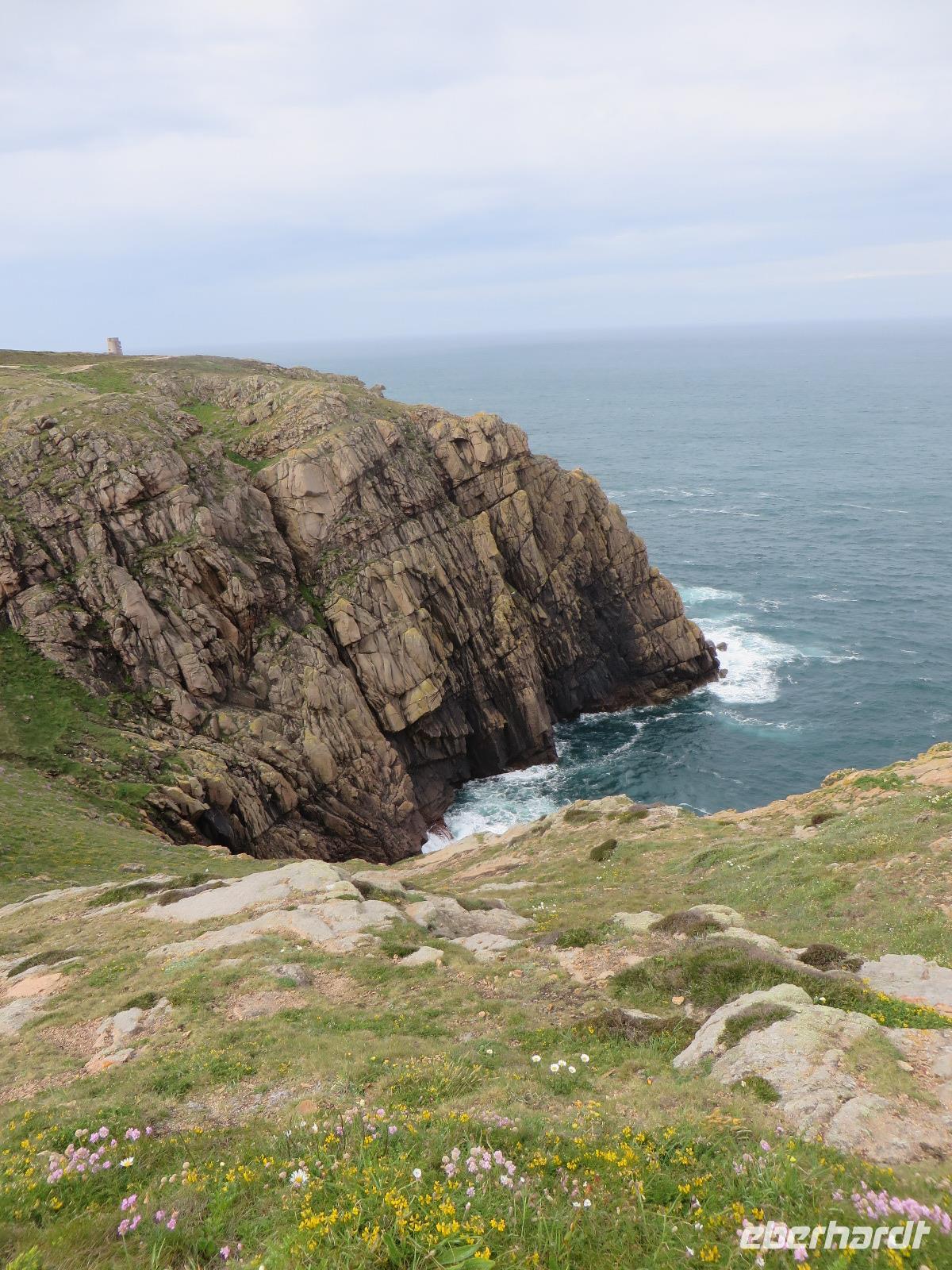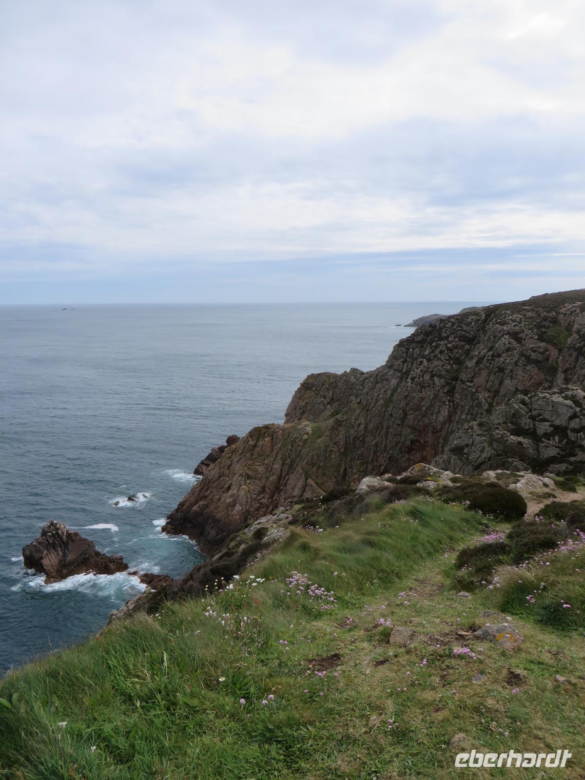 Heute erwartet uns eine Wanderung im Nordwesten Jerseys, und so geht es nach dem Frühstück los. Vorbei an den Coronation Gardens in St. Helier führt uns der Weg durch St. Ouen nach Grosnez Castle. Hier, an der Nordwestspitze, beginnt unsere Wanderung. Die raue Küste mit ihrer Heide und den vielen kleinwüchsigen Stachelginsterbüschen steht im deutlichen Kontrast zum gestrigen Ausflug nach Sark. Das Wetter, heute eher bedeckt und ein paar Tropfen kommen immer mal herunter, passt perfekt zu dieser Landschaft. Wir wandern entlang der Küste, und hinter jeder Biegung taucht eine andere schöne Bucht auf. Die steilen, oft bewachsenen Hänge bieten die perfekten Brutbedingungen für viele Seevögel. So sehen wir unterwegs unterschiedlichste Möwen, Austernfischer, Tölpel, aber auch Kolkraben, Kormorane, Fasane und Falken. Unser Weg führt uns nach Plemont Bay, wo wir unsere Mittagspause in einem Café direkt am Strand genießen. Der letzte Abschnitt der Wanderung führt uns vorbei an Greve de Lecq zum Devil's Hole, einer Art großem Loch, in der das Wasser meterhoch spritzen kann. Von hier aus sehen wir auch die ganze Küste, die wir heute erwandert haben, und sind zu Recht stolz auf unsere Leistung. Heidi bringt uns zurück zum Hotel, und nach dem Abendbrot beschließen wir gemeinsam mit einigen Teilnehmern der Rundreisegruppe, dass man auf den Britischen Inseln auch mal im Pub gewesen sein muss.