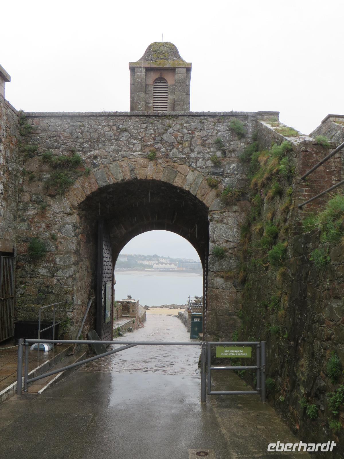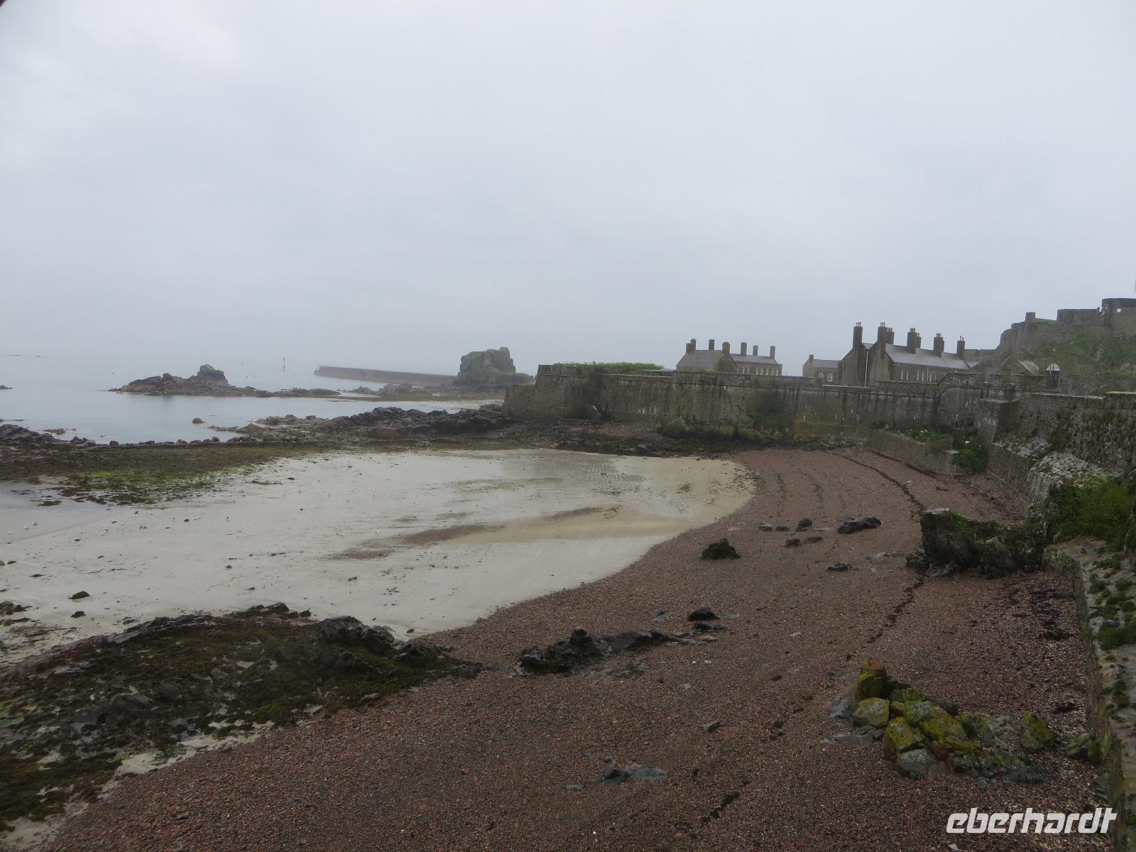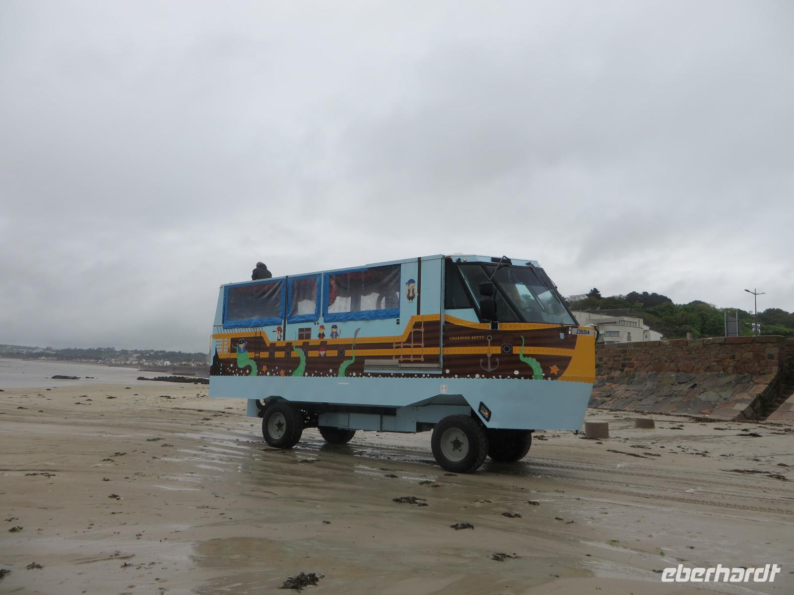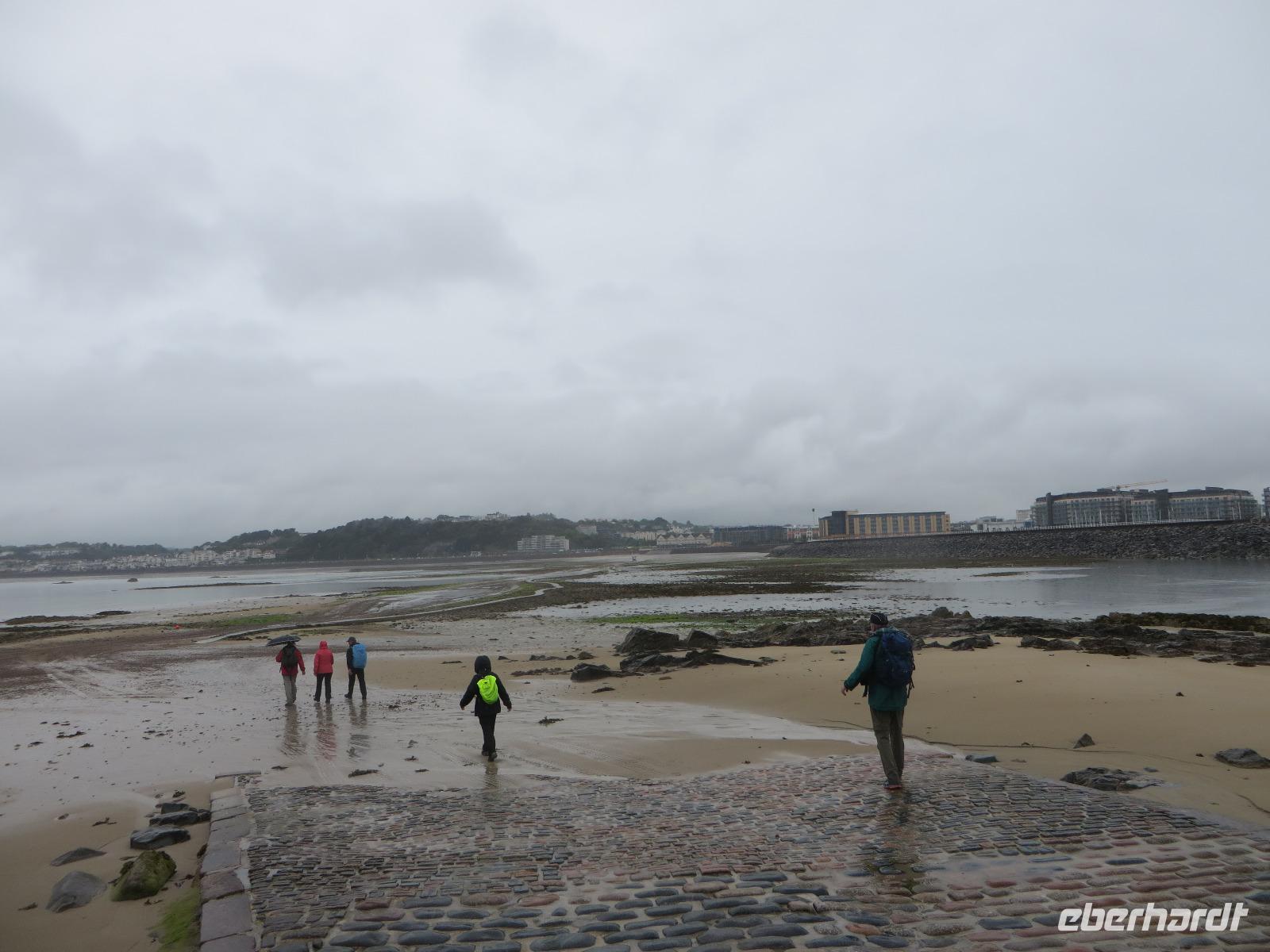 Ernst sollte Recht behalten - schon am Morgen ziehen dicke Regenwolken auf und es kommen immer wieder Schauer runter. Wir sind gut vorbereitet und mit der vollständigen Regenausrüstung geht es los ins Landesinnere. Zunächst halten wir an der Glaskirche und schauen uns diese an. Der Altar und vieles weitere in der Kirche wurde aus Glas gegossen, ein imposanter Anblick! Anschließend geht es los, auf in die Wälder rund um St. Helier. Trotz des Regens ist es sehr warm, und wir sind begeistert von der (sehr begründeten) sehr grünen Natur. So sehen wir unterwegs ein riesiges Feld voller gelber Schwertlilien in voller Blüte und kommen an Gärten vorbei, in denen unzählige Callas die Grundstücke schmücken. Wahnsinnig viel Arbeit steckt in diesen wunderschönen Gärten. Wir weichen nun dennoch auf die „Green Lanes", die schmalen, verkehrsberuhigten Straßen aus, es ist einfach zu nass mittlerweile. In St. Lawrence angekommen treffen wir auf Christels Sohn, der uns auf eine wärmende Tasse Tee in sein Haus einlädt. Wir beschließen, dass wir die Wanderung abkürzen werden, denn obwohl es warm ist, geben die ersten Jacken und Schuhe dem intensiven Regen nach. Weiter geht es entlang der vielen Weiden und unter wunderschönen alten Bäumen hindurch Richtung „War Tunnels", die Kriegstunnel, die die deutschen Besatzer in die Felsen haben treiben lassen. Hier machen wir eine längere Mittagspause und trocknen ein wenig, und nehmen im Anschluss den Bus zum Elisabeth Castle. Wir fahren mit dem „Puddle Duck", dem Amphibienfahrzeug, zur Festung hinaus. Bereits im 6. Jahrhundert war hier das erste Kloster, bevor es zu einer Abtei wurde und anschließend durch Queen Elisabeth die Erste zu einer Festung ausgebaut wurde, lernen wir in einer Zeitreise vom ansässigen Mönch. Von der Festung aus laufen wir zurück zum Ufer, denn mittlerweile ist Ebbe. Heidi holt uns ab und fährt uns zurück zum Hotel. Obwohl es so viel geregnet hat, haben wir die Wanderung wirklich genossen und schwärmen unseren Mitreisenden der Rundreisegruppe von unserer tollen Tour vor! Hoffentlich sieht das Wetter für morgen, da geht es nach Guernsey, besser aus!