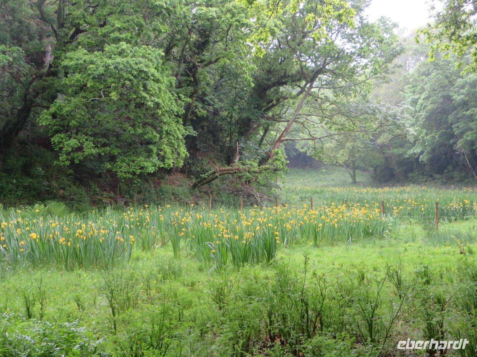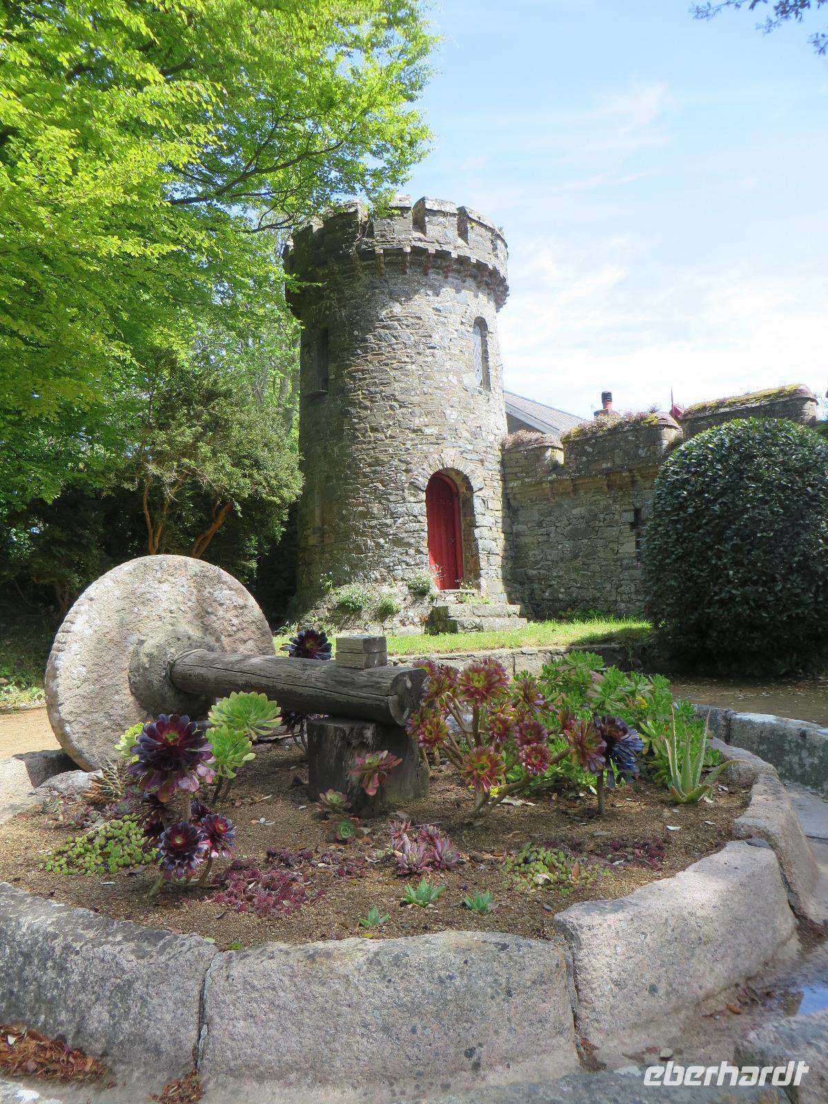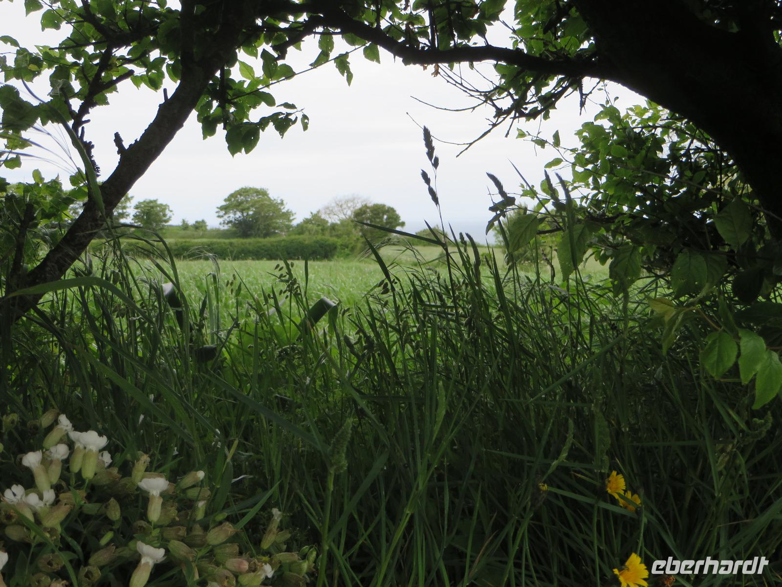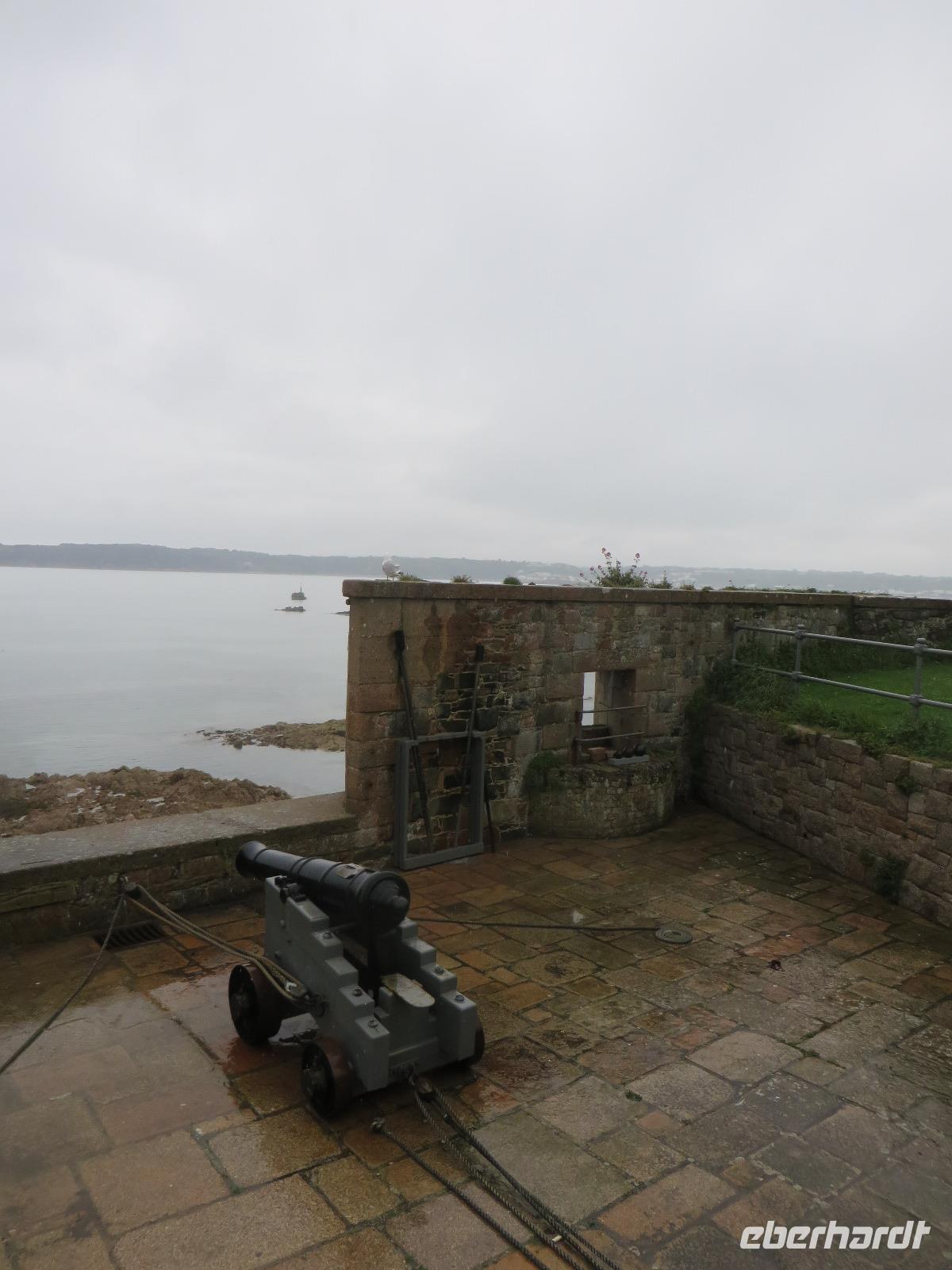 Ernst sollte Recht behalten - schon am Morgen ziehen dicke Regenwolken auf und es kommen immer wieder Schauer runter. Wir sind gut vorbereitet und mit der vollständigen Regenausrüstung geht es los ins Landesinnere. Zunächst halten wir an der Glaskirche und schauen uns diese an. Der Altar und vieles weitere in der Kirche wurde aus Glas gegossen, ein imposanter Anblick! Anschließend geht es los, auf in die Wälder rund um St. Helier. Trotz des Regens ist es sehr warm, und wir sind begeistert von der (sehr begründeten) sehr grünen Natur. So sehen wir unterwegs ein riesiges Feld voller gelber Schwertlilien in voller Blüte und kommen an Gärten vorbei, in denen unzählige Callas die Grundstücke schmücken. Wahnsinnig viel Arbeit steckt in diesen wunderschönen Gärten. Wir weichen nun dennoch auf die „Green Lanes", die schmalen, verkehrsberuhigten Straßen aus, es ist einfach zu nass mittlerweile. In St. Lawrence angekommen treffen wir auf Christels Sohn, der uns auf eine wärmende Tasse Tee in sein Haus einlädt. Wir beschließen, dass wir die Wanderung abkürzen werden, denn obwohl es warm ist, geben die ersten Jacken und Schuhe dem intensiven Regen nach. Weiter geht es entlang der vielen Weiden und unter wunderschönen alten Bäumen hindurch Richtung „War Tunnels", die Kriegstunnel, die die deutschen Besatzer in die Felsen haben treiben lassen. Hier machen wir eine längere Mittagspause und trocknen ein wenig, und nehmen im Anschluss den Bus zum Elisabeth Castle. Wir fahren mit dem „Puddle Duck", dem Amphibienfahrzeug, zur Festung hinaus. Bereits im 6. Jahrhundert war hier das erste Kloster, bevor es zu einer Abtei wurde und anschließend durch Queen Elisabeth die Erste zu einer Festung ausgebaut wurde, lernen wir in einer Zeitreise vom ansässigen Mönch. Von der Festung aus laufen wir zurück zum Ufer, denn mittlerweile ist Ebbe. Heidi holt uns ab und fährt uns zurück zum Hotel. Obwohl es so viel geregnet hat, haben wir die Wanderung wirklich genossen und schwärmen unseren Mitreisenden der Rundreisegruppe von unserer tollen Tour vor! Hoffentlich sieht das Wetter für morgen, da geht es nach Guernsey, besser aus!