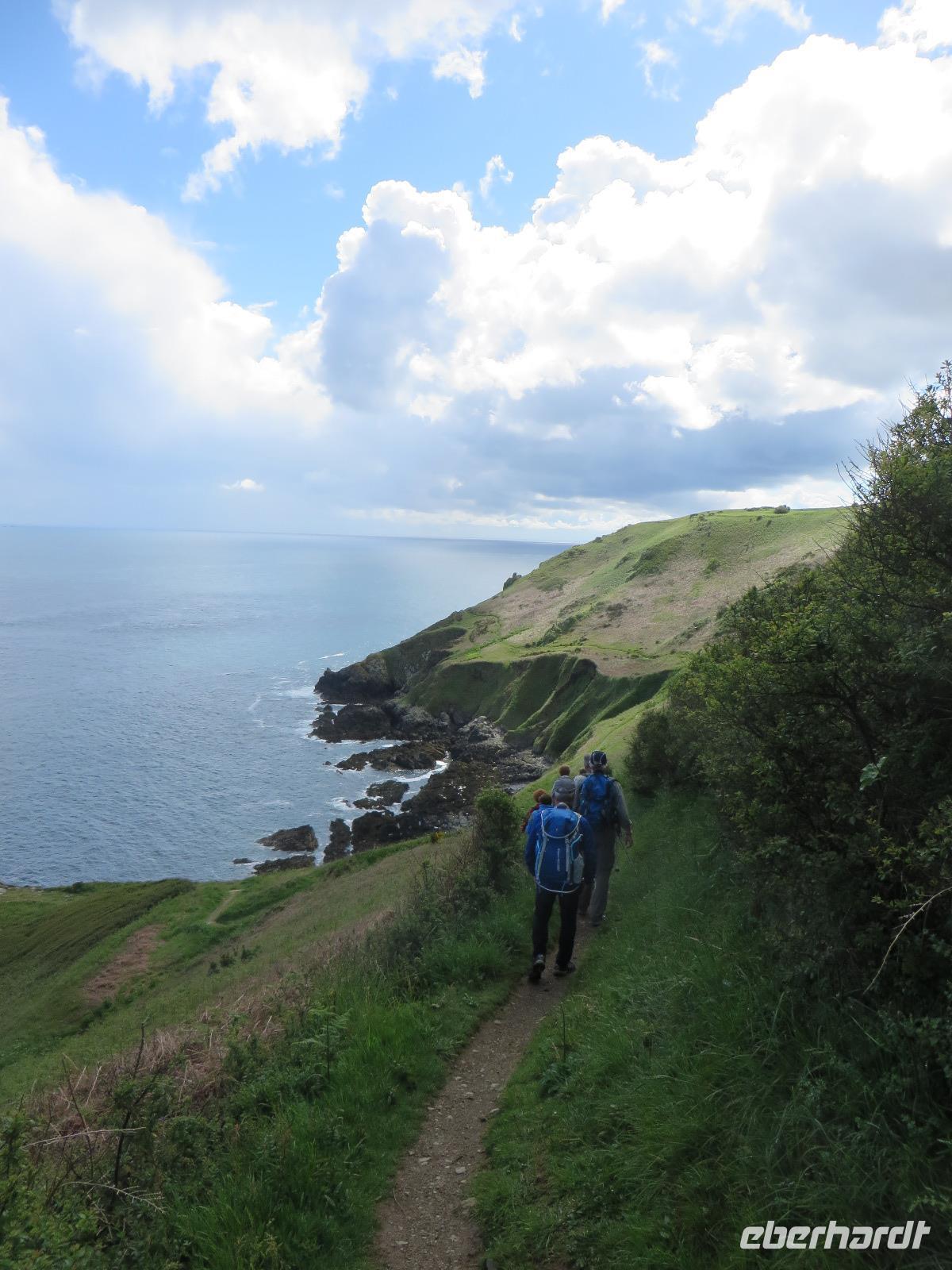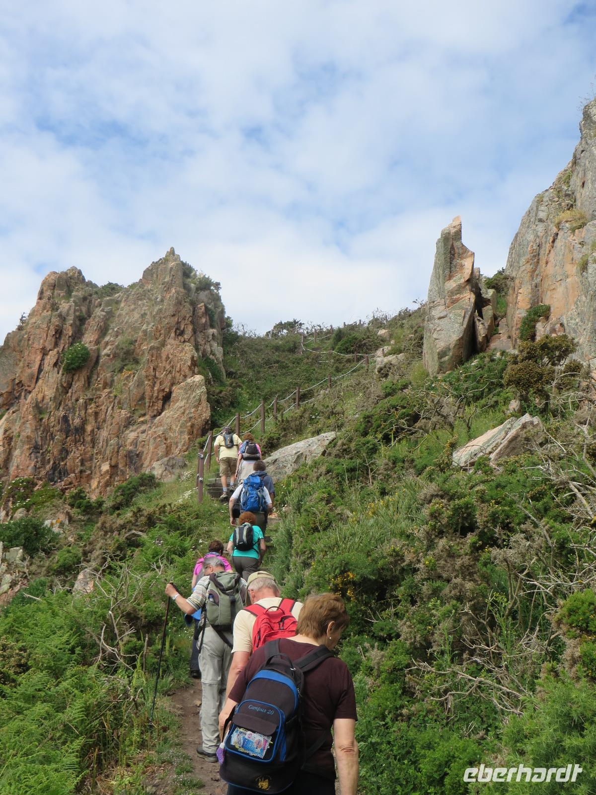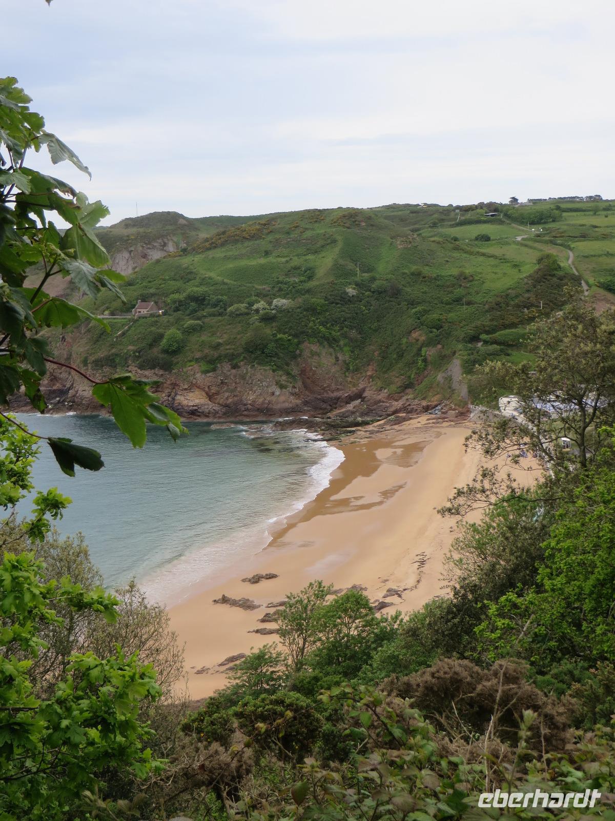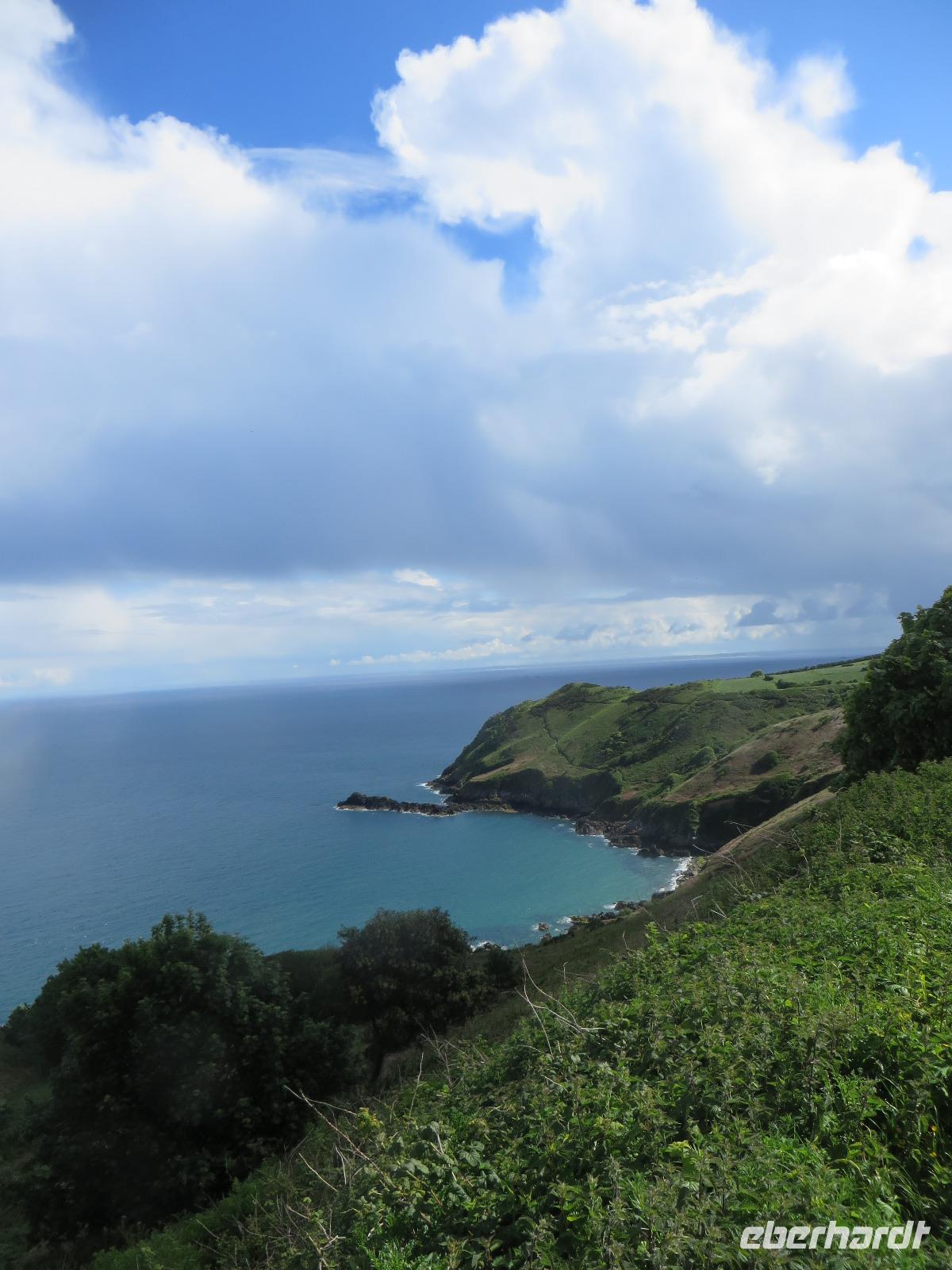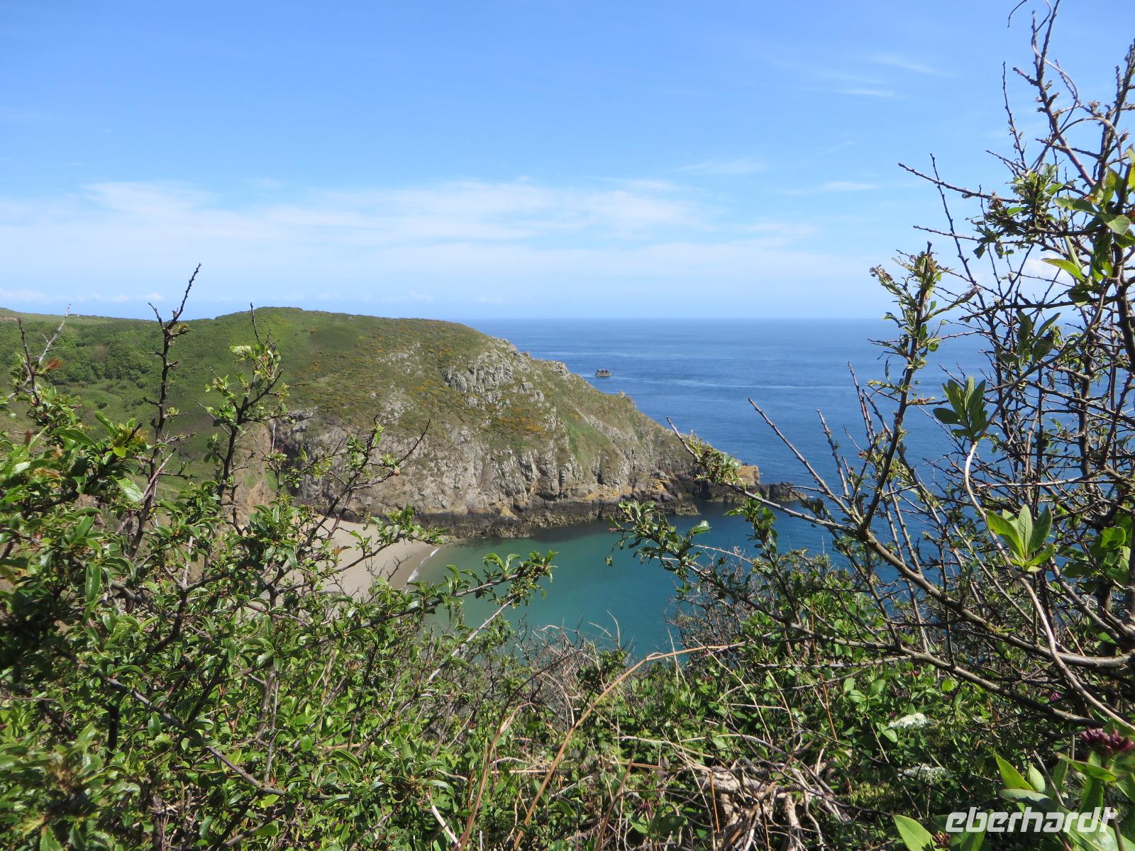 Heute zieht es uns nochmal an in den Norden an die bekannten Steilküsten für eine Wanderung mit Christel. Wir starten in der Bonne Nuit Bay und folgen den Klippenwegen immer weiter zu auf Frankreich. Am Horizont kommt die Normandie immer näher; man hat das Gefühl, dass dort unsere heutige Wanderung enden könnte. Einige von uns bekommen unterwegs bereits Begrüßungs-SMS aus Frankreich, so dicht kommen wir dran. Wir haben eine fantastische Sicht und können so sogar Häuser und Windräder auf die Ferne auf dem kontinentalen Festland sehen. Allerdings konzentrieren wir uns lieber auf Jersey. Die Wanderung durch kleine, wunderschöne tiefgrüne Wälder, entlang der Klippen und der Buchten bildet einen wirklich krönenden Abschluss unserer tollen Wanderungen. Gegen Mittag machen wir in der Schmugglerbucht "Bouley Bay" halt und genießen selbstgemachtes Essen bei "Mad Mary", bevor es weiter nach Rozel Bay geht. Hier wollen wir uns mit der Rundreisegruppe treffen wollen. Unterwegs suchen wir noch nach einem Geocache, der an einem tollen Aussichtspunkt kurz vor Rozel versteckt ist. In Rozel geht es mit der Rundreisegruppe dann zum Hotel "Chateau la Chaire", wo uns ein Jersey Cream Tea mit leckeren Scones, Marmelade und natürlich der Jersey Sahne erwartet. Lecker! Zurück am Hotel heißt es langsam aber sicher, packen, denn morgen geht es schon zurück nach Deutschland.