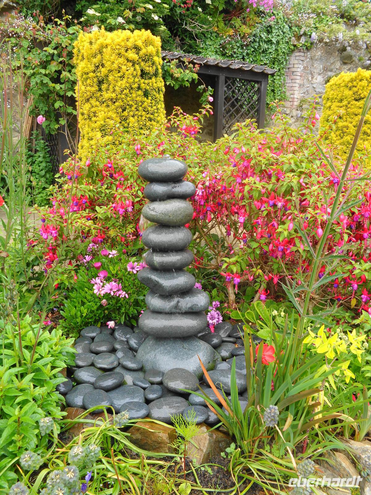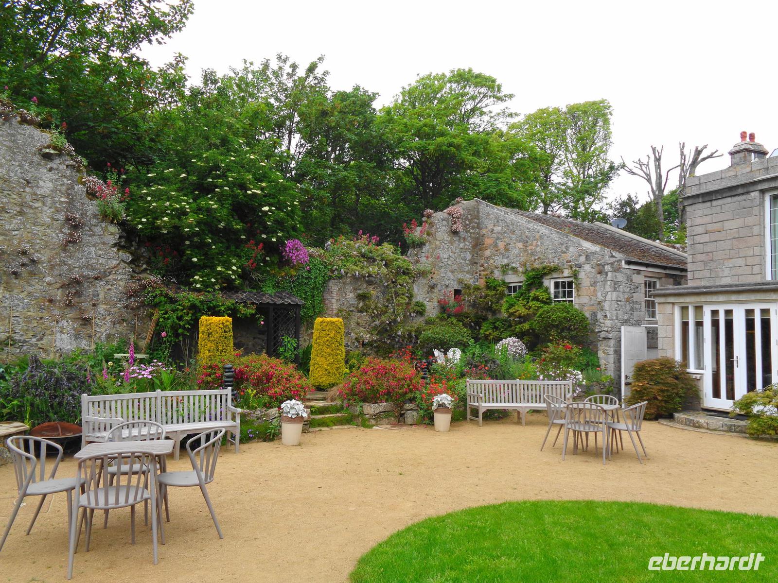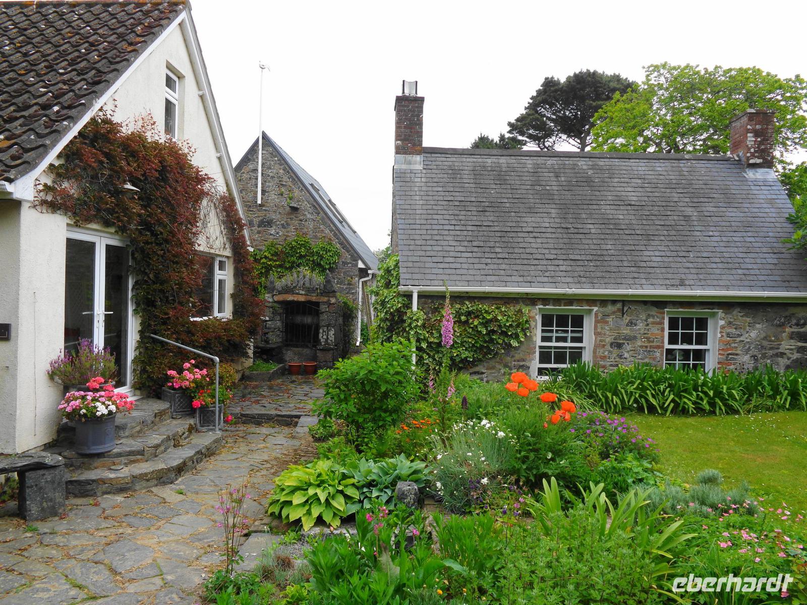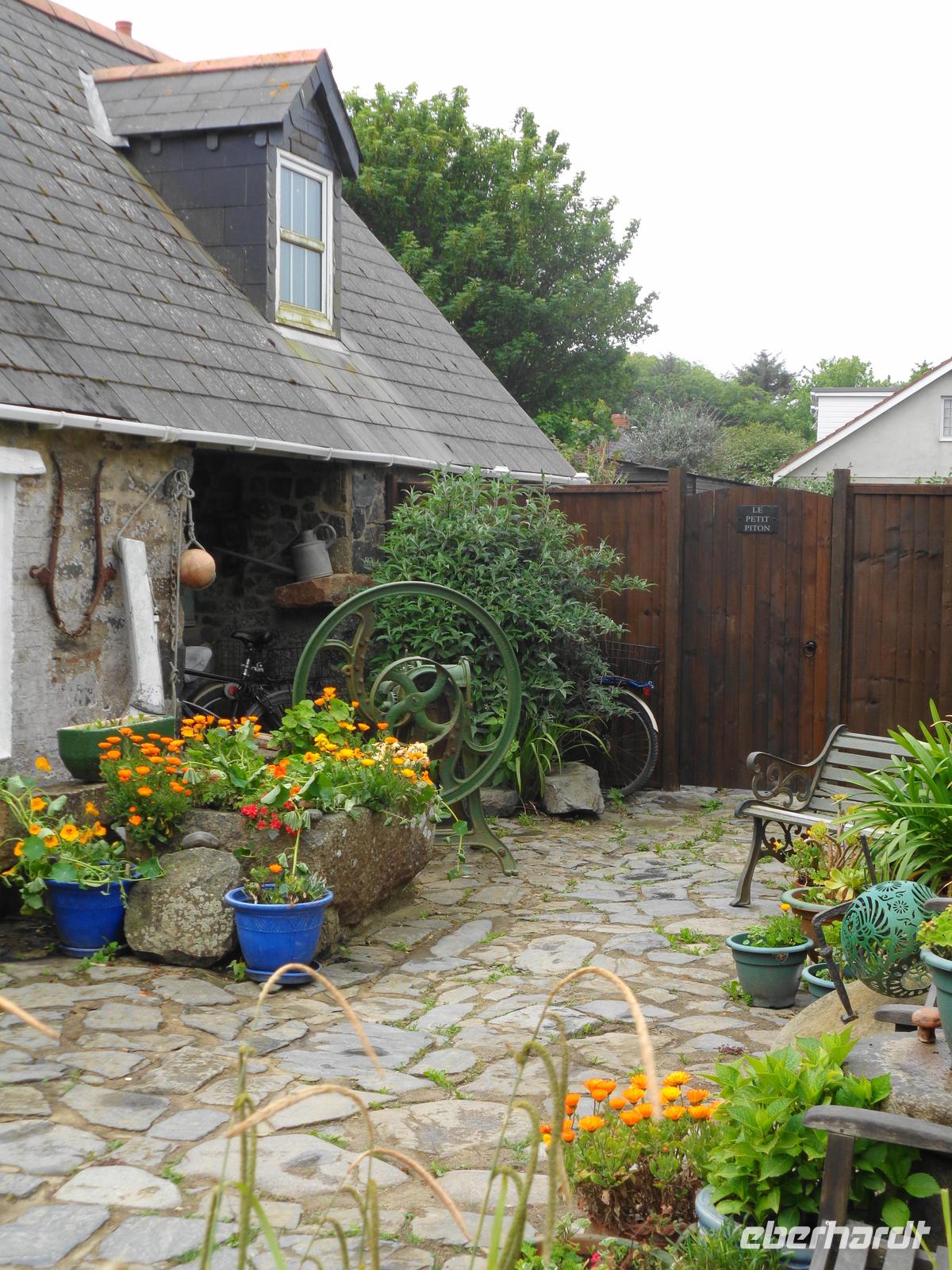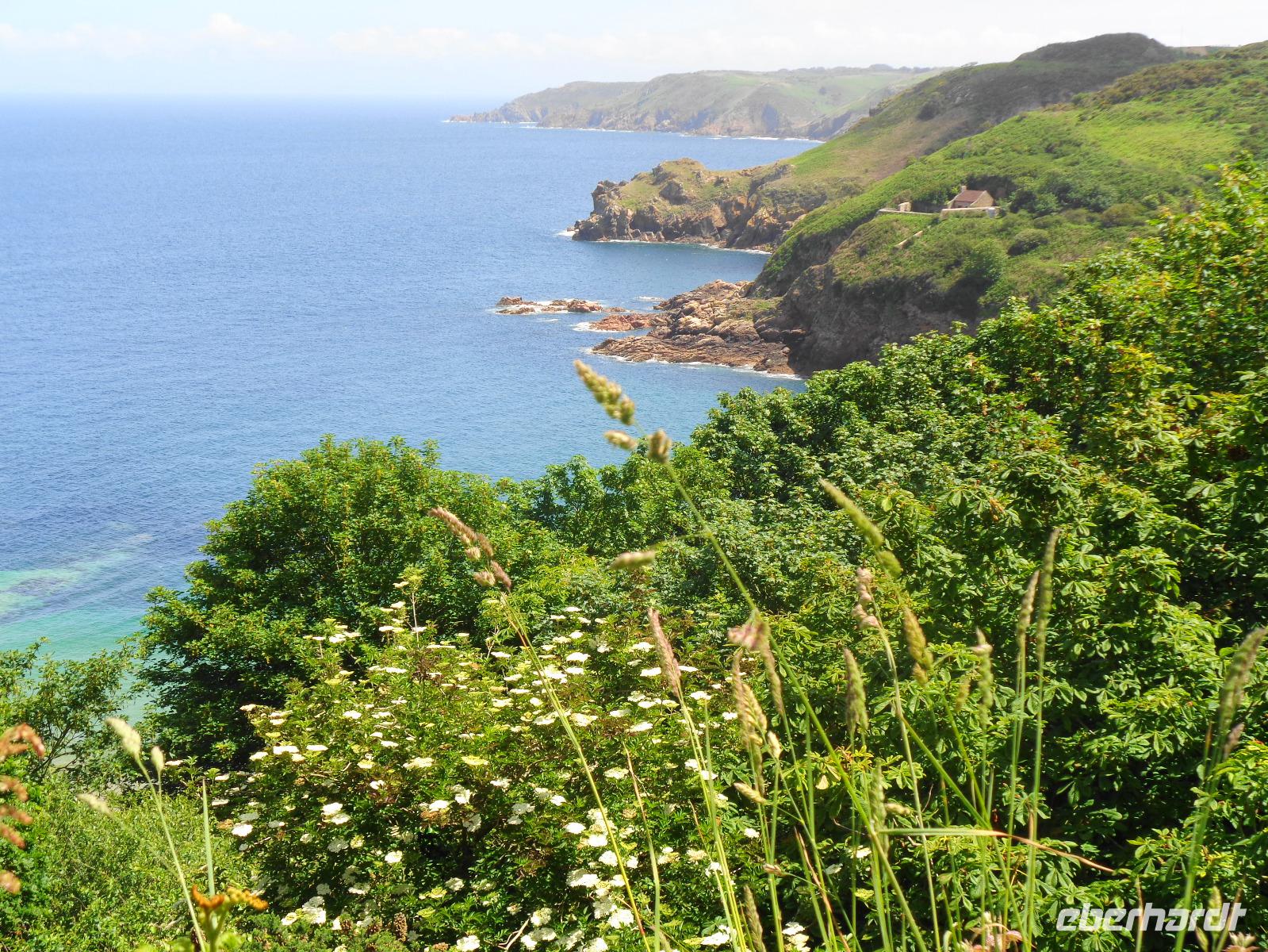 Sark, die zweitkleinste der Kanalinseln, liegt ca. 20 km nördlich von Jersey und ist mit ihren ca. 650 Einwohnern der kleinste europäische Staat. Fern von Hektik und Lärm taucht man ein in die Atmosphäre früherer Jahrhunderte: die einzigen Fortbewegungsmittel auf der autofreien Insel sind Traktoren, Pferdefuhrwerke und Fahrräder. Vom Hafen aus wanderten wir über einen steilen Berg hinauf auf die Hochebene. Weiter ging es durch grüne Weidelandschaft zum Sitz des „Seigneur", dem Gutshaus „La Perronerie", dessen üppige Gärten „La Seigneurie" aufgrund ihrer Blütenpracht eine der Hauptattraktionen der Insel sind. Mit Christine schlenderten wir zu den herrlichen Rosen- und Staudenbeeten, zum Taubenturm und zur Kapelle.