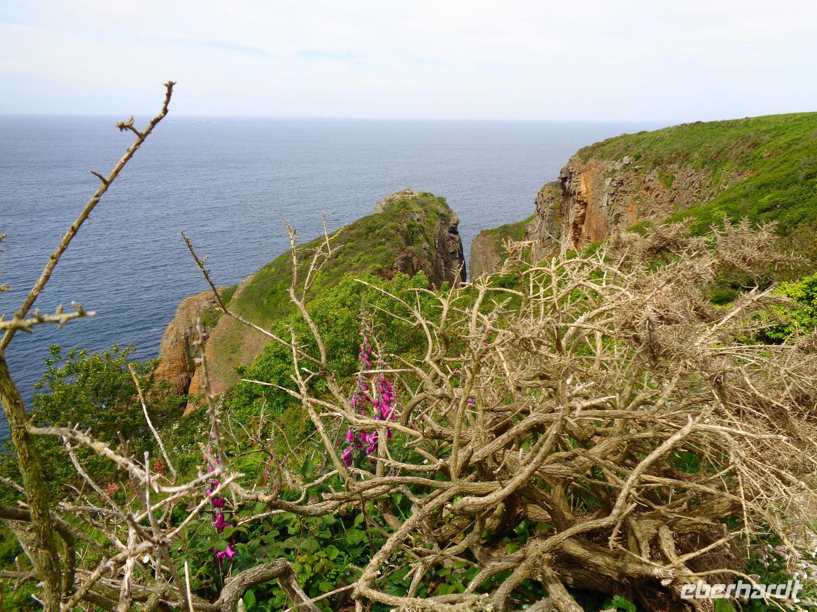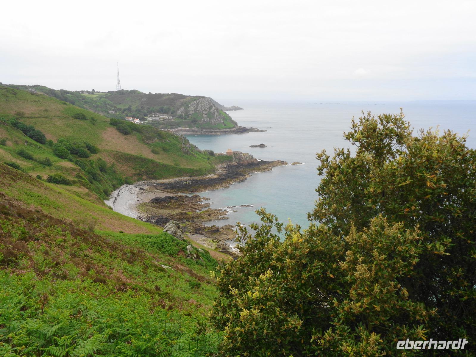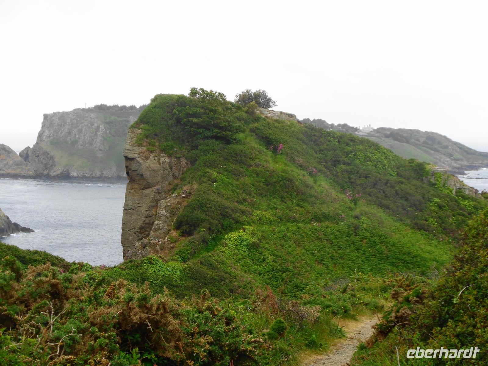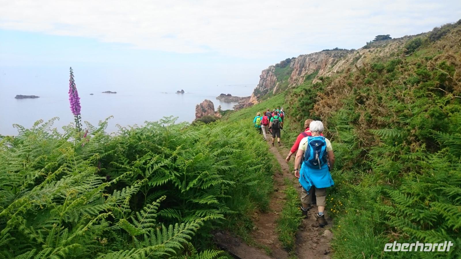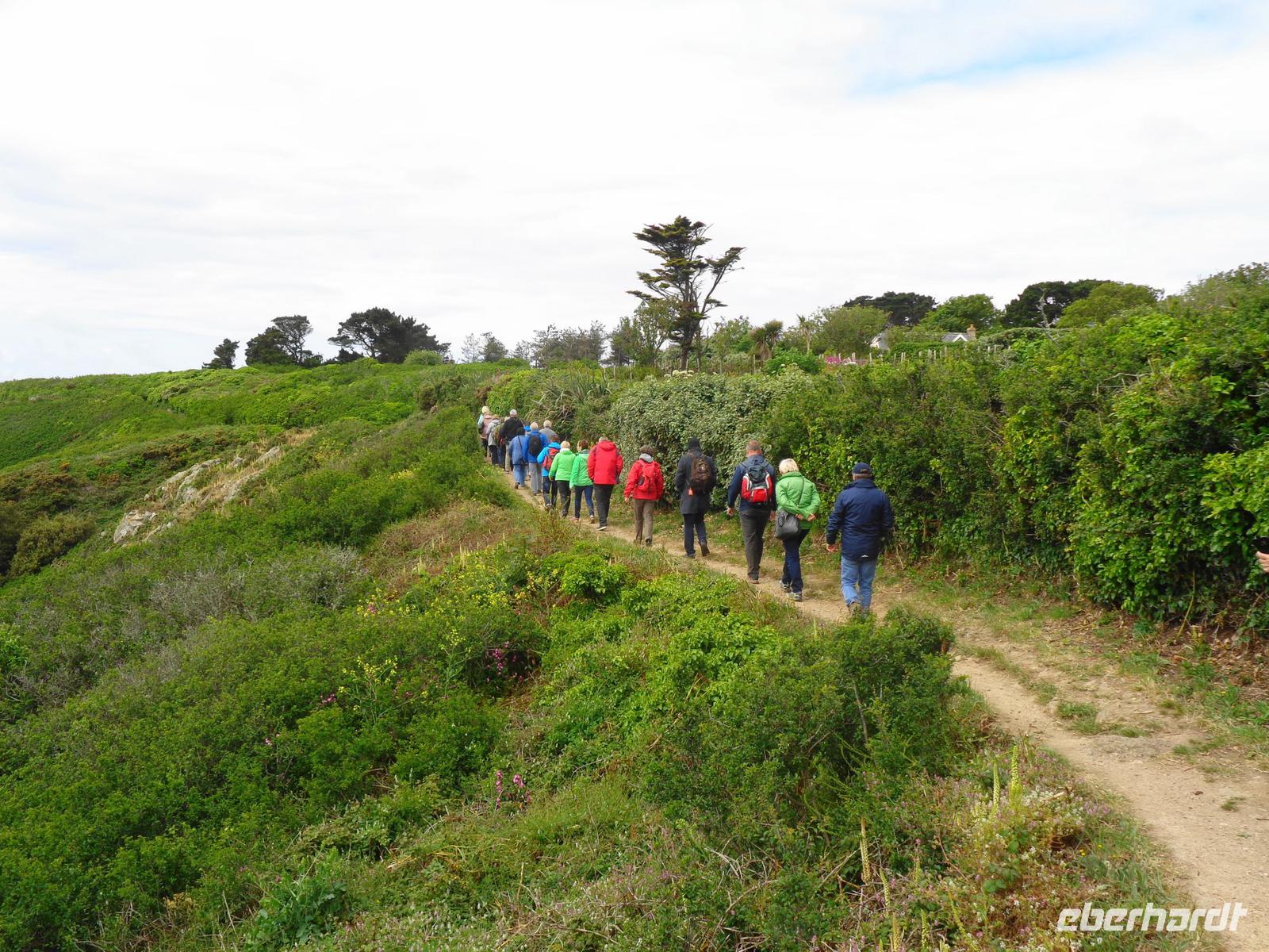 Von dort ging es immer den Klippen entlang in stetem Auf und Ab zur Giffard Bay und weiter zur Bouley Bay. Obwohl das Wetter etwas trübe war, boten sich uns immer wieder herrliche Ausblicke auf die Buchten, die Pater-Noster-Felsen und auch die Insel Alderney konnten wir „leider" am Horizont erspähen. Heidi hatte uns erklärt, dass die freie Sicht auf die Insel schlechtes Wetter verheißt. In der Folge fing es dann auch an zu regnen, aber unsere Wanderer waren hervorragend ausgerüstet und passten ihre Kleidung perfekt der jeweiligen Wetterlage an. Die vielfältige Vegetation am Wegesrand wie Erika, Venusnabel, Salbei, Taubenkopf und Margeriten bot immer wieder dankbare Fotomotive. Heidi erklärte uns auch, dass die Schaumteppiche auf der Meeresoberfläche keine Umweltverschmutzung, sondern Absonderungen der Algenblüte sind. Auf dem Weg kamen wir auch an einigen Testfeldern vorbei, auf denen gerade Tee angebaut wird. Hier wird experimentiert, welche Nutzpflanzen ein Ersatz für den Anbau der heimischen Kartoffelsorte „Jersey Royals" sein könnten.