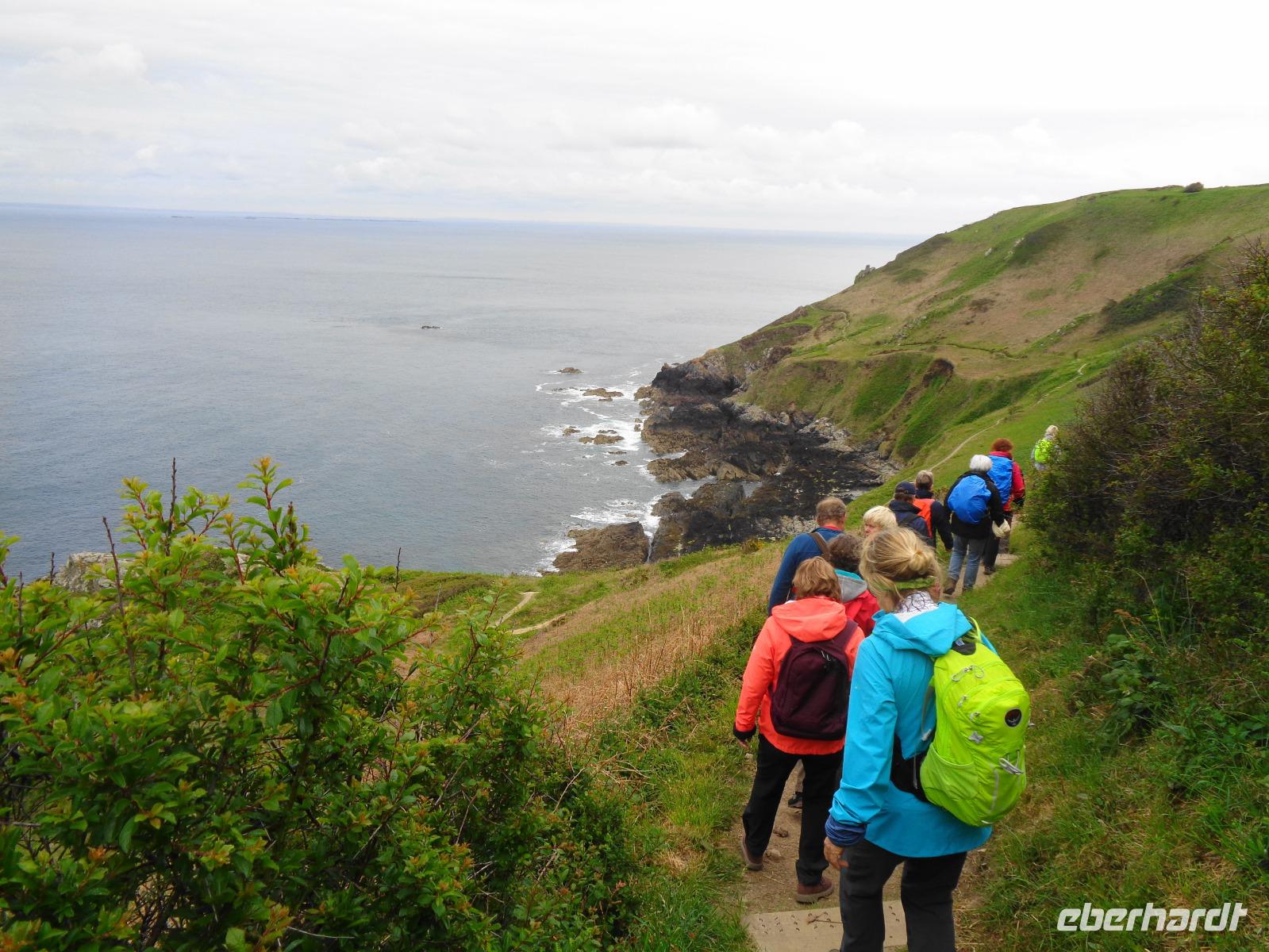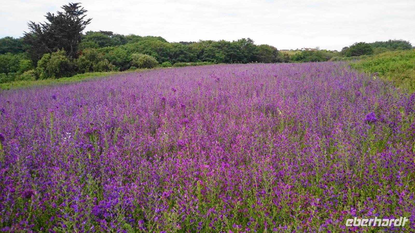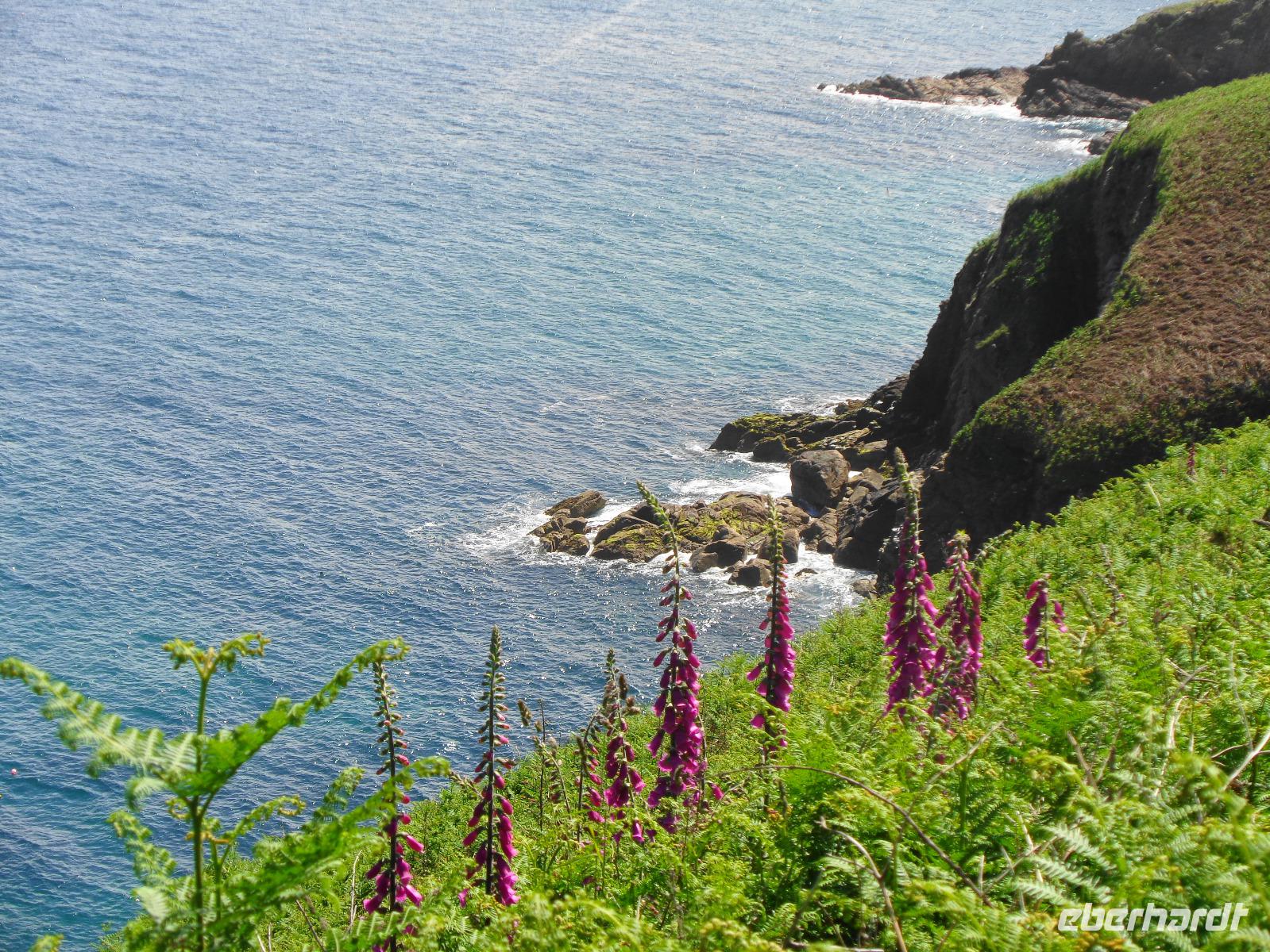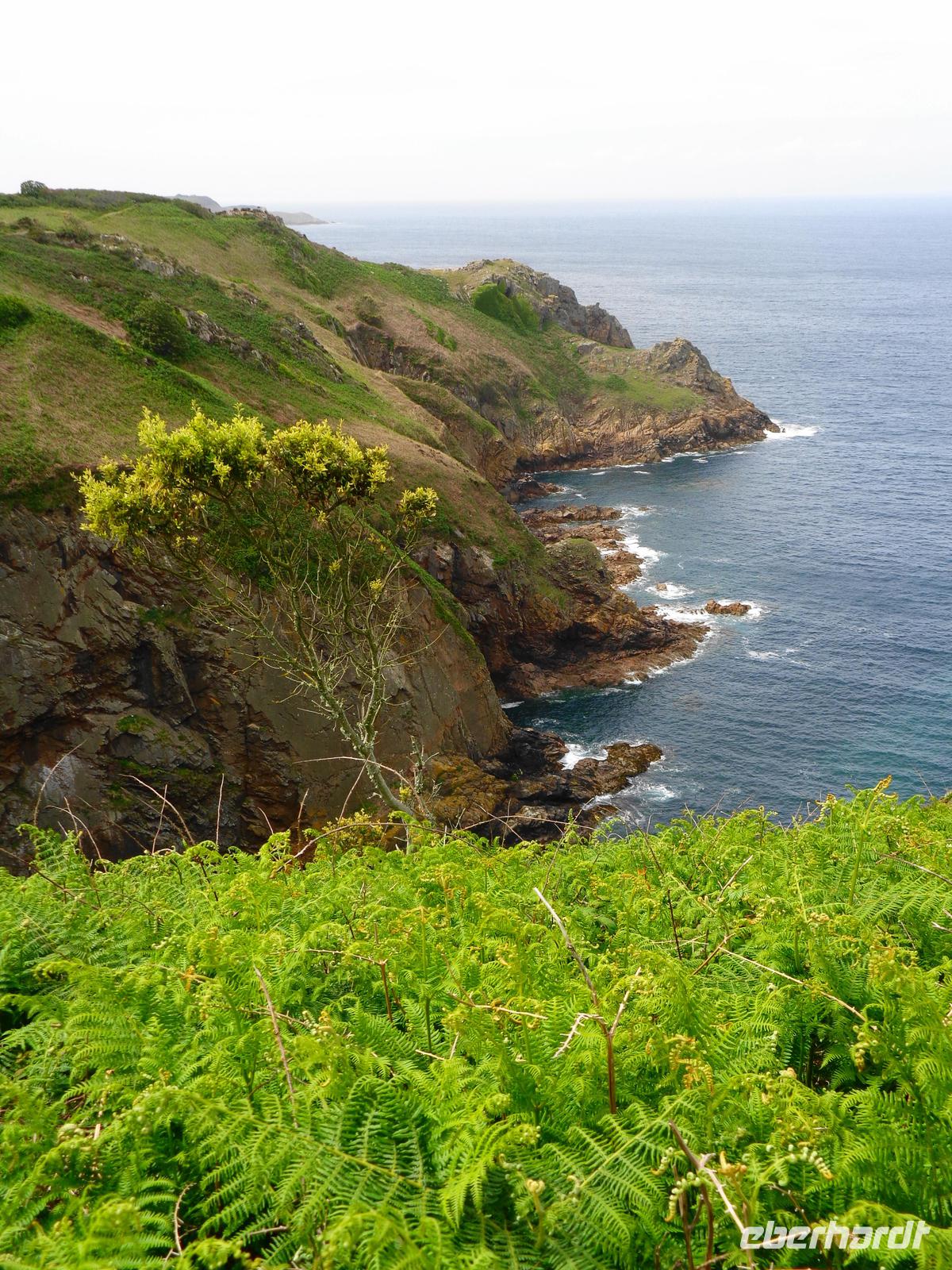Von dort ging es immer den Klippen entlang in stetem Auf und Ab zur Giffard Bay und weiter zur Bouley Bay. Obwohl das Wetter etwas trübe war, boten sich uns immer wieder herrliche Ausblicke auf die Buchten, die Pater-Noster-Felsen und auch die Insel Alderney konnten wir „leider" am Horizont erspähen. Heidi hatte uns erklärt, dass die freie Sicht auf die Insel schlechtes Wetter verheißt. In der Folge fing es dann auch an zu regnen, aber unsere Wanderer waren hervorragend ausgerüstet und passten ihre Kleidung perfekt der jeweiligen Wetterlage an. Die vielfältige Vegetation am Wegesrand wie Erika, Venusnabel, Salbei, Taubenkopf und Margeriten bot immer wieder dankbare Fotomotive. Heidi erklärte uns auch, dass die Schaumteppiche auf der Meeresoberfläche keine Umweltverschmutzung, sondern Absonderungen der Algenblüte sind. Auf dem Weg kamen wir auch an einigen Testfeldern vorbei, auf denen gerade Tee angebaut wird. Hier wird experimentiert, welche Nutzpflanzen ein Ersatz für den Anbau der heimischen Kartoffelsorte „Jersey Royals" sein könnten.
