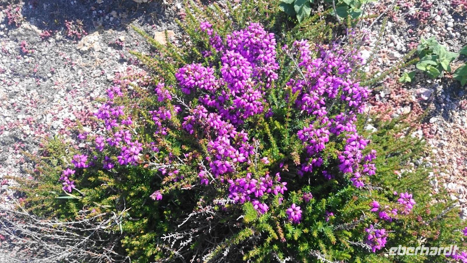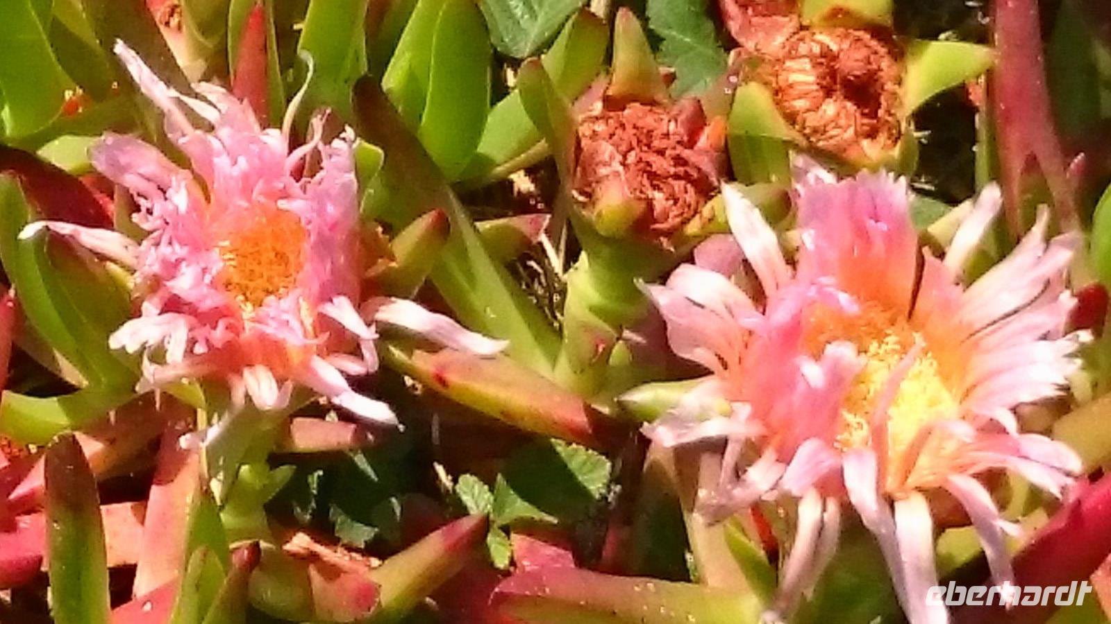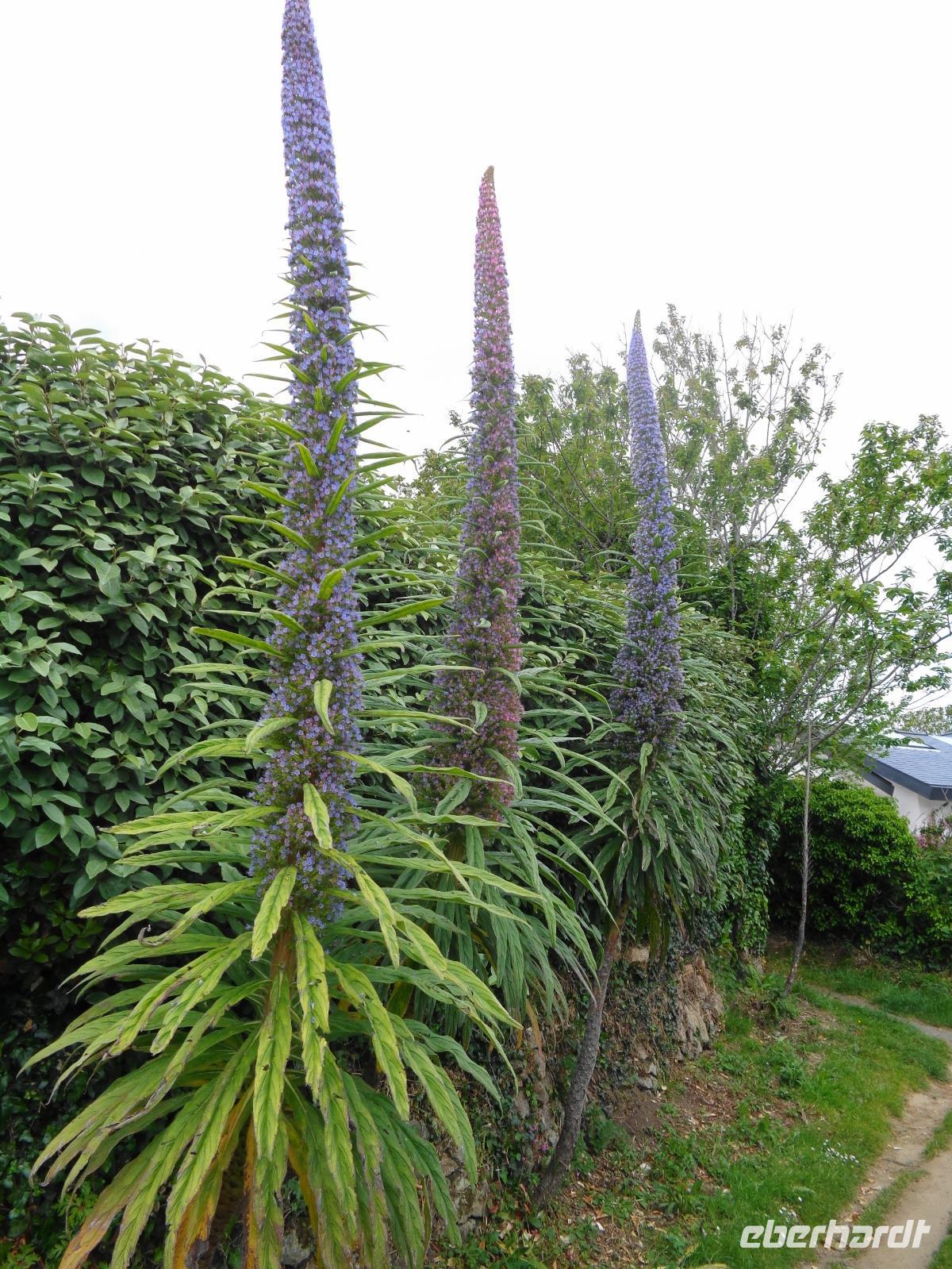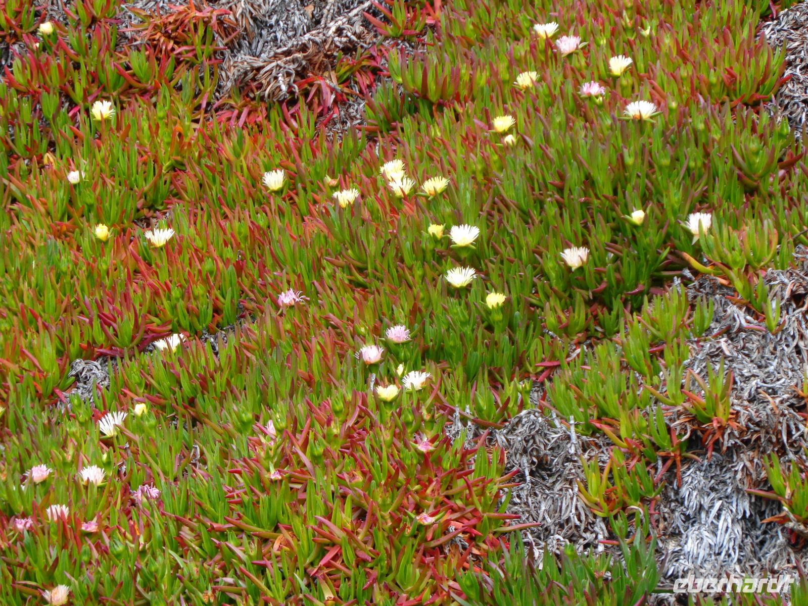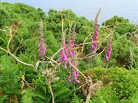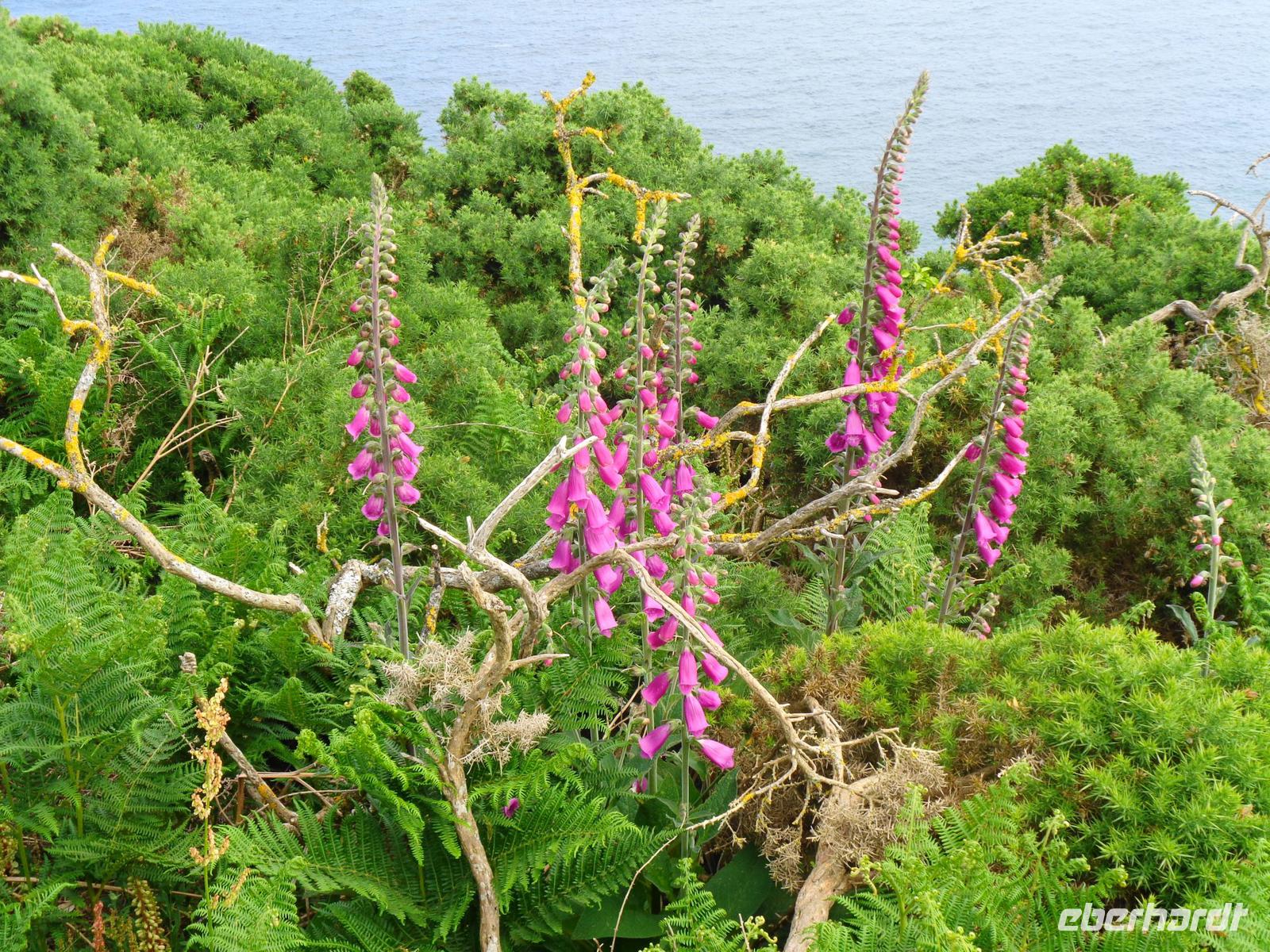 Von dort ging es immer den Klippen entlang in stetem Auf und Ab zur Giffard Bay und weiter zur Bouley Bay. Obwohl das Wetter etwas trübe war, boten sich uns immer wieder herrliche Ausblicke auf die Buchten, die Pater-Noster-Felsen und auch die Insel Alderney konnten wir „leider" am Horizont erspähen. Heidi hatte uns erklärt, dass die freie Sicht auf die Insel schlechtes Wetter verheißt. In der Folge fing es dann auch an zu regnen, aber unsere Wanderer waren hervorragend ausgerüstet und passten ihre Kleidung perfekt der jeweiligen Wetterlage an. Die vielfältige Vegetation am Wegesrand wie Erika, Venusnabel, Salbei, Taubenkopf und Margeriten bot immer wieder dankbare Fotomotive. Heidi erklärte uns auch, dass die Schaumteppiche auf der Meeresoberfläche keine Umweltverschmutzung, sondern Absonderungen der Algenblüte sind. Auf dem Weg kamen wir auch an einigen Testfeldern vorbei, auf denen gerade Tee angebaut wird. Hier wird experimentiert, welche Nutzpflanzen ein Ersatz für den Anbau der heimischen Kartoffelsorte „Jersey Royals" sein könnten.