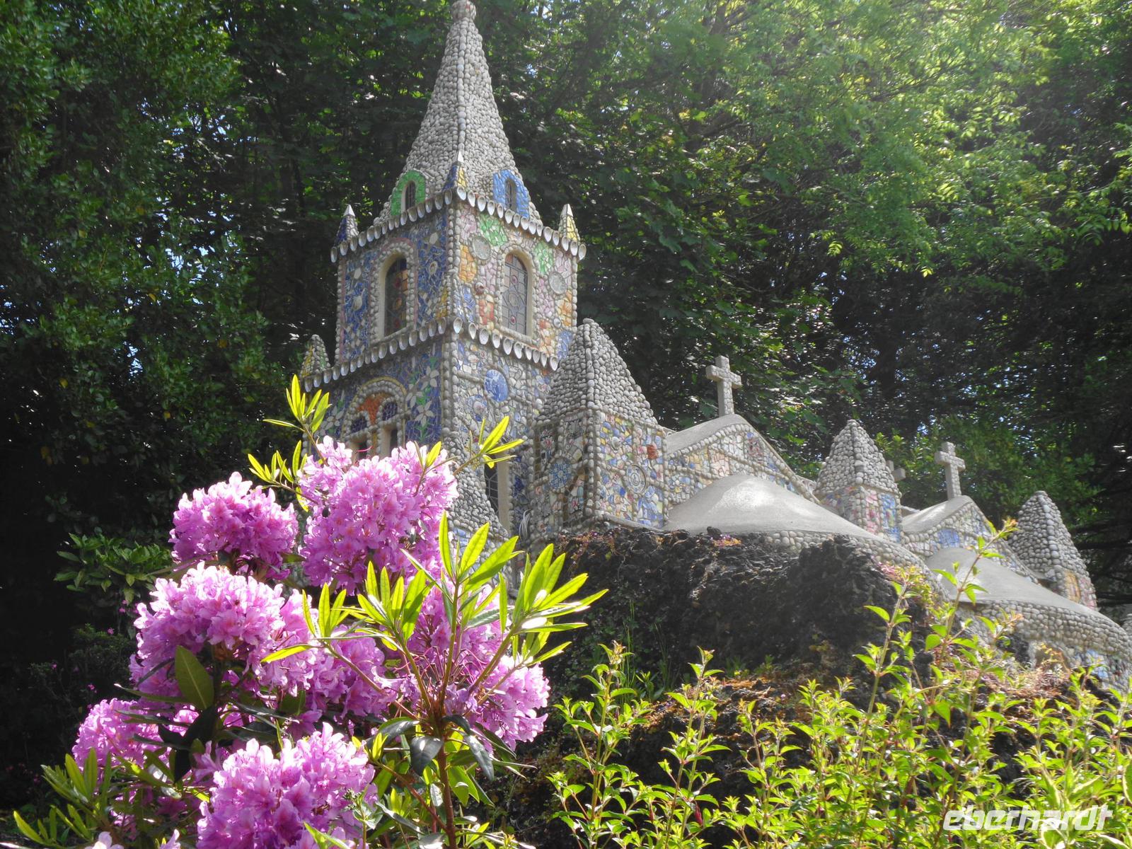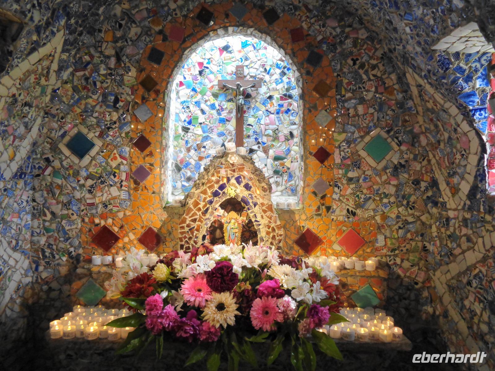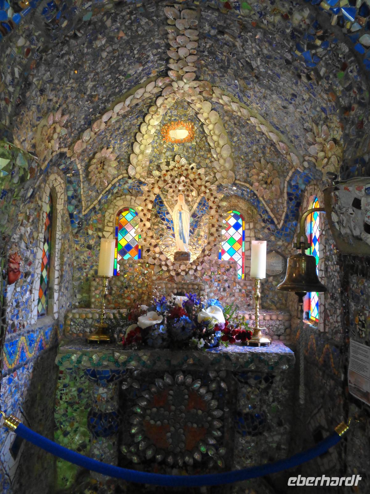 Als Nächstes steuerten wir die „Little Chapel" in St. Andrews an, das angeblich kleinste geweihte Gotteshaus der Christenheit. Nach dem Vorbild der Grotte von Lourdes bauten aus Frankreich vertriebene Mönche der La-Salle-Ordensgemeinschaft Anfang des 20. Jh. nacheinander mehrere Versionen. Durch die verschwenderisch verbauten Muschelschalen, Porzellanscherben und Kieselsteine schimmert das Kirchlein in prächtigen, bunten Farben.