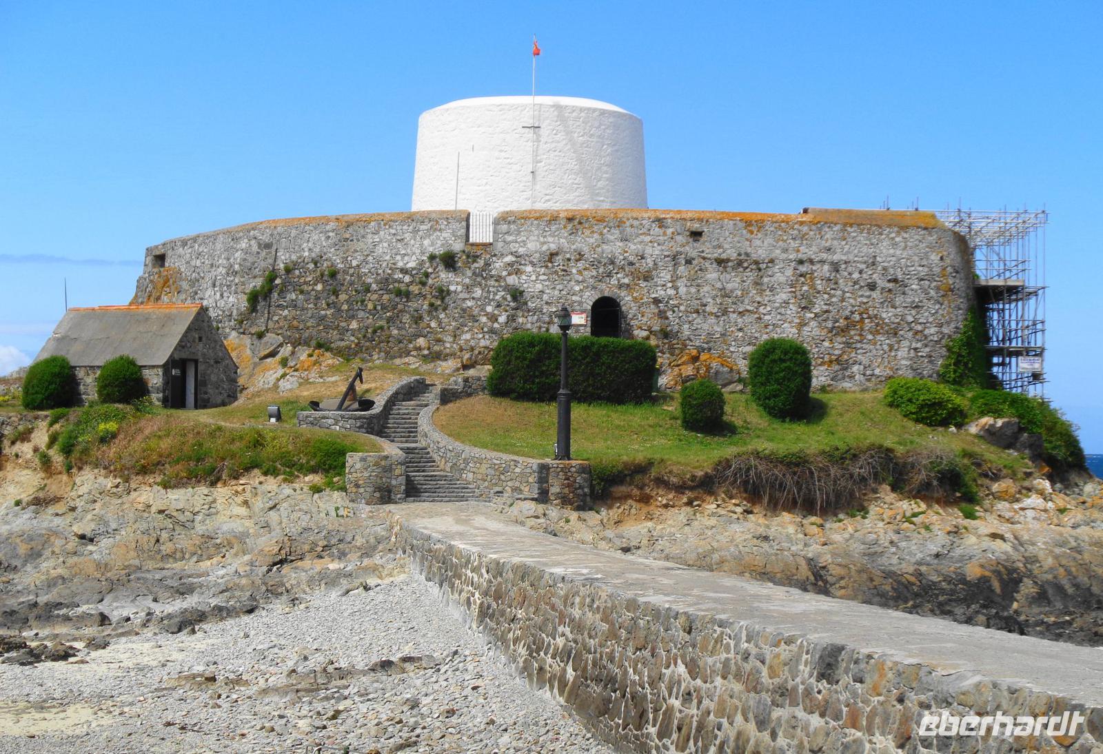 Die Landschaft im Inneren Guernseys ist von der Landwirtschaft geprägt, hin und wieder kann man die berühmten Guernsey-Kühe oder die „Goldenen Ziegen" beim gemächlichen Grasen beobachten. Vorbei an herrlich blühenden Gärten und einsamen Gehöften ging es zur Rocquaine Bay, wo unsere Mittagspause im Strandlokal „Guernsey Pearl" vorgesehen war. Gut gestärkt konnten wir noch in dem angeschlossenen Schmuckgeschäft die "Guernsey Pearls" bewundern oder zum Fort Grey spazieren. Wegen seiner Form auch „Tasse und Untertasse" genannt, beherbergt es heute eine Ausstellung über die an der Westküste gestrandeten Schiffe.