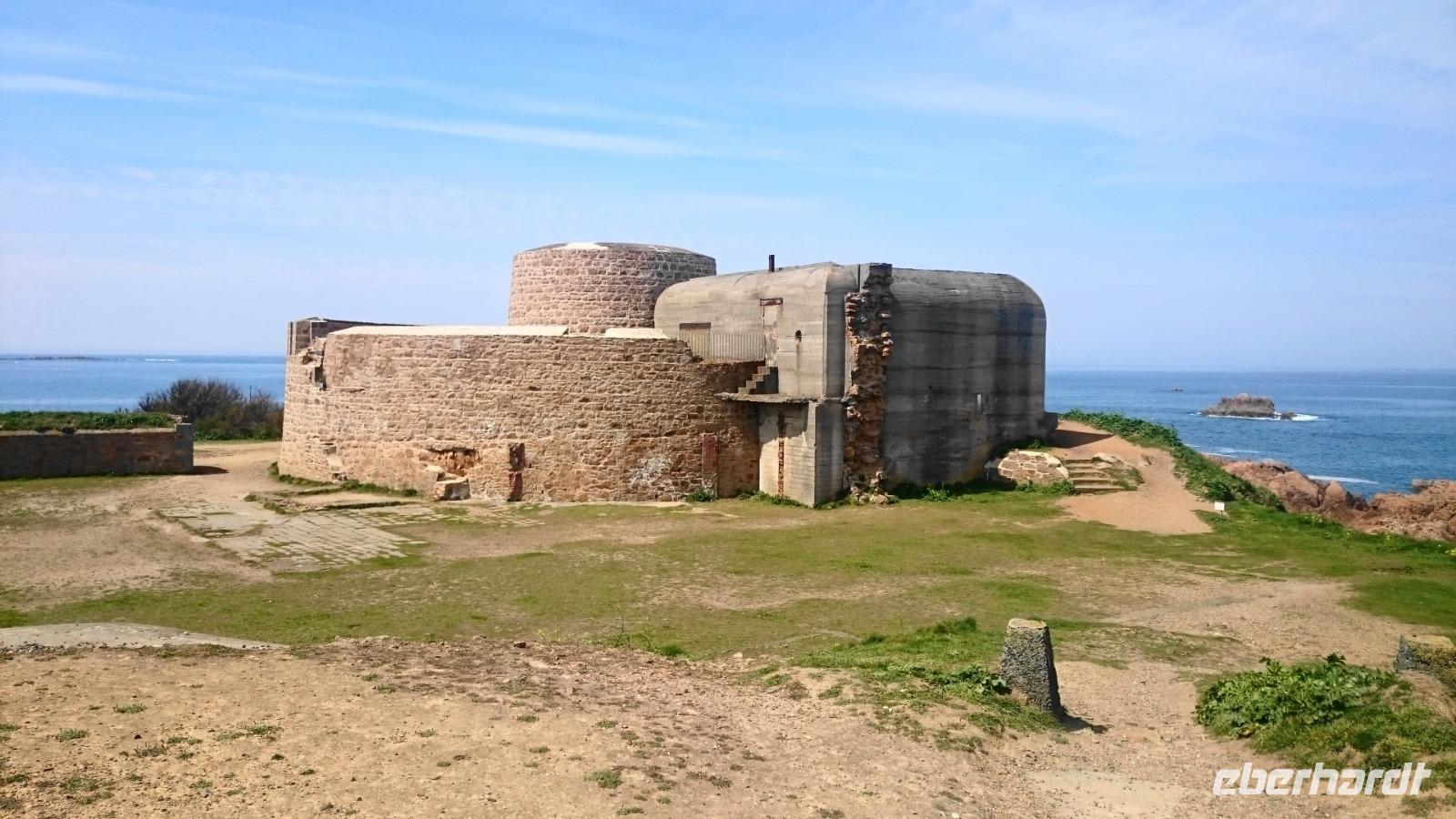Nach der Mittagspause fuhren wir zum Fort Hommet, wo wir einen weiteren Fotostopp einlegten. Es handelt sich um die Ruine eines Küstenforts, von dem der Martello-Turm, Anbauten aus viktorianischer Zeit sowie Bunker und Kasematten erhalten sind, die die Deutschen im Zweiten Weltkrieg erbauten.