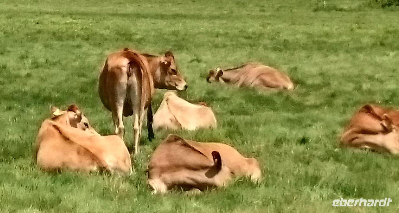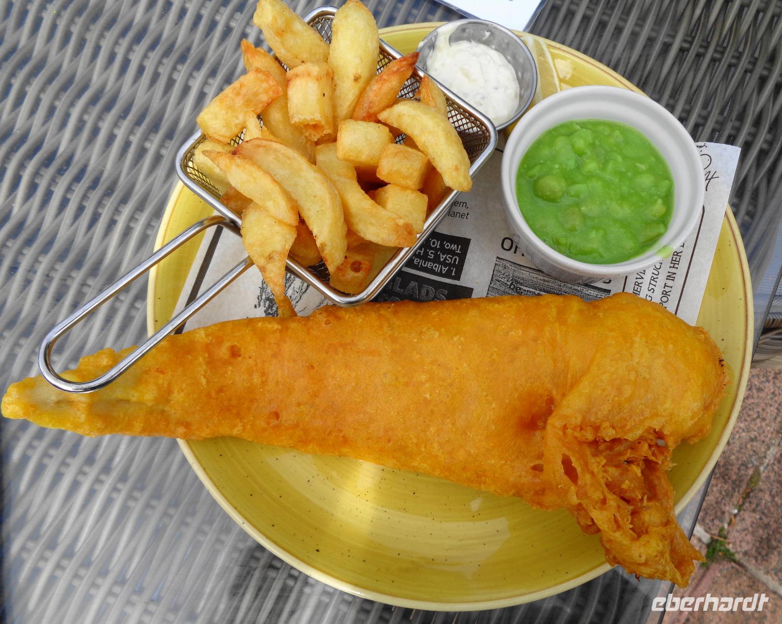 Unsere Mittagspause fand im Pub „The Goose On The Green" statt, wo wir bei sonnigem, warmem Wetter im Garten „Fish & Chips" oder andere köstliche Gerichte probierten. Auf einer Wiese neben dem Pub sahen wir auch endlich die berühmten und schon sehnsüchtig erwarteten „Jersey-Kühe".