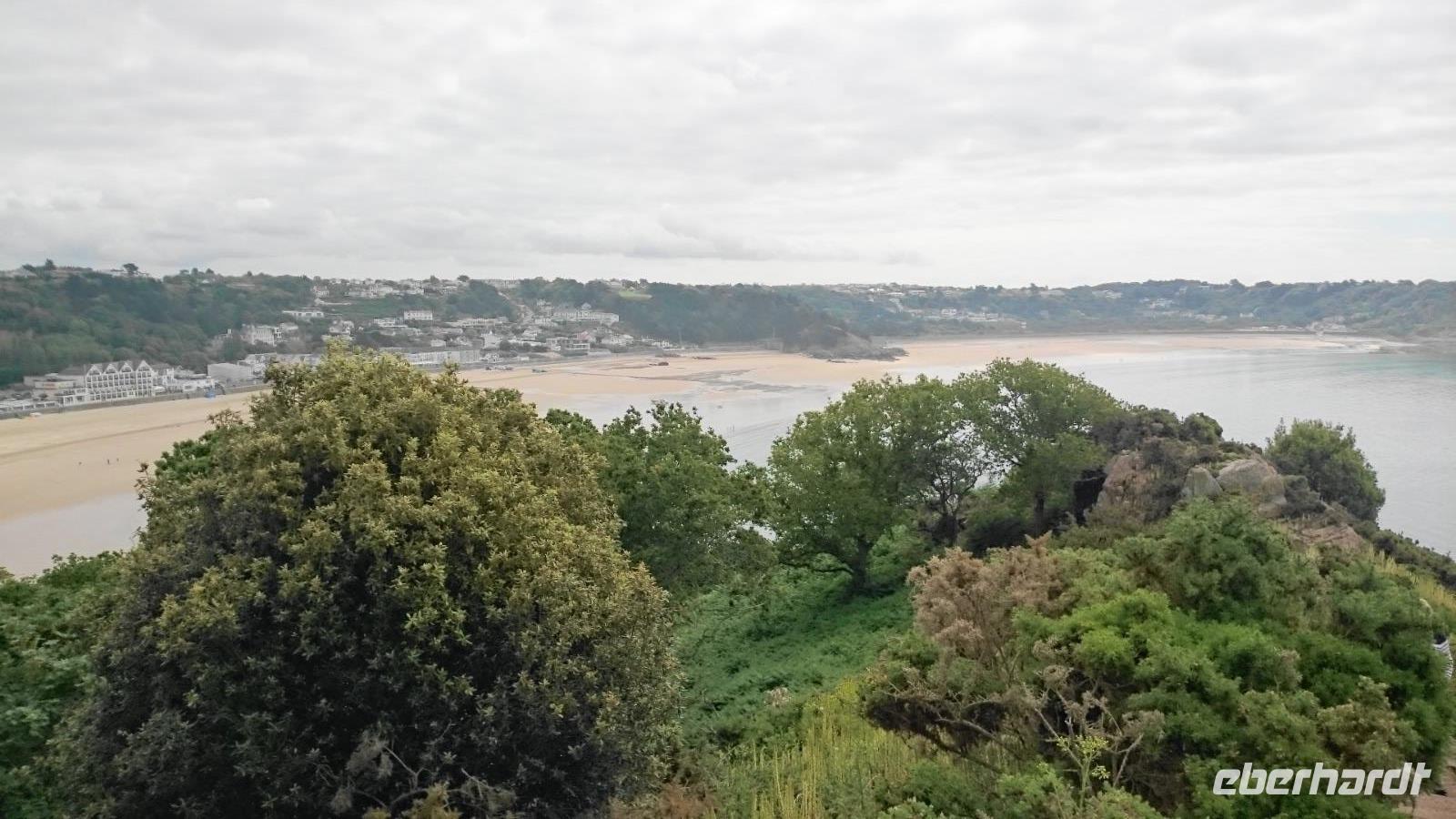 Auf gewundenen Klippenpfaden wanderten wir bei angenehm mildem Wanderwetter in östlicher Richtung. Wegen des lokalen Feiertags herrschte auf den auf- und absteigenden Pfaden reger Fußgänger- und Hundeverkehr. Immer wieder boten sich uns malerische Ausblicke über versteckte Buchten und hoch auftragende Klippen, wo sich tosend die Wellen brechen. Bei klarem Wetter kann man von hier sogar bis zur französischen Küste sehen. Die kleine Papageientaucher-Kolonie war leider verwaist, dafür konnten wir an den mit sattgelben Ginsterbüschen bewachsenen Hängen allerhand andere Vogelarten wie Seeschwalben, Dohlen und Möwen beobachten. Nach ca. 2 Stunden erreichten wir Grève de Lecq, wo wir unsere Mittagspause in einem der Strandcafés am goldenen Sandstrand verbrachten. Jersey hat den dritthöchsten Tidenhub der Welt und vor dem Café konnten wir beobachten, wie einige Ausflügler von der steigenden Flut überrascht wurden und ihnen der Rückweg über die Klippen abgeschnitten wurde. Das Abenteuer endete dann für Kind und Kegel mit einem nicht ganz ungefährlichen Sprung in das auflaufende Wasser.