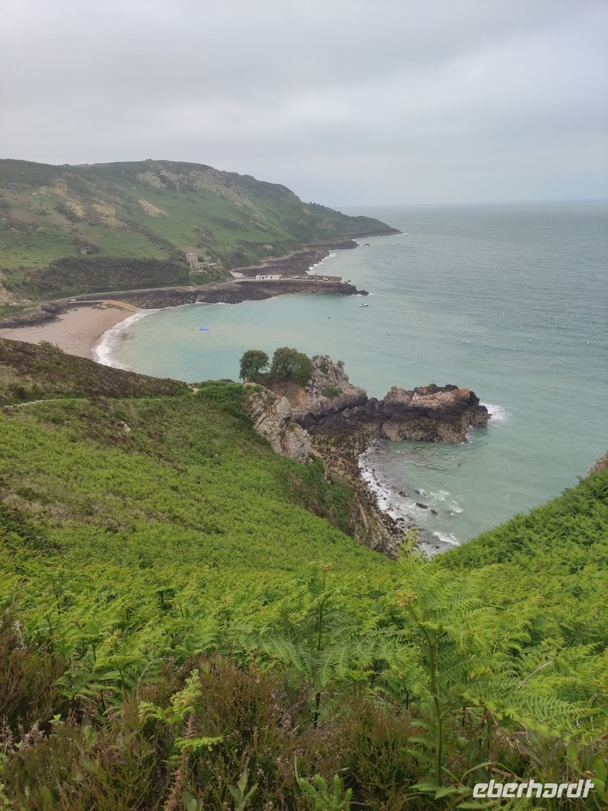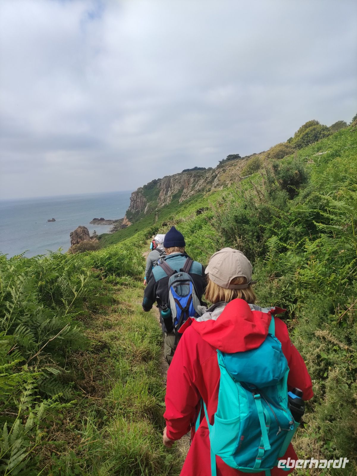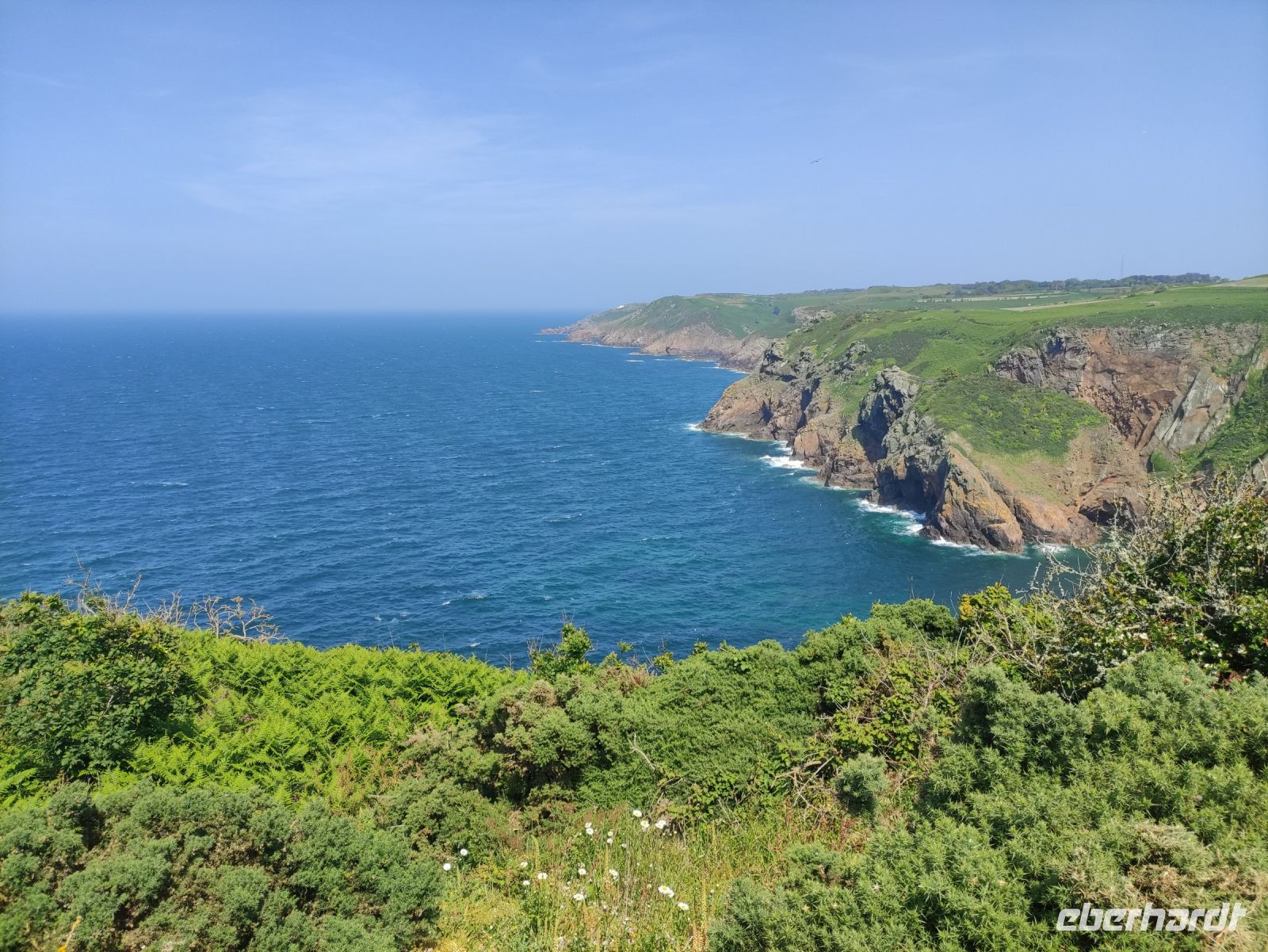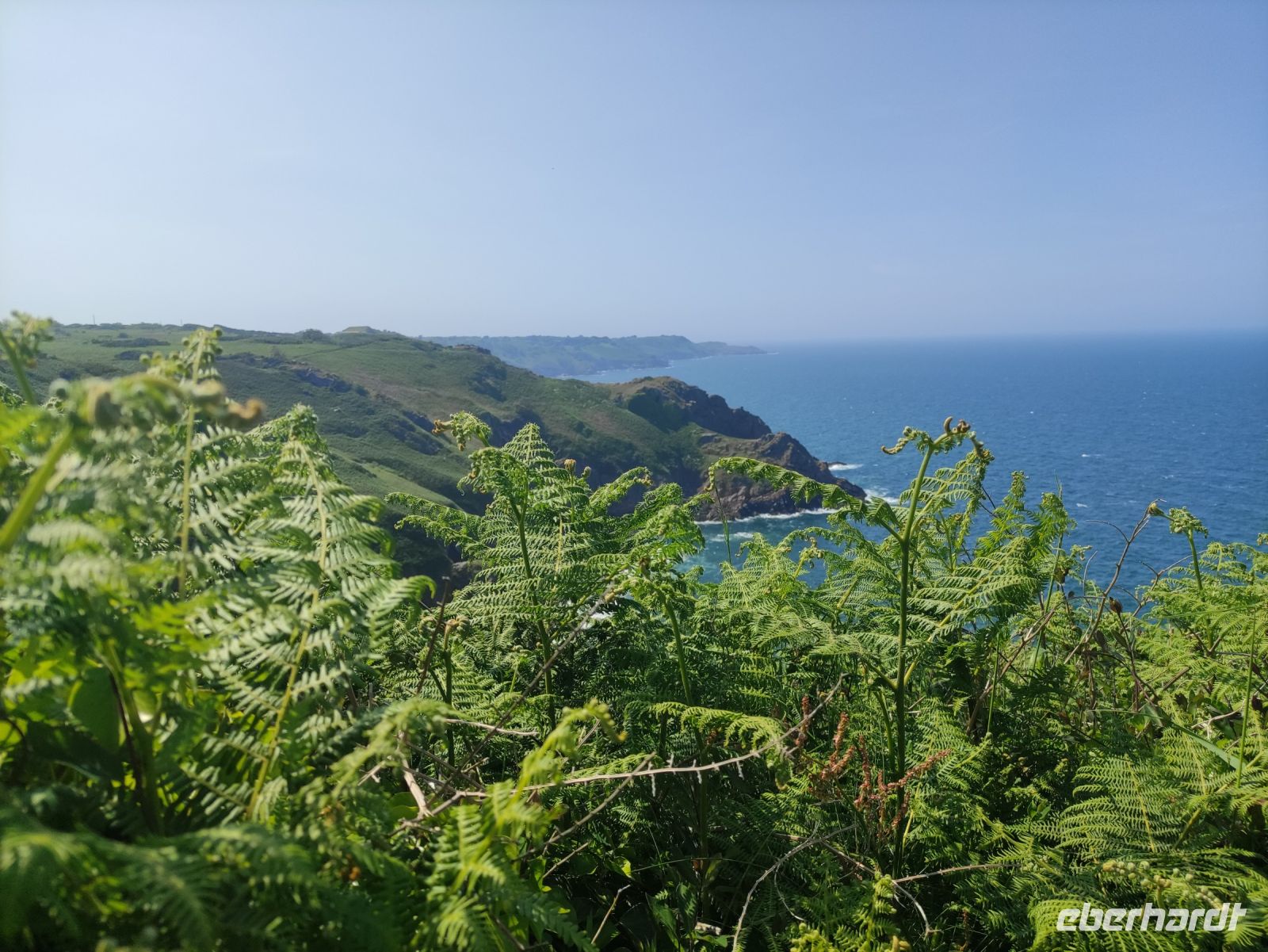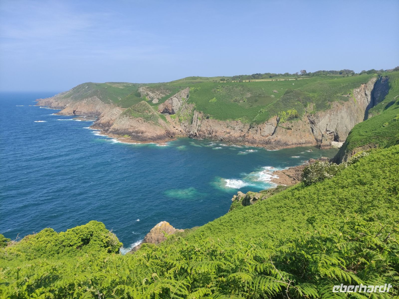 Anschließend führt uns ein kurzer, aber steiler Anstieg zum Küstenpfad, der uns entlang der atemberaubenden Südküste von Jersey führt. Während wir durch Farne, kleine Wäldchen und Heidelandschaft wandern, erleben wir die vielfältige Natur der Insel hautnah. Die Strecke beinhaltet einige kurze Anstiege und Abstiege, teilweise mit Treppenstufen, die uns herausfordern und die Wanderung abwechslungsreich gestalten.
