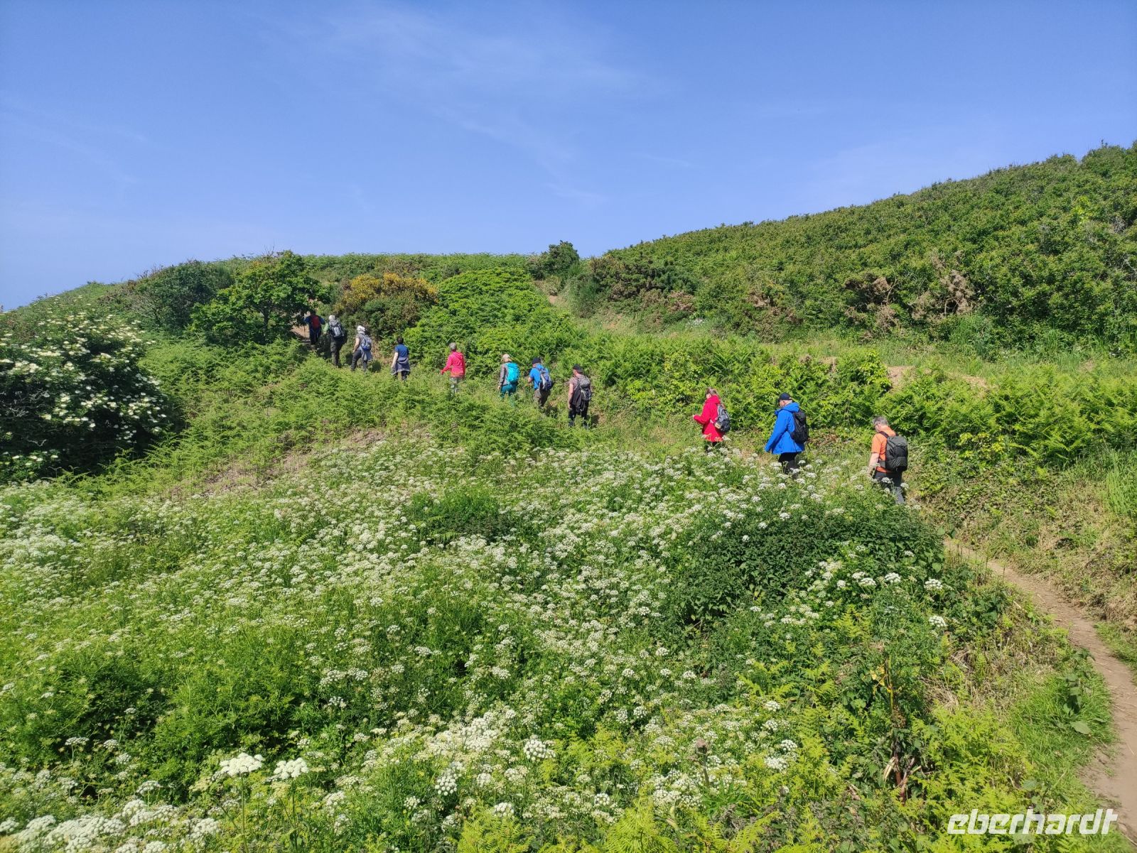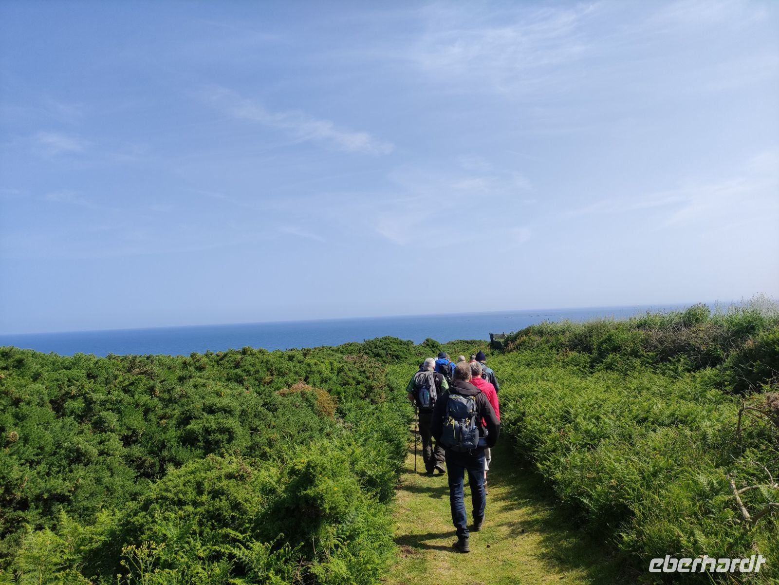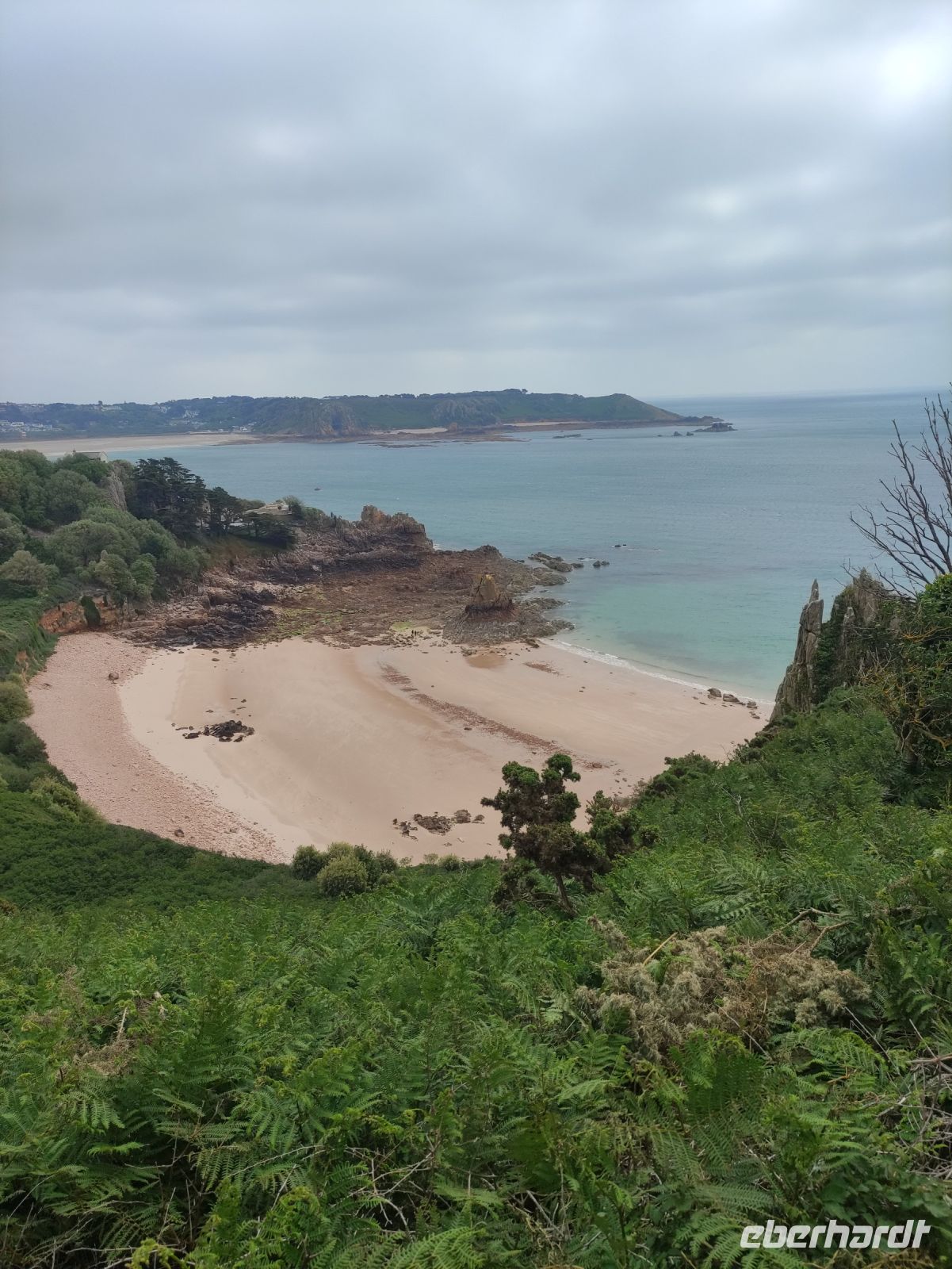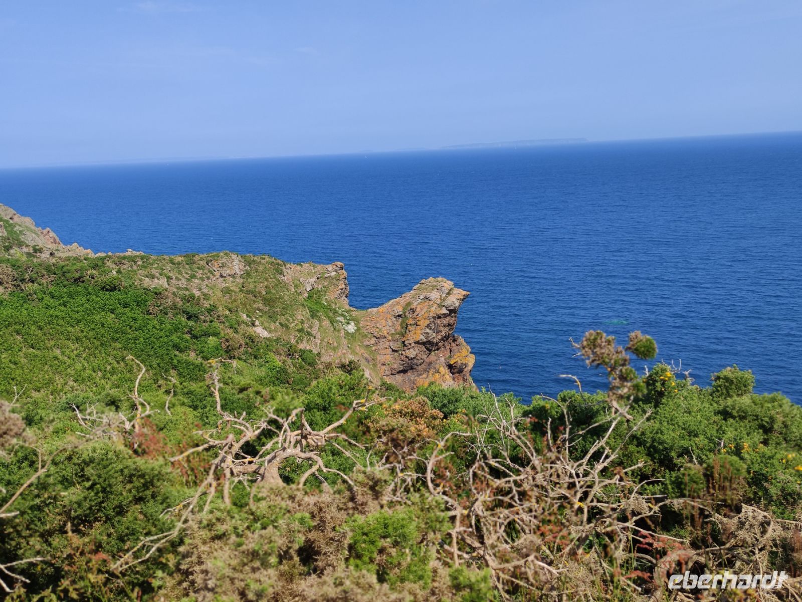 Anschließend führt uns ein kurzer, aber steiler Anstieg zum Küstenpfad, der uns entlang der atemberaubenden Südküste von Jersey führt. Während wir durch Farne, kleine Wäldchen und Heidelandschaft wandern, erleben wir die vielfältige Natur der Insel hautnah. Die Strecke beinhaltet einige kurze Anstiege und Abstiege, teilweise mit Treppenstufen, die uns herausfordern und die Wanderung abwechslungsreich gestalten.