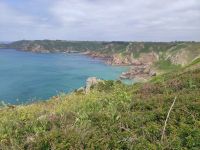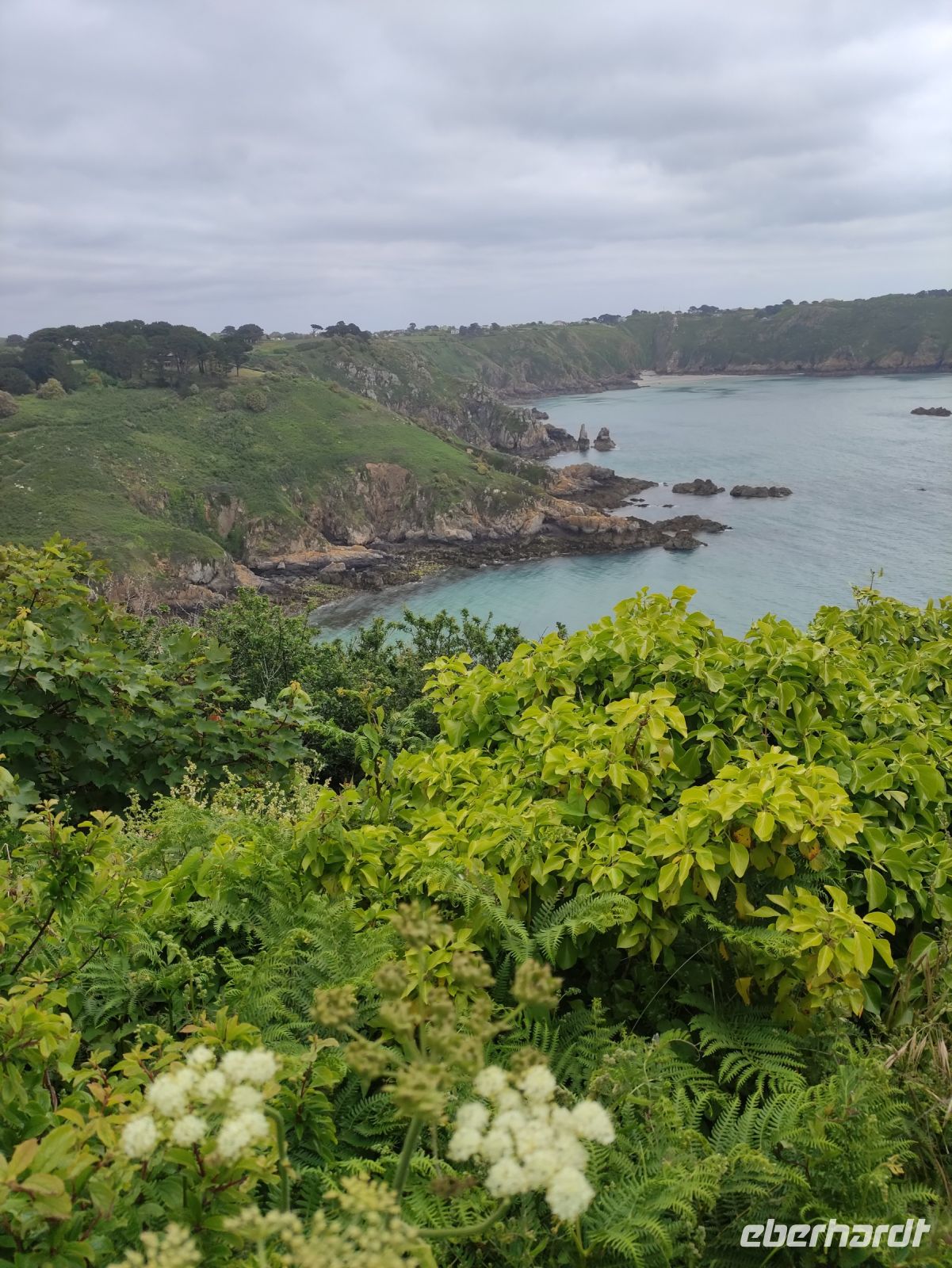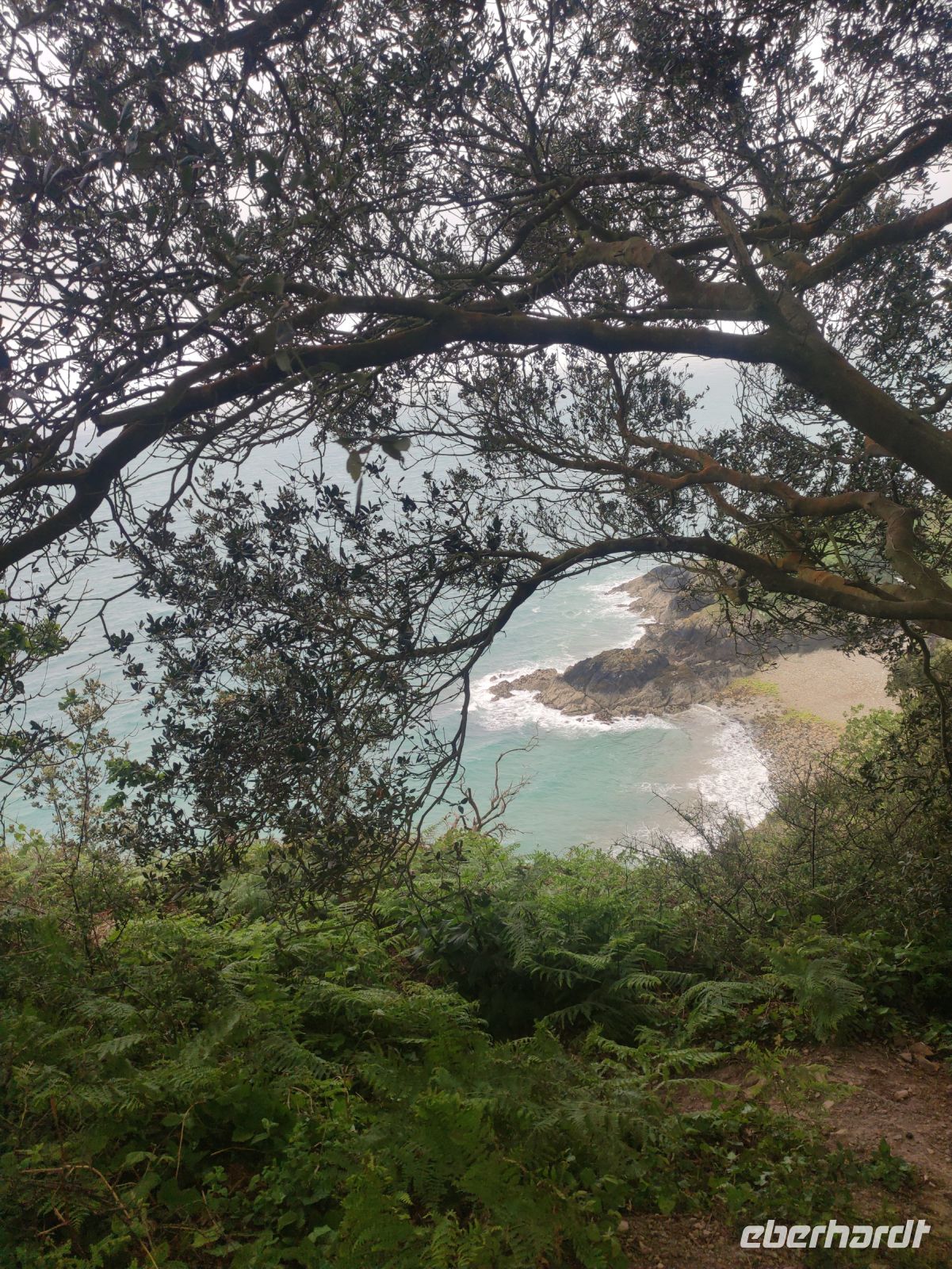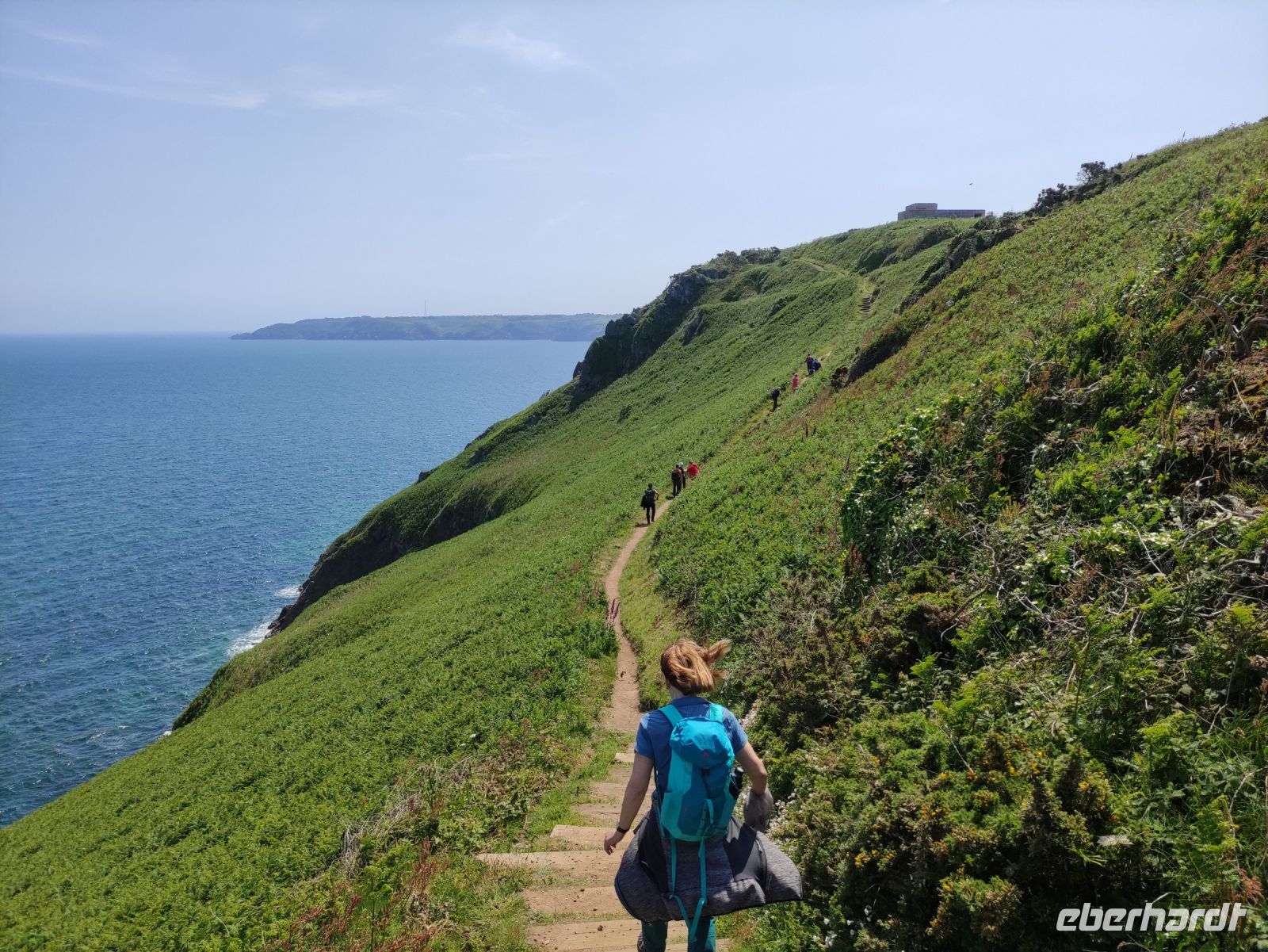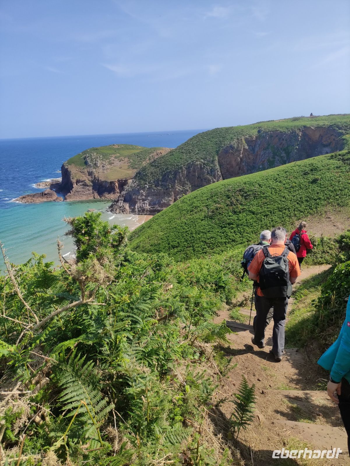 Anschließend führt uns ein kurzer, aber steiler Anstieg zum Küstenpfad, der uns entlang der atemberaubenden Südküste von Jersey führt. Während wir durch Farne, kleine Wäldchen und Heidelandschaft wandern, erleben wir die vielfältige Natur der Insel hautnah. Die Strecke beinhaltet einige kurze Anstiege und Abstiege, teilweise mit Treppenstufen, die uns herausfordern und die Wanderung abwechslungsreich gestalten.