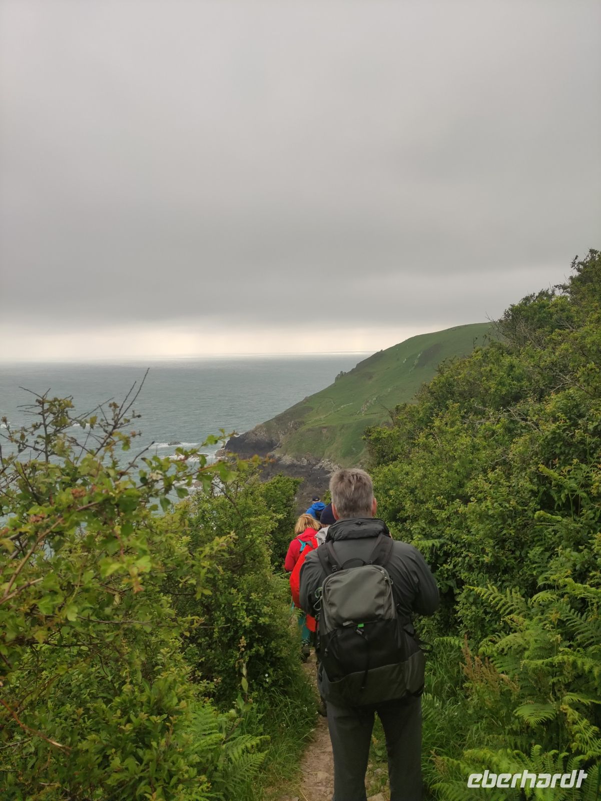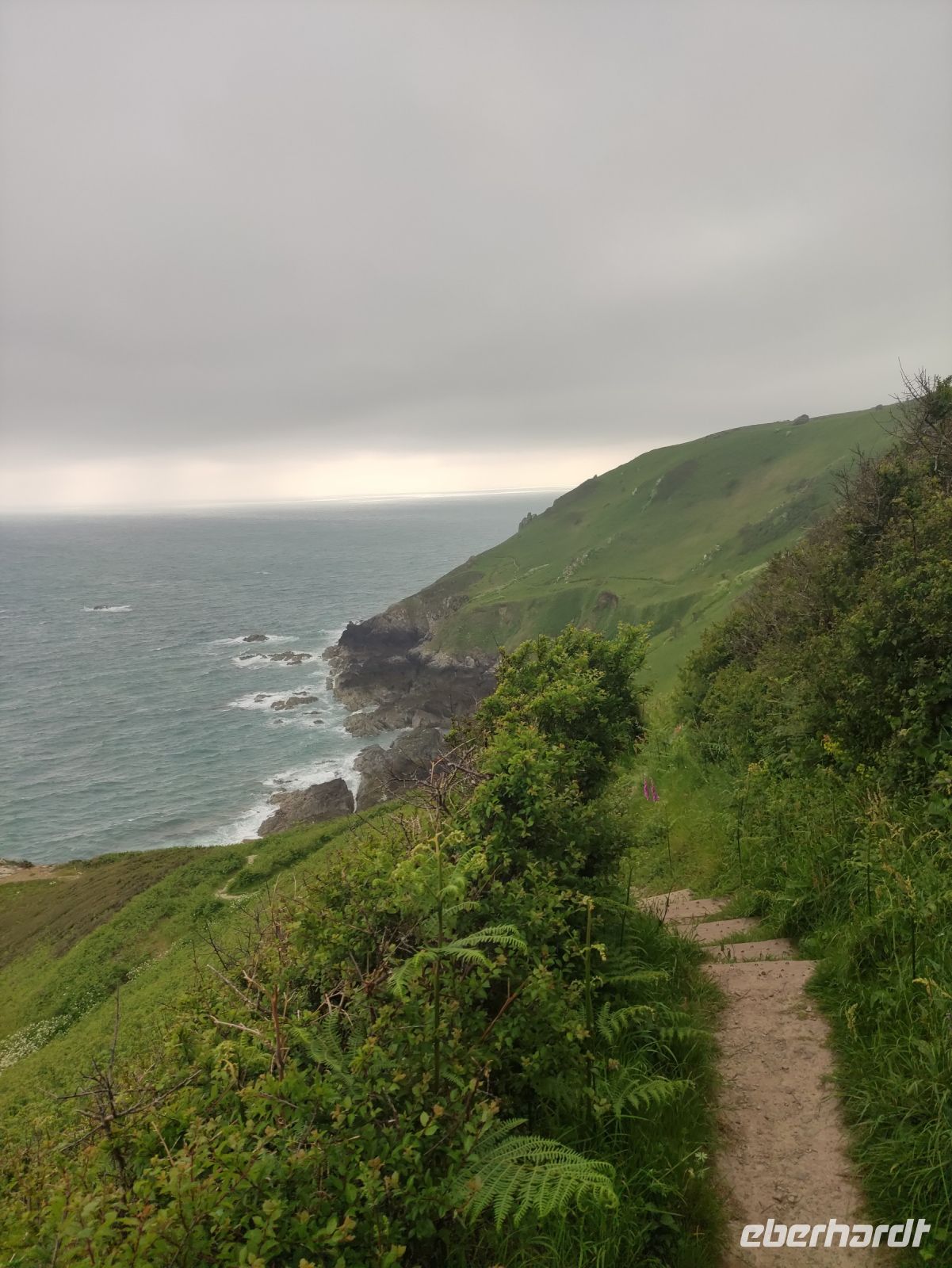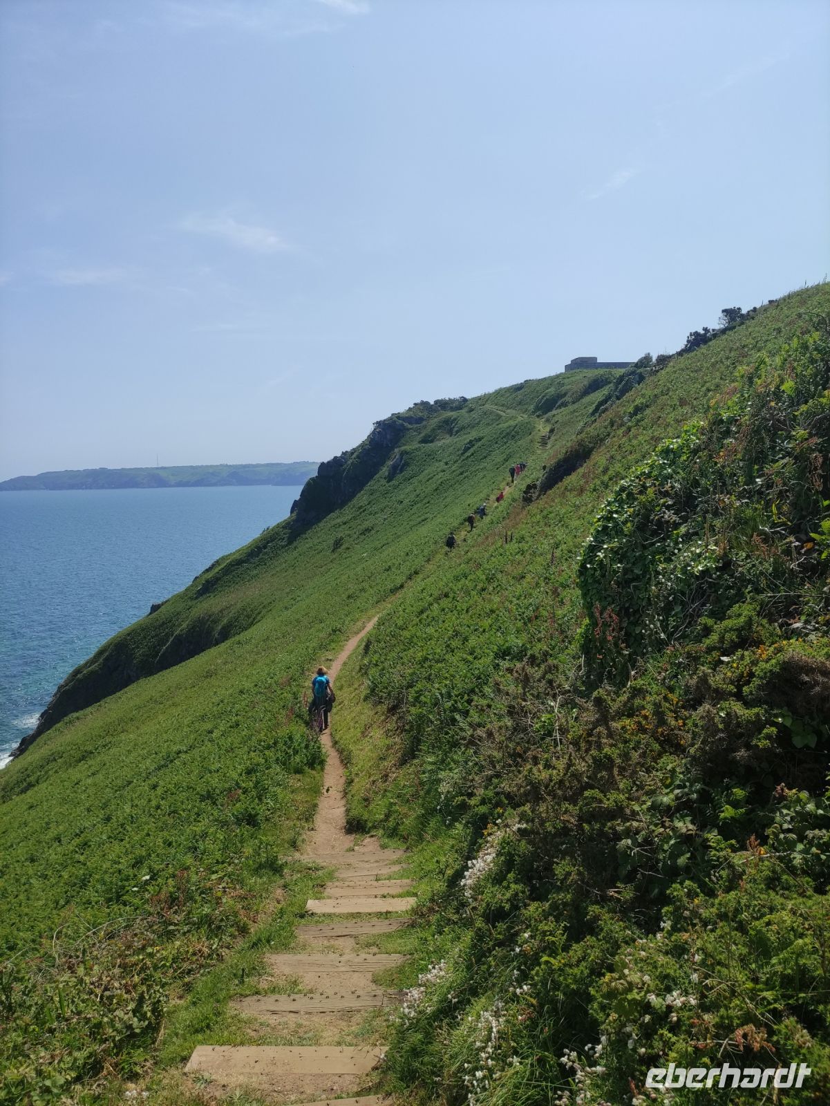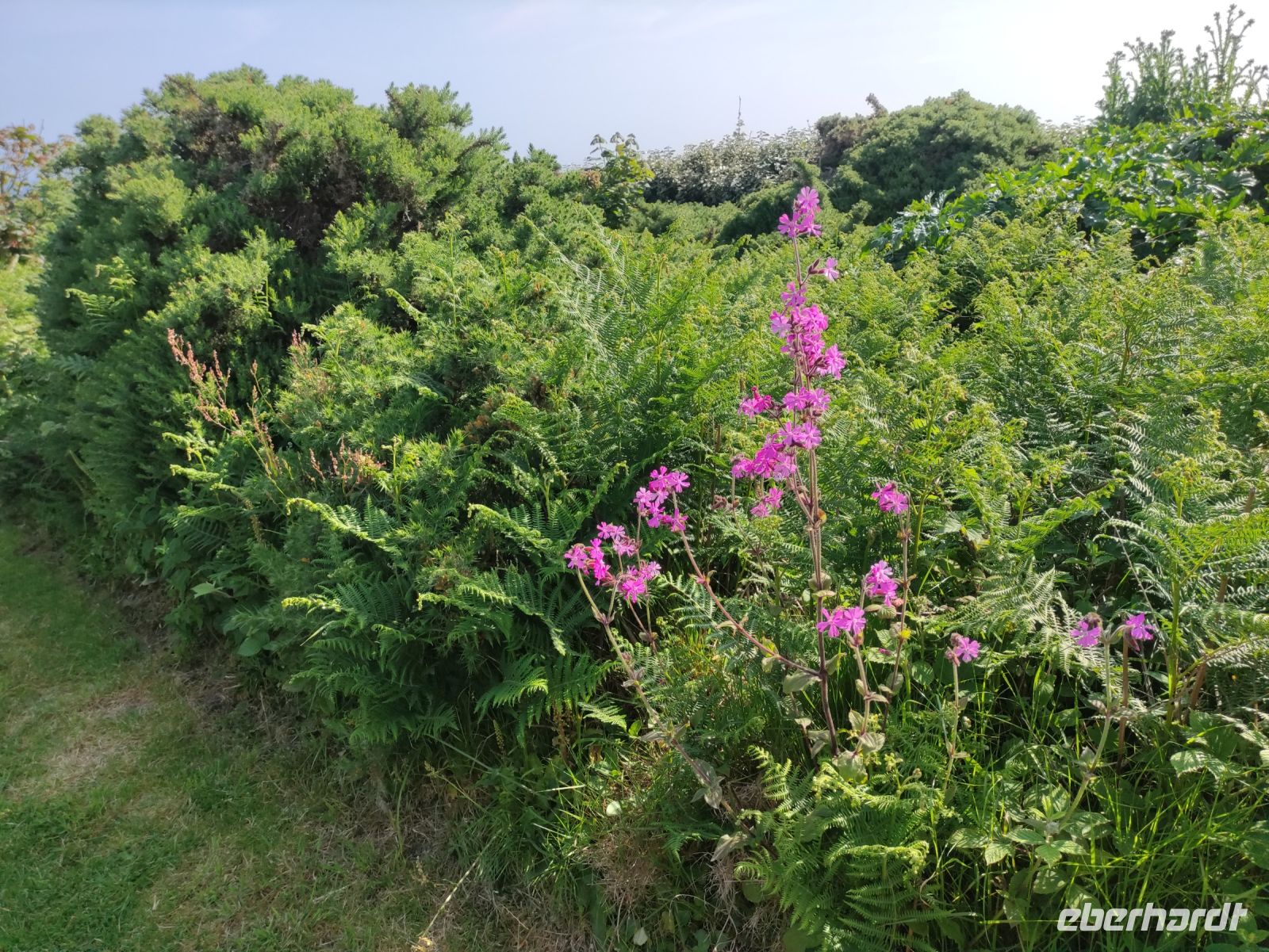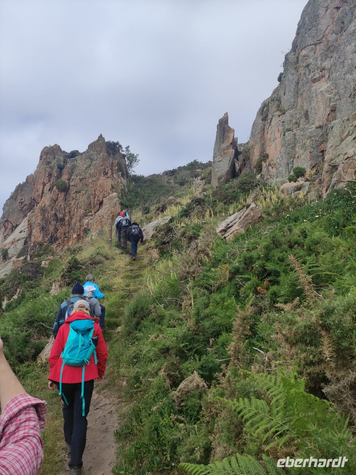 Anschließend führt uns ein kurzer, aber steiler Anstieg zum Küstenpfad, der uns entlang der atemberaubenden Südküste von Jersey führt. Während wir durch Farne, kleine Wäldchen und Heidelandschaft wandern, erleben wir die vielfältige Natur der Insel hautnah. Die Strecke beinhaltet einige kurze Anstiege und Abstiege, teilweise mit Treppenstufen, die uns herausfordern und die Wanderung abwechslungsreich gestalten.