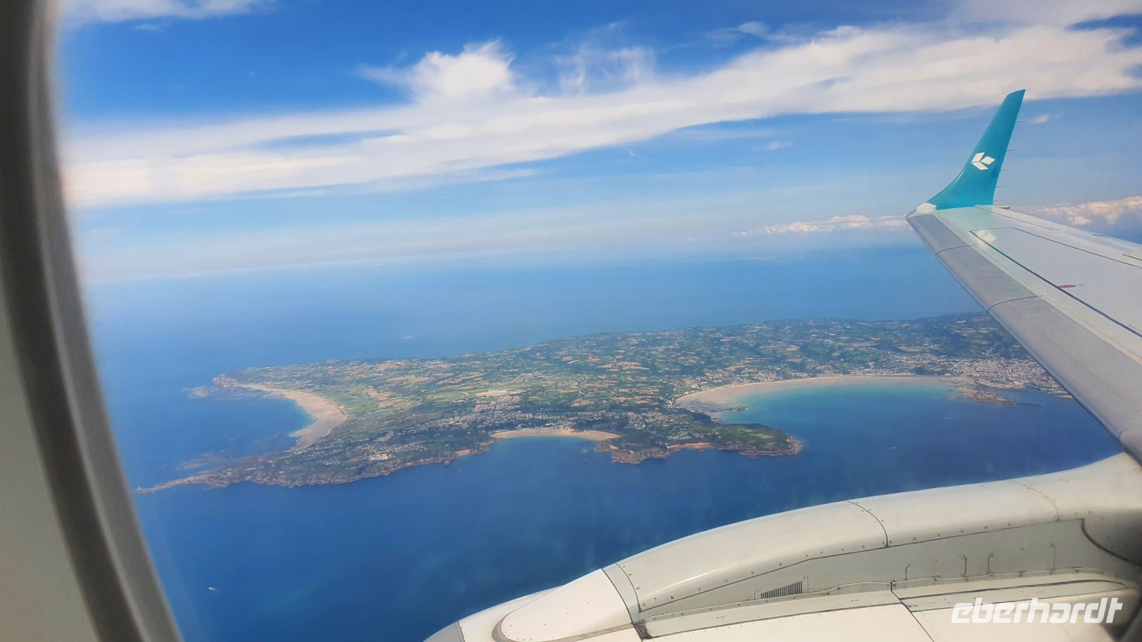 Dann geht's durch die Sicherheitskontrolle in den Transferbereich. Hier gibt es Geschäfte, Cafés, einen extra Sitzbereich und Toiletten. Auch Black Butter und Jersey Fudge kann man hier noch kaufen. Mit etwas Verspätung starteten unsere Flüge nach Düsseldorf oder München. Von oben genossen wir noch einmal einen letzten Blick auf unsere Urlaubsinsel Jersey. Bye Bye, bis bald!