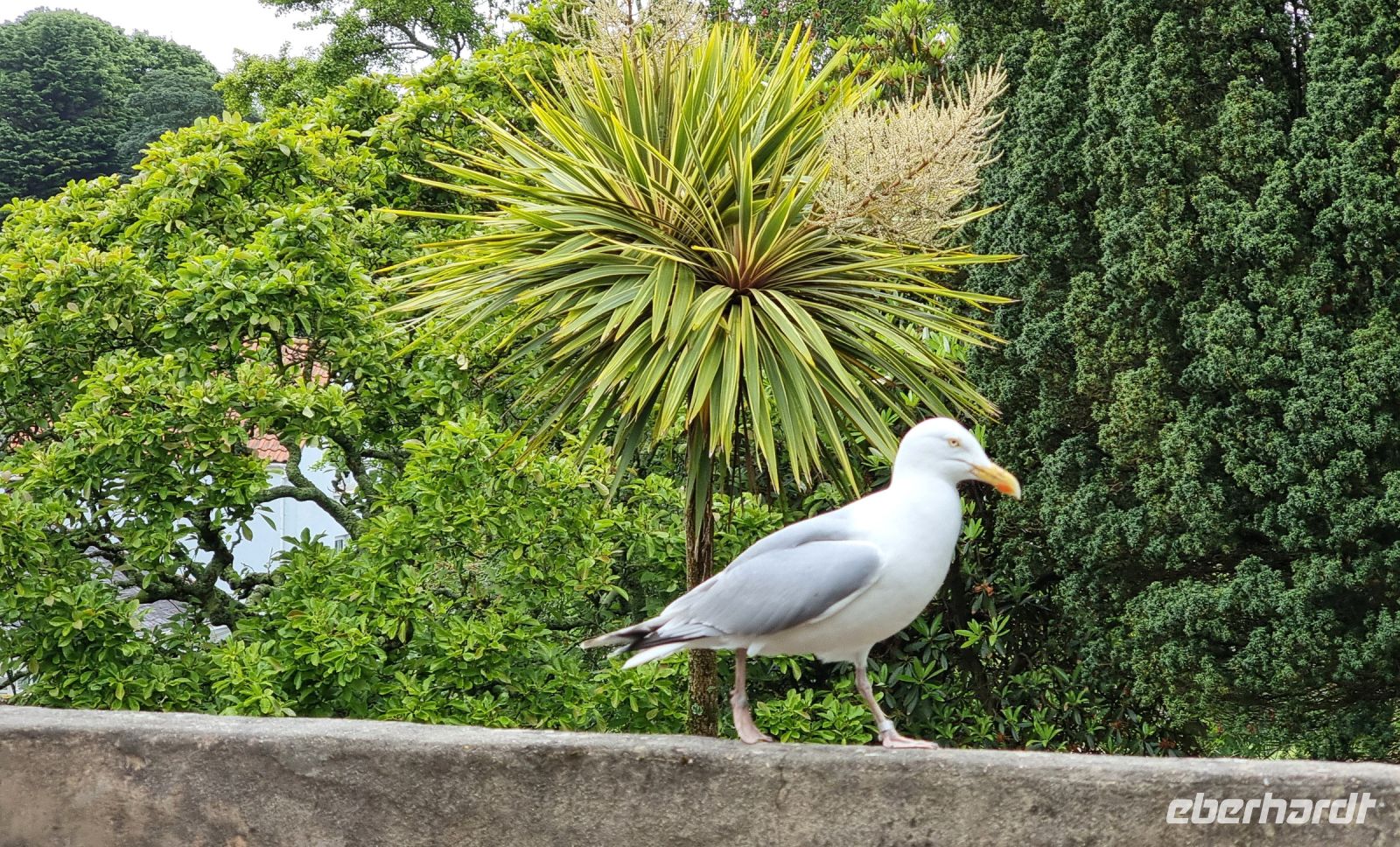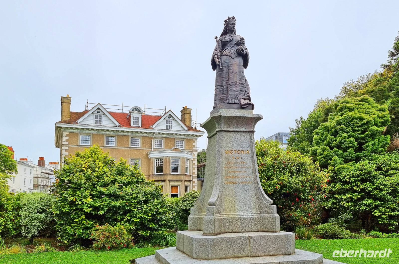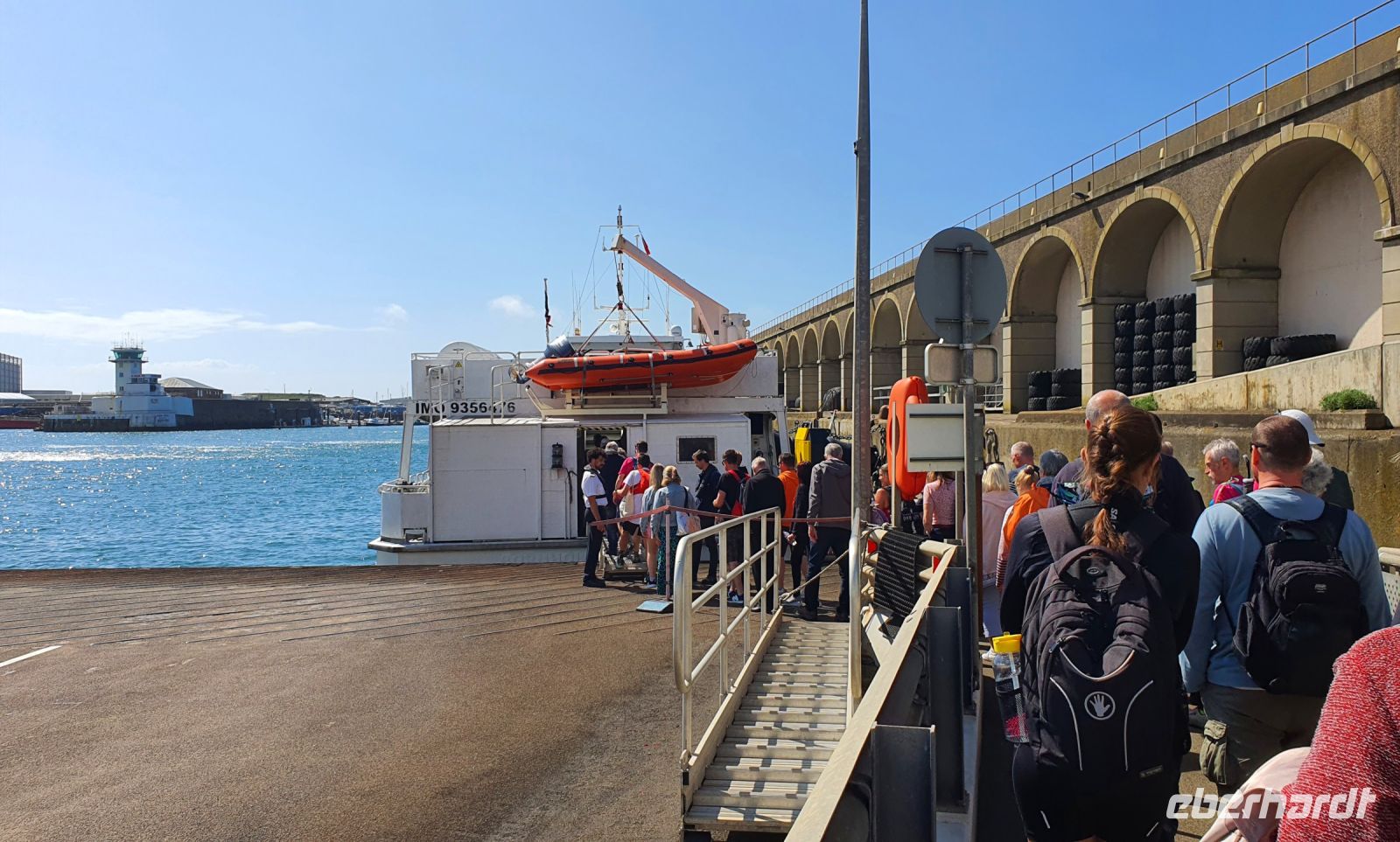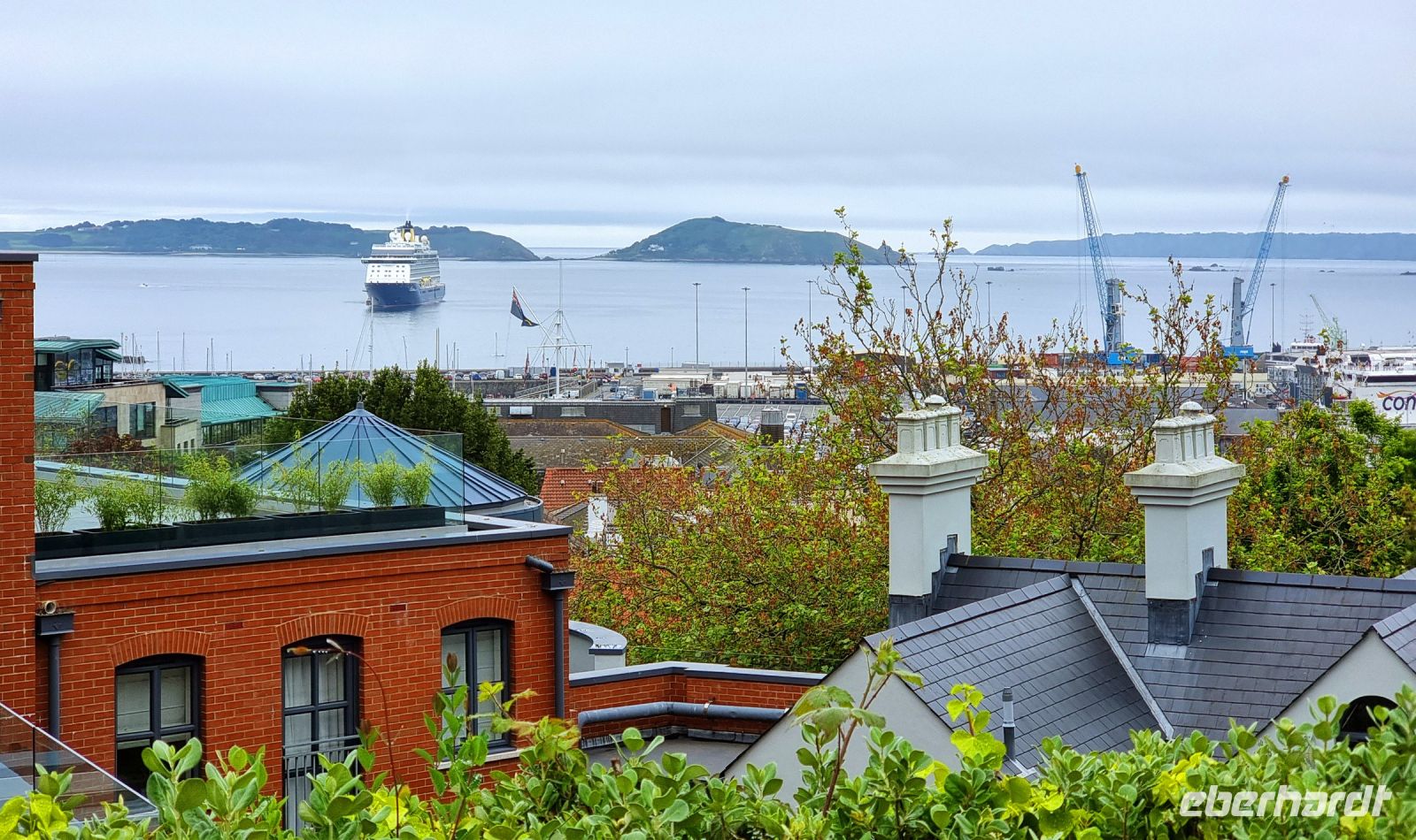 Wir stiegen am Candie Garten in St. Peter Port aus, welcher nach dem Wohnhaus des Besitzers Osmond de Beauvoir Priaulx (Candie House) benannt wurde. Er schenkte den Park im Jahr 1859 an die Insel Guernsey. Bei einem Spaziergang durch die wunderschöne Gartenanlage sahen wir das Denkmal von Königin Victoria und Victor Hugo. In der Innenstadt von St. Peter Port angekommen, hatten wir zwei Stunden Freizeit zum Bummeln, für einen Lunch oder zum Kaffee trinken. Um 16.15 Uhr trafen wir uns am kleinen Glockenturm am Hafen. Nun war es Zeit zum Check In für unsere Fähre von Guernsey zurück nach Jersey. Auch jetzt mussten wir wieder lange warten, bis unsere Condor-Fähre bereit zur Abfahrt war. Bei den großen Fähren müssen immer erst Autos, Lkw und Busse verladen werden, bevor die Passagiere an Bord gehen können. Wir starteten wieder mit einer halben Stunde Verspätung.