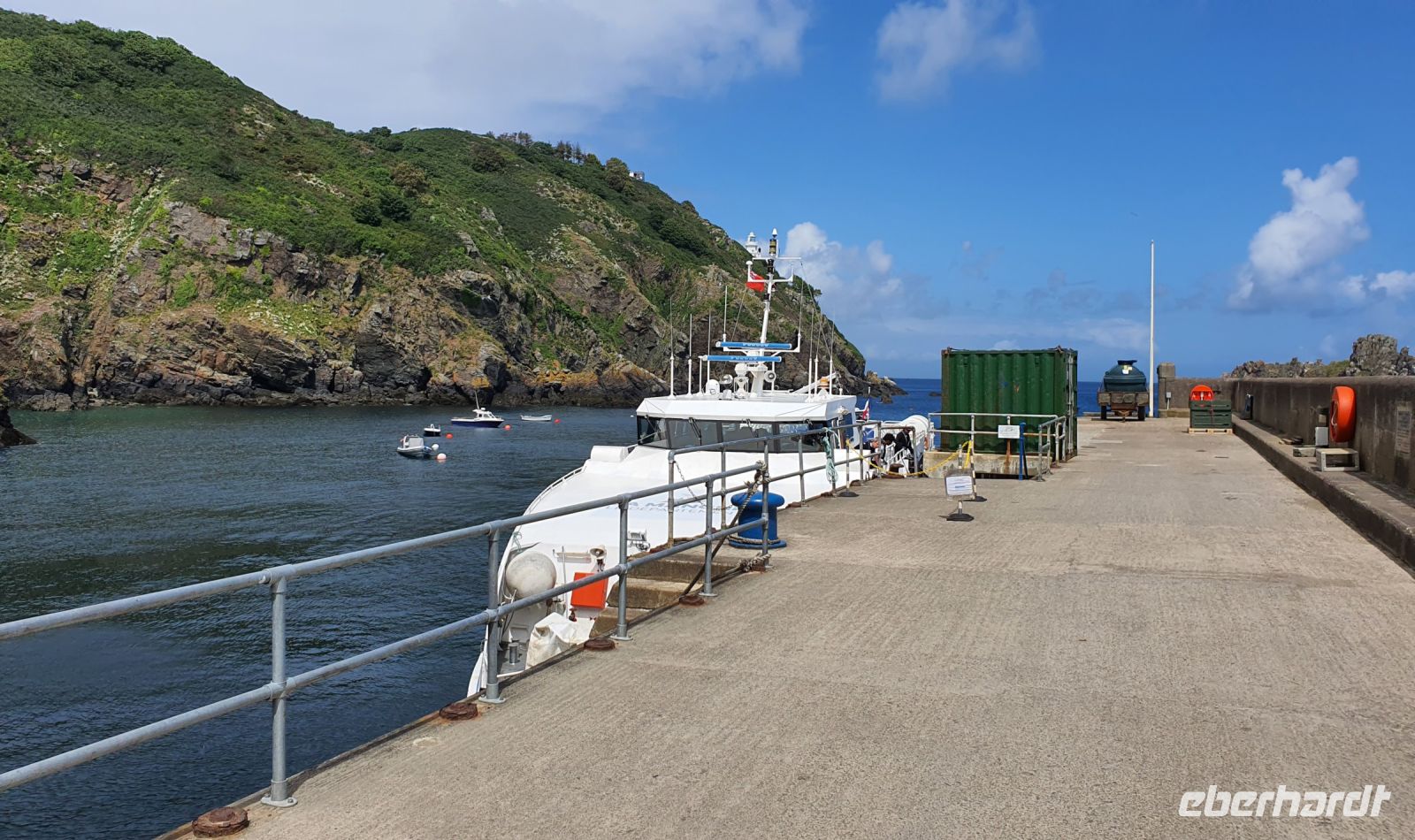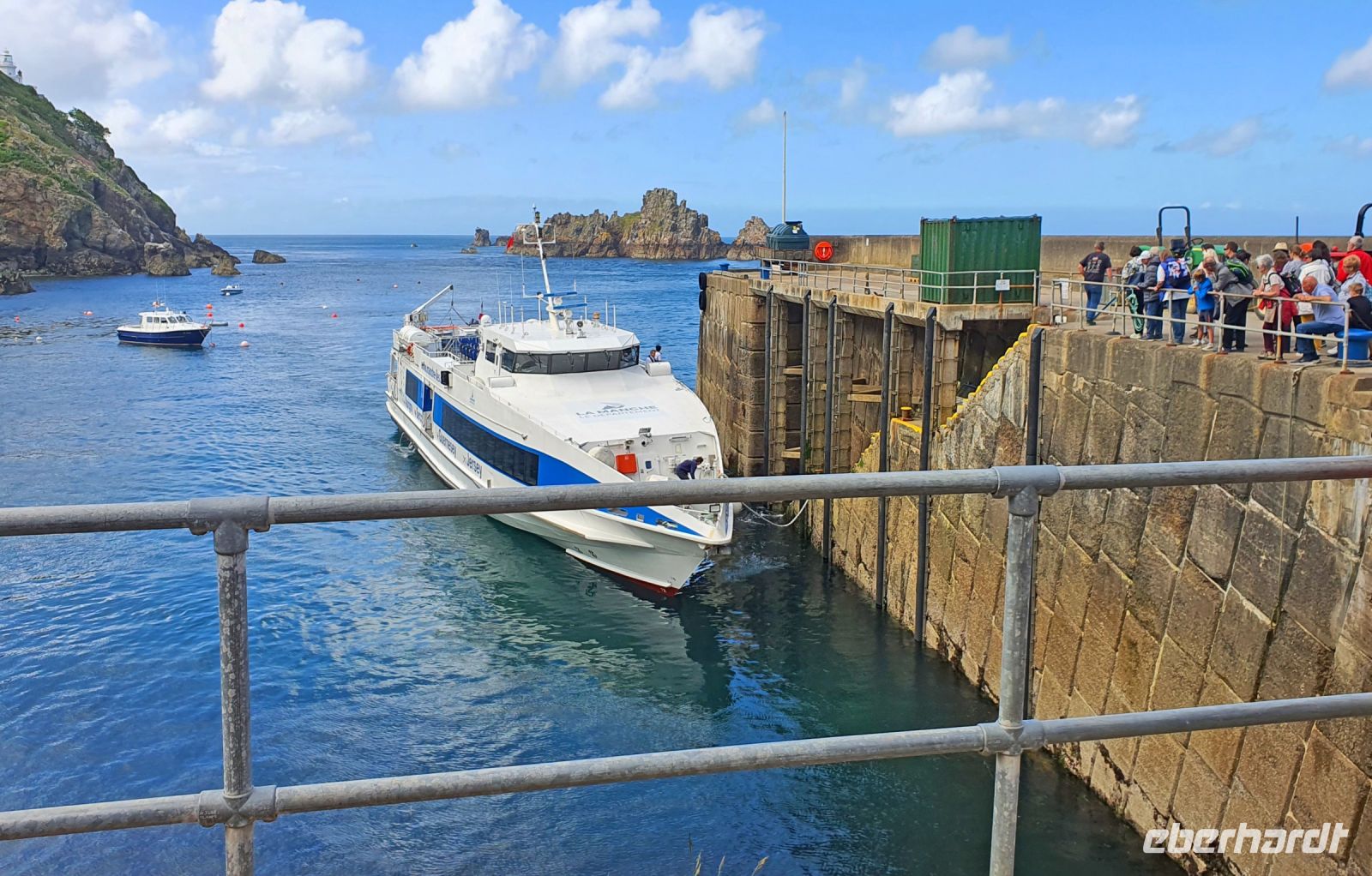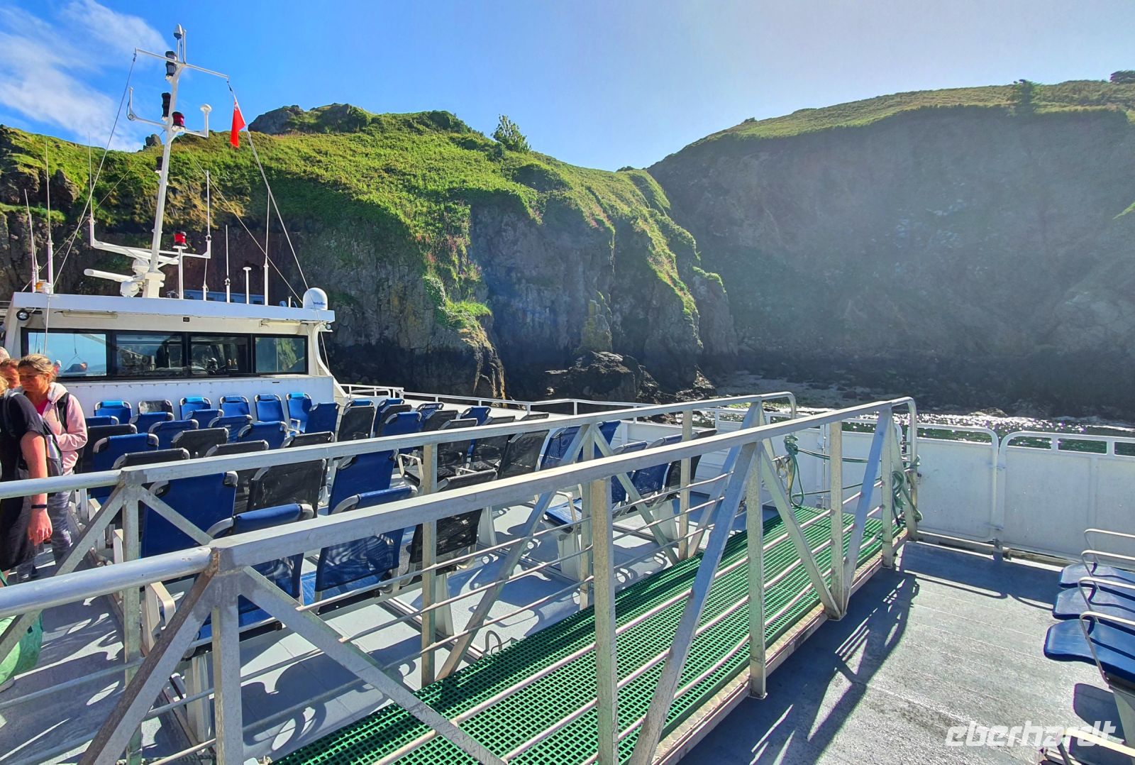 Gleich am zweiten Tag stand unser erster Schiffsausflug auf dem Programm. Mit der La Manche Fähre (La Manche heißt der Ärmelkanal auf Französisch) ging es zur viertgrößten Kanalinsel namens Sark. Leider fuhr die kleine Fähre verspätet los, sodass wir erst um 12 Uhr mittags auf Sark ankamen. Auf der Fähre kann man drinnen oder draußen sitzen, es gibt Toiletten und eine kleine Bar, an der man sich Getränke und Snacks mit EC- oder Kreditkarte kaufen kann. Die Fährüberfahrt dauert etwa 1 Stunde und 10 Minuten je nach Wind und Tide. Bei unserer Überfahrt war es recht windig, sodass das Schiff an manchen Stellen mächtig schaukelte.