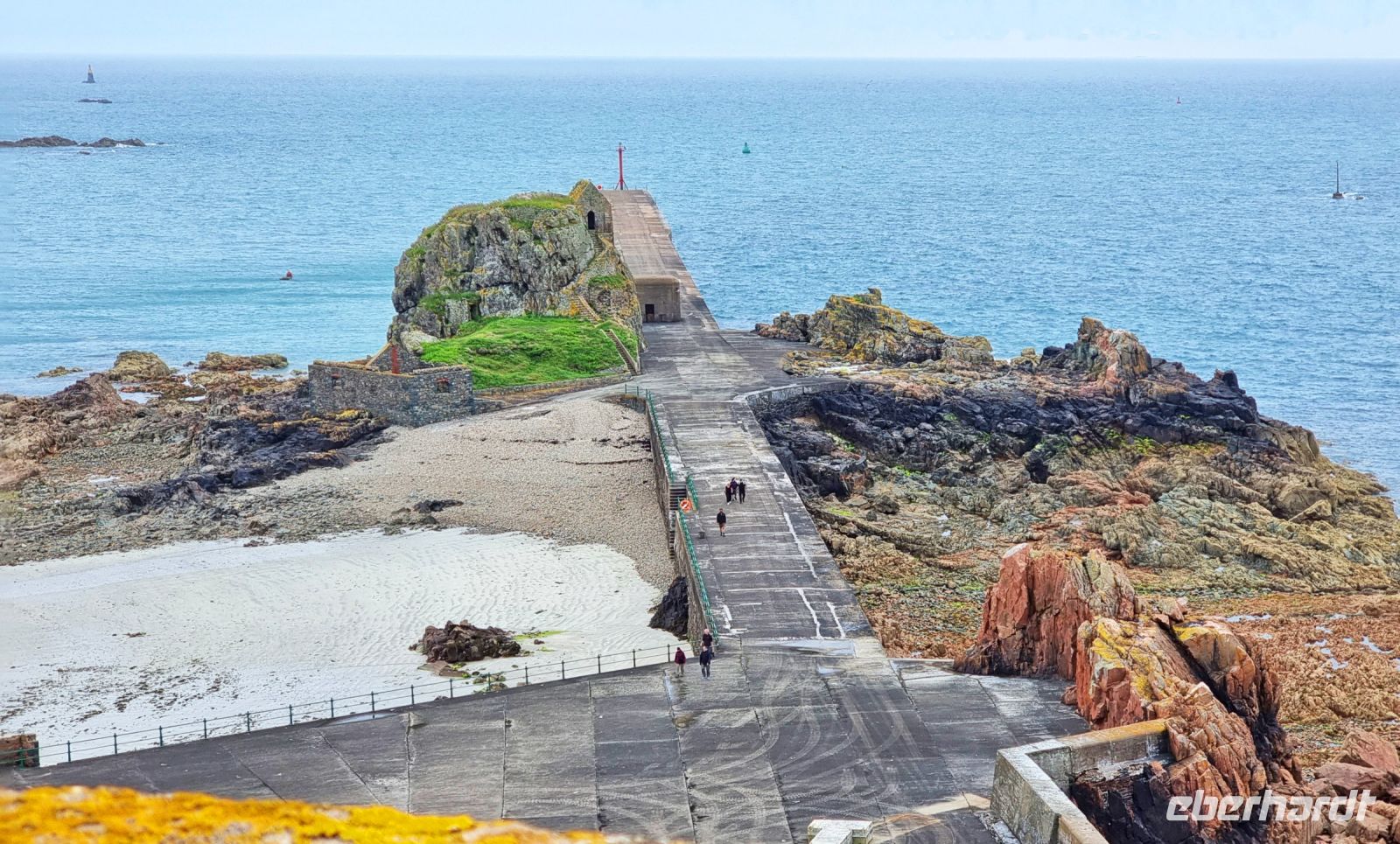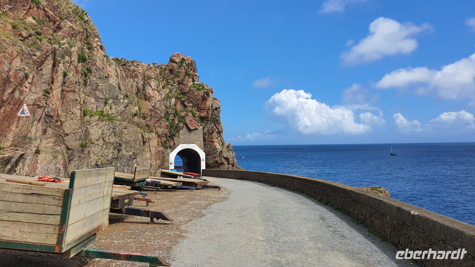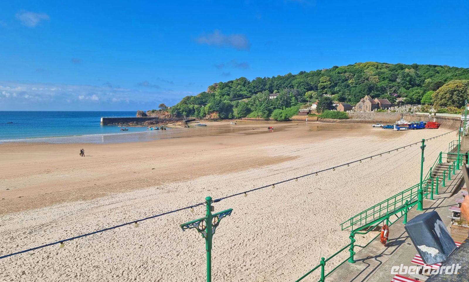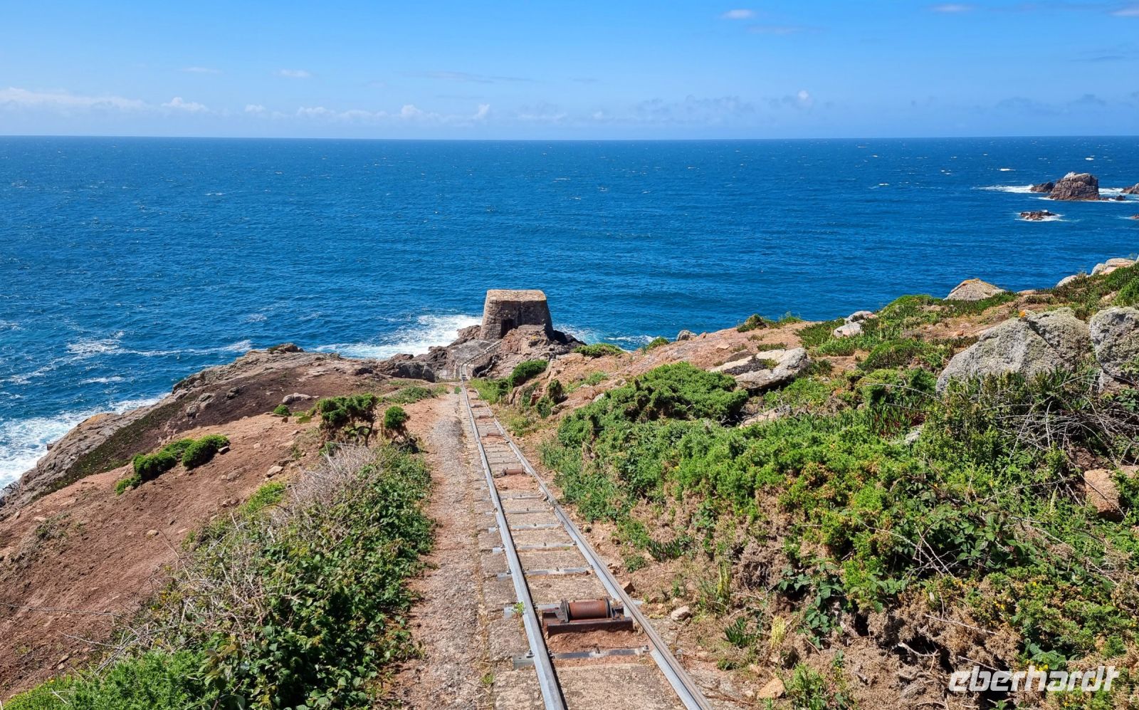 Von der Kirche ging unsere Wanderung dann hinauf zum Küstenpfad. Durch Farn und Ginsterhecken wanderten wir mit wunderbaren Aussichten auf den Beauport Beach, versteckte Buchten und den Atlantik oben entlang der Steilküste. Auch heute war das Wetter wieder traumhaft zum Wandern. Vorbei am Gefängnis von Jersey, einem alten Granit-Steinbruch und einer Entsalzungsanlage sahen wir schon bald den weißen Corbiere-Leuchtturm auf einer Gezeiteninsel vor der Südwestspitze Jerseys. Wieder ein "Kodak-Moment", wie Rémi immer sagte. Gerade war es Mittagszeit gegen 13.00 Uhr und wir legten eine Mittagspause am Leuchtturm ein. Im Restaurant "Corbiere Phare" ließen wir uns Sandwiches, Pommes, Kaffee und Kuchen schmecken. Auch einen Kiosk mit Jersey Ice Cream gibt es auf halbem Weg hinunter zum Leuchtturm. Nach einigen Fotos vom Corbiere-Leuchtturm wanderten wir weiter. Der Rückweg ging ganz entspannt immer leicht bergab auf der ehemaligen Eisenbahnstrecke von Jersey, die ab den 1870er Jahren hier in Betrieb war, um den Granit aus dem Steinbruch nach St. Aubin zu transportieren. In den 1930er Jahren wurde der Betrieb der Eisenbahn eingestellt und die Strecke wurde zu einem breiten Rad- und Wanderweg umgebaut. Am späten Nachmittag endet unsere Wanderung schließlich in St. Aubin, nach einer kurzen Pause am Bahnhof und Hafen fahren wir mit Eddie im Bus zurück nach St. Helier.
