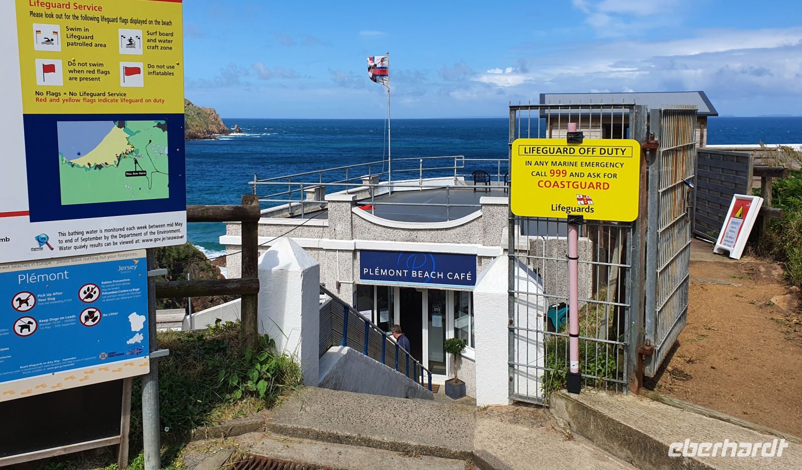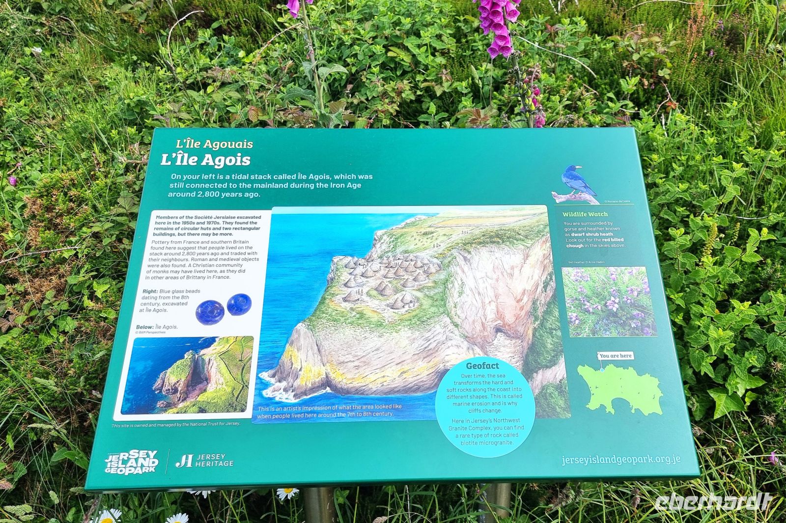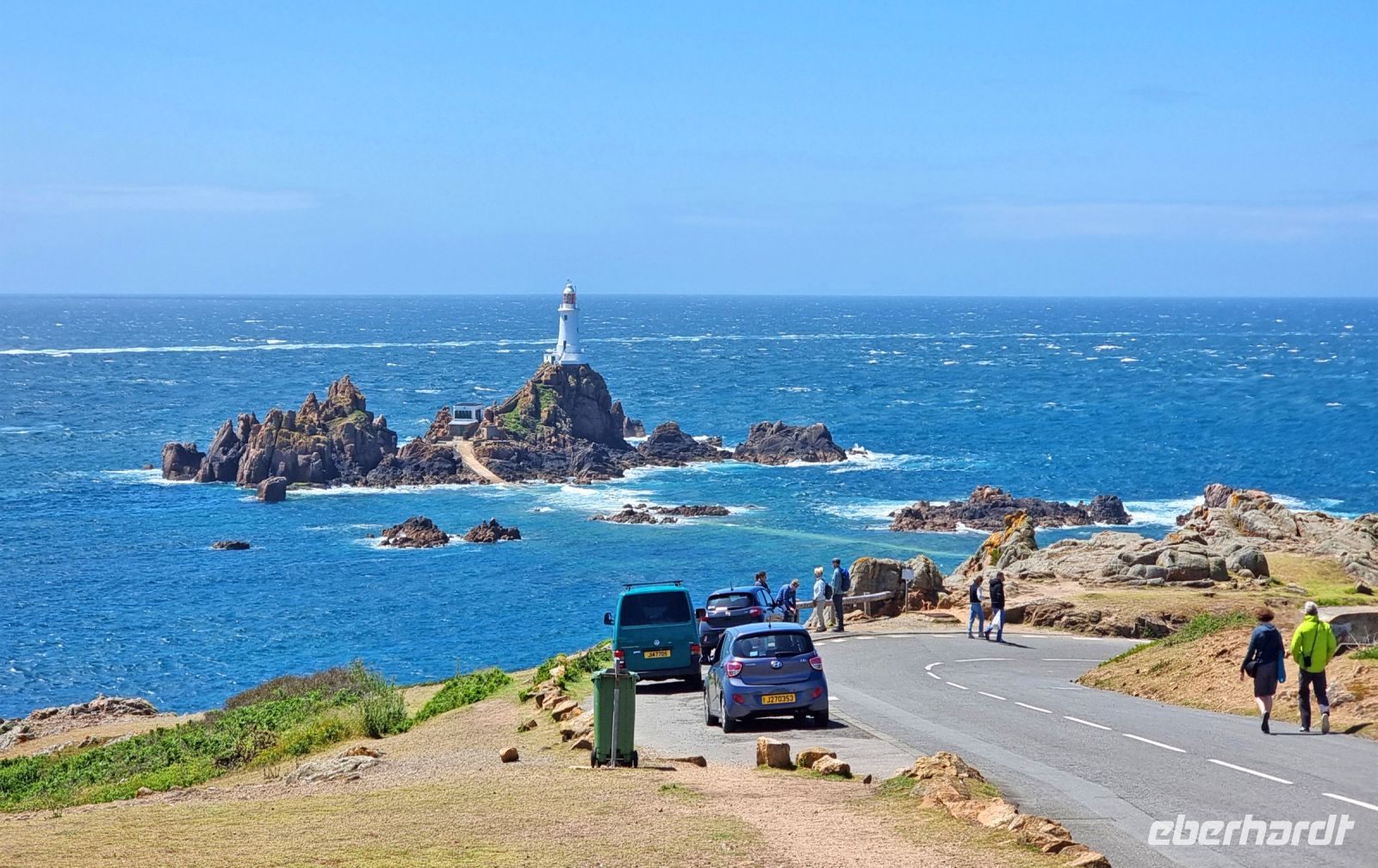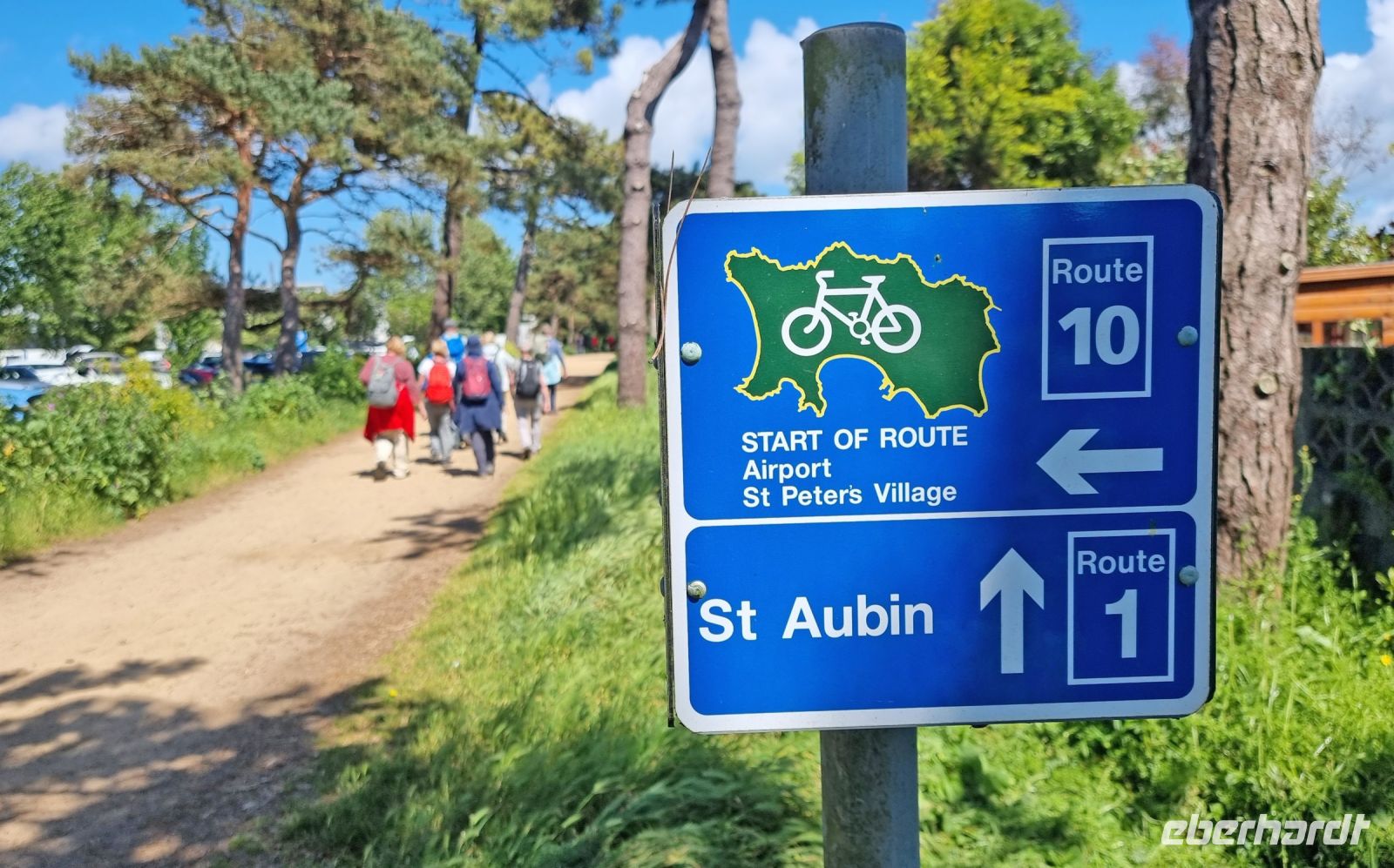 Von der Kirche ging unsere Wanderung dann hinauf zum Küstenpfad. Durch Farn und Ginsterhecken wanderten wir mit wunderbaren Aussichten auf den Beauport Beach, versteckte Buchten und den Atlantik oben entlang der Steilküste. Auch heute war das Wetter wieder traumhaft zum Wandern. Vorbei am Gefängnis von Jersey, einem alten Granit-Steinbruch und einer Entsalzungsanlage sahen wir schon bald den weißen Corbiere-Leuchtturm auf einer Gezeiteninsel vor der Südwestspitze Jerseys. Wieder ein "Kodak-Moment", wie Rémi immer sagte. Gerade war es Mittagszeit gegen 13.00 Uhr und wir legten eine Mittagspause am Leuchtturm ein. Im Restaurant "Corbiere Phare" ließen wir uns Sandwiches, Pommes, Kaffee und Kuchen schmecken. Auch einen Kiosk mit Jersey Ice Cream gibt es auf halbem Weg hinunter zum Leuchtturm. Nach einigen Fotos vom Corbiere-Leuchtturm wanderten wir weiter. Der Rückweg ging ganz entspannt immer leicht bergab auf der ehemaligen Eisenbahnstrecke von Jersey, die ab den 1870er Jahren hier in Betrieb war, um den Granit aus dem Steinbruch nach St. Aubin zu transportieren. In den 1930er Jahren wurde der Betrieb der Eisenbahn eingestellt und die Strecke wurde zu einem breiten Rad- und Wanderweg umgebaut. Am späten Nachmittag endet unsere Wanderung schließlich in St. Aubin, nach einer kurzen Pause am Bahnhof und Hafen fahren wir mit Eddie im Bus zurück nach St. Helier.