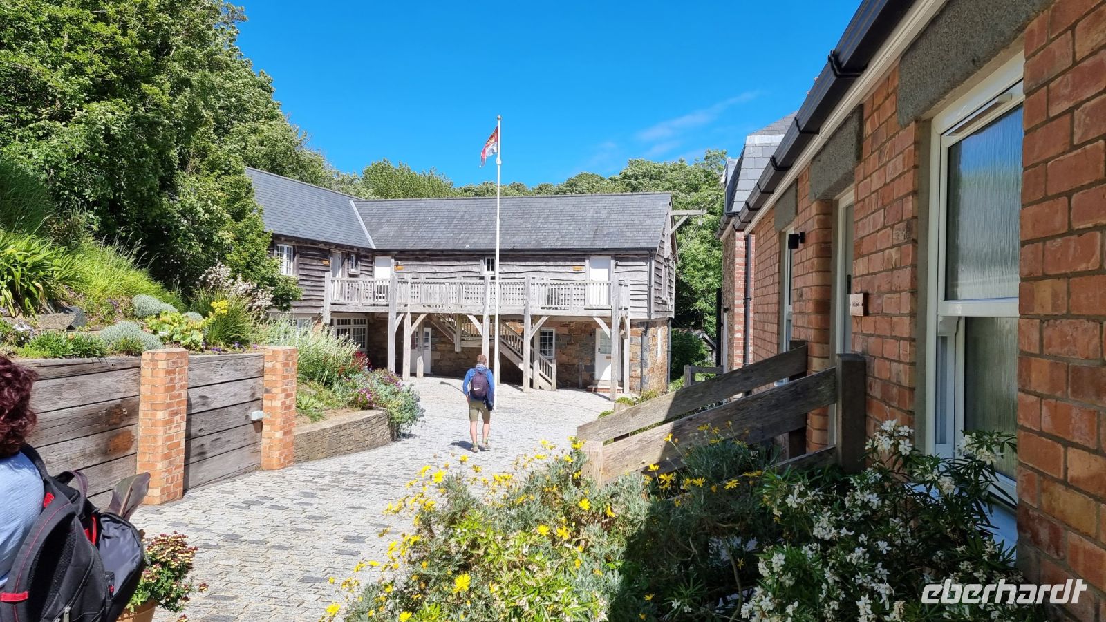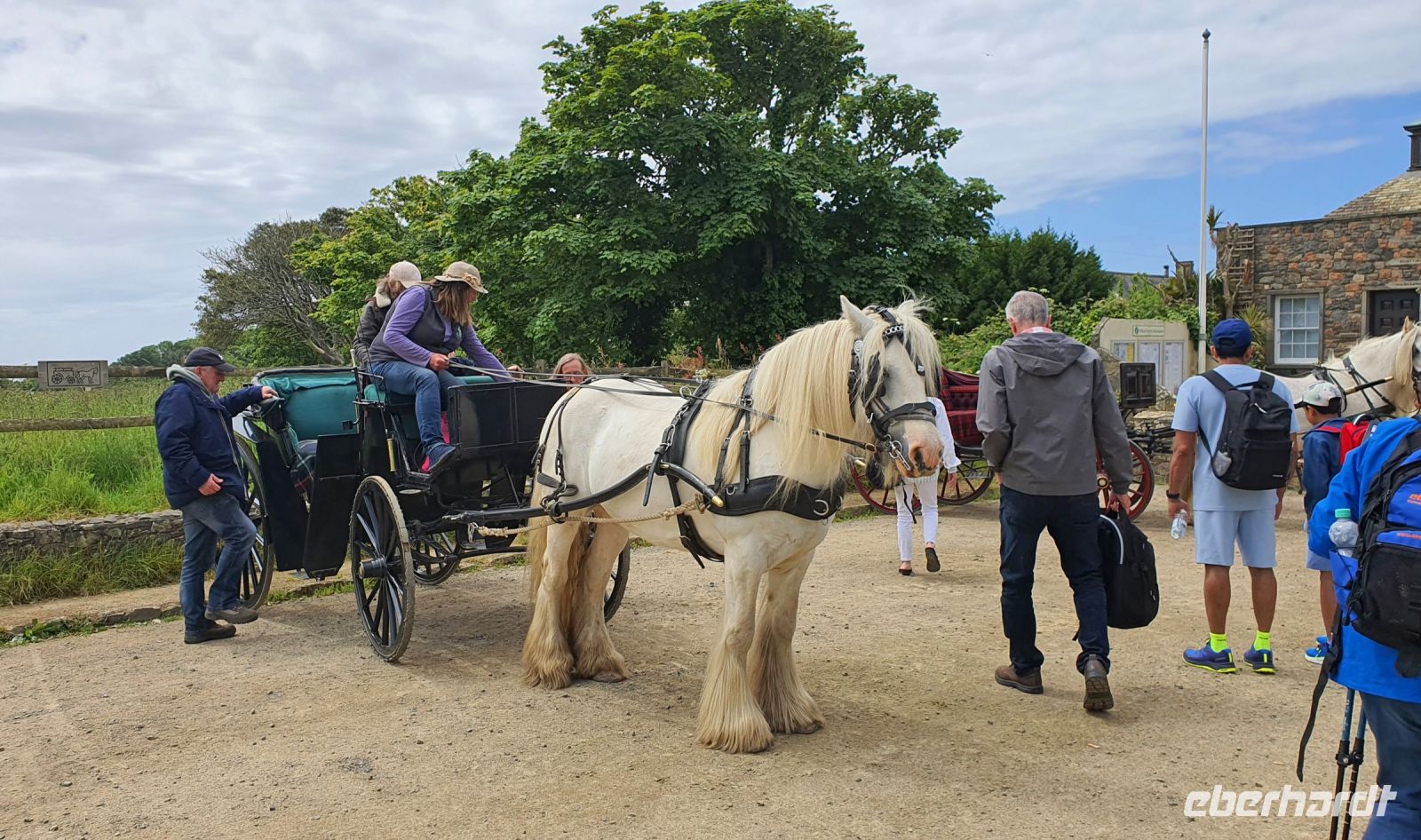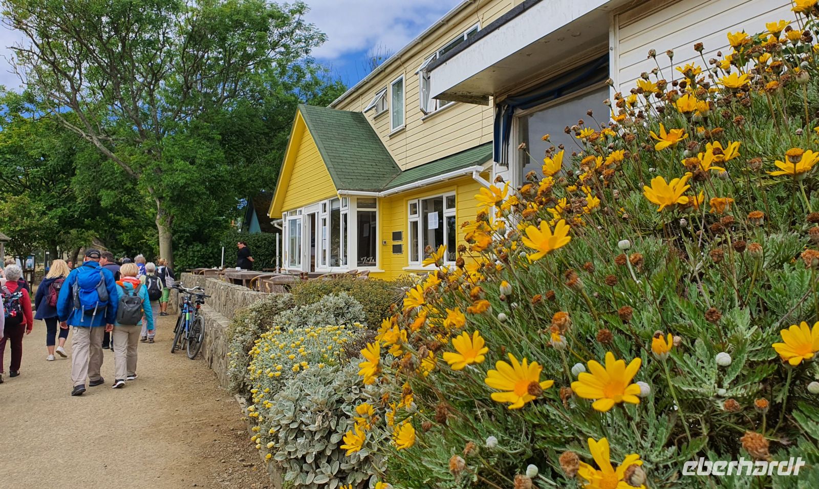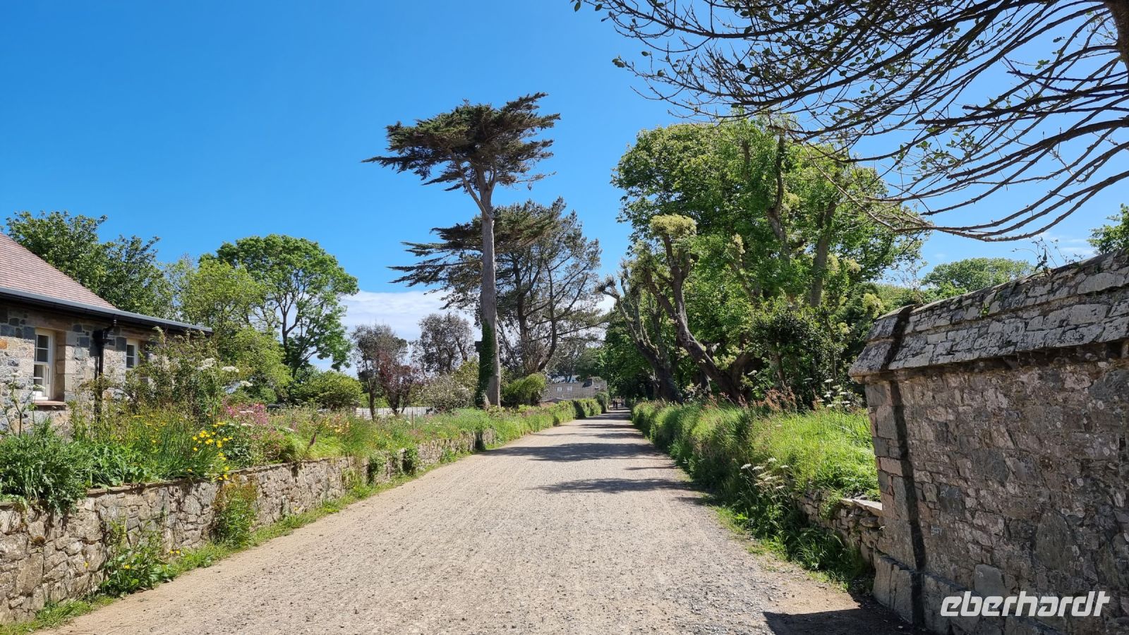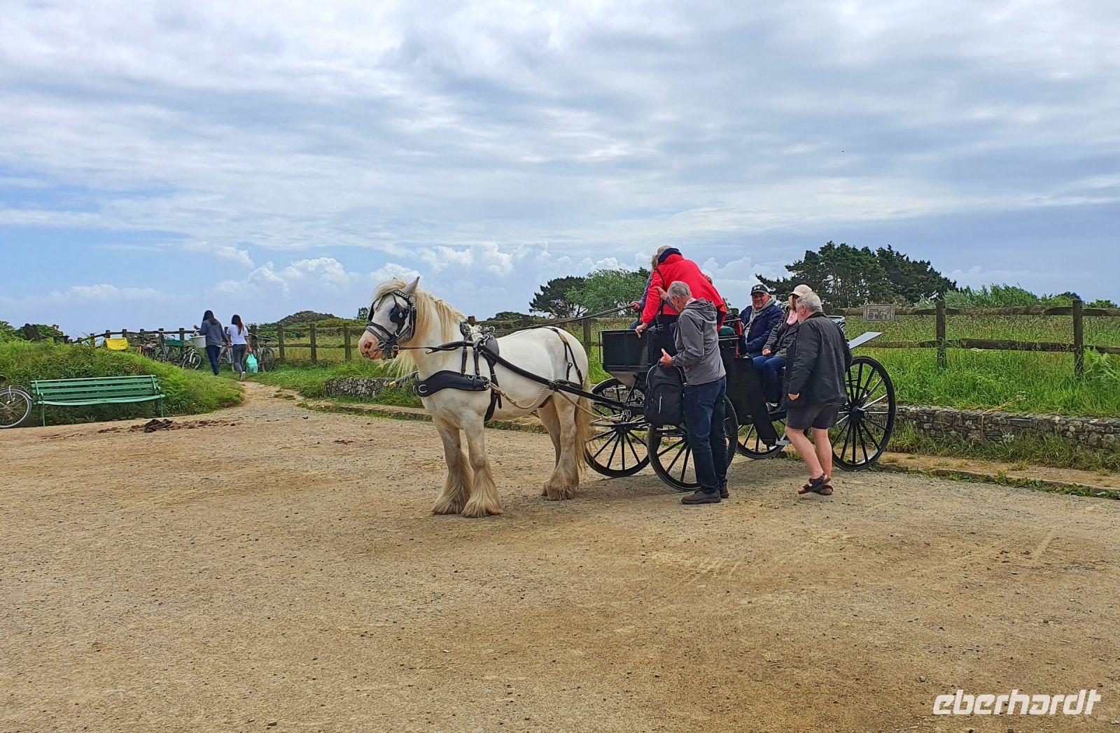 Am Schiffsanleger von Sark erwartete uns Gaby, unsere örtliche, Deutsch sprechende Reiseleiterin, die uns hier auf Sark und später auch auf der Insel Guernsey führen wird. Sie wohnt schon viele Jahre Jahre auf Guernsey und kennt sich bestens aus. Da der Anstieg vom Hafen bis hinauf auf das Inselplateau sehr steil ist, fuhren wir alle mit den hiesigen Traktoren hinauf zum Startpunkt unserer Wanderung. Wir wanderten vorbei an den Pferdekutschen, entlang der Dorfstraße und vorbei am kleinsten Gefängnis zur Kirche von Sark. Gaby erklärte uns Wissenswertes zur Kirche, zu den bestickten Sitzkissen und den Wandteppichen mit Sehenswürdigkeiten und der Geschichte von Jersey. Vorbei an der Schule und der Arztpraxis von Sark wanderten wir weiter zum Herrenhaus des Seigneurs, des Lehnsherren der Insel. Hier hatten wir nun Freizeit zum Besichtigen der herrlichen Gärten La Seigneurie, die sich um das Herrenhaus des Seigneurs befinden. Im Restaurant der La Seigneurie konnten wir etwas zu Mittag essen oder einen Kaffee trinken. Gegen 15 Uhr wanderten wir mit Gaby zurück in Richtung Dorf und machten noch einen Abstecher durch die Meadows, vorbei an einer Schafweide zum idyllisch gelegenen Stocks Hotel.