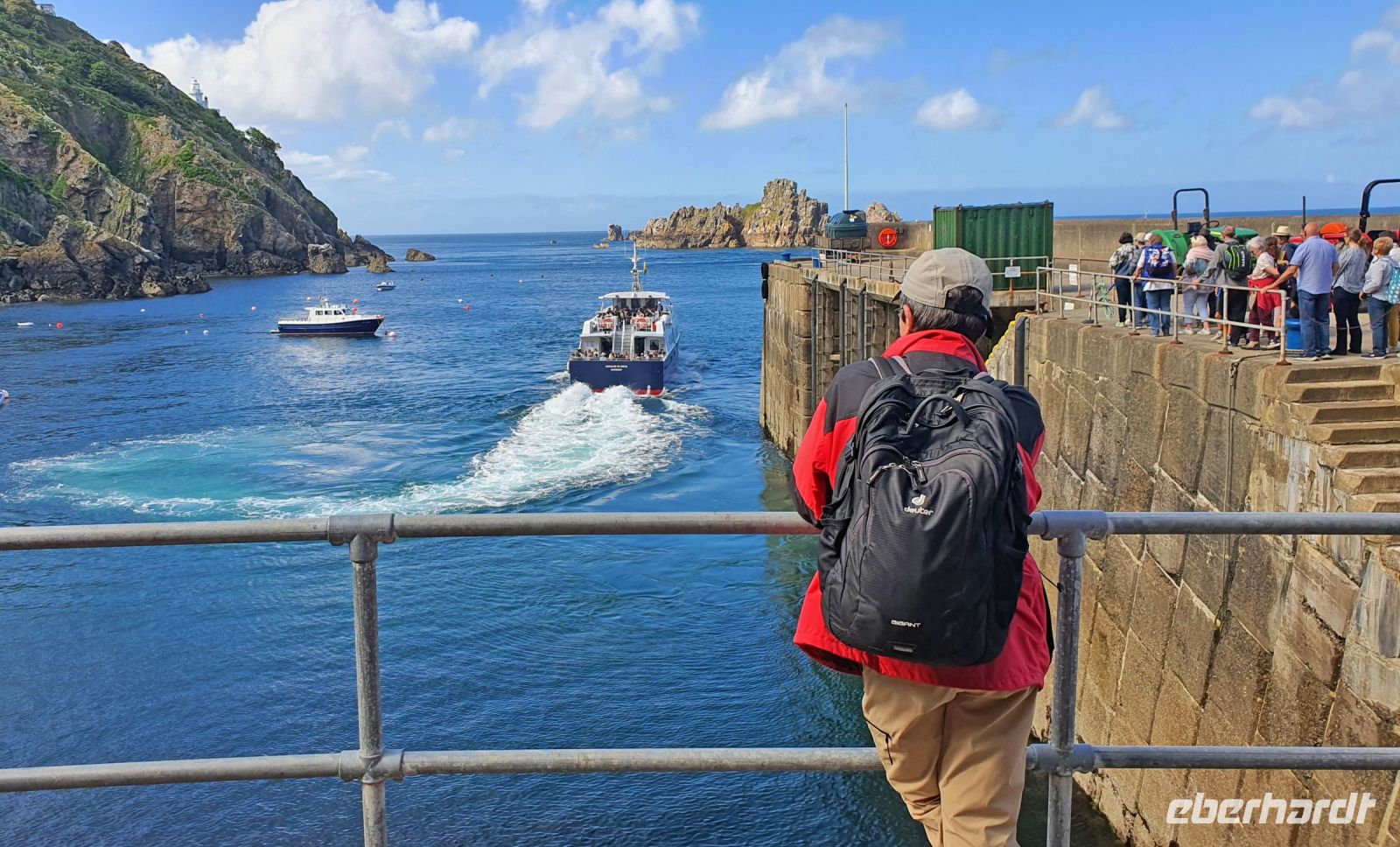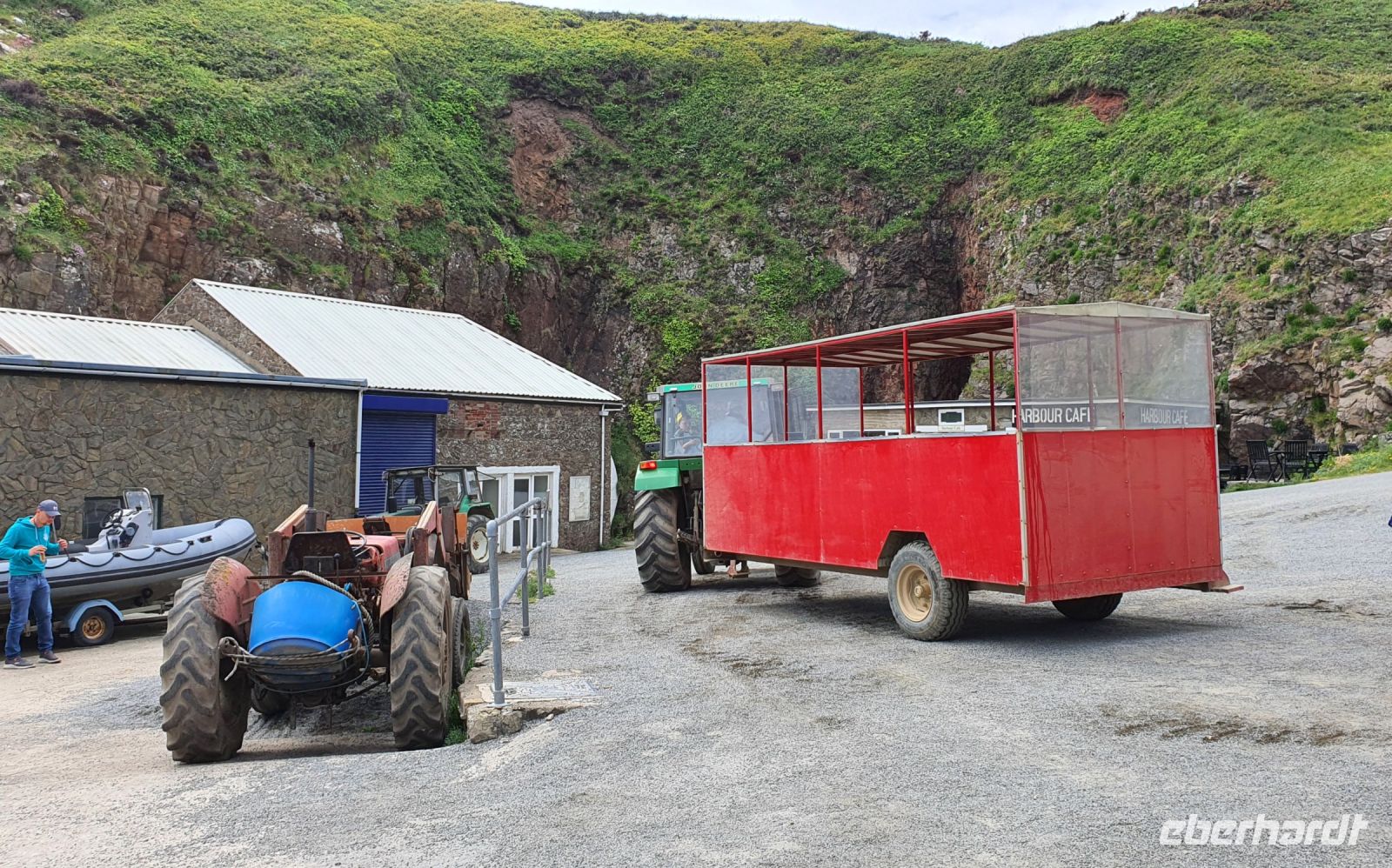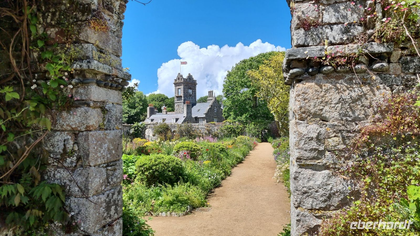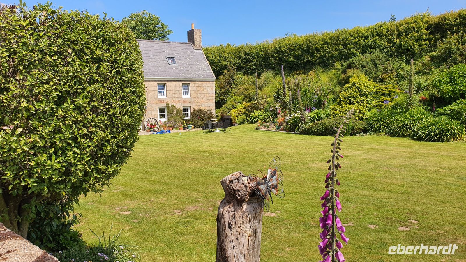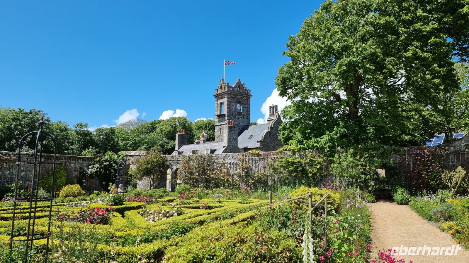 Am Schiffsanleger von Sark erwartete uns Gaby, unsere örtliche, Deutsch sprechende Reiseleiterin, die uns hier auf Sark und später auch auf der Insel Guernsey führen wird. Sie wohnt schon viele Jahre Jahre auf Guernsey und kennt sich bestens aus. Da der Anstieg vom Hafen bis hinauf auf das Inselplateau sehr steil ist, fuhren wir alle mit den hiesigen Traktoren hinauf zum Startpunkt unserer Wanderung. Wir wanderten vorbei an den Pferdekutschen, entlang der Dorfstraße und vorbei am kleinsten Gefängnis zur Kirche von Sark. Gaby erklärte uns Wissenswertes zur Kirche, zu den bestickten Sitzkissen und den Wandteppichen mit Sehenswürdigkeiten und der Geschichte von Jersey. Vorbei an der Schule und der Arztpraxis von Sark wanderten wir weiter zum Herrenhaus des Seigneurs, des Lehnsherren der Insel. Hier hatten wir nun Freizeit zum Besichtigen der herrlichen Gärten La Seigneurie, die sich um das Herrenhaus des Seigneurs befinden. Im Restaurant der La Seigneurie konnten wir etwas zu Mittag essen oder einen Kaffee trinken. Gegen 15 Uhr wanderten wir mit Gaby zurück in Richtung Dorf und machten noch einen Abstecher durch die Meadows, vorbei an einer Schafweide zum idyllisch gelegenen Stocks Hotel.
