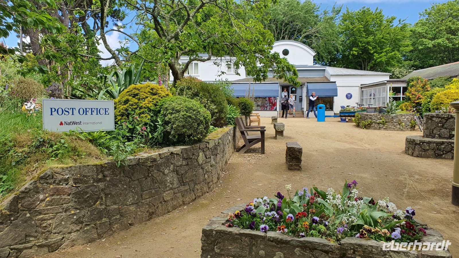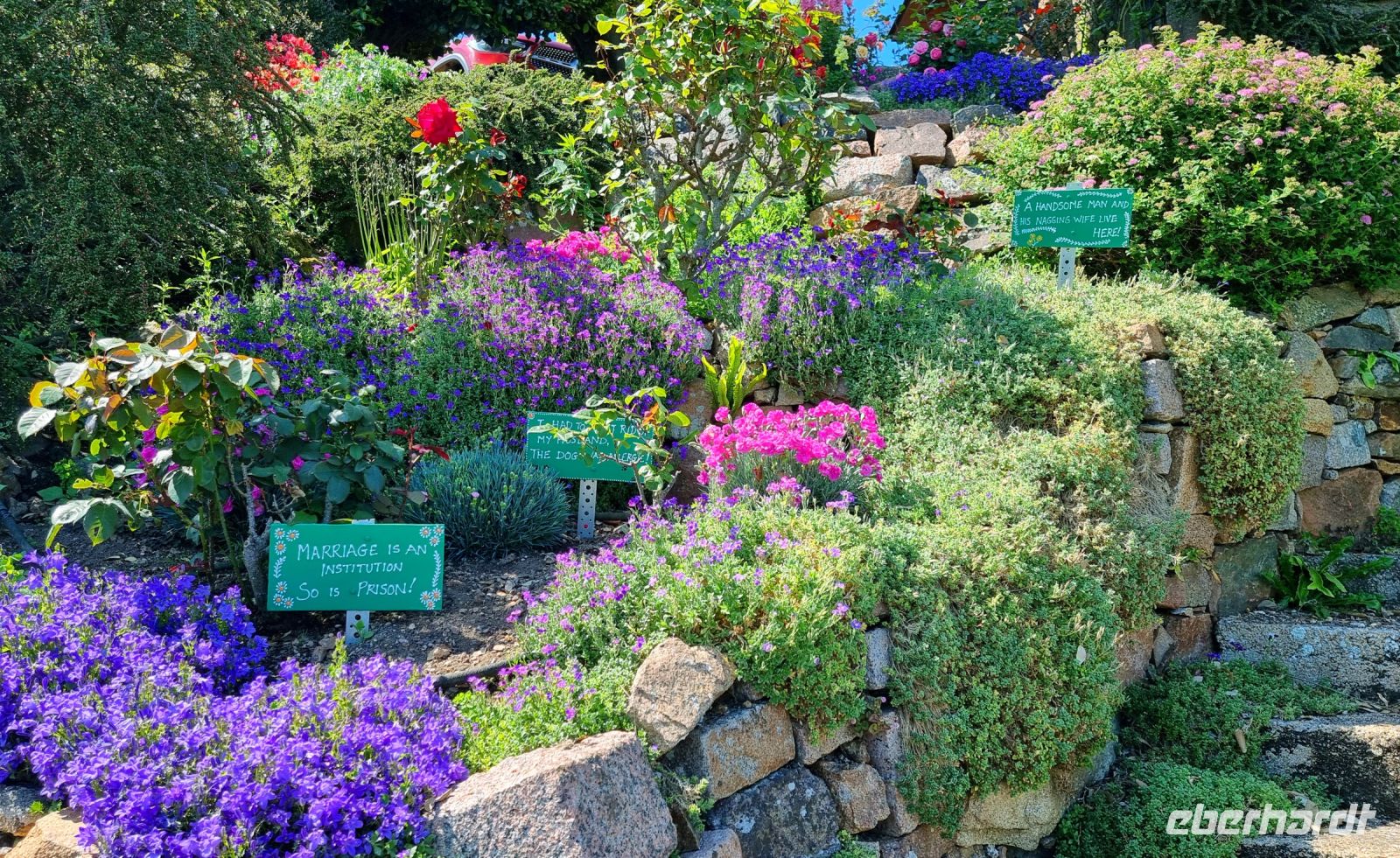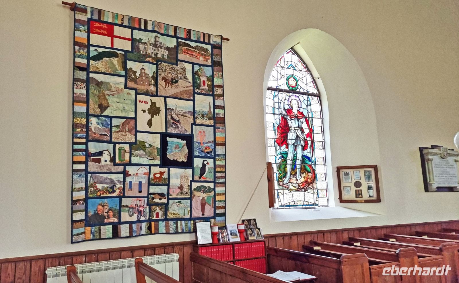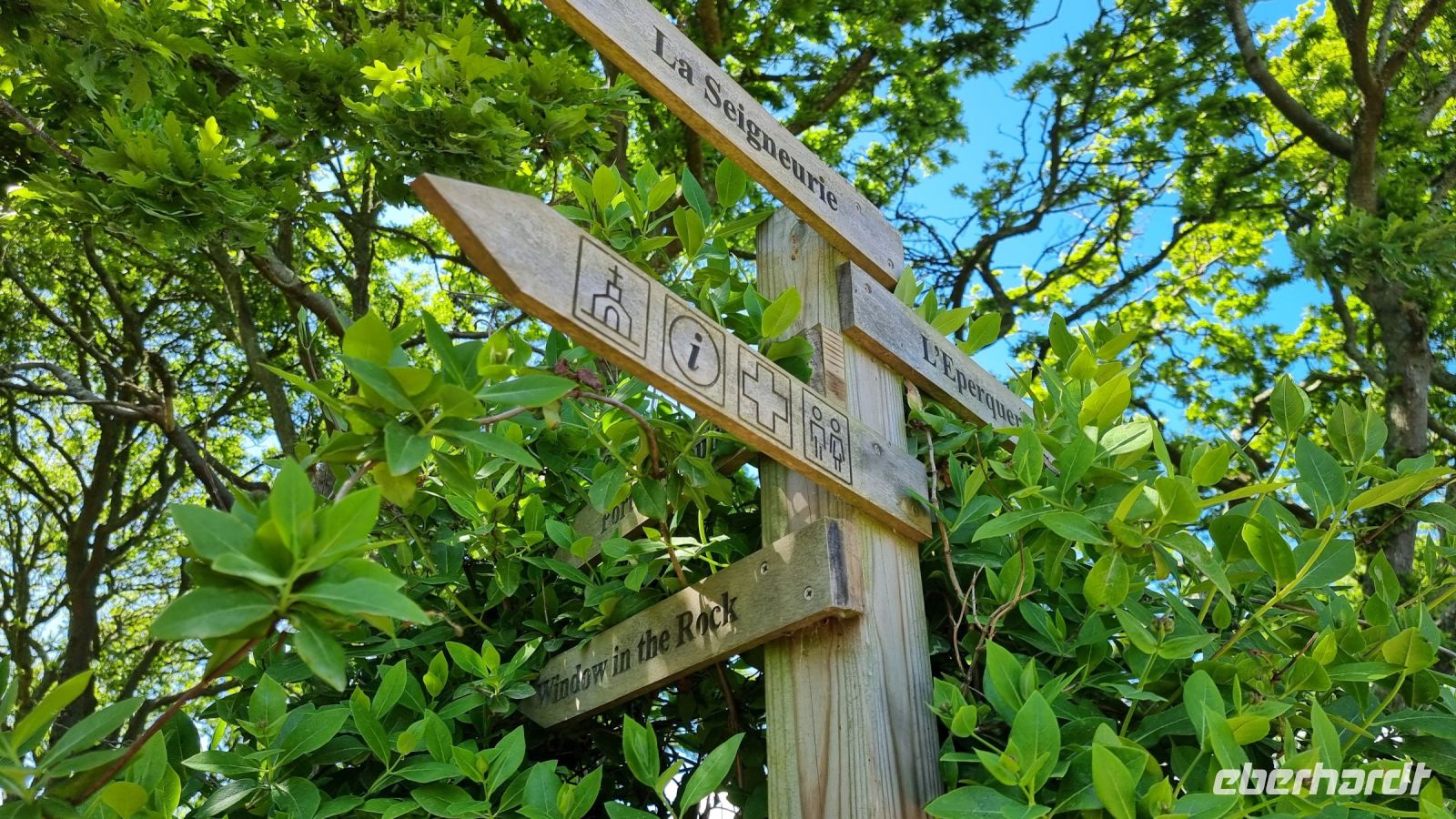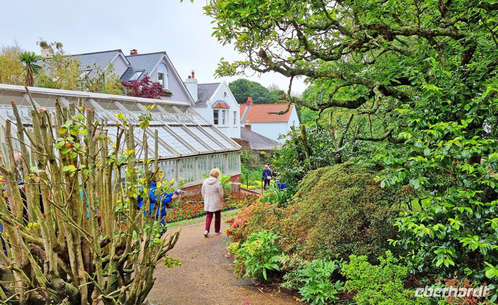 Am Schiffsanleger von Sark erwartete uns Gaby, unsere örtliche, Deutsch sprechende Reiseleiterin, die uns hier auf Sark und später auch auf der Insel Guernsey führen wird. Sie wohnt schon viele Jahre Jahre auf Guernsey und kennt sich bestens aus. Da der Anstieg vom Hafen bis hinauf auf das Inselplateau sehr steil ist, fuhren wir alle mit den hiesigen Traktoren hinauf zum Startpunkt unserer Wanderung. Wir wanderten vorbei an den Pferdekutschen, entlang der Dorfstraße und vorbei am kleinsten Gefängnis zur Kirche von Sark. Gaby erklärte uns Wissenswertes zur Kirche, zu den bestickten Sitzkissen und den Wandteppichen mit Sehenswürdigkeiten und der Geschichte von Jersey. Vorbei an der Schule und der Arztpraxis von Sark wanderten wir weiter zum Herrenhaus des Seigneurs, des Lehnsherren der Insel. Hier hatten wir nun Freizeit zum Besichtigen der herrlichen Gärten La Seigneurie, die sich um das Herrenhaus des Seigneurs befinden. Im Restaurant der La Seigneurie konnten wir etwas zu Mittag essen oder einen Kaffee trinken. Gegen 15 Uhr wanderten wir mit Gaby zurück in Richtung Dorf und machten noch einen Abstecher durch die Meadows, vorbei an einer Schafweide zum idyllisch gelegenen Stocks Hotel.