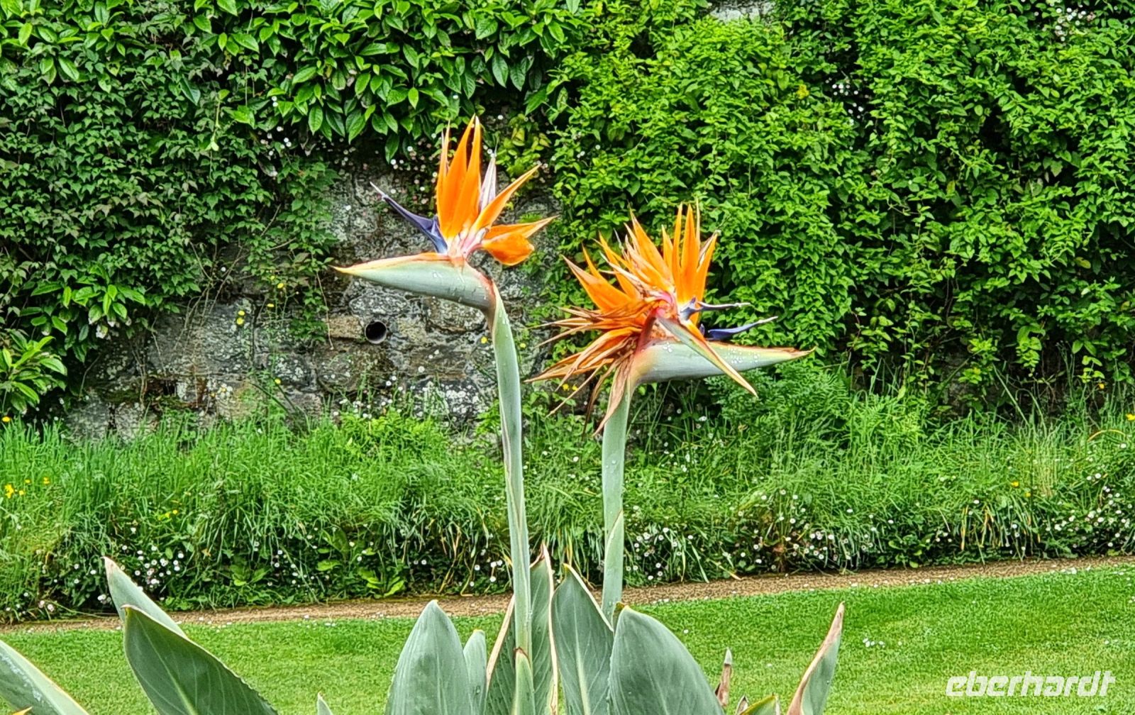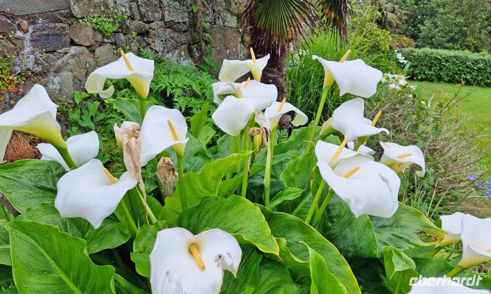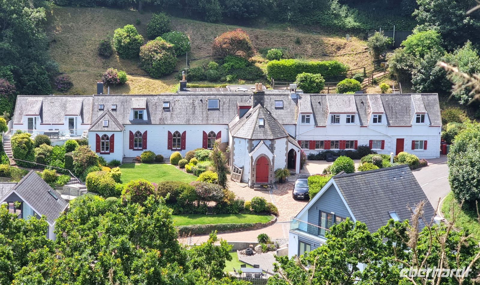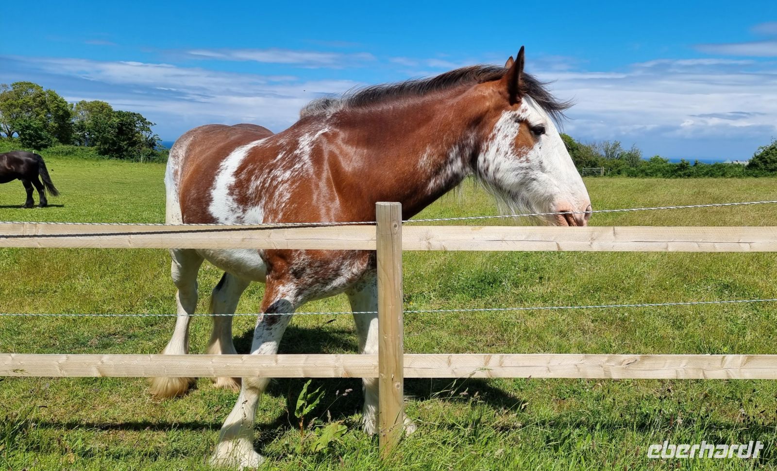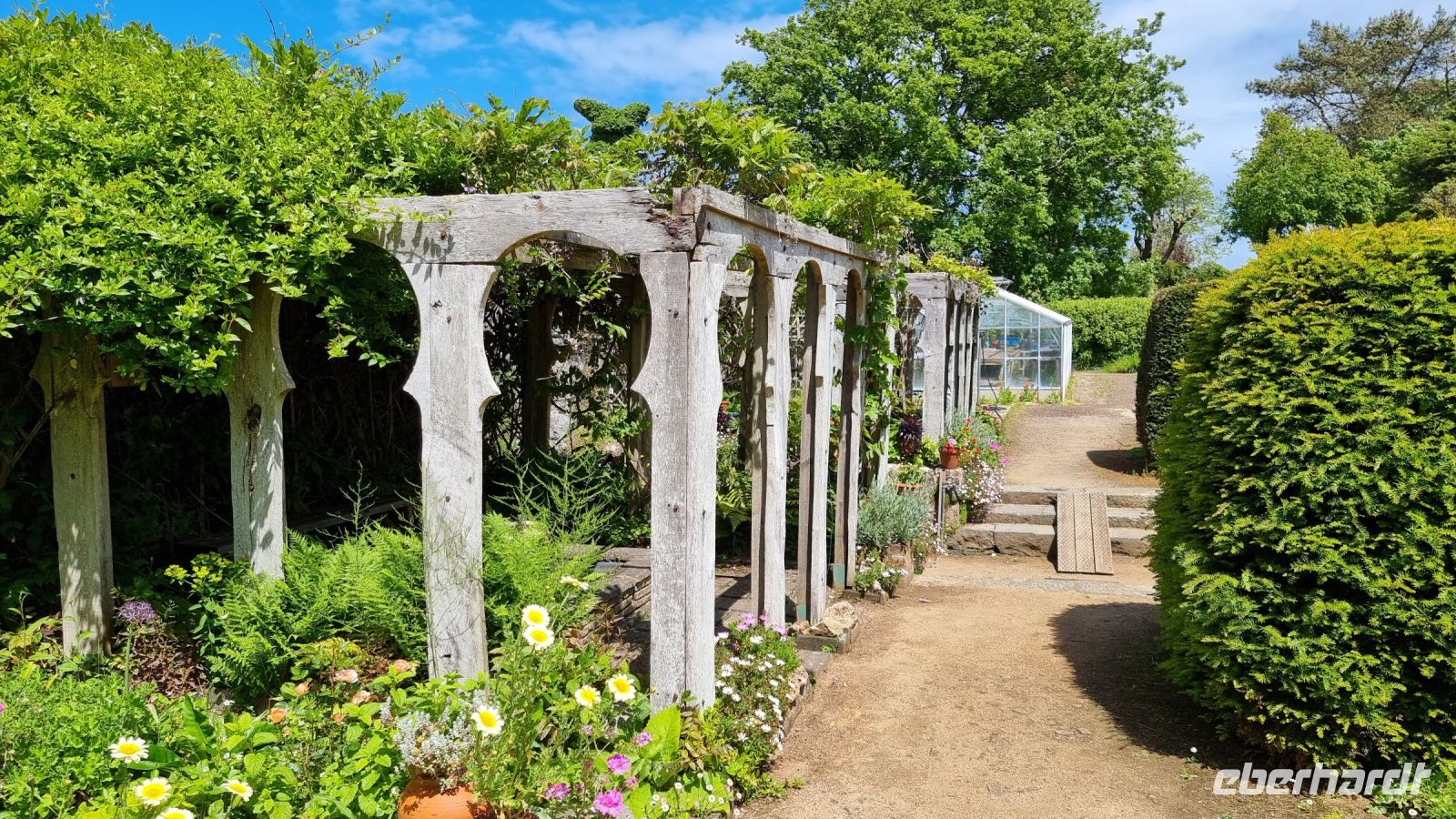 Am Schiffsanleger von Sark erwartete uns Gaby, unsere örtliche, Deutsch sprechende Reiseleiterin, die uns hier auf Sark und später auch auf der Insel Guernsey führen wird. Sie wohnt schon viele Jahre Jahre auf Guernsey und kennt sich bestens aus. Da der Anstieg vom Hafen bis hinauf auf das Inselplateau sehr steil ist, fuhren wir alle mit den hiesigen Traktoren hinauf zum Startpunkt unserer Wanderung. Wir wanderten vorbei an den Pferdekutschen, entlang der Dorfstraße und vorbei am kleinsten Gefängnis zur Kirche von Sark. Gaby erklärte uns Wissenswertes zur Kirche, zu den bestickten Sitzkissen und den Wandteppichen mit Sehenswürdigkeiten und der Geschichte von Jersey. Vorbei an der Schule und der Arztpraxis von Sark wanderten wir weiter zum Herrenhaus des Seigneurs, des Lehnsherren der Insel. Hier hatten wir nun Freizeit zum Besichtigen der herrlichen Gärten La Seigneurie, die sich um das Herrenhaus des Seigneurs befinden. Im Restaurant der La Seigneurie konnten wir etwas zu Mittag essen oder einen Kaffee trinken. Gegen 15 Uhr wanderten wir mit Gaby zurück in Richtung Dorf und machten noch einen Abstecher durch die Meadows, vorbei an einer Schafweide zum idyllisch gelegenen Stocks Hotel.