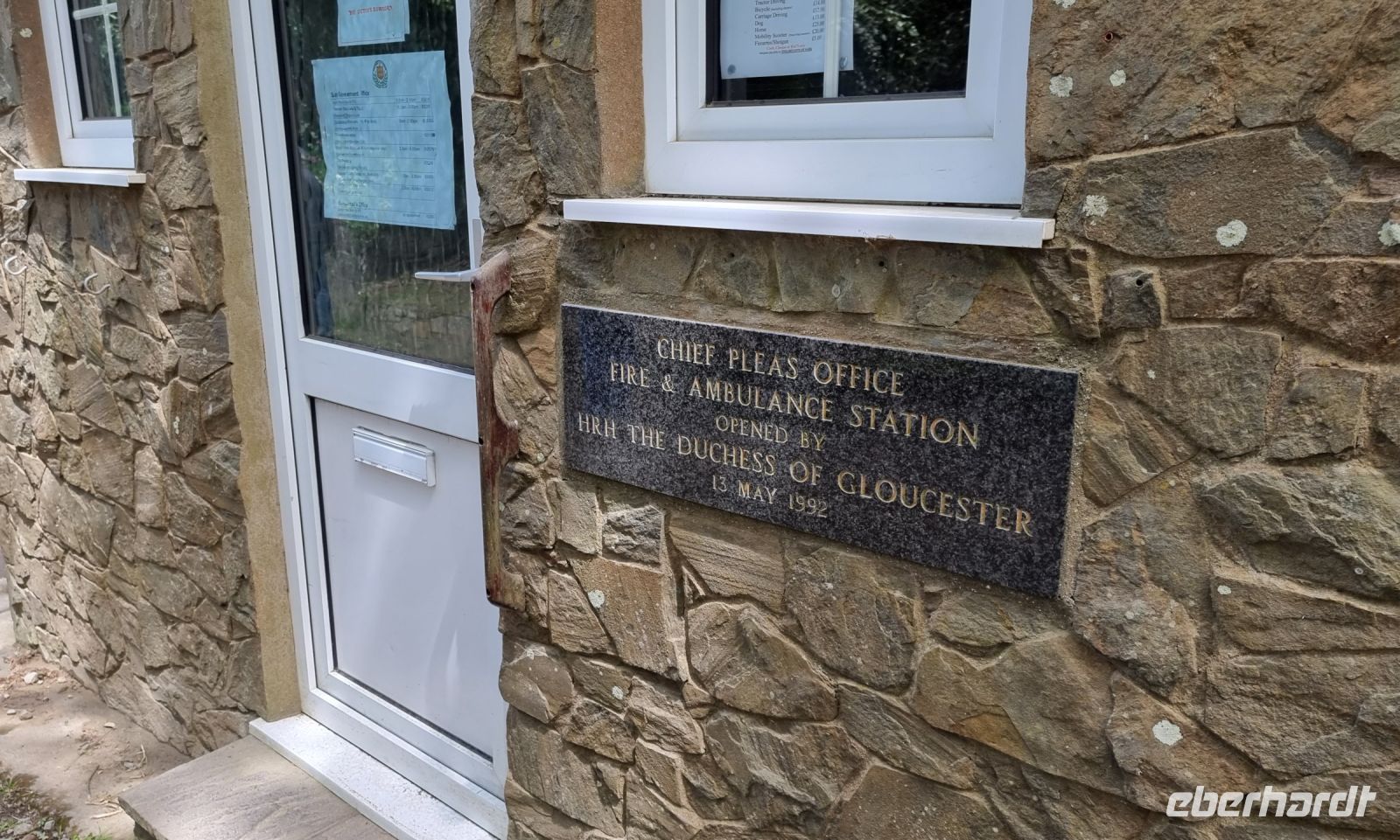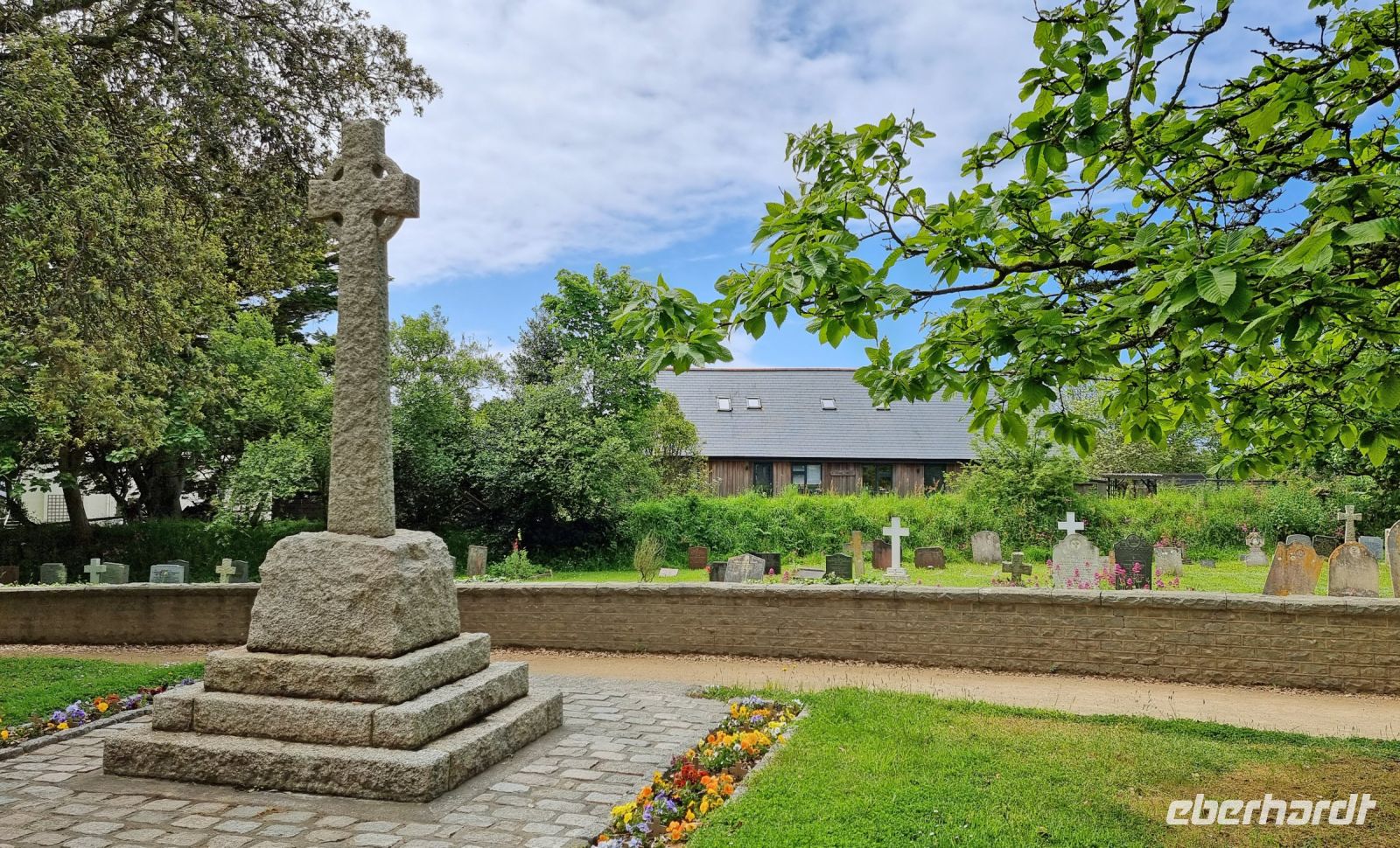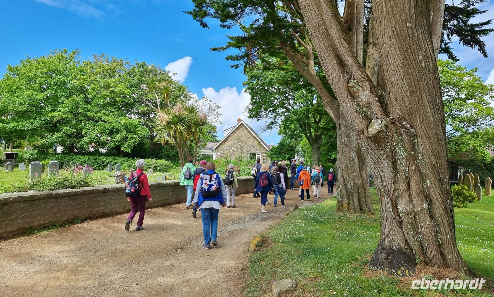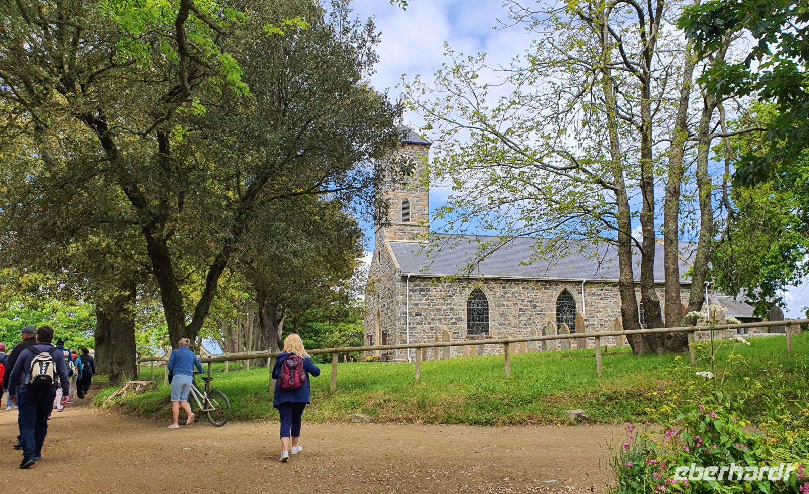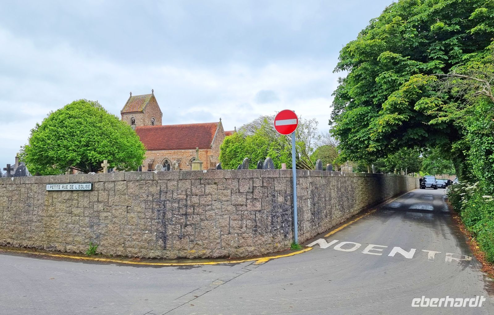 Dann wanderten wir auf einem Wanderpfad und entlang der Green Lane durch das üppig-grüne Waterworks Valley mit den Stauseen und dem Wasserwerk, die von den Engländern nach dem Sieg über Napoleon angelegt haben. Früher gab es hier auch Dutzende Wassermühlen, von denen es heute nur noch eine gibt, die vom National Trust als Denkmal verwaltet wird. Vorbei am Millennium-Stein nahe der ehemaligen Vicart-Mühle ging es dann eine schmale Gasse steil bergauf und vorbei an einer Farm mit alten Dolmen-Steinen und Kartoffelfeldern zur Pfarrkirche von St. Lawrence. Da hier gerade eine Beerdigungsmesse stattfand, konnten wir die Kirche nur von außen ansehen. Rémi erklärte einiges zu den uralten Gemäuern und dass die Kirche früher auch als Munitionslager genutzt wurde.