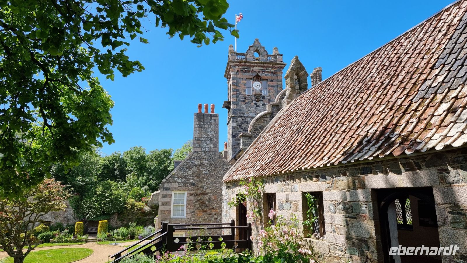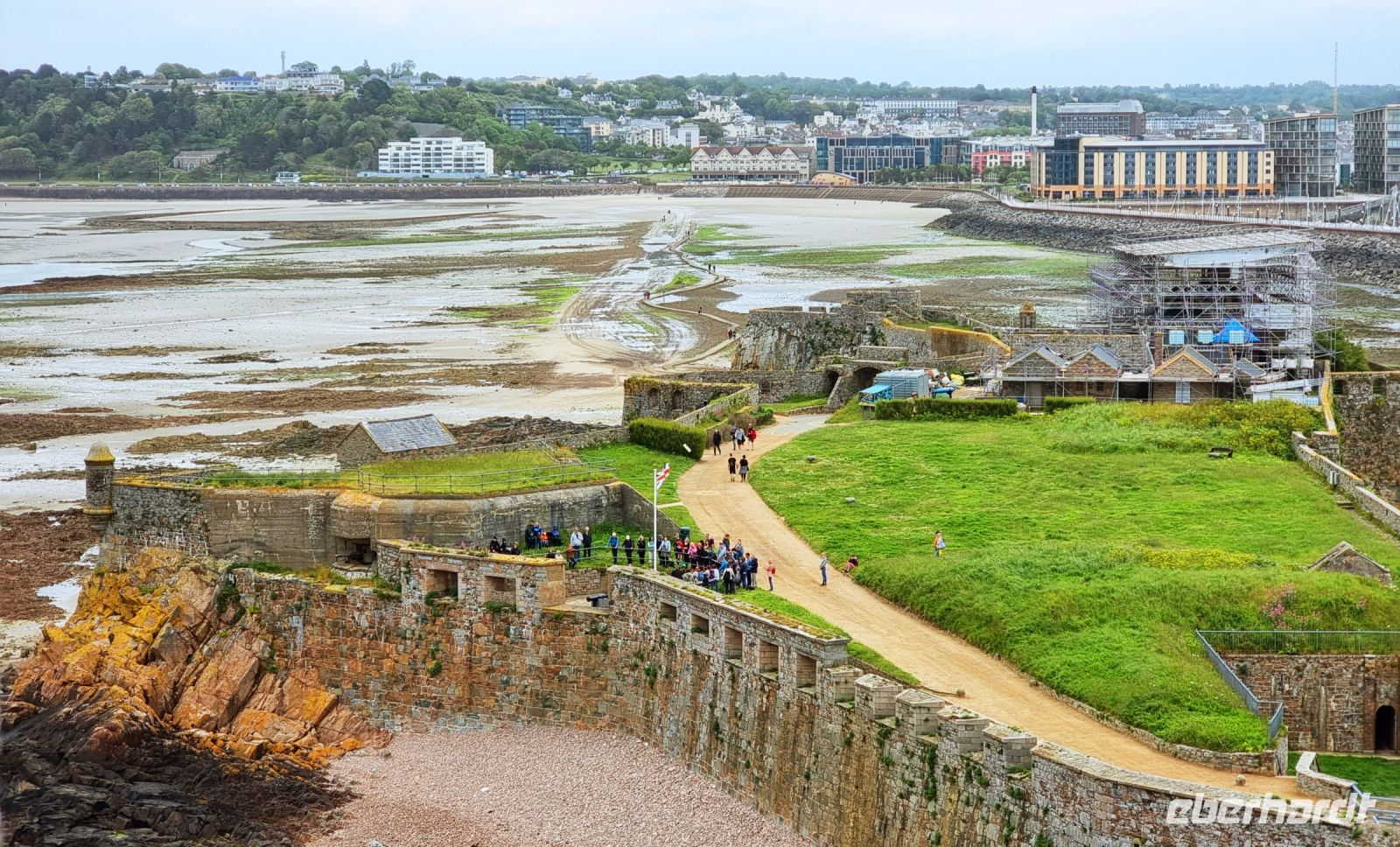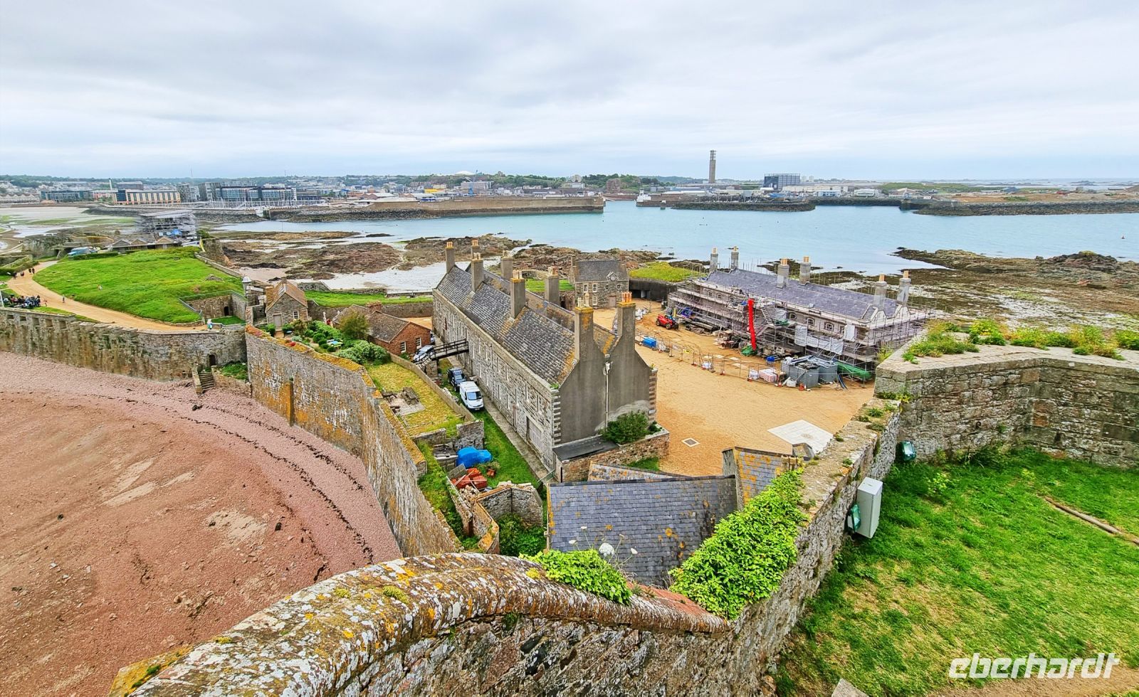 Am Nachmittag fuhren wir mit dem Amphibienfahrzeug Puddleduck zur Gezeiteninsel vor St. Helier, auf die das Elizabeth Castle gebaut ist. Die Überfahrt dauert etwa 15 Minuten und unternahmen einen kleinen Rundgang über das weitläufige Areal der Burg. Auch den Master Gunner, einen kostümierten Soldaten, konnten wir beim Vorführen seines Gewehrs und beim Kanonenschuss erleben. Die Einsiedlerfelsen des Heiligen St. Helier, nach welchem die Hauptstadt der Insel benannt ist, konnten wir sehen und uns einen kleinen Film über die Geschichte der Burg im Gouverneurshaus ansehen. Auch auf Elizabeth Castle sieht man übrigens noch Bunkeranlagen aus der Deutschen Besatzungszeit. Mit dem Puddleduck ging es zurück an Land und wir wanderten um den South Hill unterhalb von Fort Regent zurück zum Hotel.