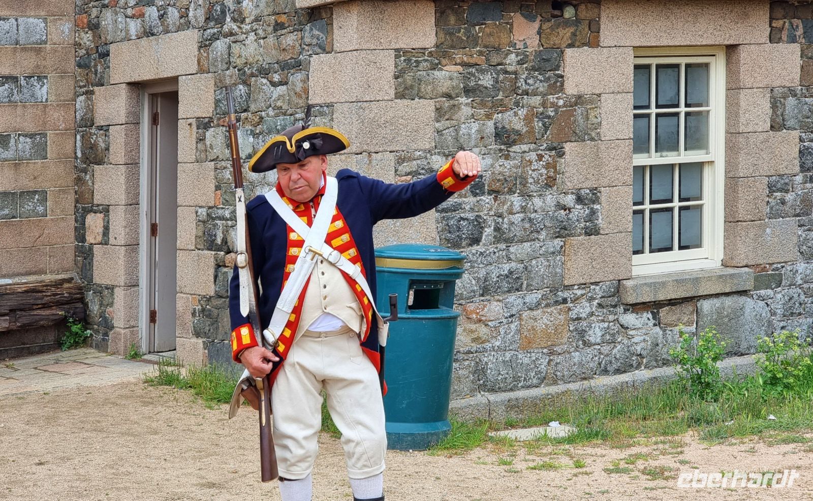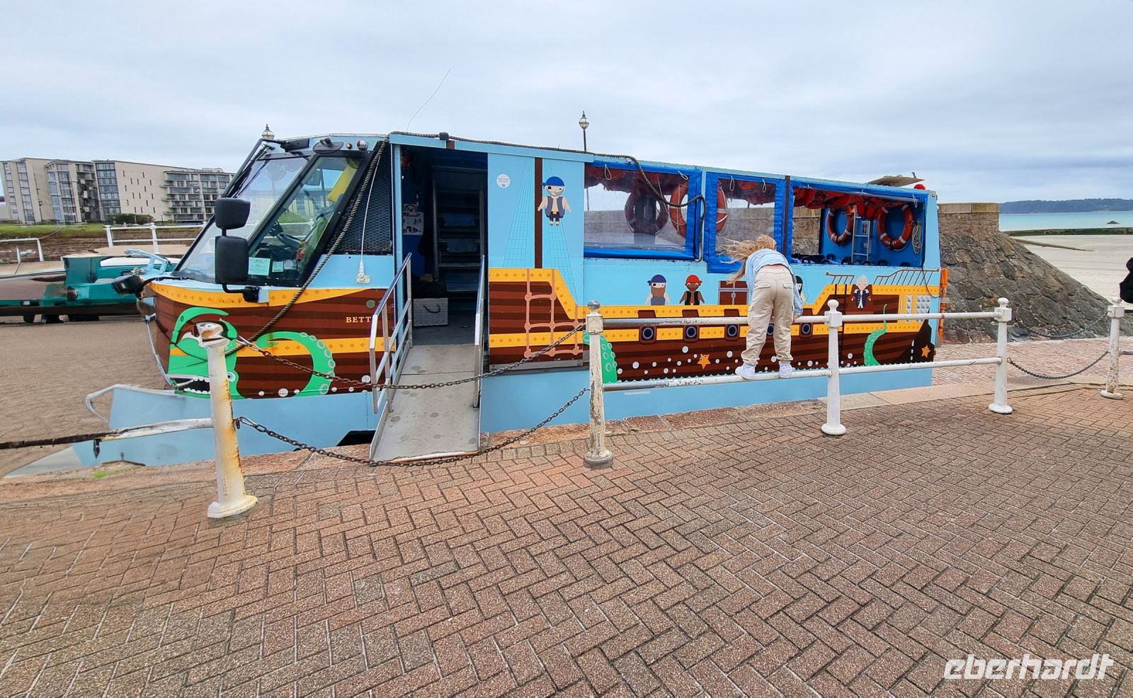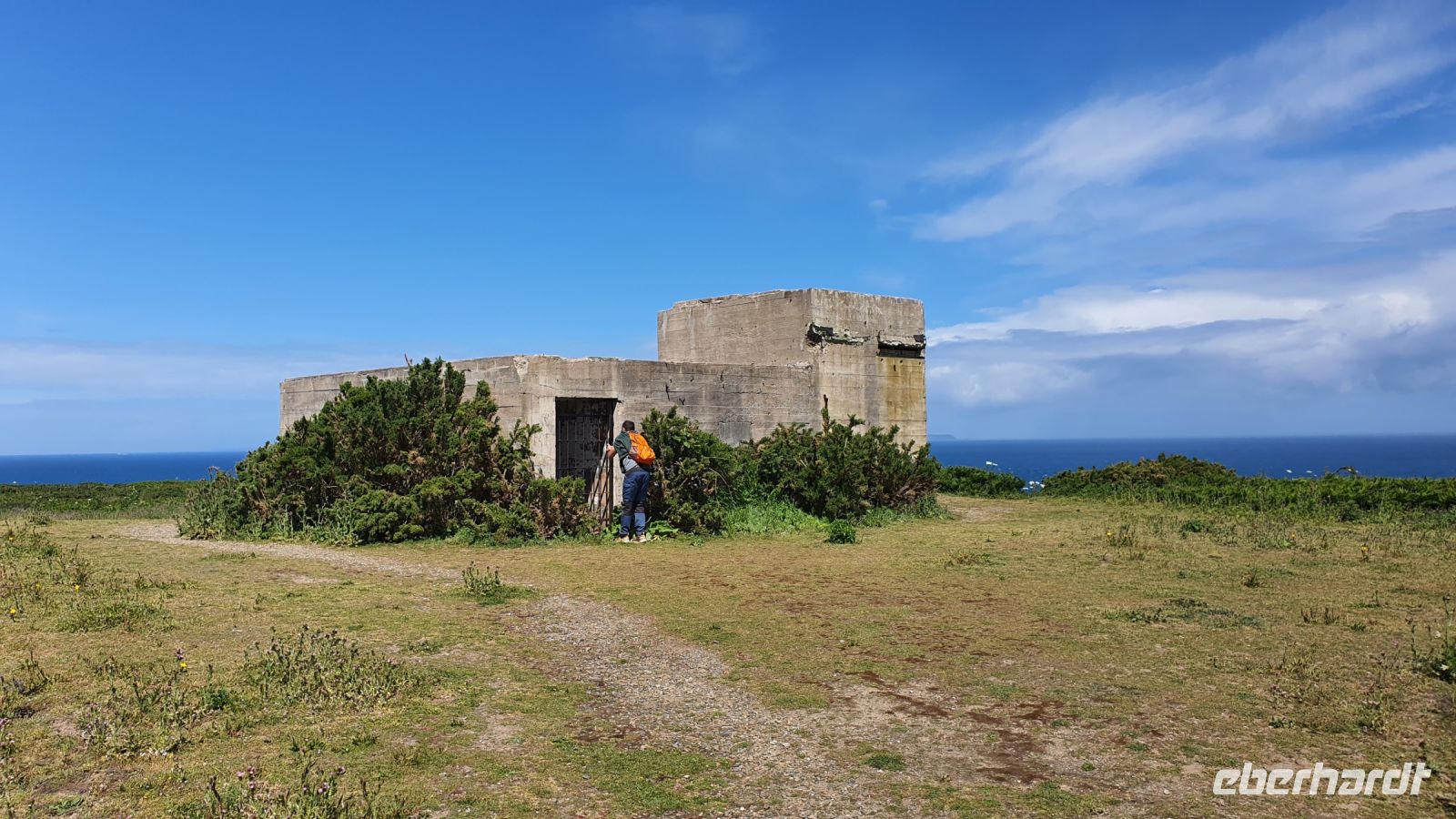Am Nachmittag fuhren wir mit dem Amphibienfahrzeug Puddleduck zur Gezeiteninsel vor St. Helier, auf die das Elizabeth Castle gebaut ist. Die Überfahrt dauert etwa 15 Minuten und unternahmen einen kleinen Rundgang über das weitläufige Areal der Burg. Auch den Master Gunner, einen kostümierten Soldaten, konnten wir beim Vorführen seines Gewehrs und beim Kanonenschuss erleben. Die Einsiedlerfelsen des Heiligen St. Helier, nach welchem die Hauptstadt der Insel benannt ist, konnten wir sehen und uns einen kleinen Film über die Geschichte der Burg im Gouverneurshaus ansehen. Auch auf Elizabeth Castle sieht man übrigens noch Bunkeranlagen aus der Deutschen Besatzungszeit. Mit dem Puddleduck ging es zurück an Land und wir wanderten um den South Hill unterhalb von Fort Regent zurück zum Hotel.