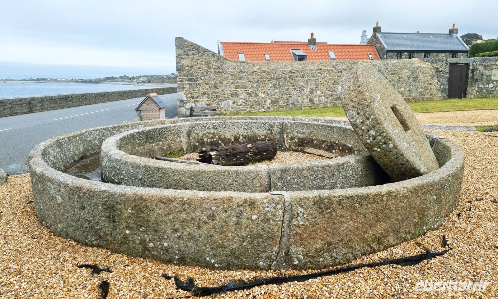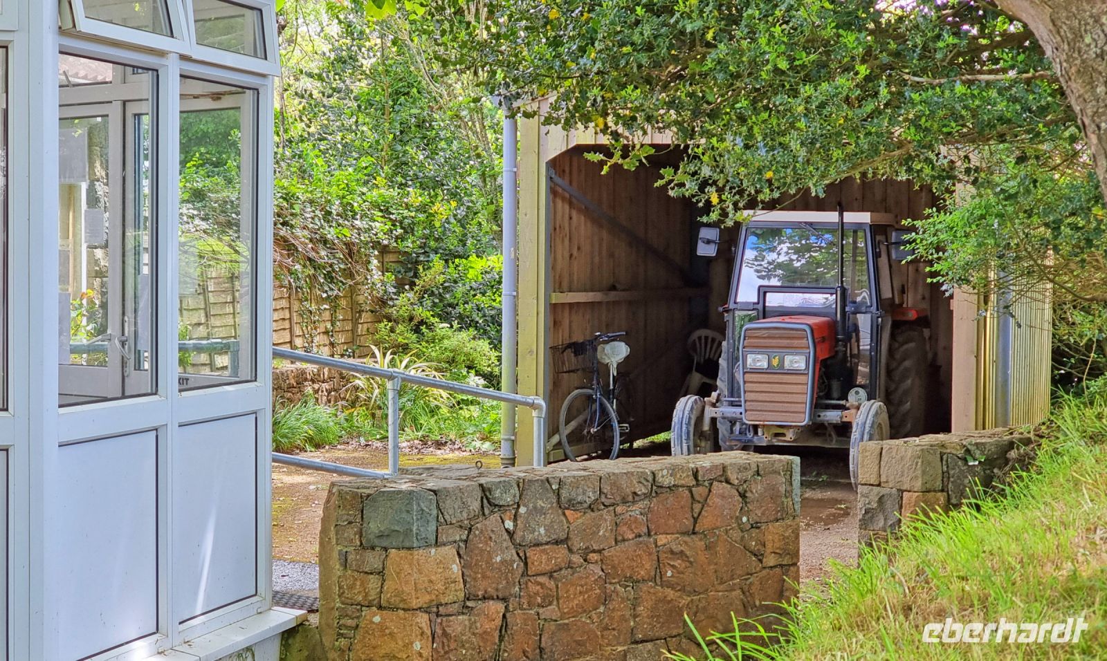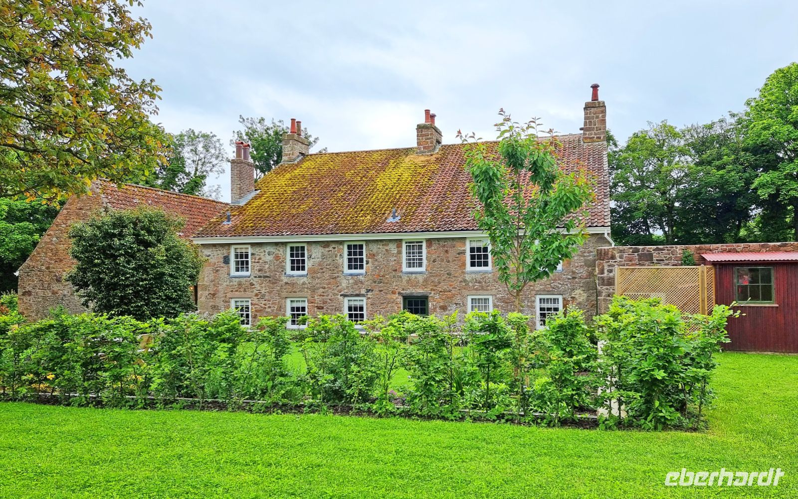Von der Kirche wollten Rémi uns dann eigentlich einen besonders idyllischen Wanderpfad entlang führen, aber der war mit dem letzten Sturm durch umgefallene Bäume unpassierbar geworden. So kämpften wir uns durchs mannshohe Gras wieder hinaus bis zur Green Lane und wanderten auf der Straße weiter zum La Rat Cottage. Auch die Morel Farm, die ebenfalls zum National Trust gehört, besuchten wir. Hier erzählte uns Rémi allerlei zum früheren Farmleben und wir sahen eine alte Cidre-Apfel-Presse. Auf einer weiteren Green Lane wanderten wir bergab bis zu den Jersey War Tunnels, wo uns Eddie mit dem Bus abholte. Zum Mittagessen kehrten wir in ein kleines Restaurant in St. Peter ein.