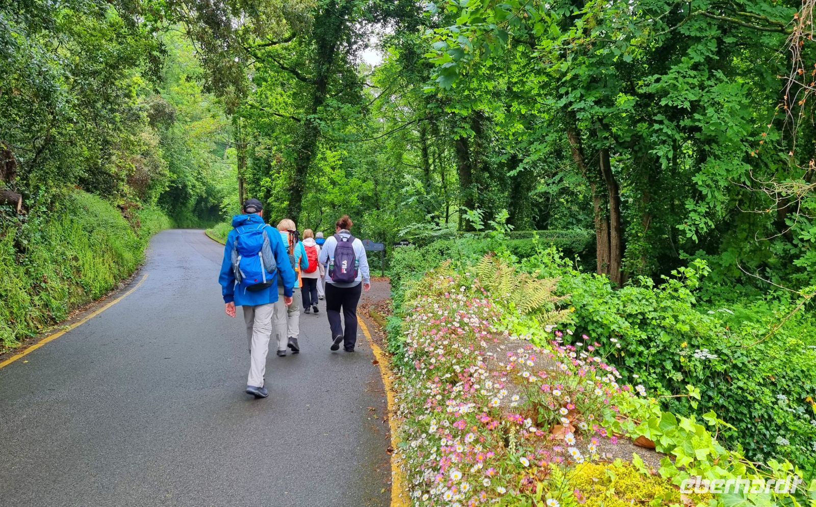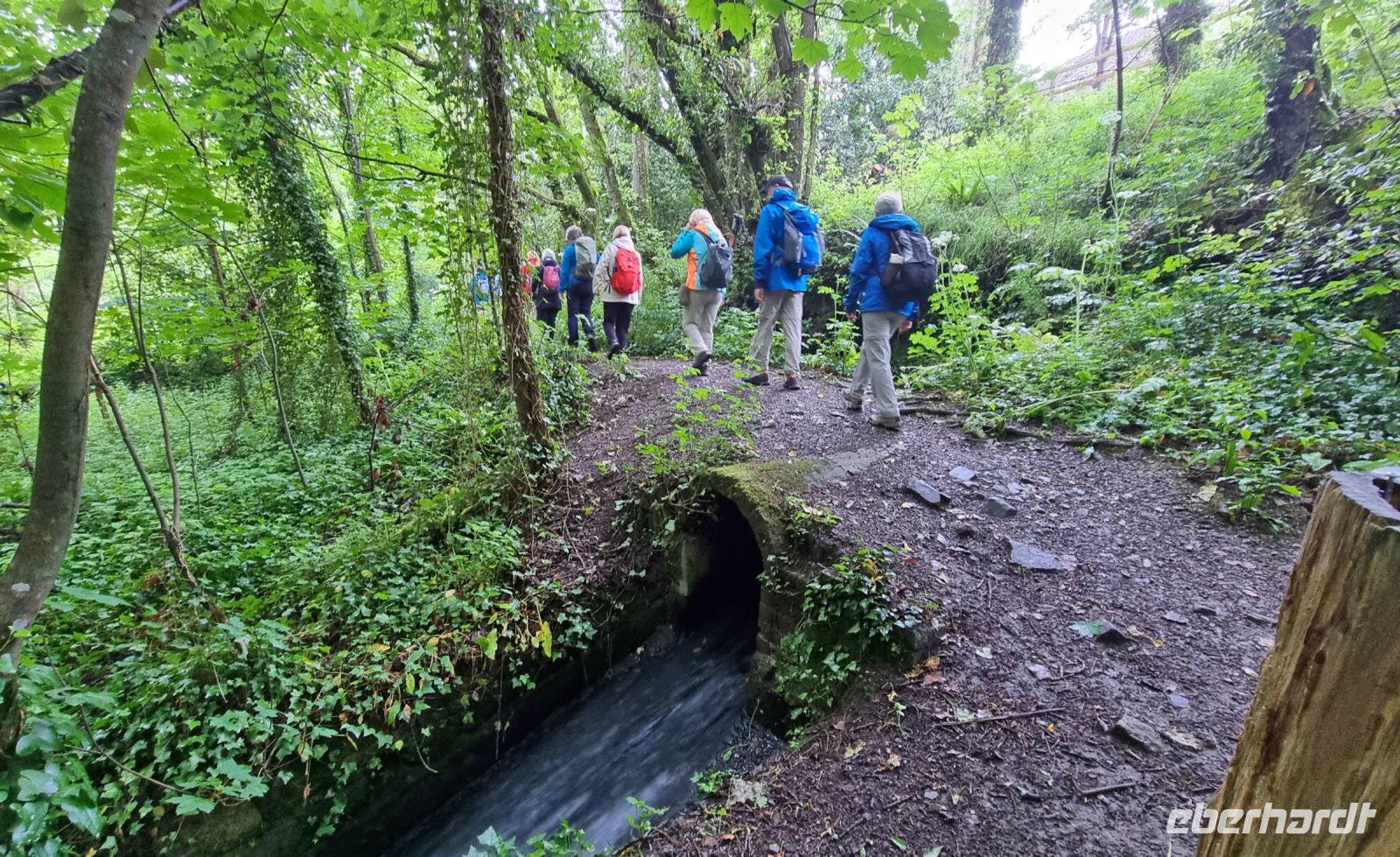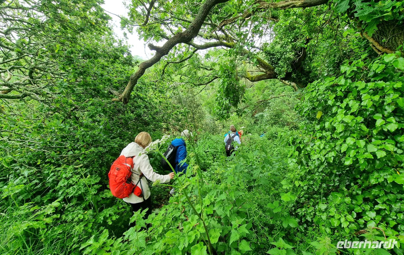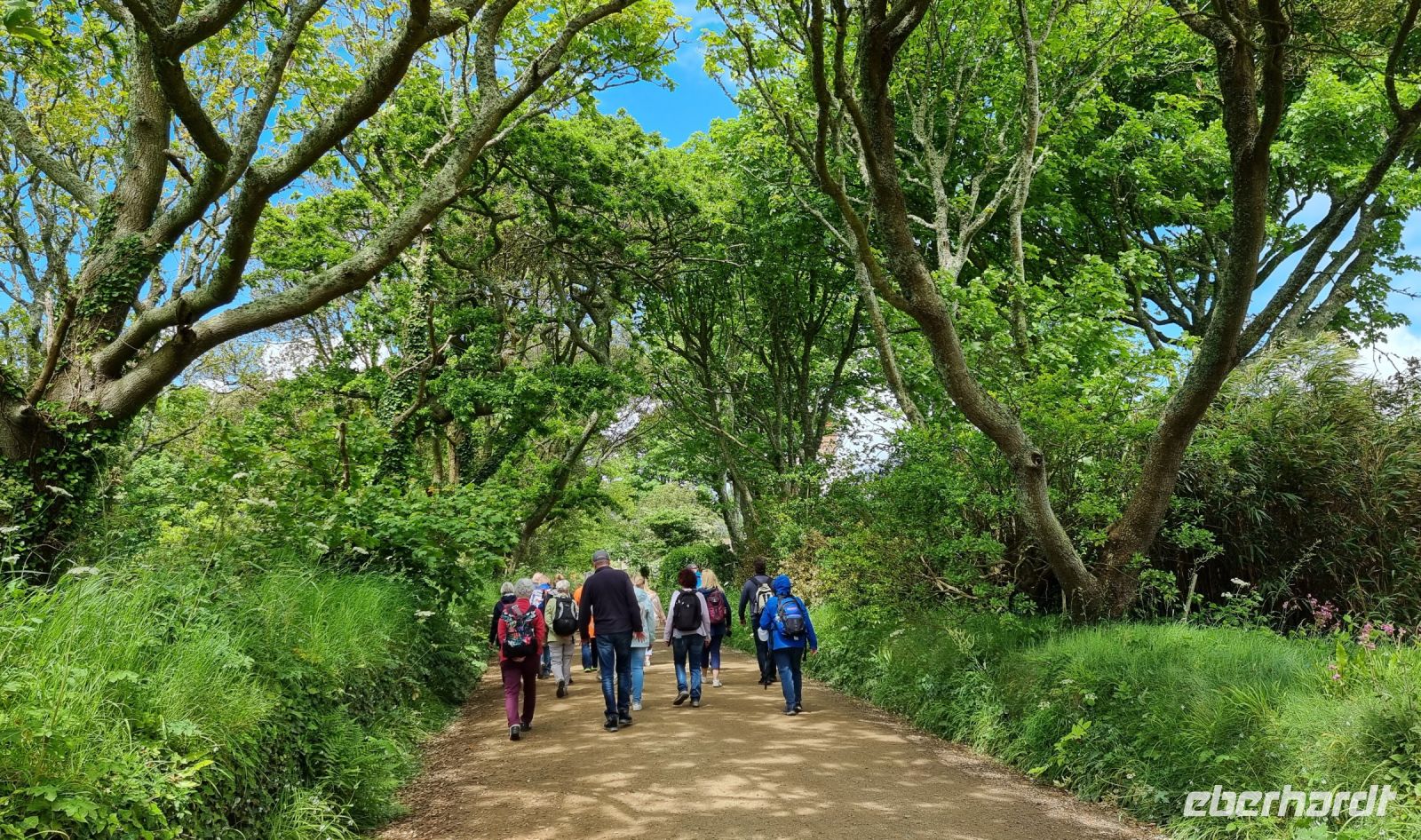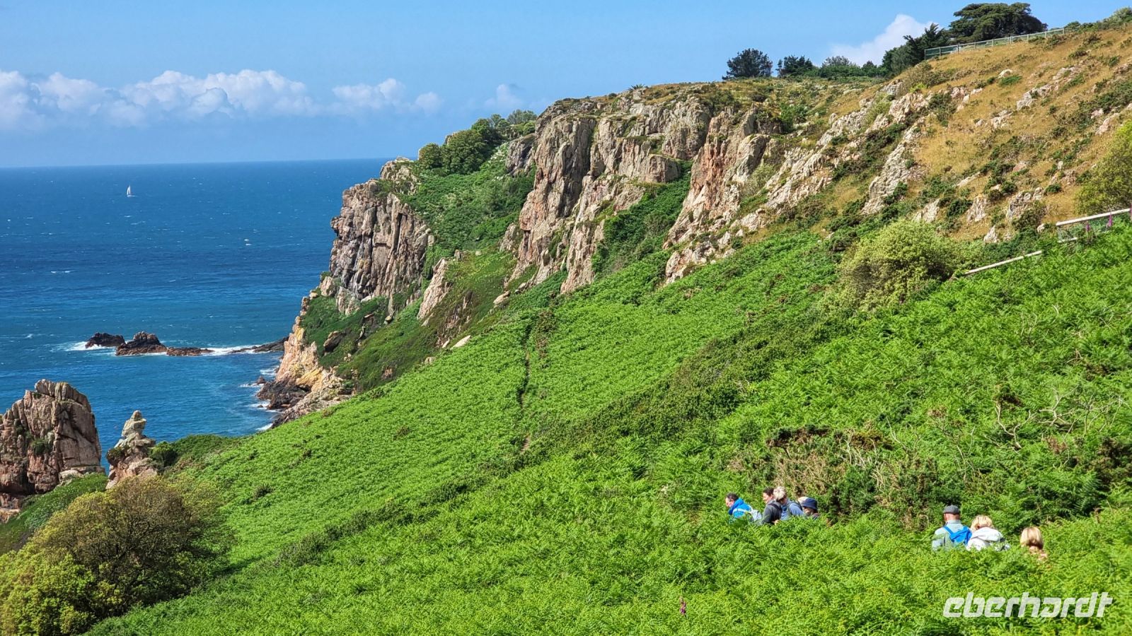 Die letzte Wanderung unserer Jersey-Reise führte uns an die Nordostküste, wo es die höchsten Klippen der Insel gibt. Um 9.00 Uhr fuhren wir mit geschnürten Wanderschuhen am Hotel ab. In der Gemeinde St. John's wurden früher Schiffe gebaut und Rémi erzählt uns unterwegs ein paar Fakten dazu. An der La Rue d'Egypte begann unsere Wanderung hinunter zum Küstenpfad. Nach einem Blick auf die Bonne Nuit Bay mit dem alten Granit-Steinbruch im Hintergrund ging es über viele Treppen auf und ab auf dem Coast Path entlang der grün bewachsenen Steilküste. Das Wetter war super zum Wandern mit ca. 15 °C, Sonnenschein und einer leichten Brise vom Atlantik. Auch durch das Waldgebiet der Egypt Woods führte uns die Wanderung und Rémi erzählt uns die Legende vom Bach, der Blinde wieder sehend macht.