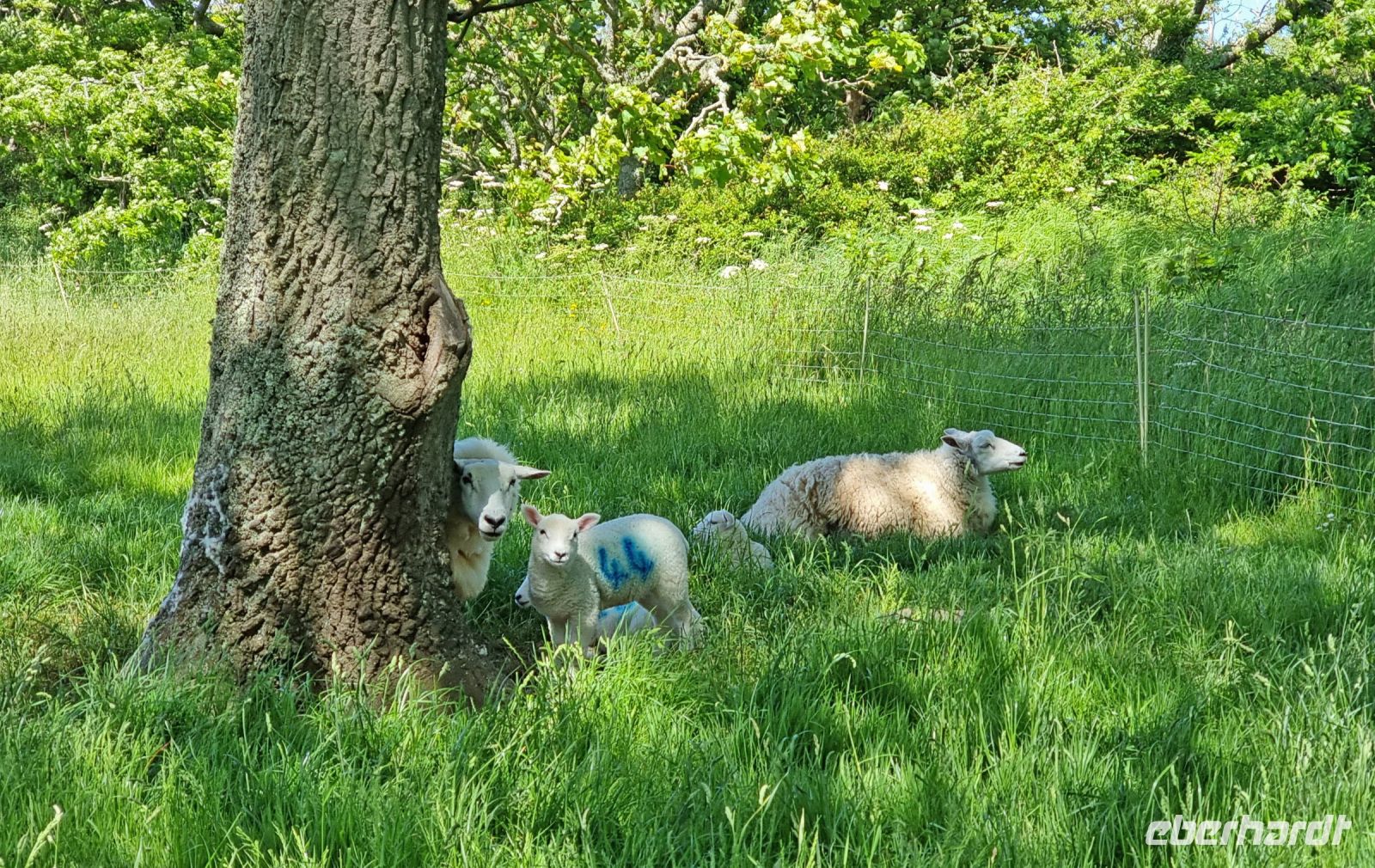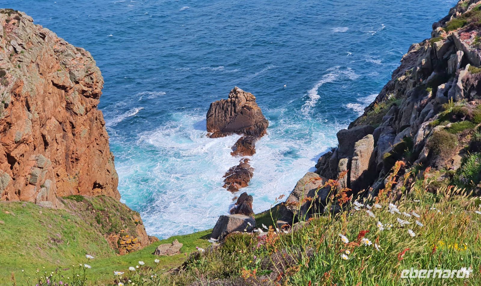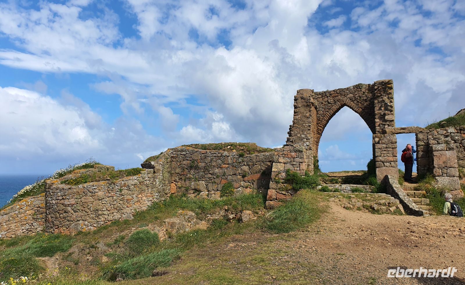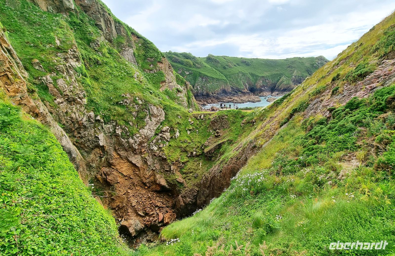 Von Greve de Lecq ging es dann vorbei an einem der typischen Rundtürme und einer ehemaligen Kaserne auf einer schmalen Straße steil hinauf zum nächsten Küstenpfad. Auf einem steinzeitlichen Hügel weideten Manx Schafe mit riesigen spitzen Hörnern, die von der Isle of Man importiert wurden. Wir gingen vorbei an einem Schießplatz wieder zum Küstenpfad. Hier durchquerten wir Land, was dem National Trust von Jersey gespendet wurde, um es für Wanderer und Naturliebhaber zu bewahren. Auf und ab ging es weiter durch die mit Farnen und Ginster bewachsene, grüne Steilküste, bis wir Devil's Hole mit der kleinen Aussichtsplattform erblicken konnten.