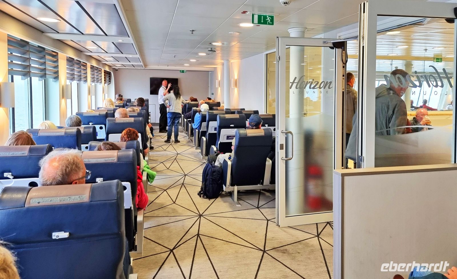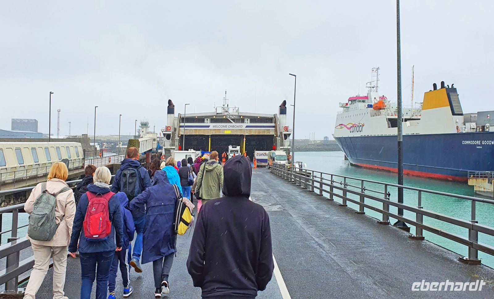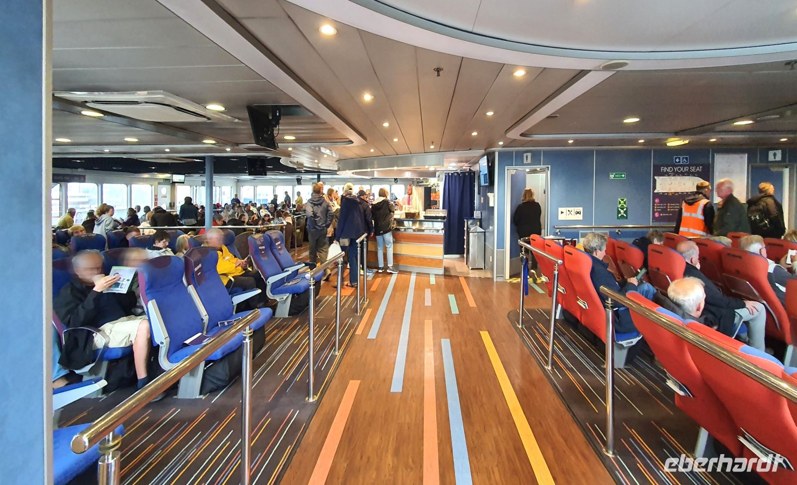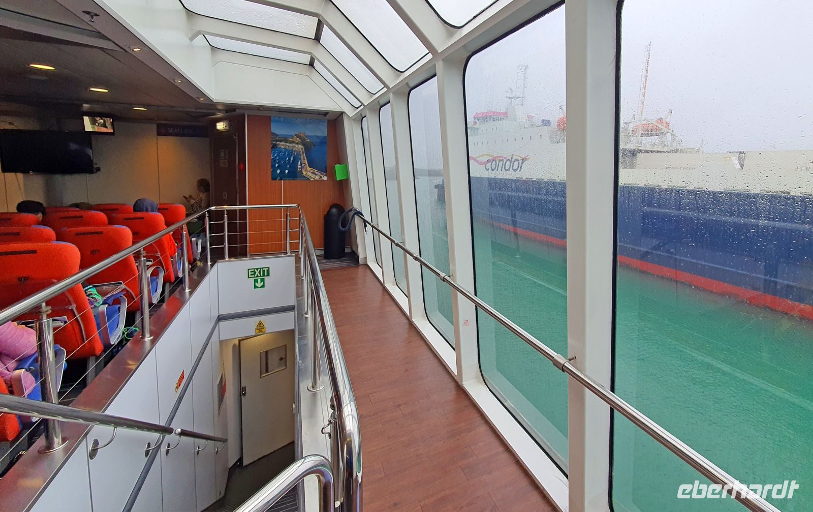 Diesmal war es eine Slow Ferry – also eine langsame, ältere Fähre – sodass wir zwei Stunden bis nach Jersey brauchten. Das war uns aber bekannt und wir hatten für unsere Gruppe extra Plätze in der Horizon-Lounge gebucht, eine sehr schöne, ruhige Lounge mit bequemen Liegesesseln zum Entspannen. Während der Fahrt kann man sich Getränke und Essen an der Bar kaufen und mit in die Lounge nehmen, zahlbar mit Kreditkarte oder EC-Karte, kein Bargeld. Die Schifffahrt bei ruhiger See war ein schöner Abschluss unseres Ausfluges.