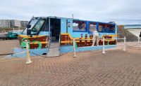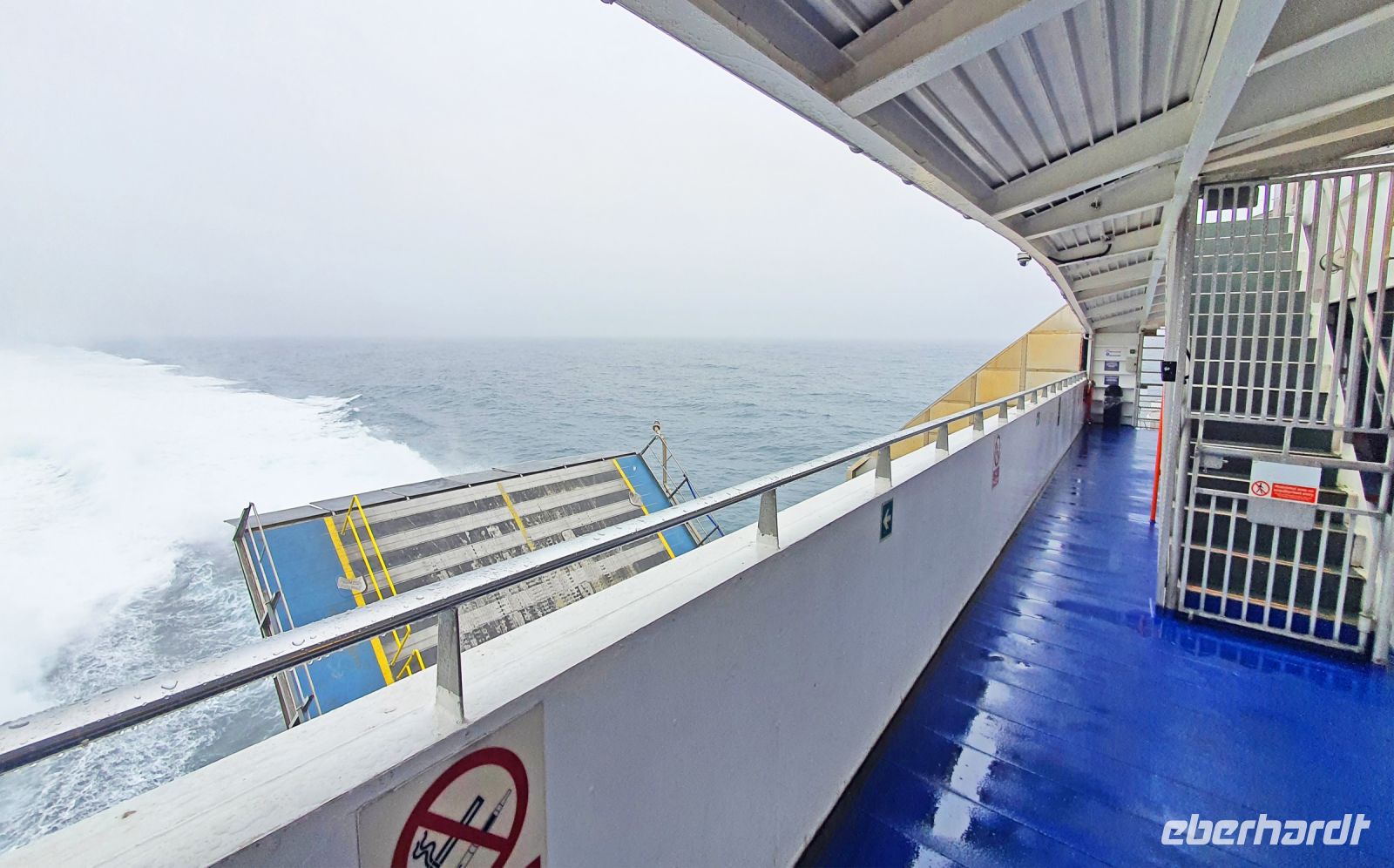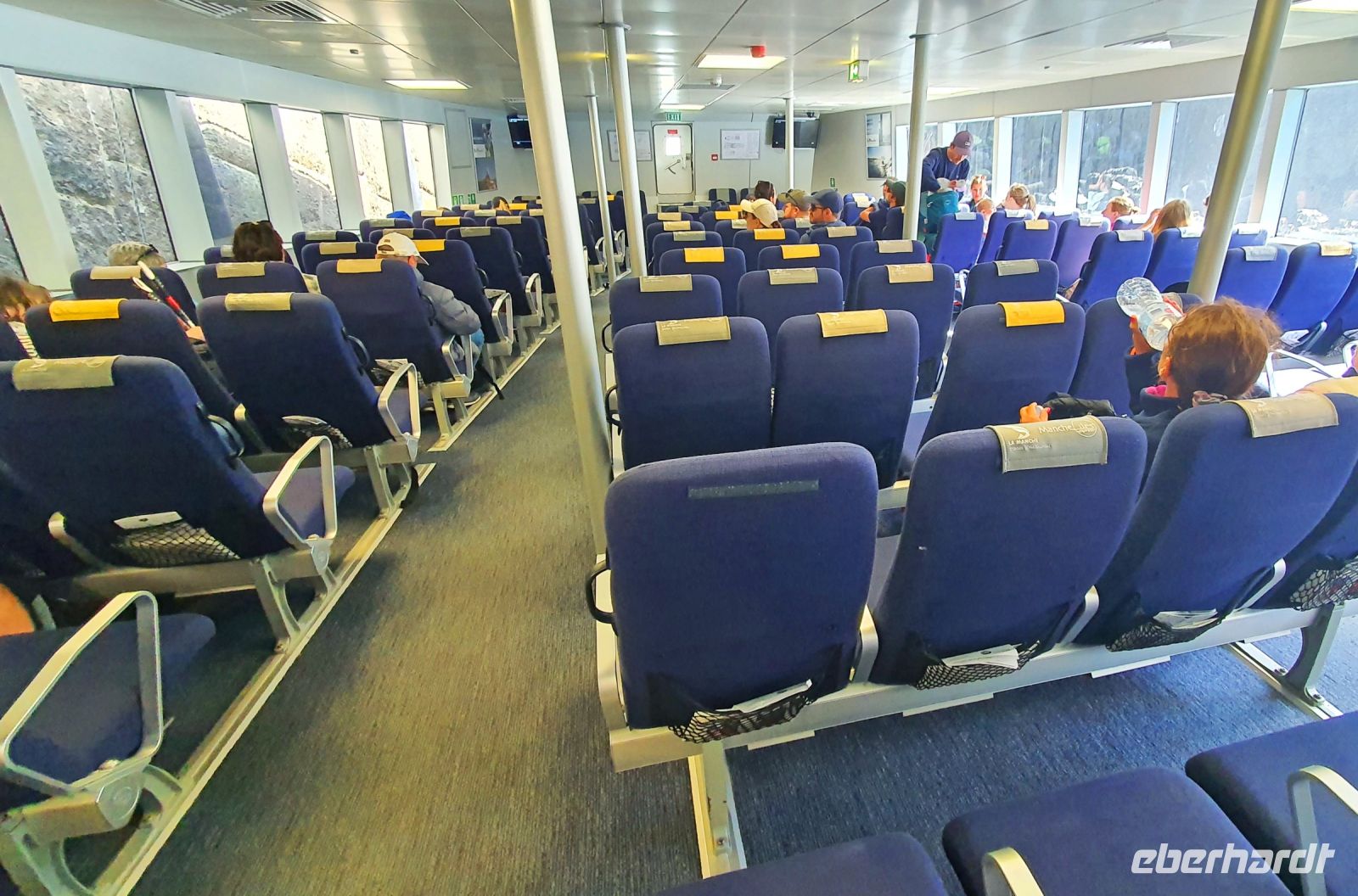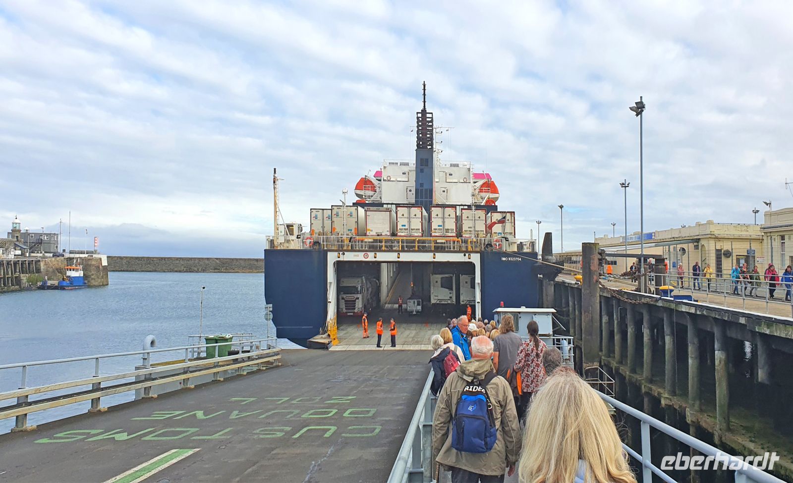 Diesmal war es eine Slow Ferry – also eine langsame, ältere Fähre – sodass wir zwei Stunden bis nach Jersey brauchten. Das war uns aber bekannt und wir hatten für unsere Gruppe extra Plätze in der Horizon-Lounge gebucht, eine sehr schöne, ruhige Lounge mit bequemen Liegesesseln zum Entspannen. Während der Fahrt kann man sich Getränke und Essen an der Bar kaufen und mit in die Lounge nehmen, zahlbar mit Kreditkarte oder EC-Karte, kein Bargeld. Die Schifffahrt bei ruhiger See war ein schöner Abschluss unseres Ausfluges.