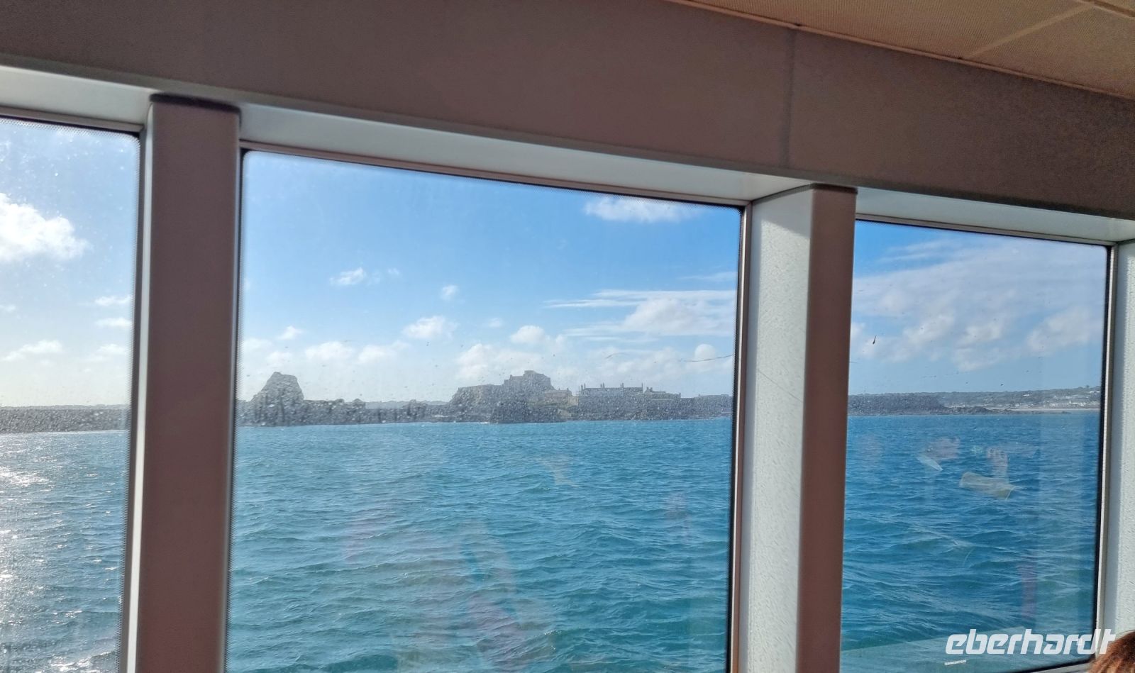 Die Rückfahrt nach Jersey begann diesmal pünktlich um 16.50 Uhr, sodass wir um 18.00 Uhr zurück in Jersey waren und von unserem Bus zum Hotel gebracht wurden. Auf der Rückfahrt hatte sich der Wind auch gelegt und viele genossen die Schifffahrt oben auf dem Sonnendeck. Die Fähren fahren immer entlang der gesamten Südküste von Jersey vorbei am Corbiere-Leuchtturm, sodass man immer auch vom Wasser einen Eindruck von der Inselwelt bekommt.