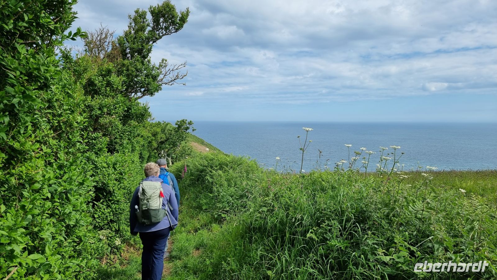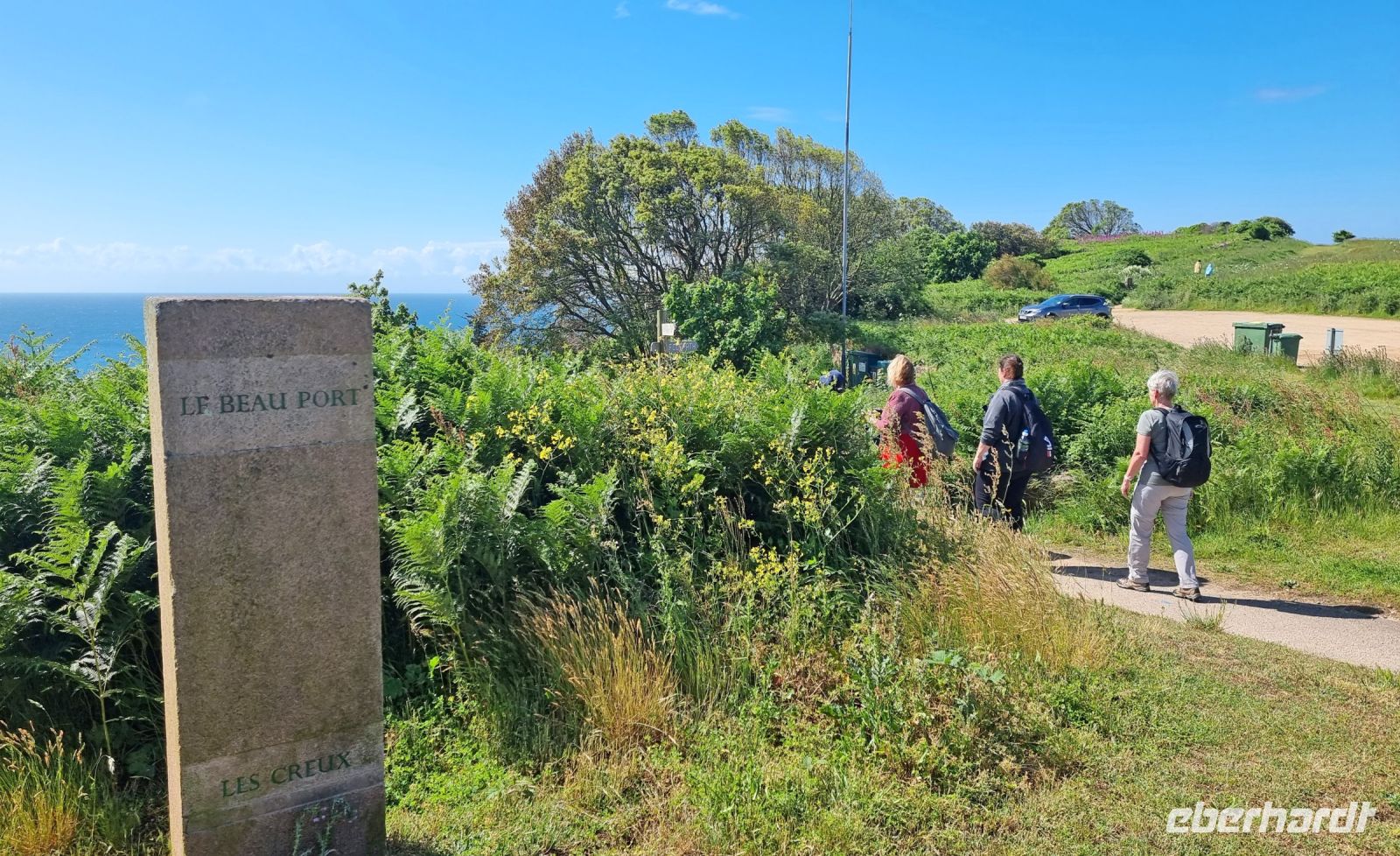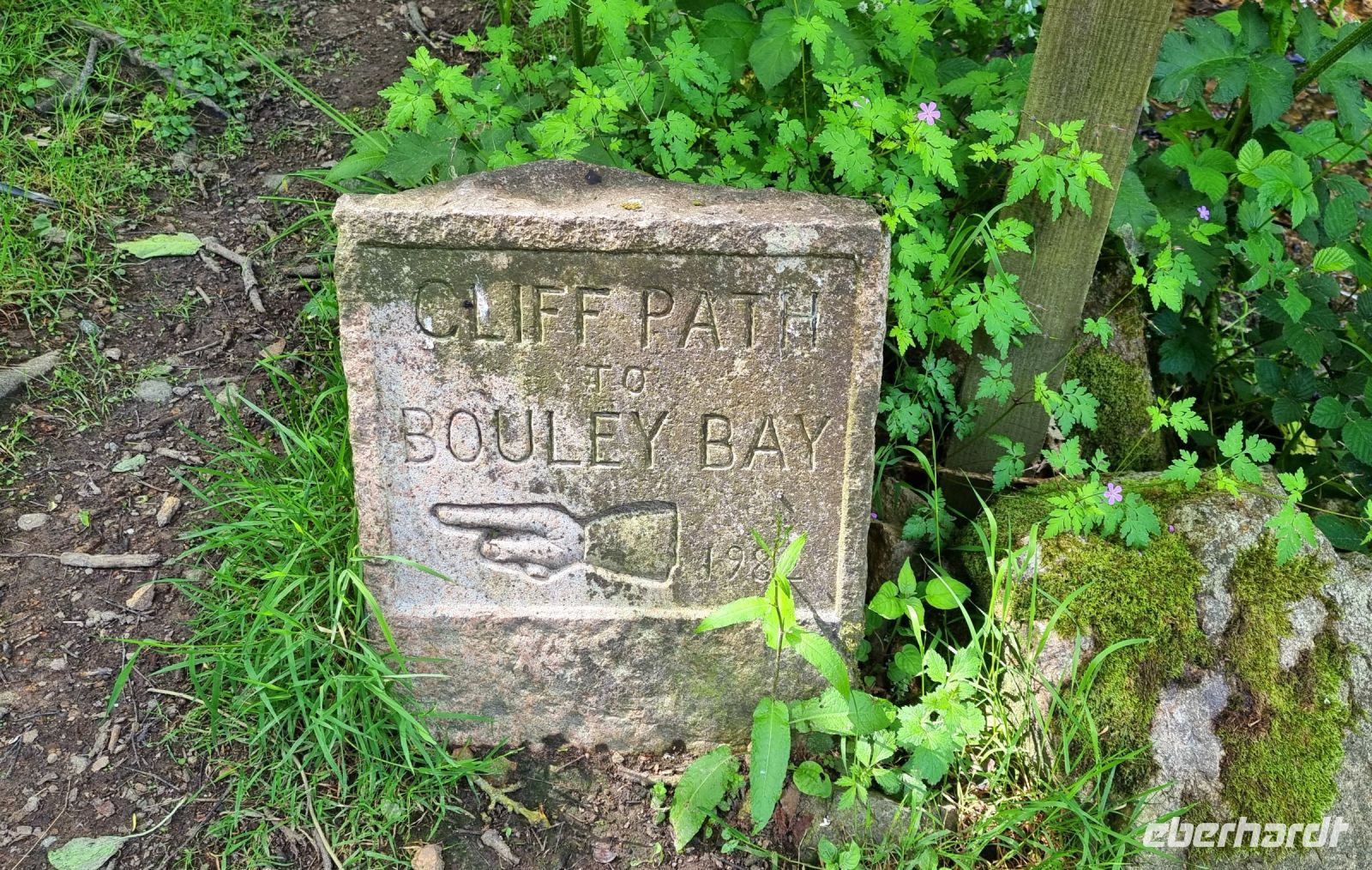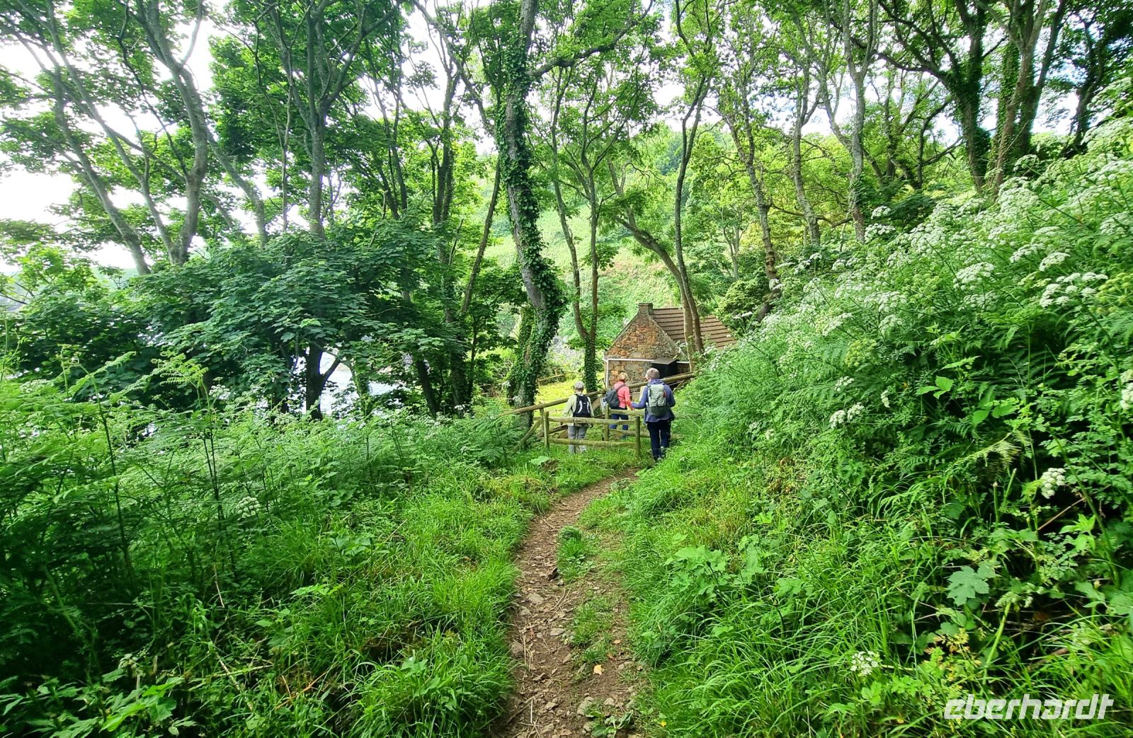 Gegen 13.00 Uhr wanderten wir weiter. Von der Bucht lag nun wieder ein Anstieg hinauf zum Küstenpfad vor uns. Mit vielen Treppen und durch kleine Waldgebiete liefen wir auch vorbei an einem Gedenkstein für gefallene Briten, die hier durch Deutsche Landminen verletzt wurden.